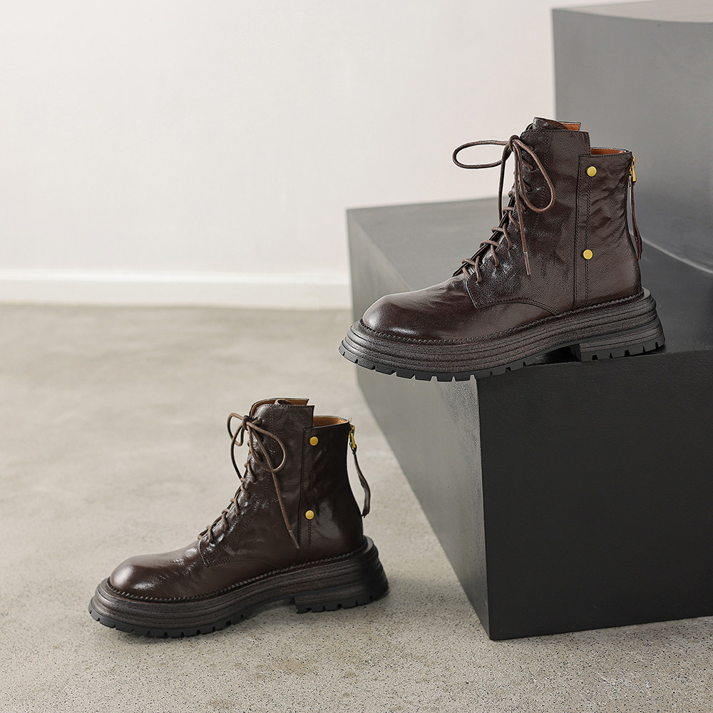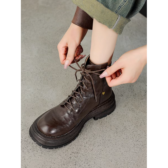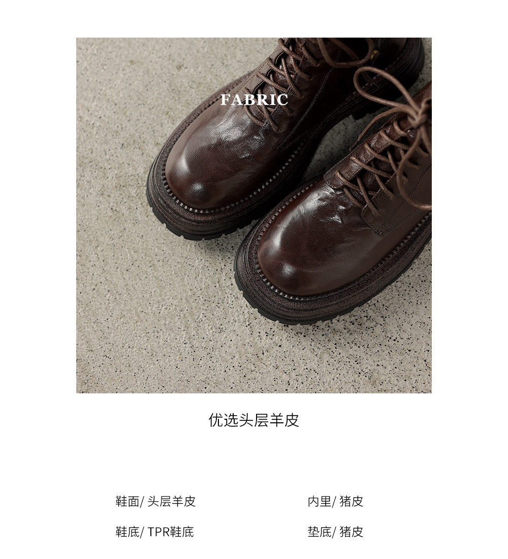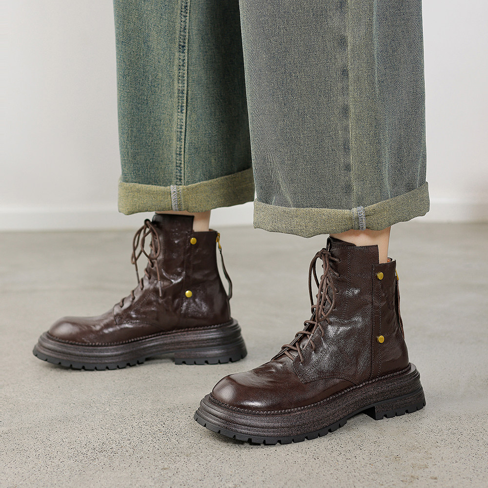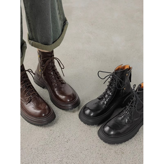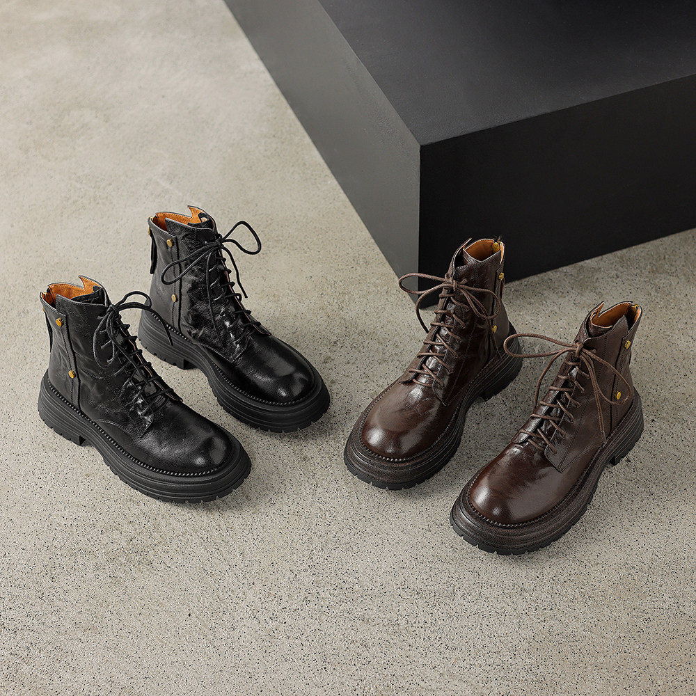軟羊皮棕色厚底真皮短靴女2025初秋冬新款圓頭復古英倫風馬丁靴潮