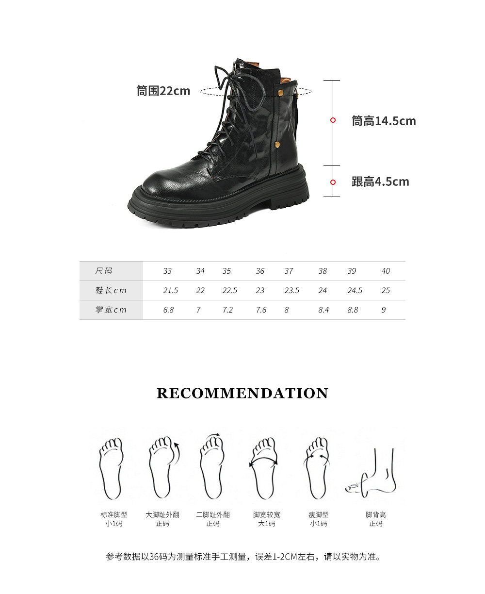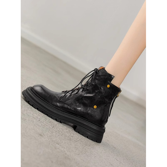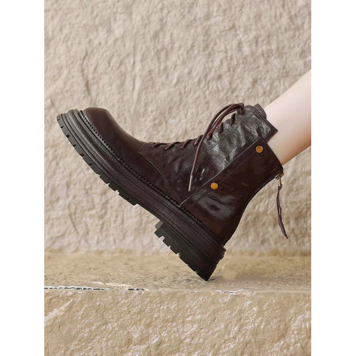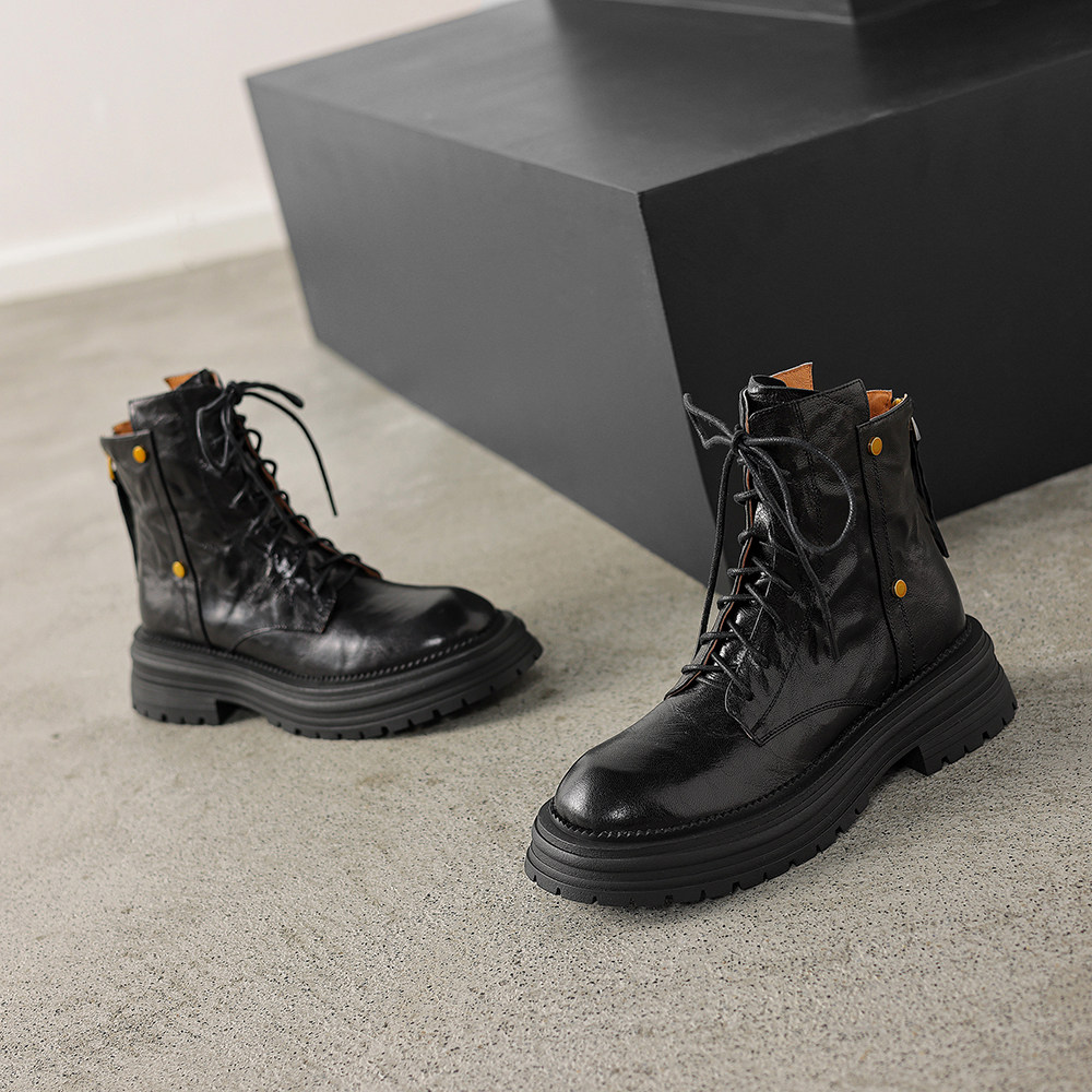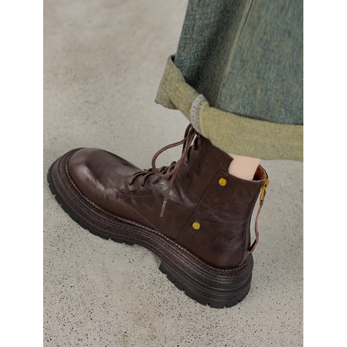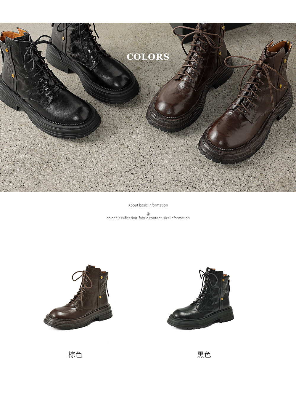 軟羊皮棕色厚底真皮短靴女2025初秋冬新款圓頭復古英倫風馬丁靴潮