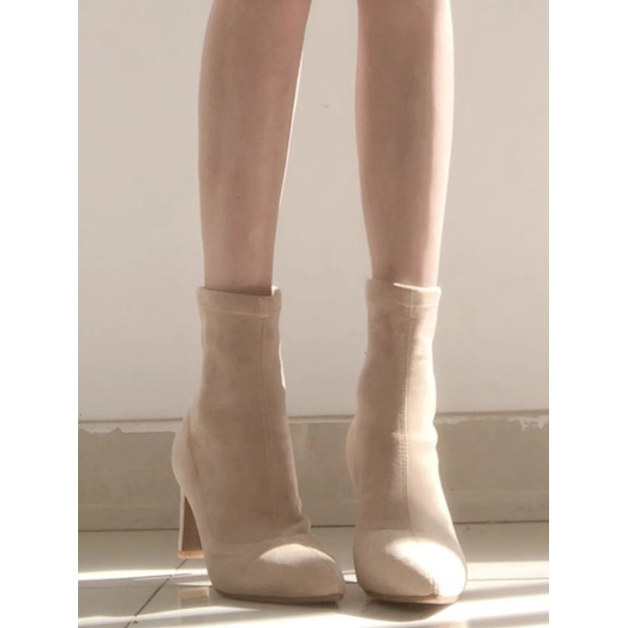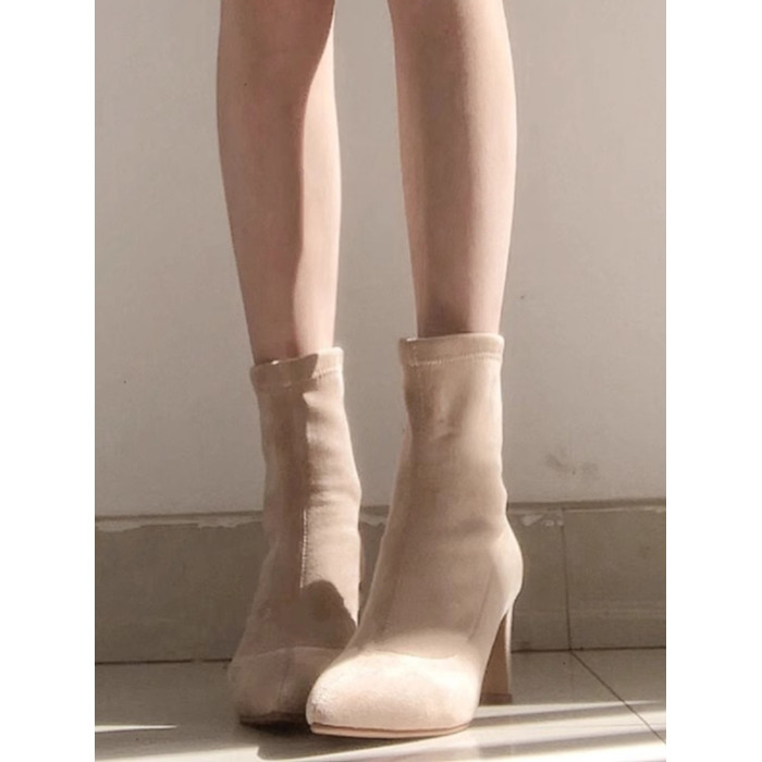 杏色高跟短靴女2025年秋冬新款百搭絨面尖頭高跟鞋粗跟彈力襪子靴