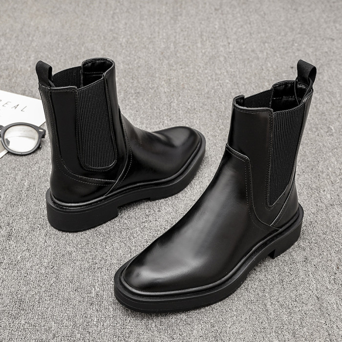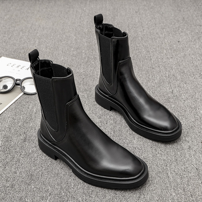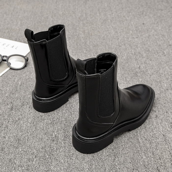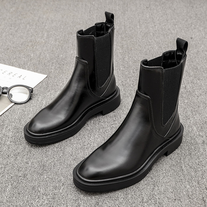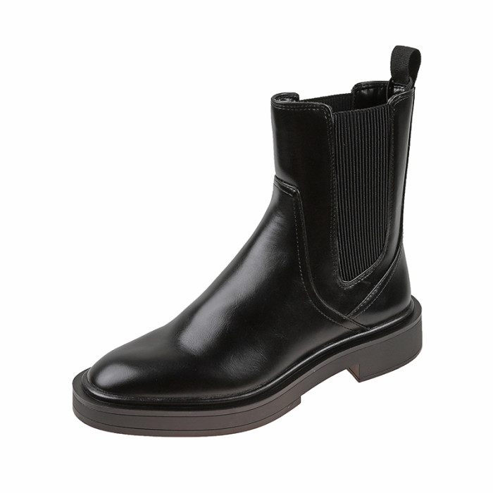 歐洲站2025冬季新款圓頭真皮粗跟切爾西靴英倫風平底及裸靴短靴女
