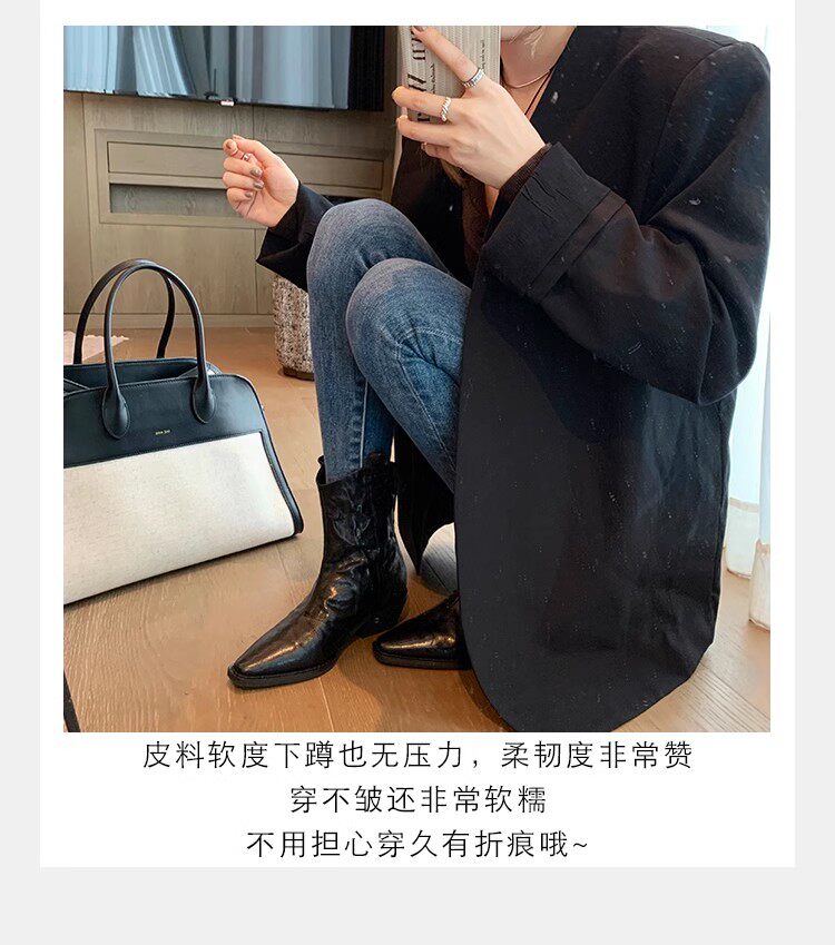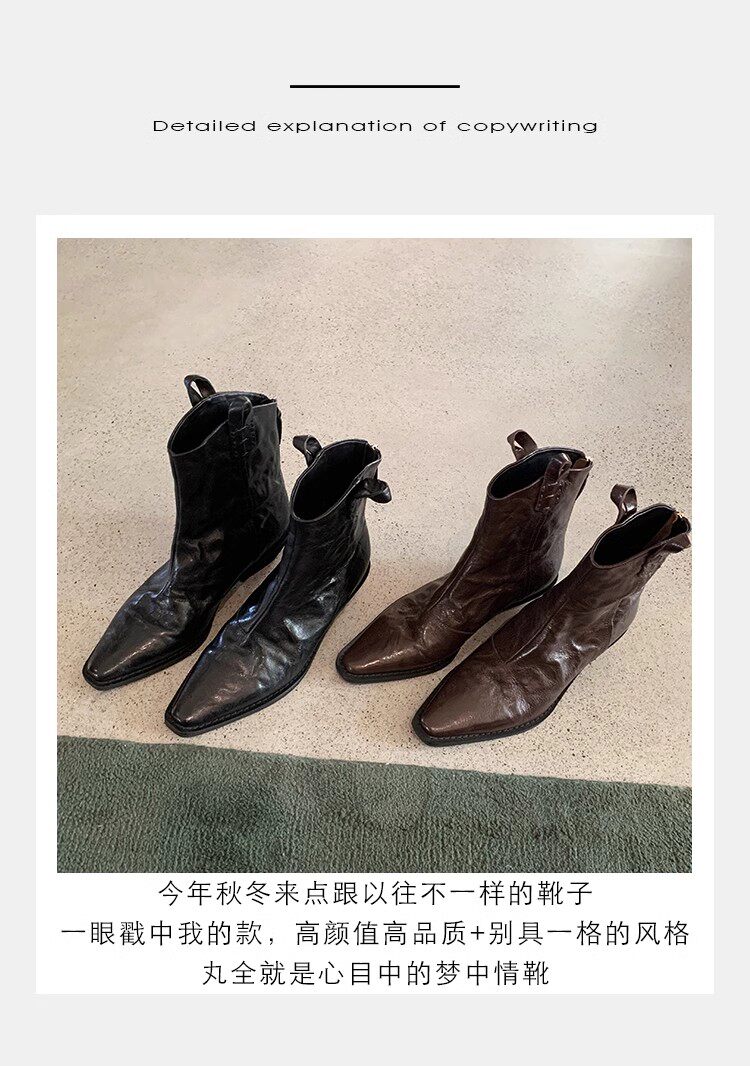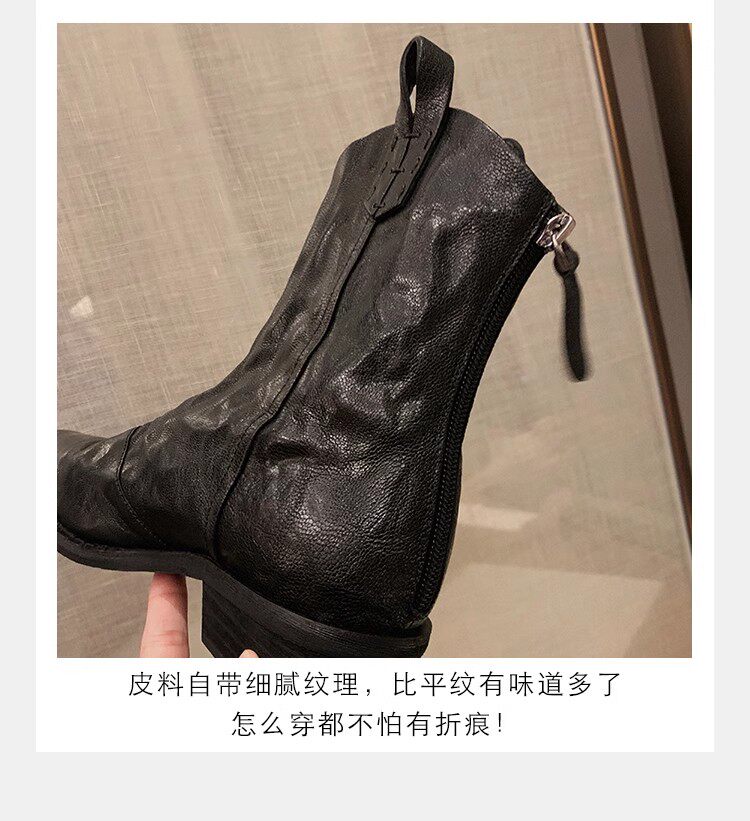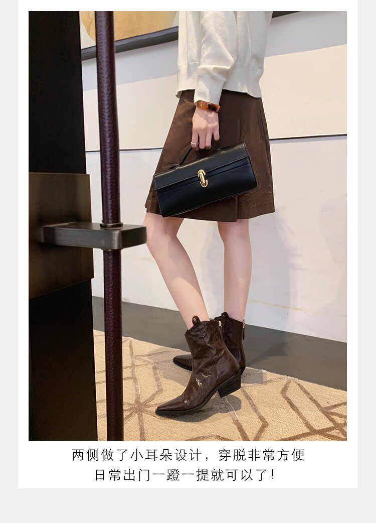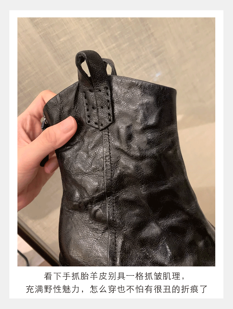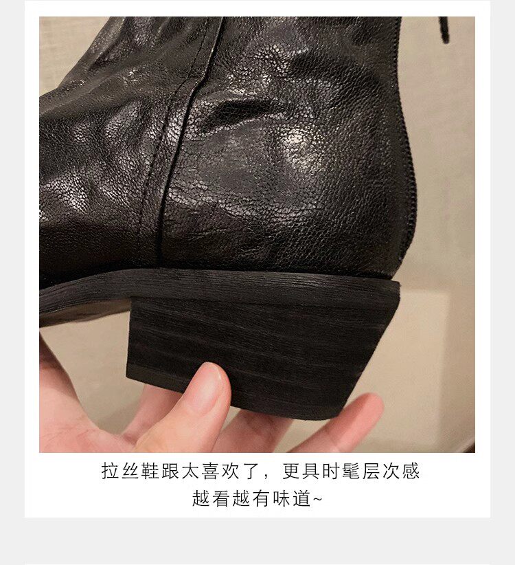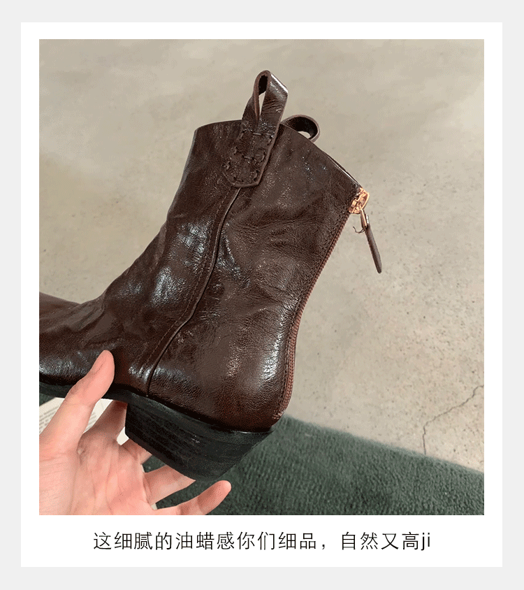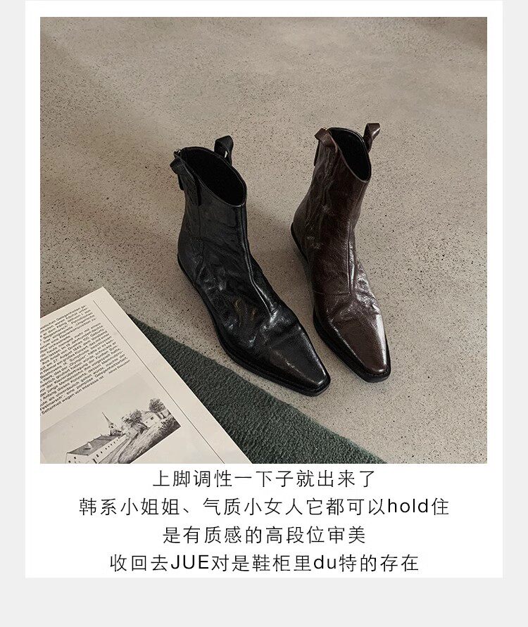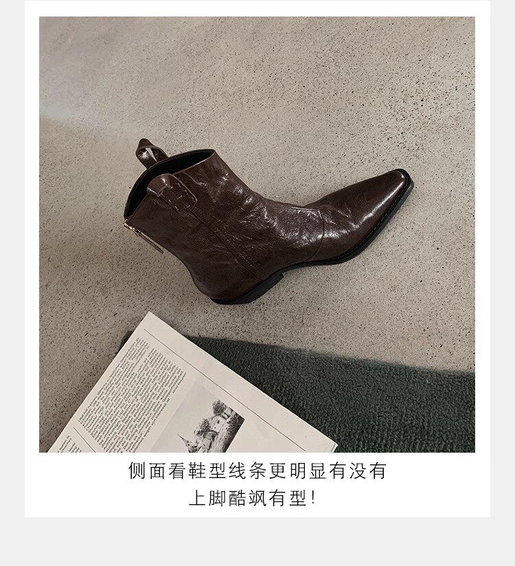 牛皮版~時髦尖頭V口顯瘦粗跟皺感西部短靴女真皮馬丁靴單靴小踝靴