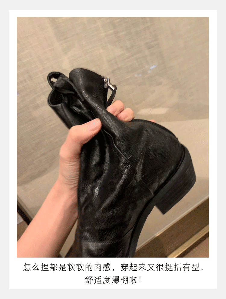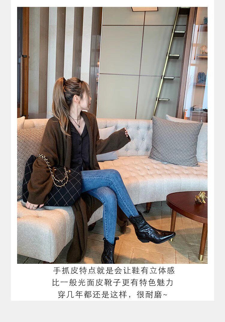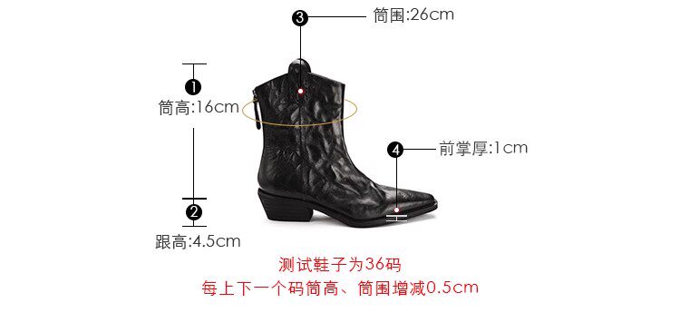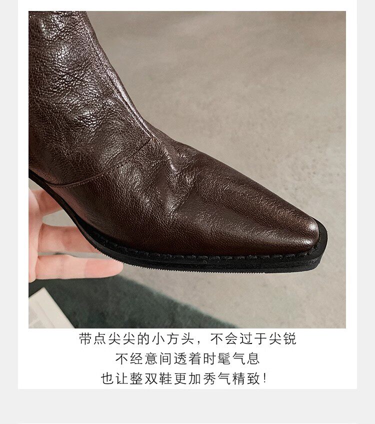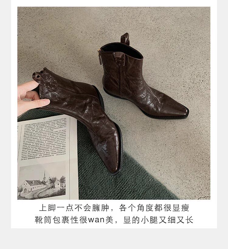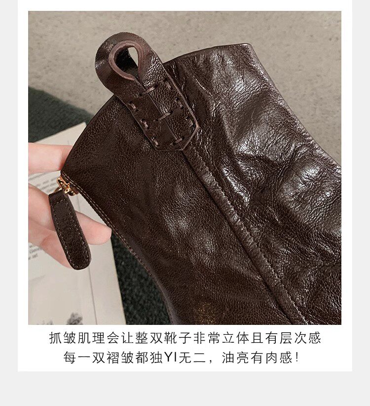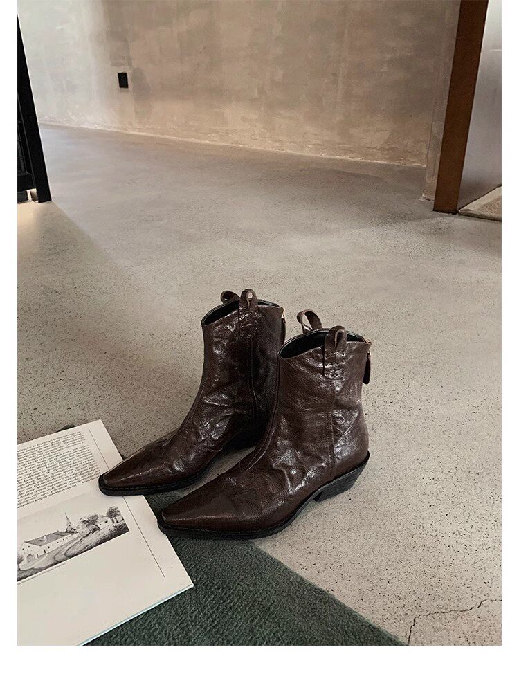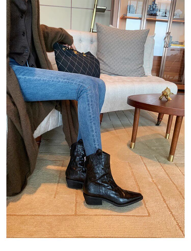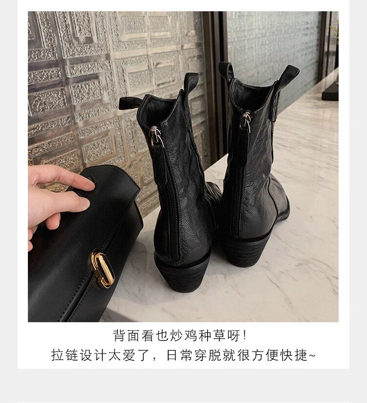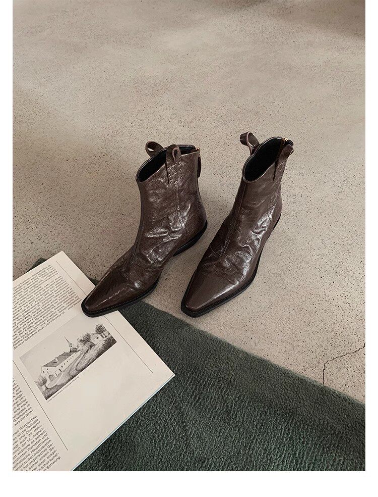 牛皮版~時髦尖頭V口顯瘦粗跟皺感西部短靴女真皮馬丁靴單靴小踝靴