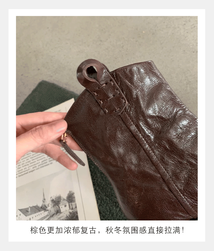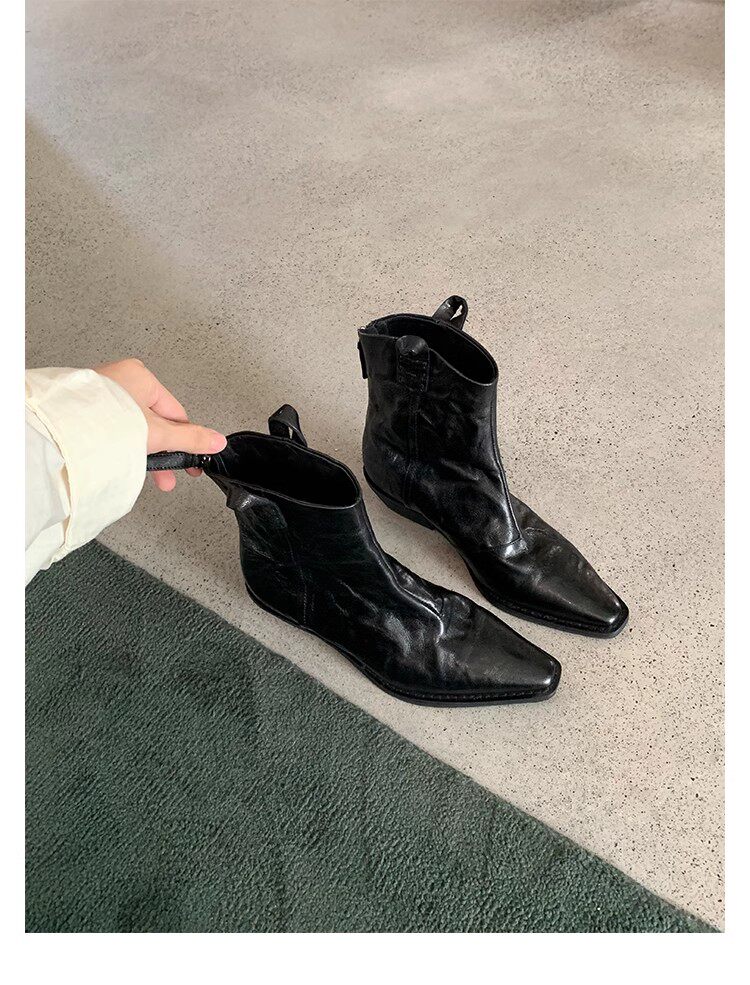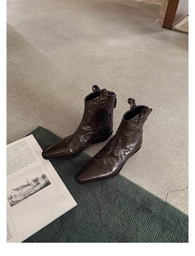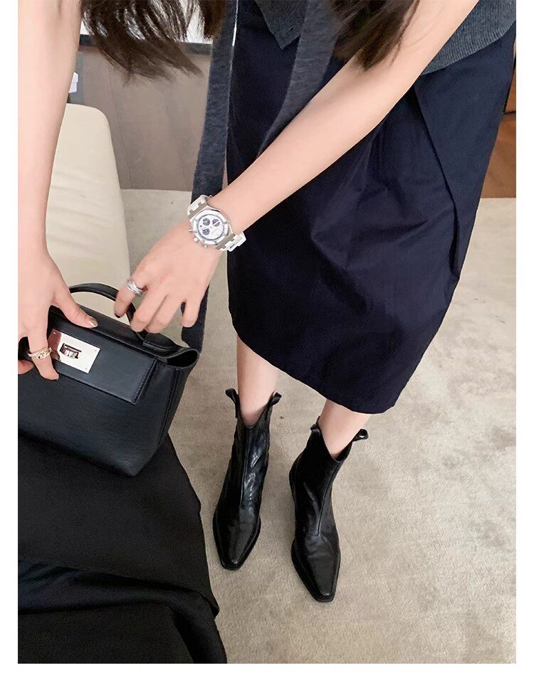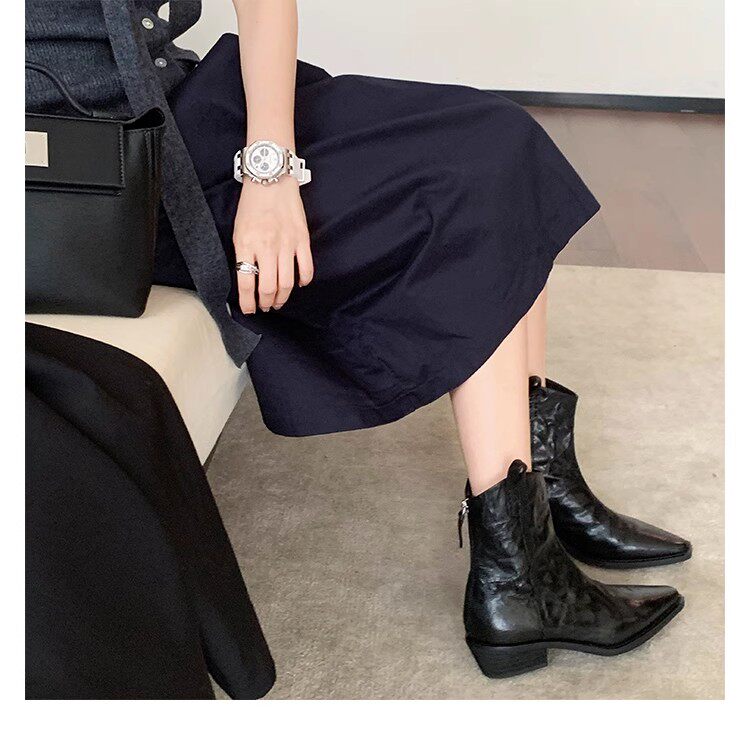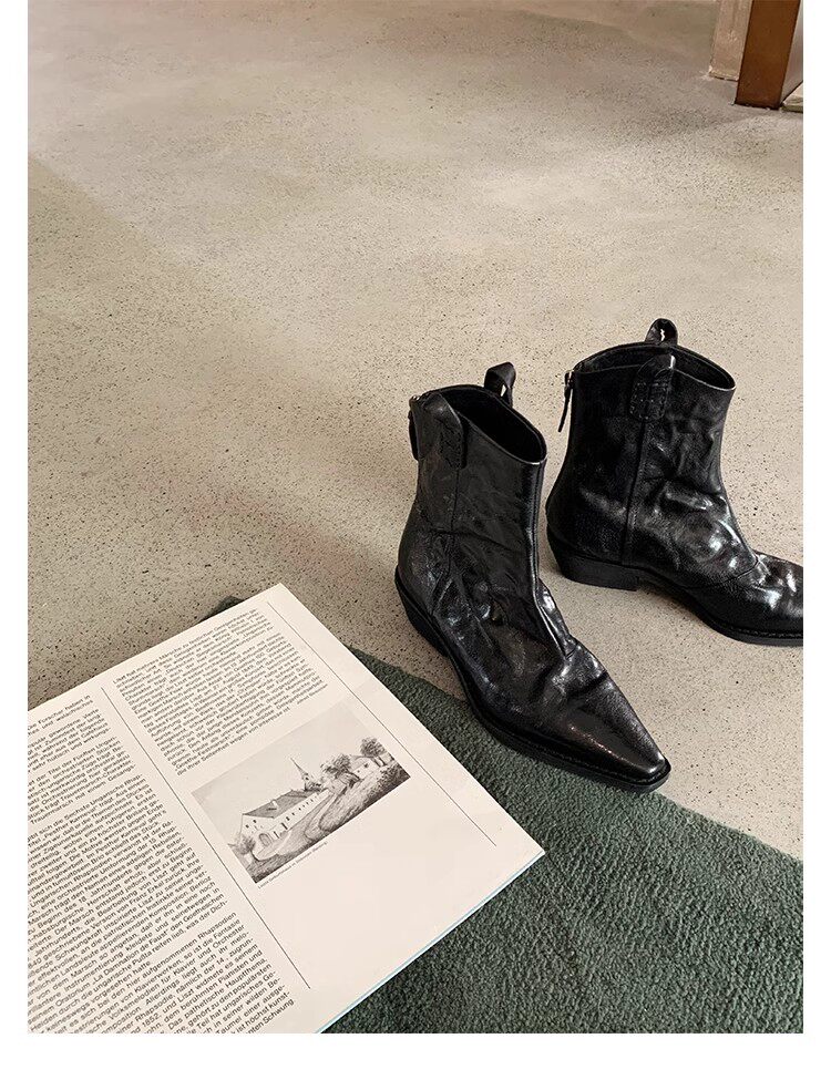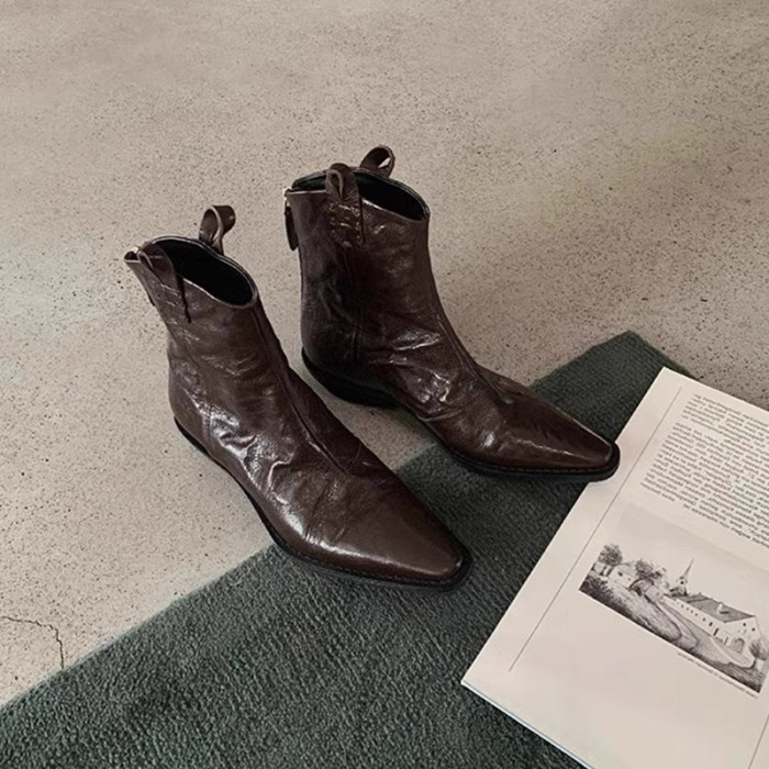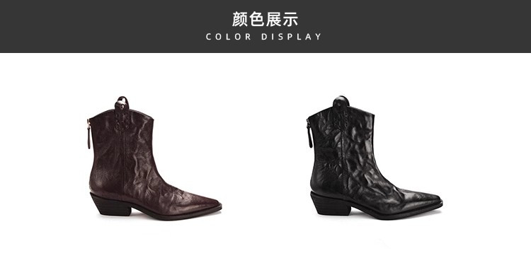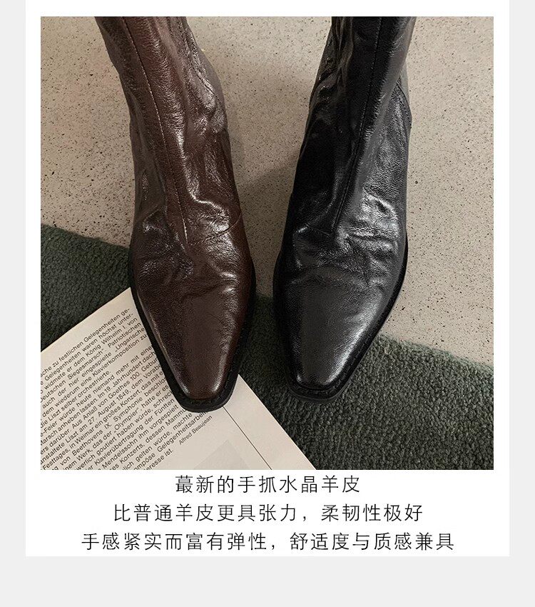 牛皮版~時髦尖頭V口顯瘦粗跟皺感西部短靴女真皮馬丁靴單靴小踝靴