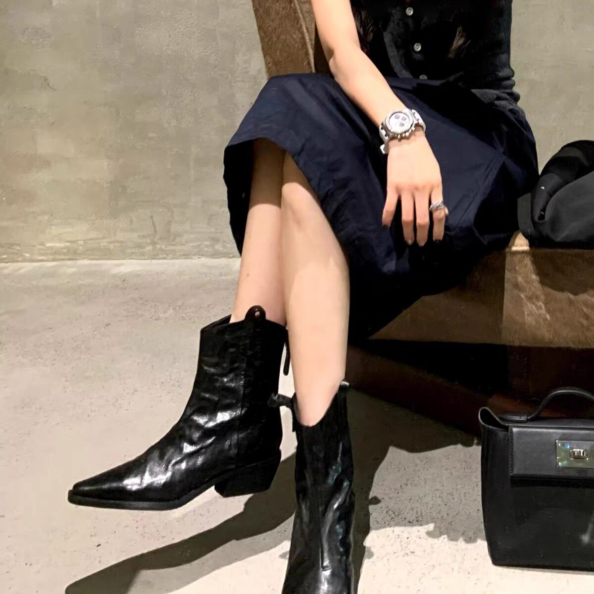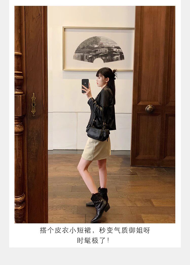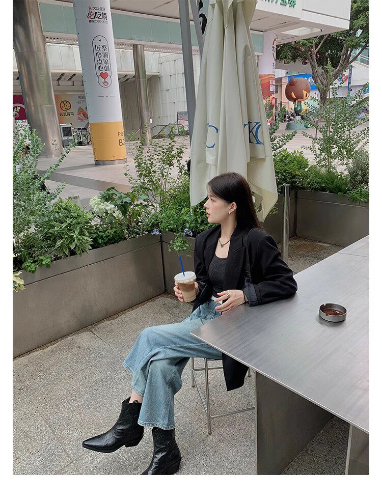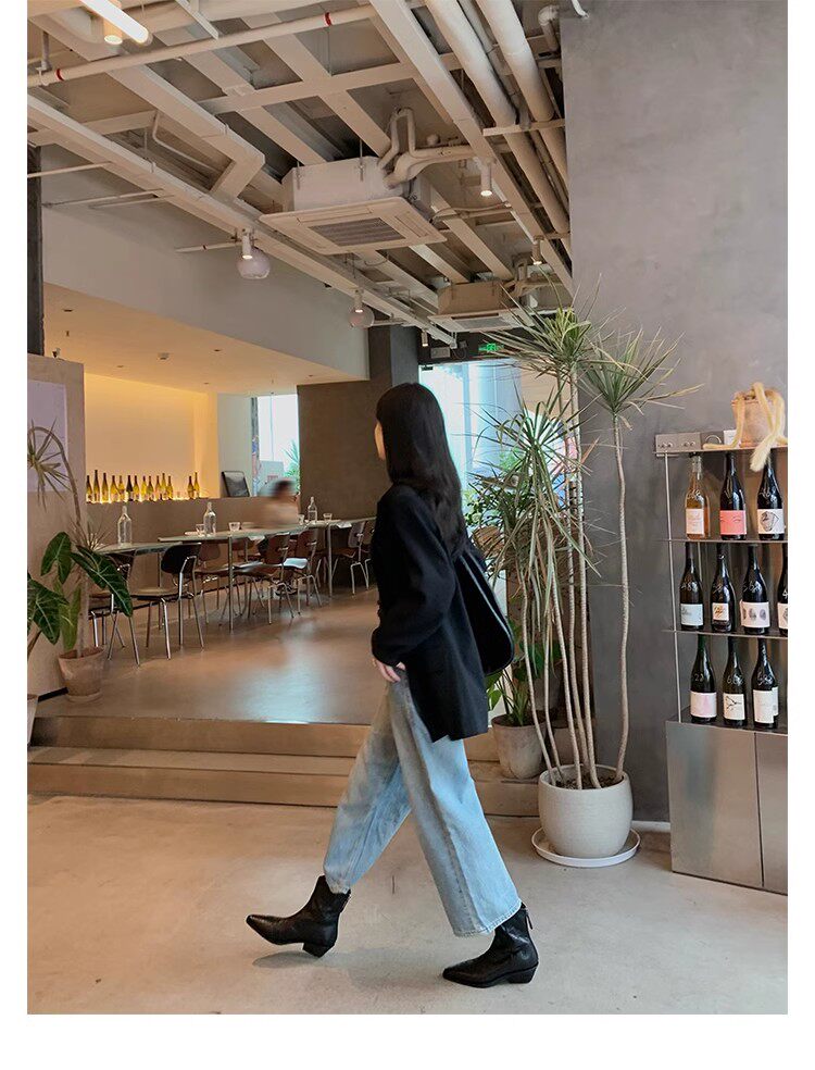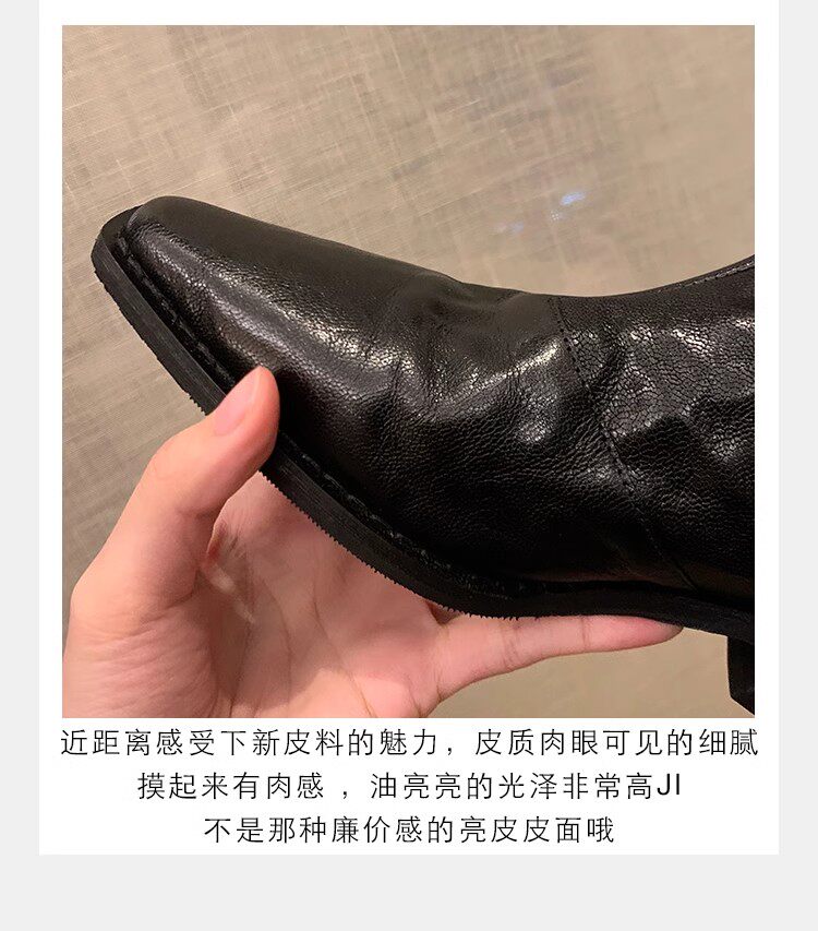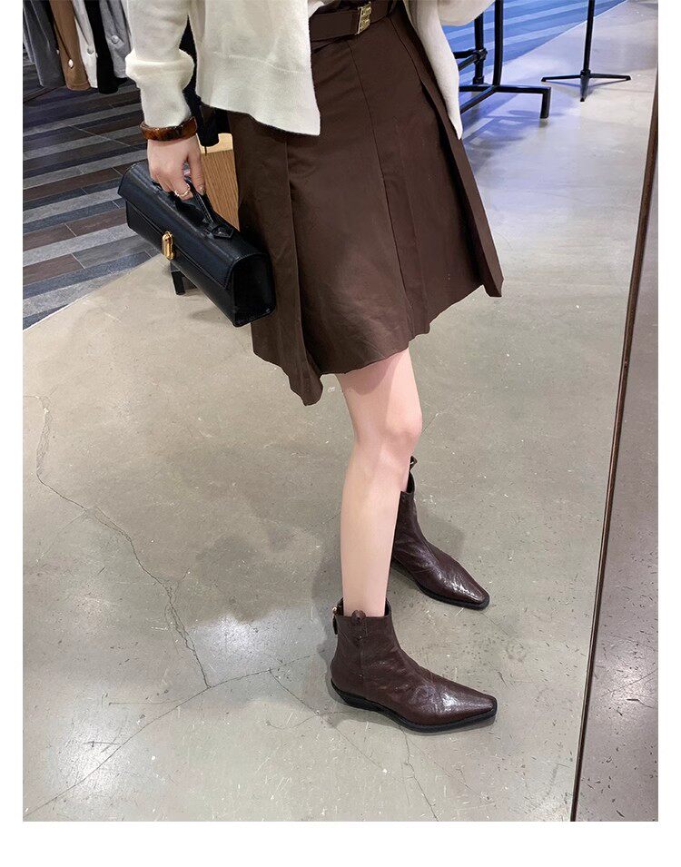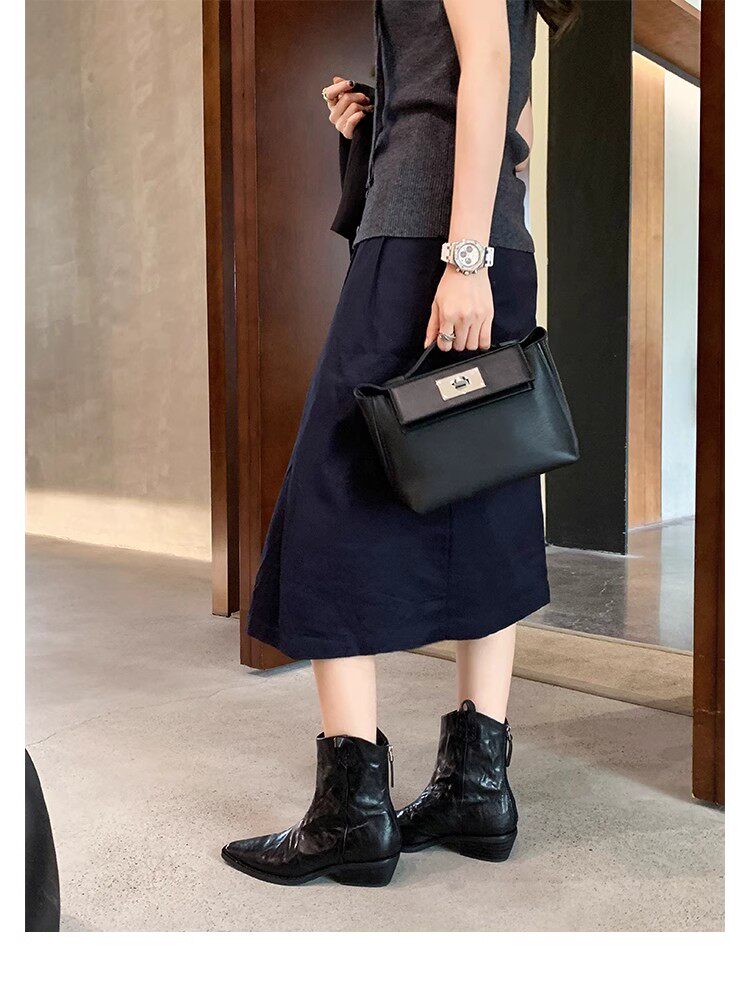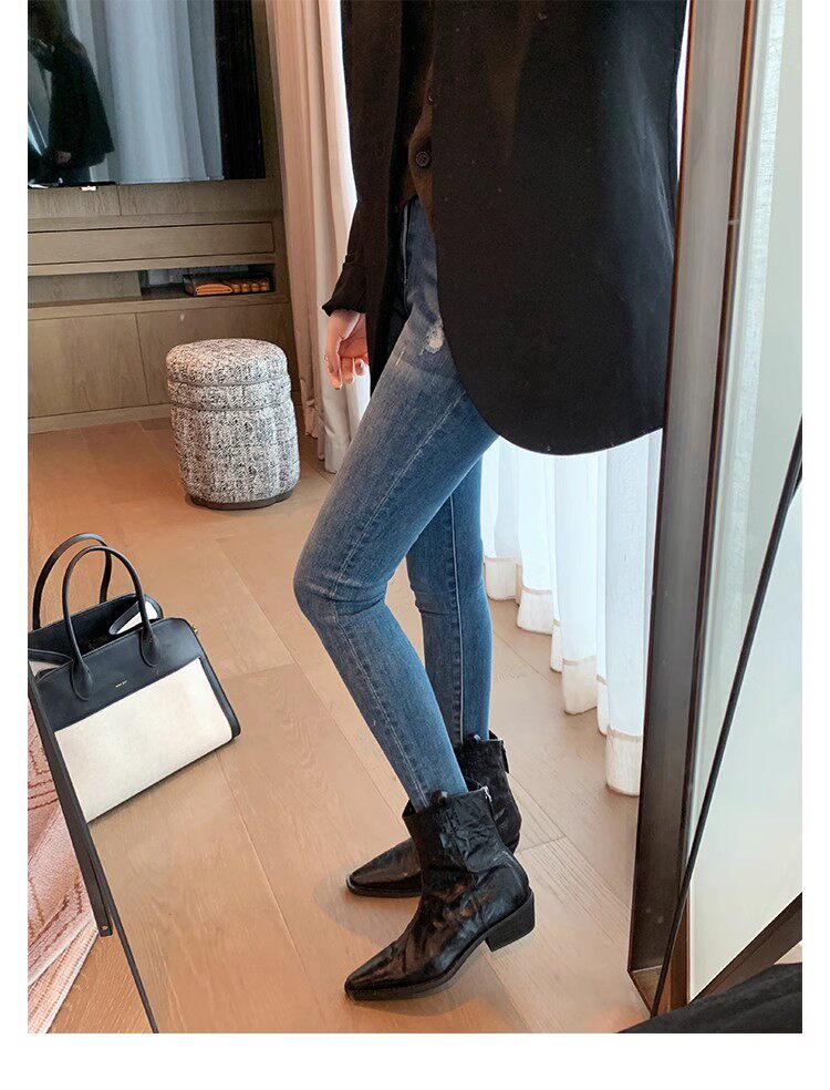 牛皮版~時髦尖頭V口顯瘦粗跟皺感西部短靴女真皮馬丁靴單靴小踝靴