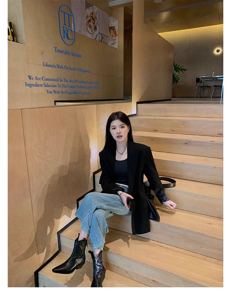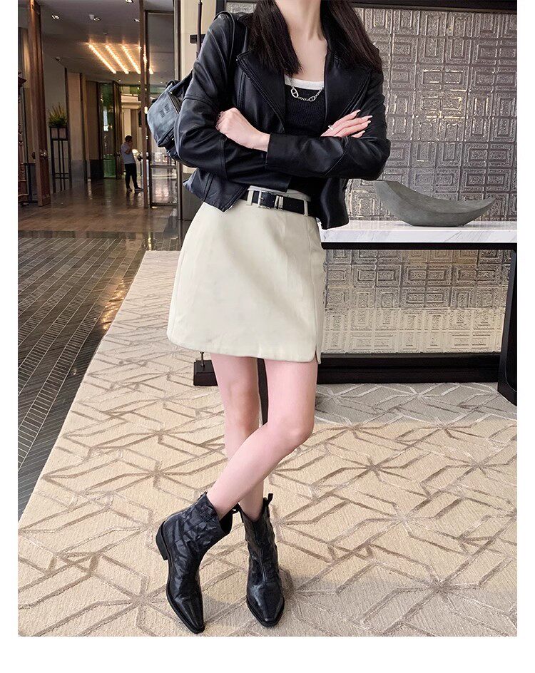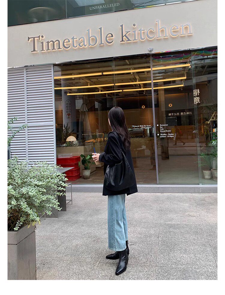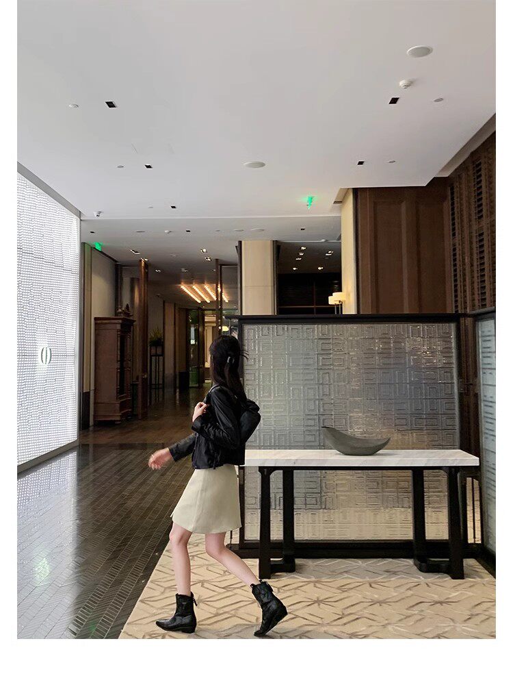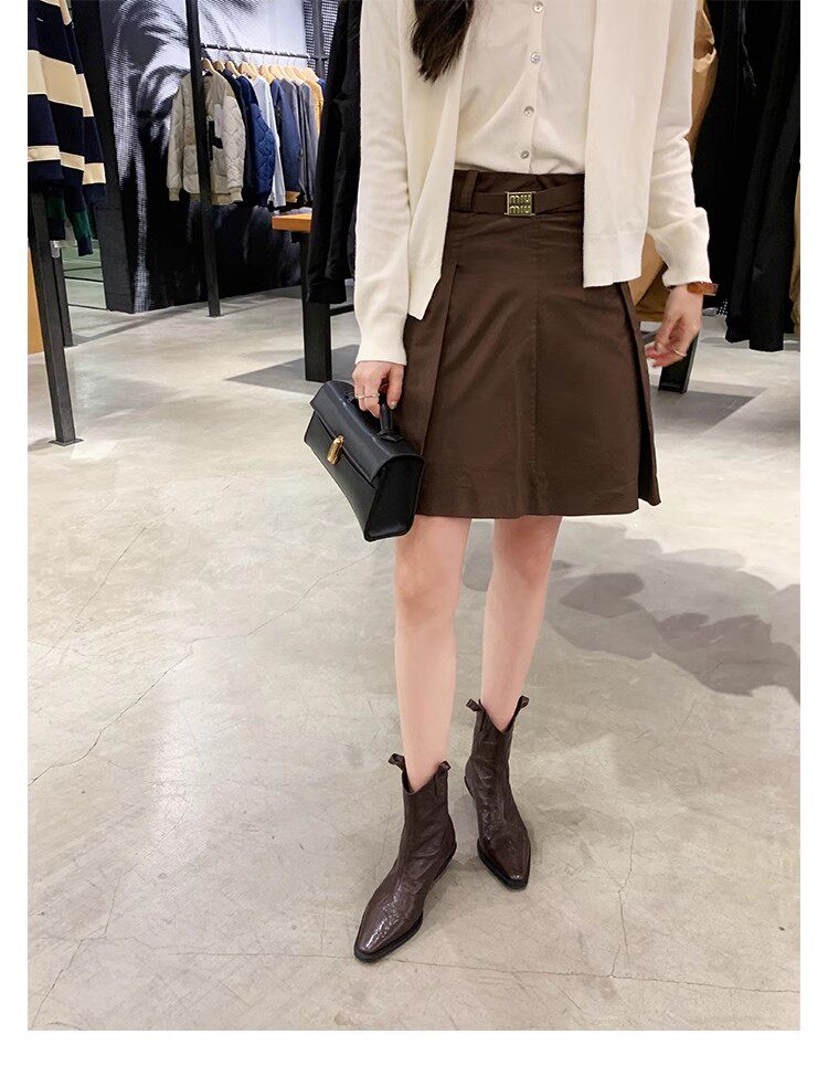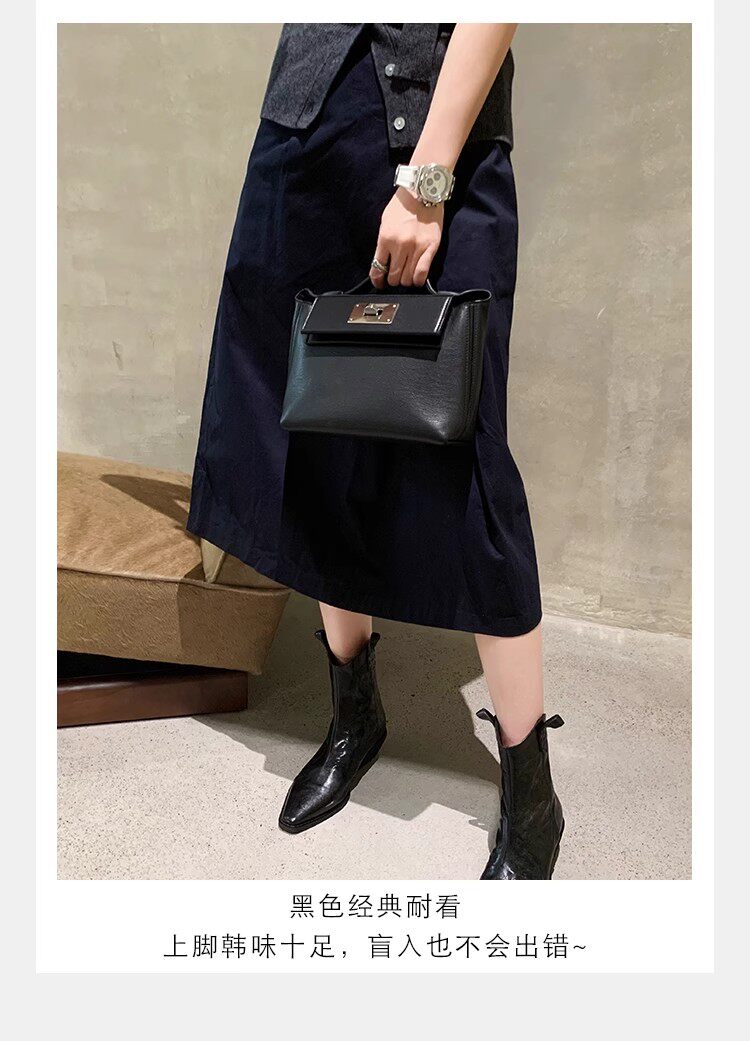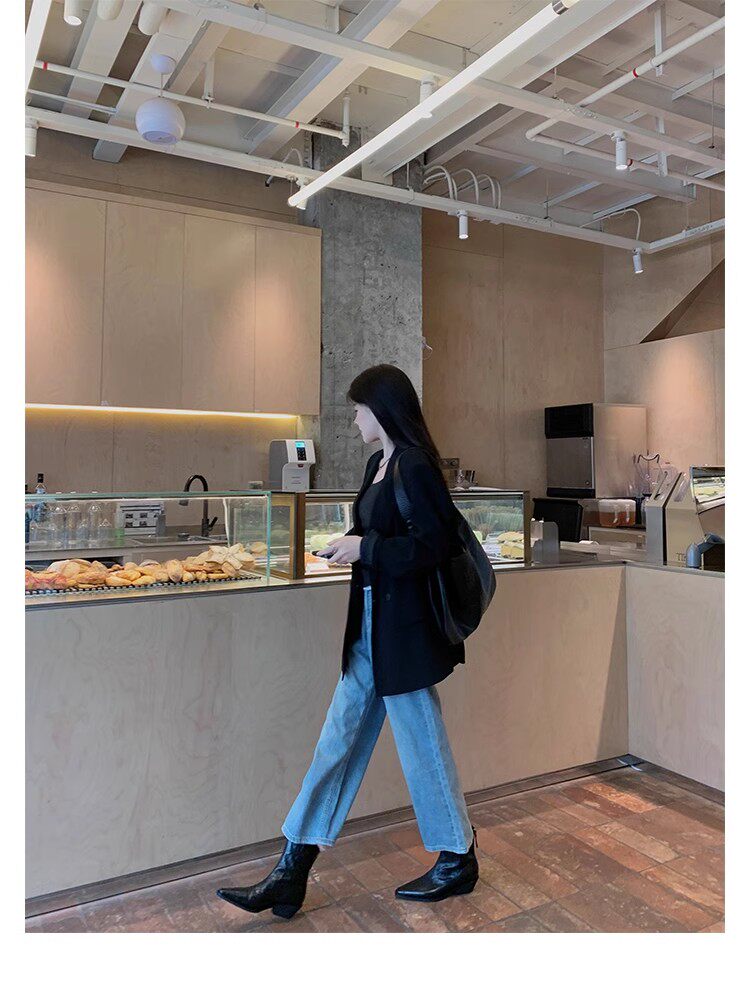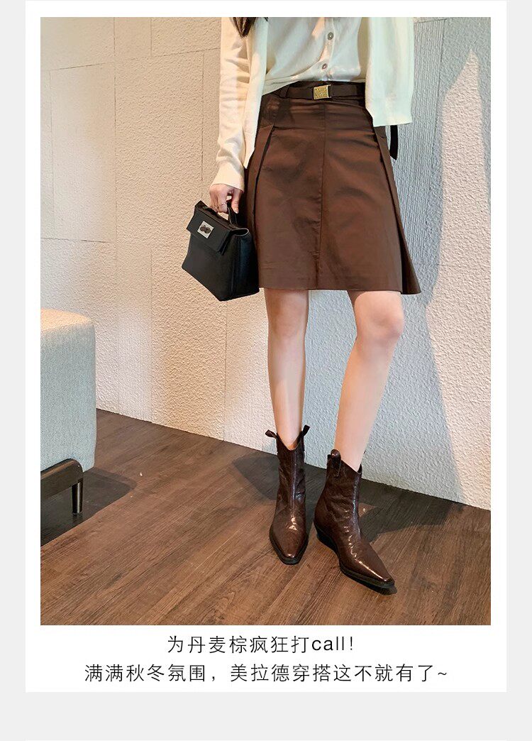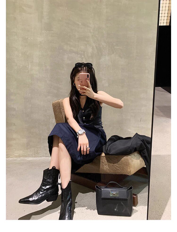 牛皮版~時髦尖頭V口顯瘦粗跟皺感西部短靴女真皮馬丁靴單靴小踝靴