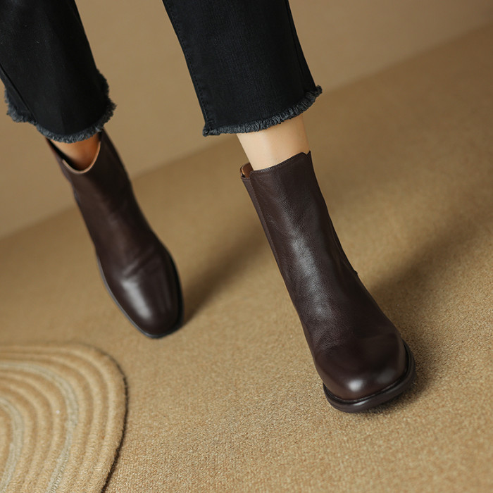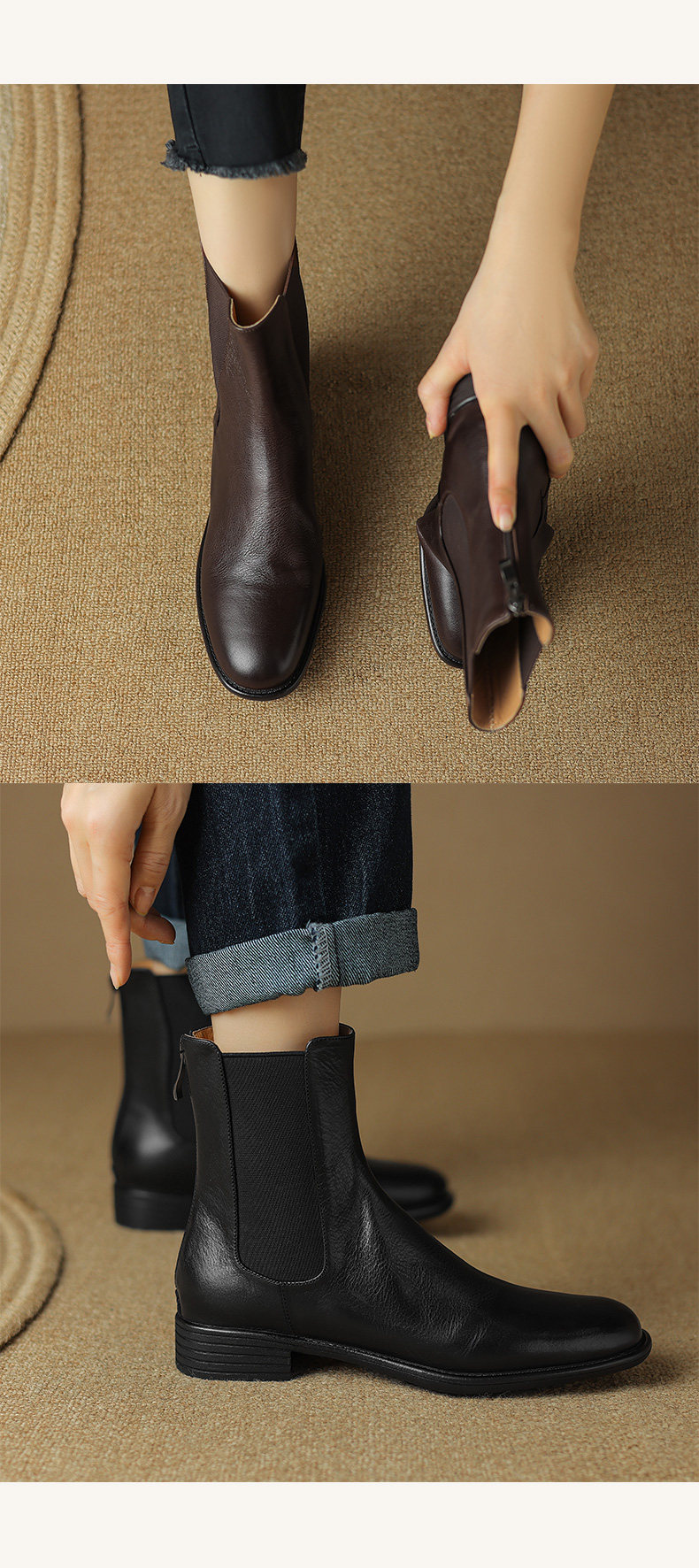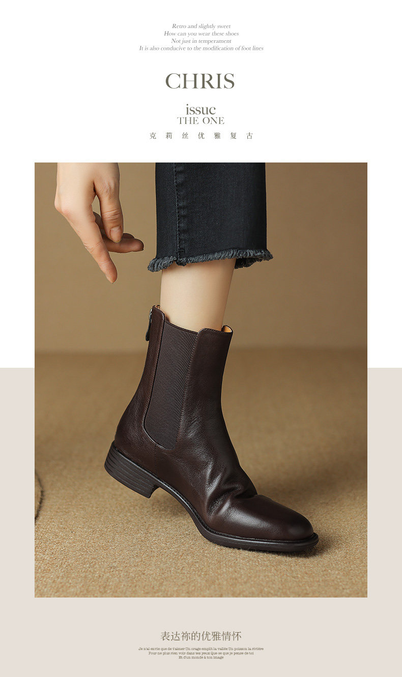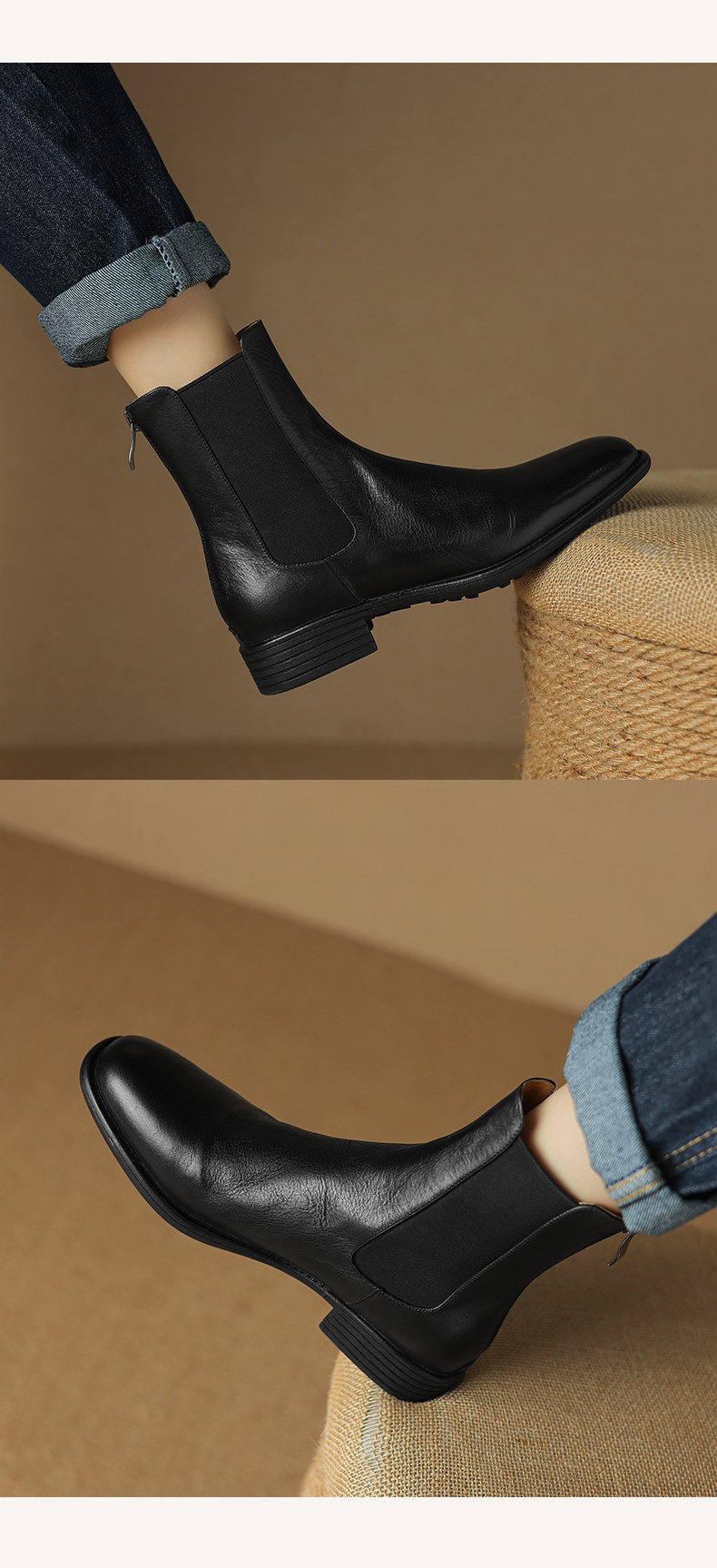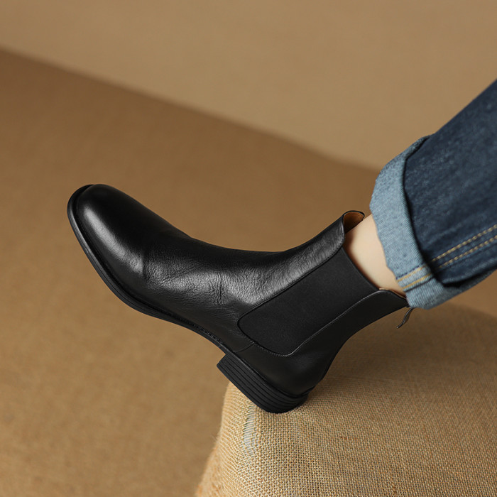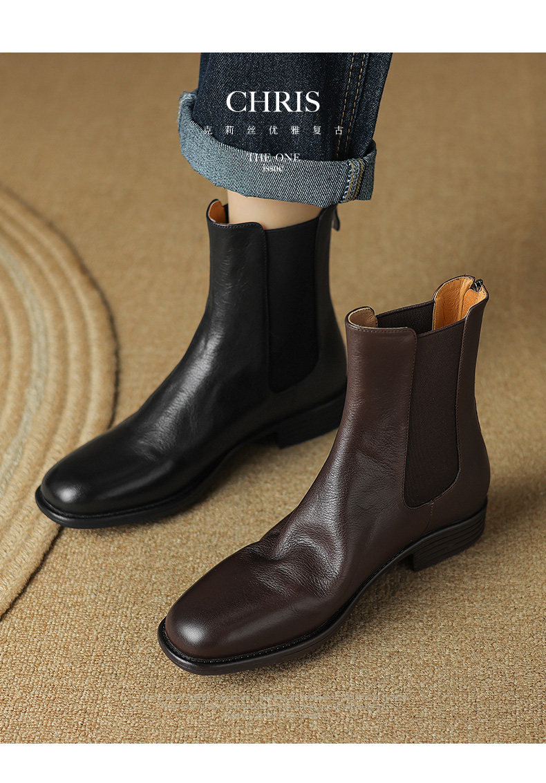 全牛皮圓頭切爾西靴女2024秋季新款粗跟短靴軟底加絨棉靴