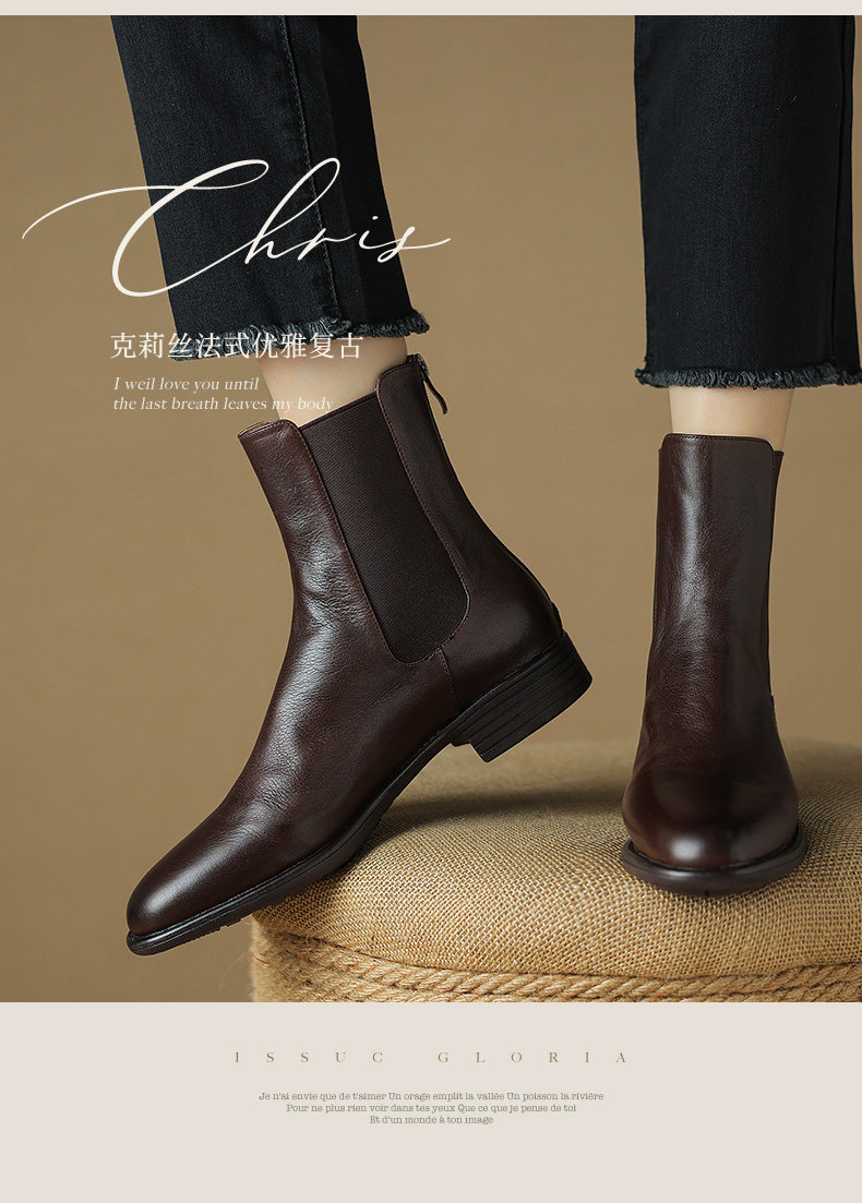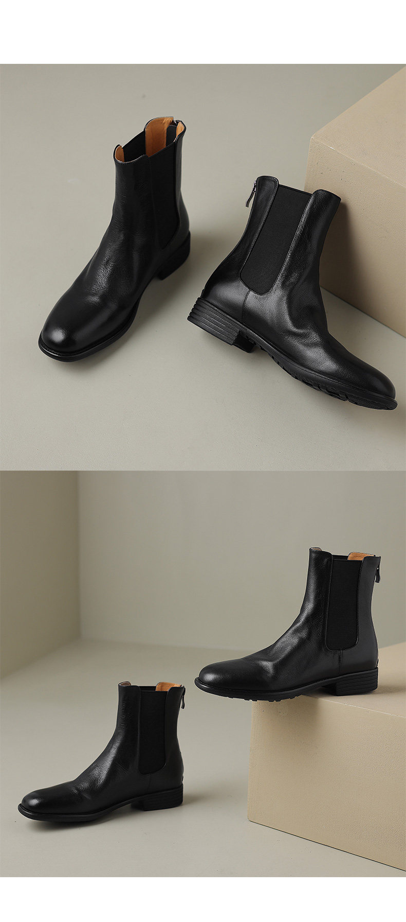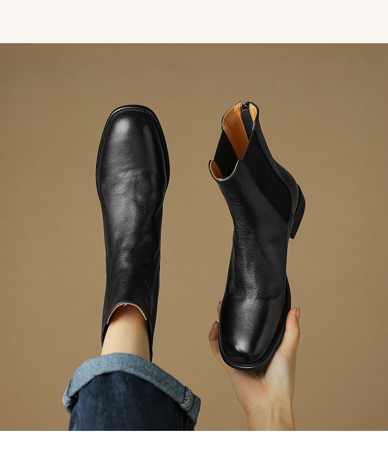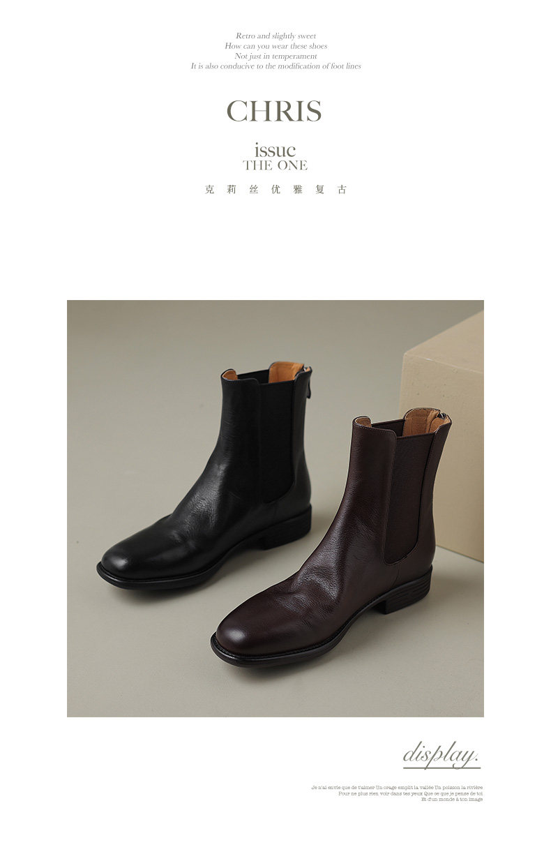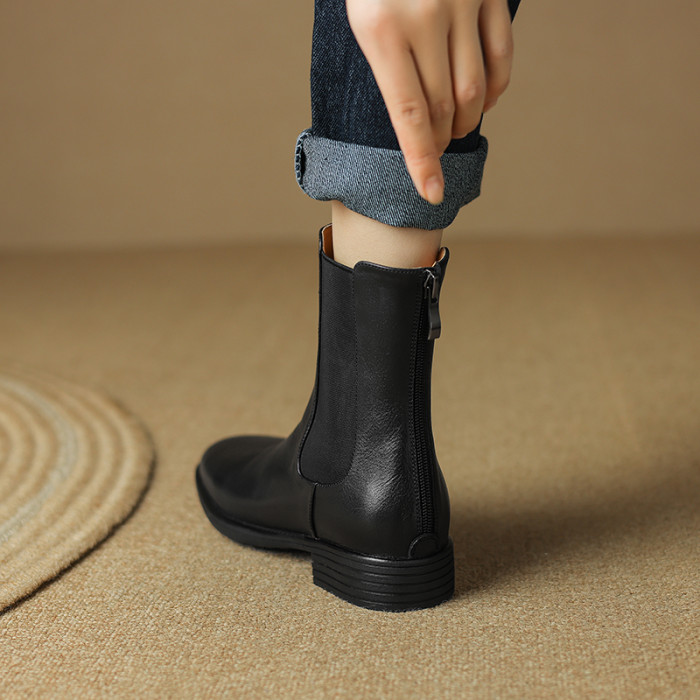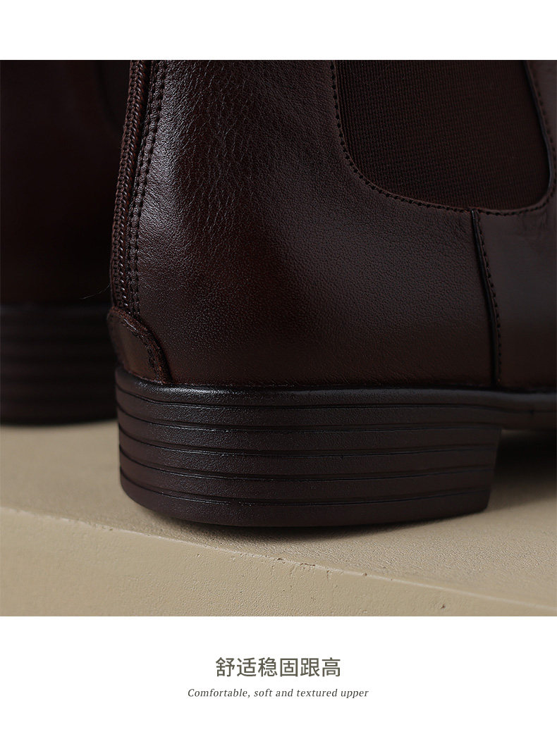 全牛皮圓頭切爾西靴女2024秋季新款粗跟短靴軟底加絨棉靴