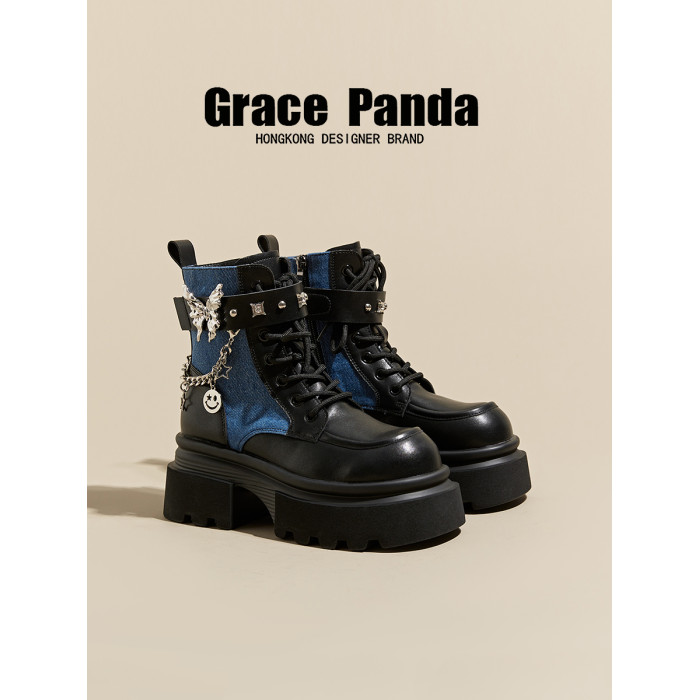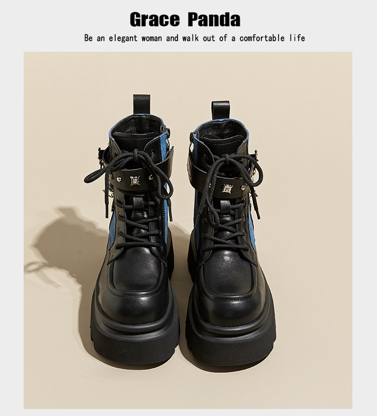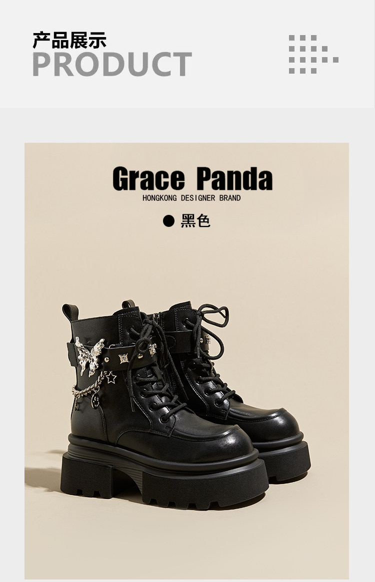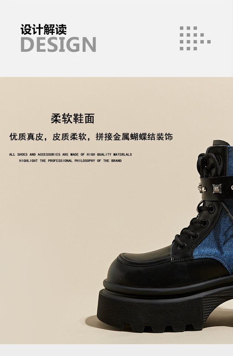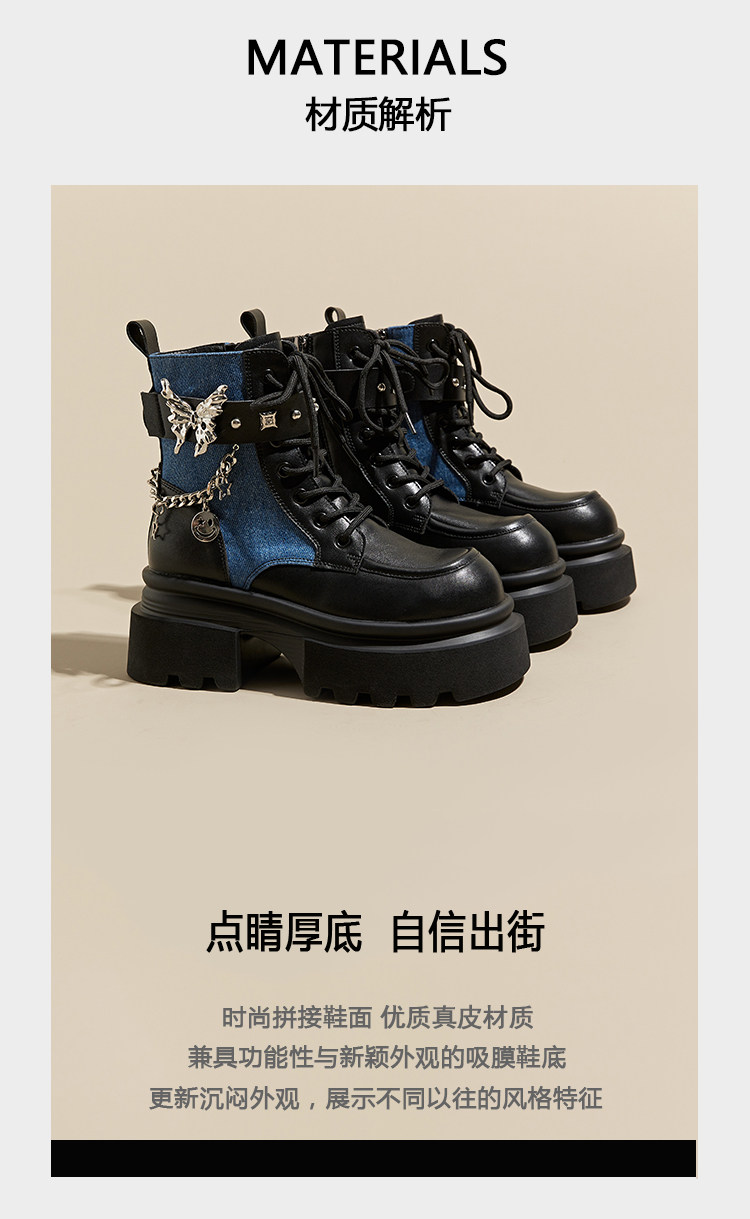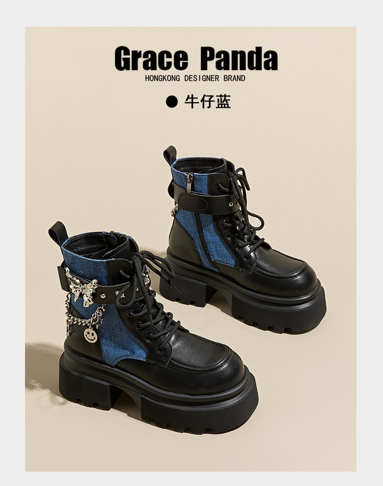 香港GP2025新款秋冬季真皮拼色英倫馬丁靴厚底內增高9CM機車靴女