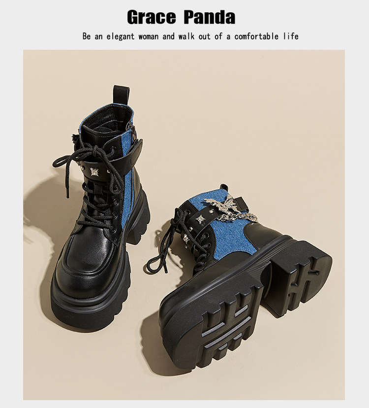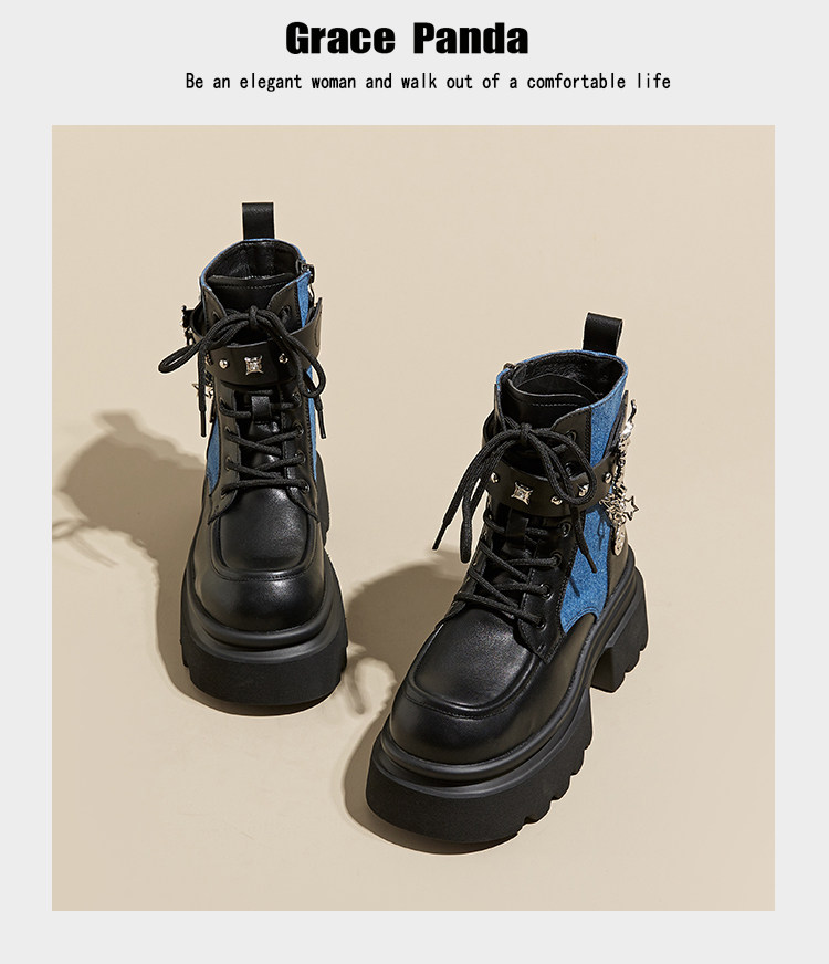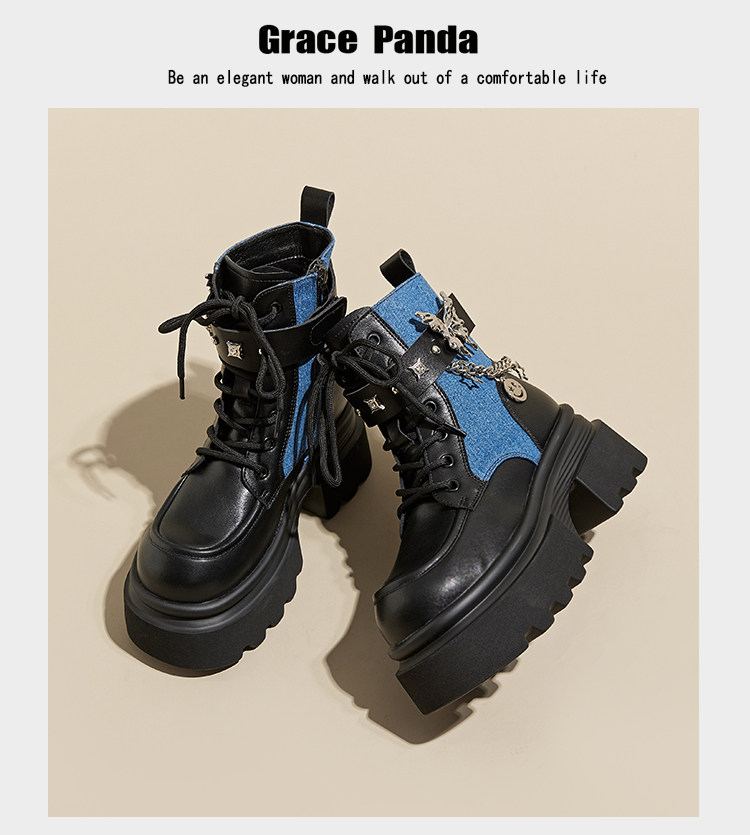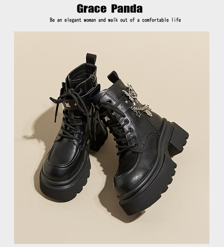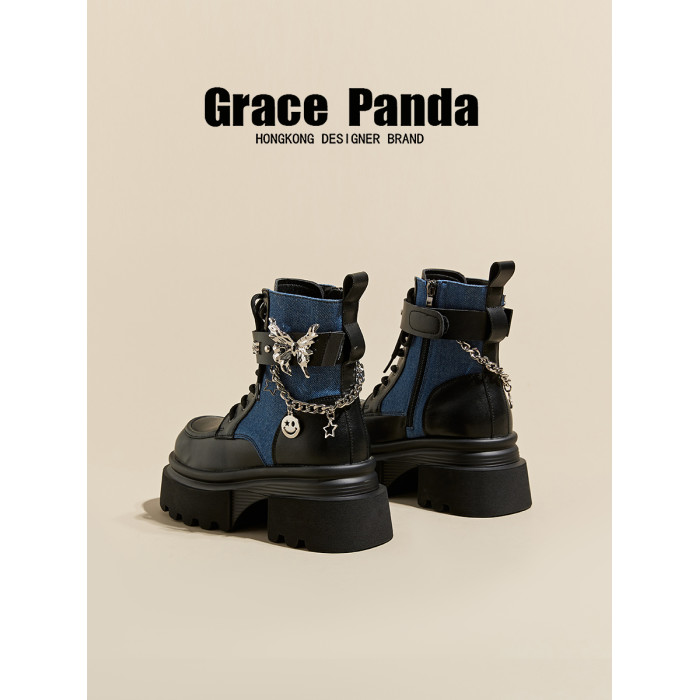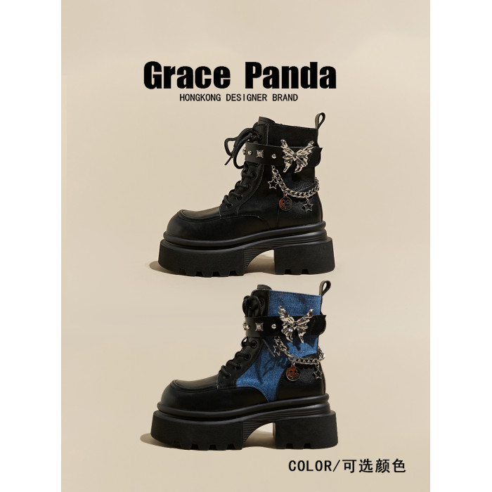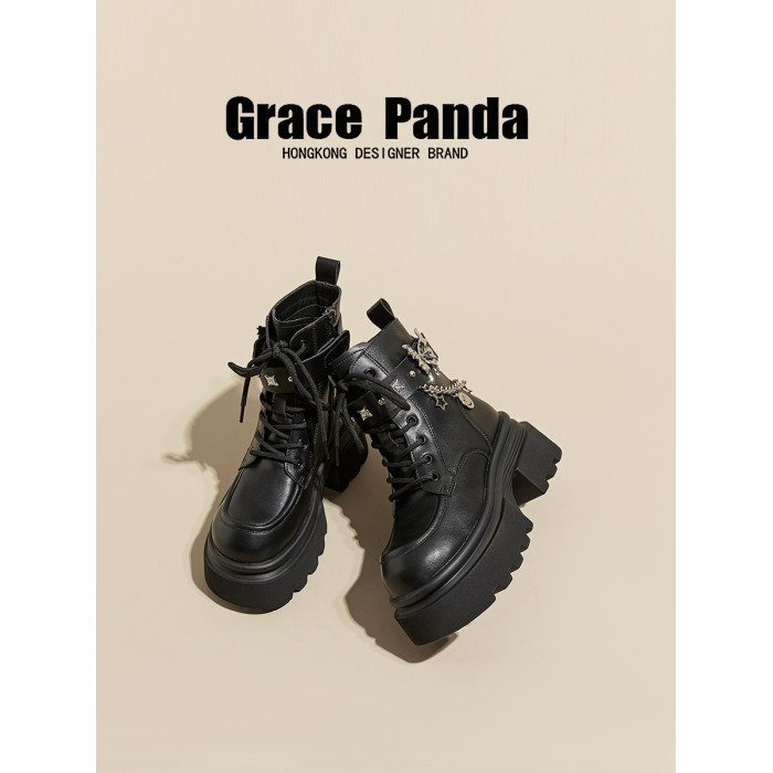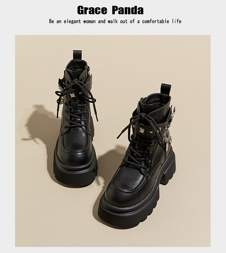 香港GP2025新款秋冬季真皮拼色英倫馬丁靴厚底內增高9CM機車靴女