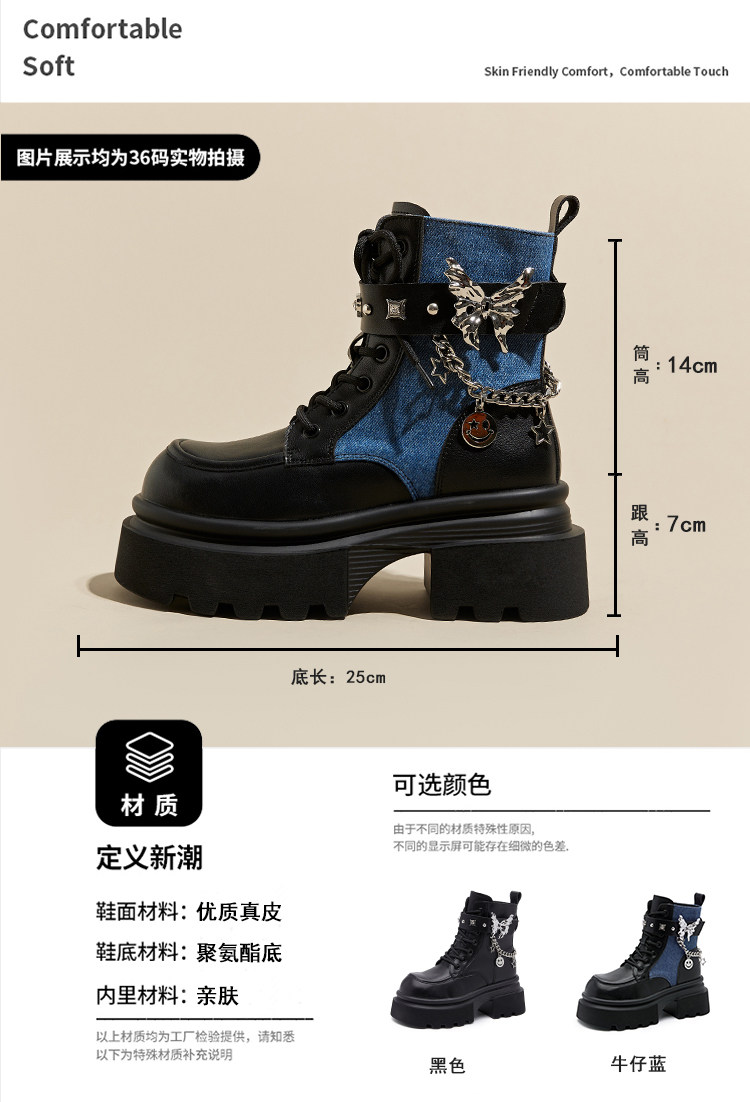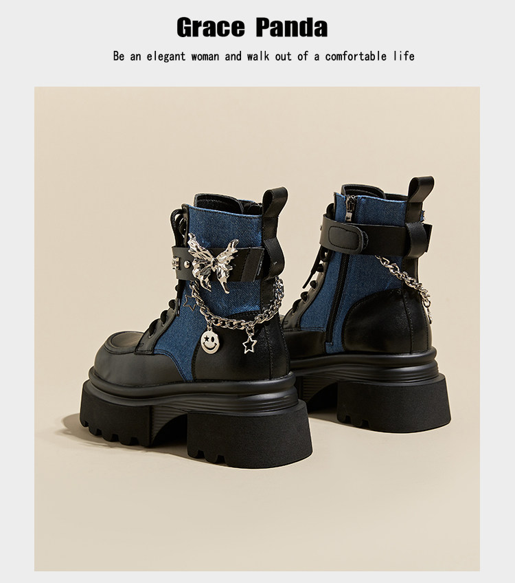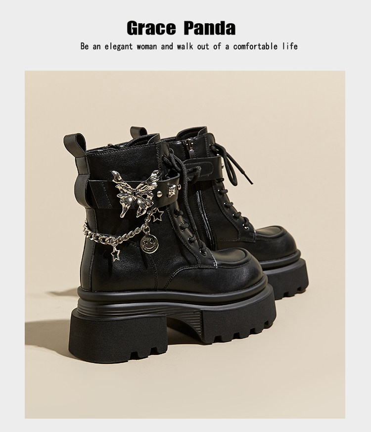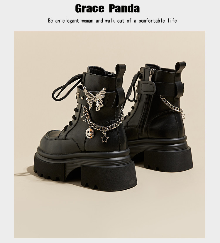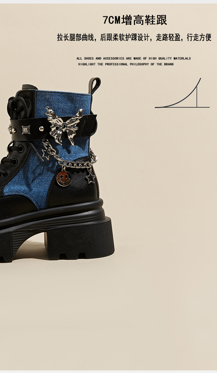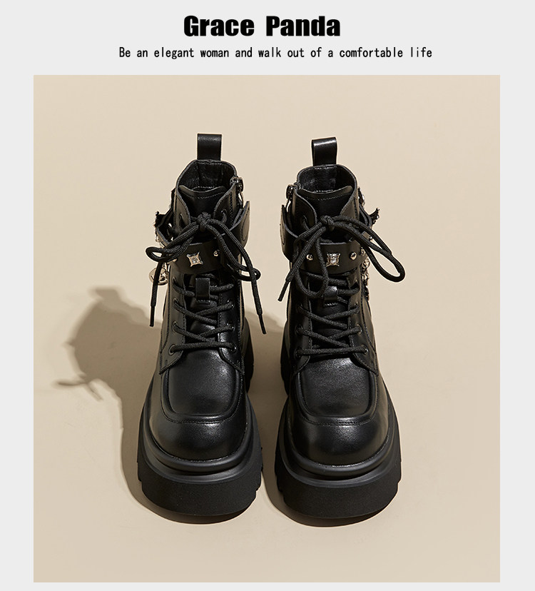 香港GP2025新款秋冬季真皮拼色英倫馬丁靴厚底內增高9CM機車靴女