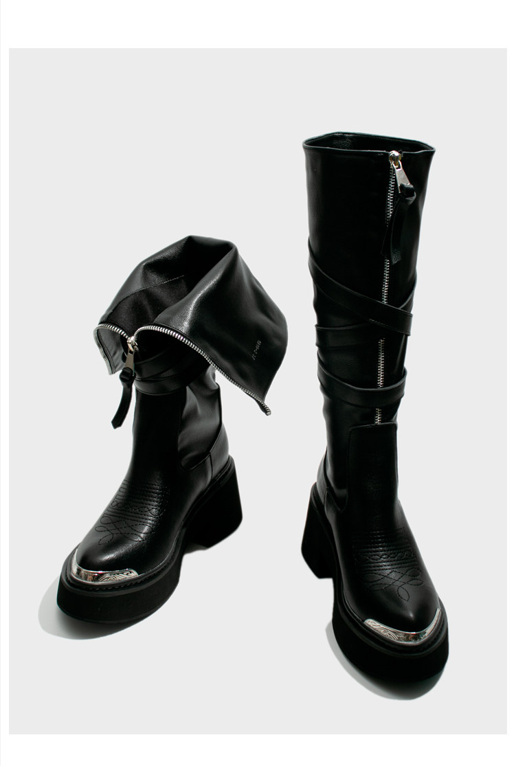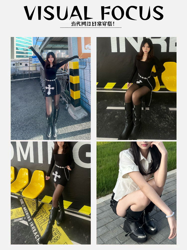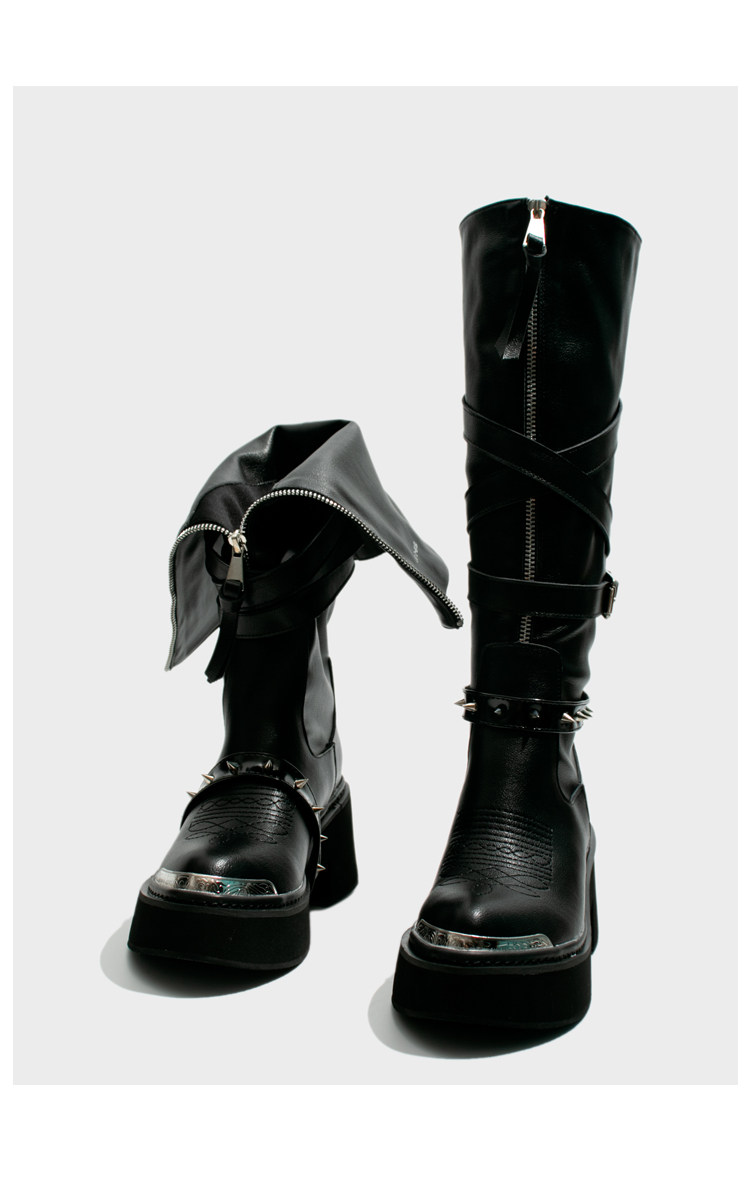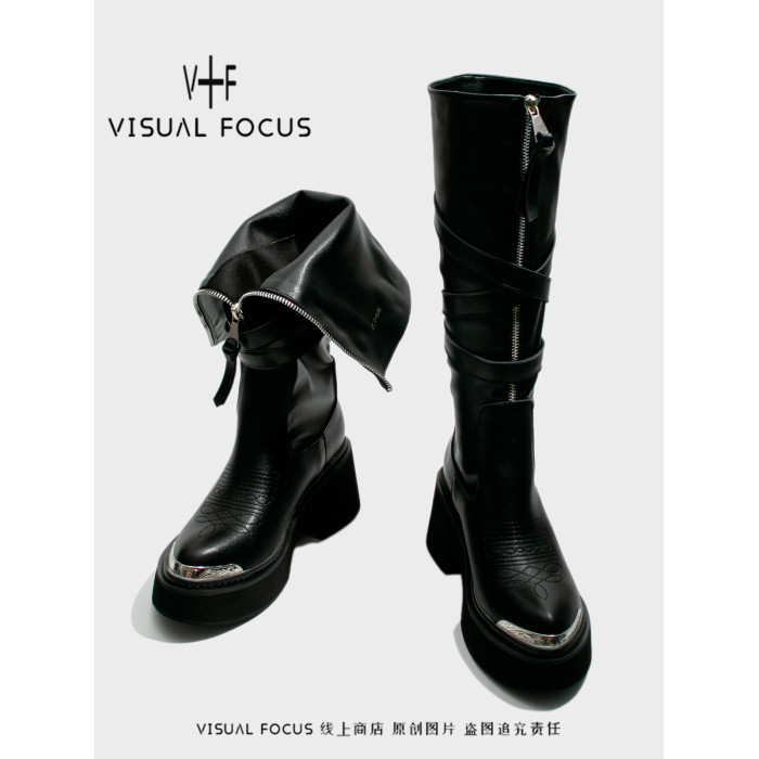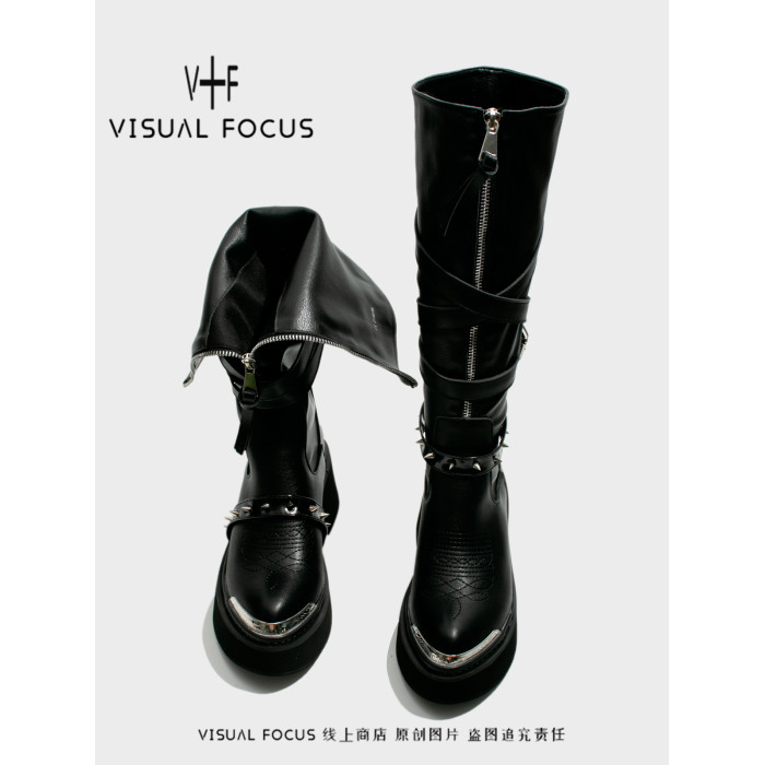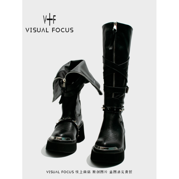 Visual focus 鉚釘重金屬高筒靴女y2k港潮龐克松糕厚底長筒時裝靴