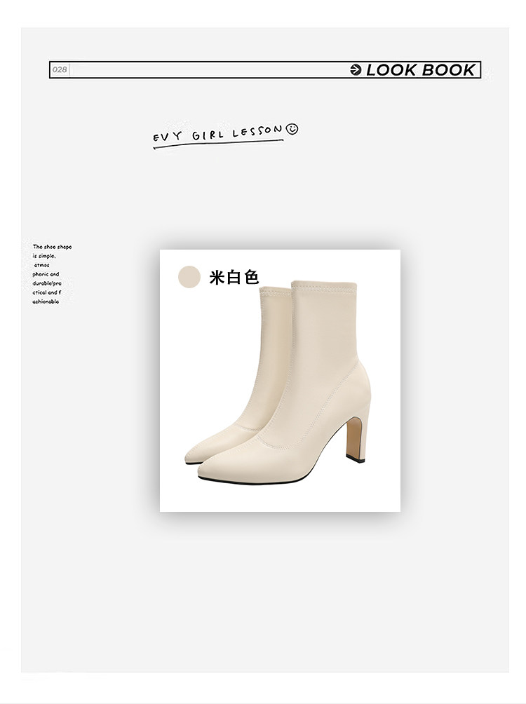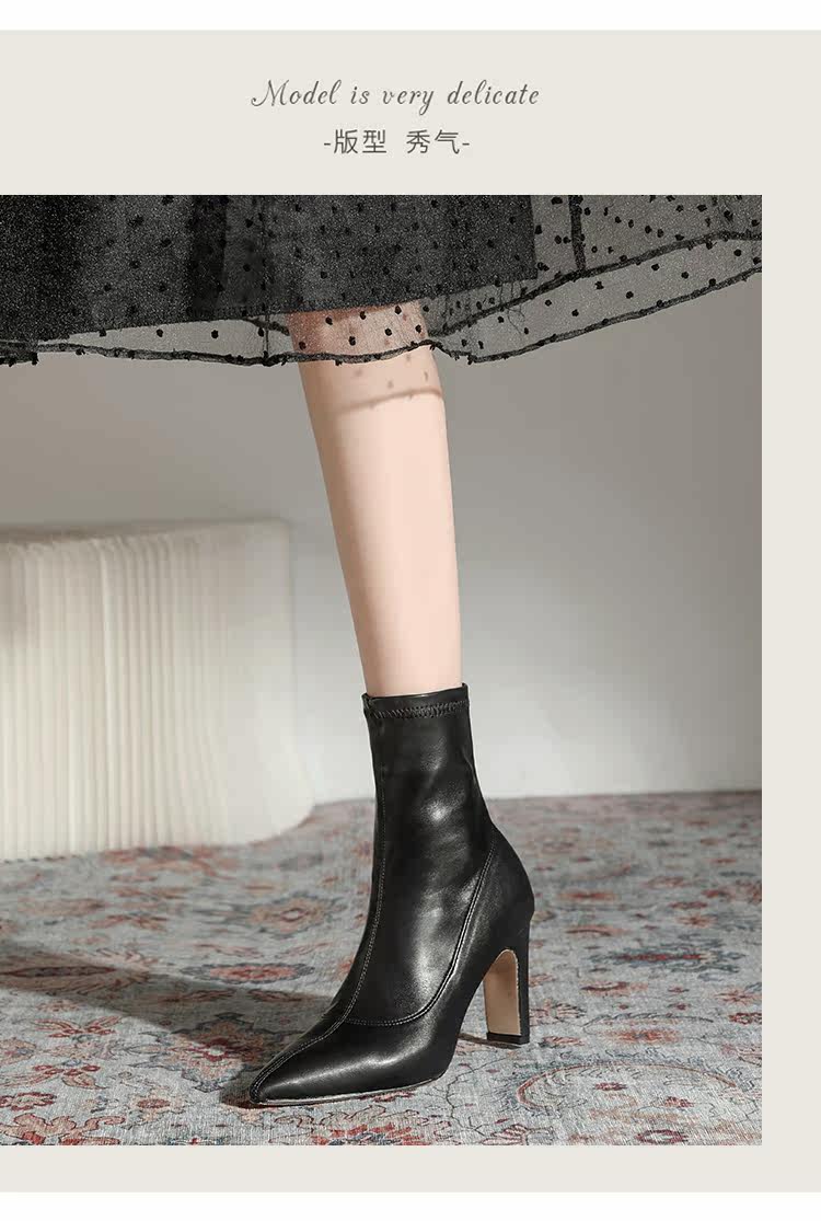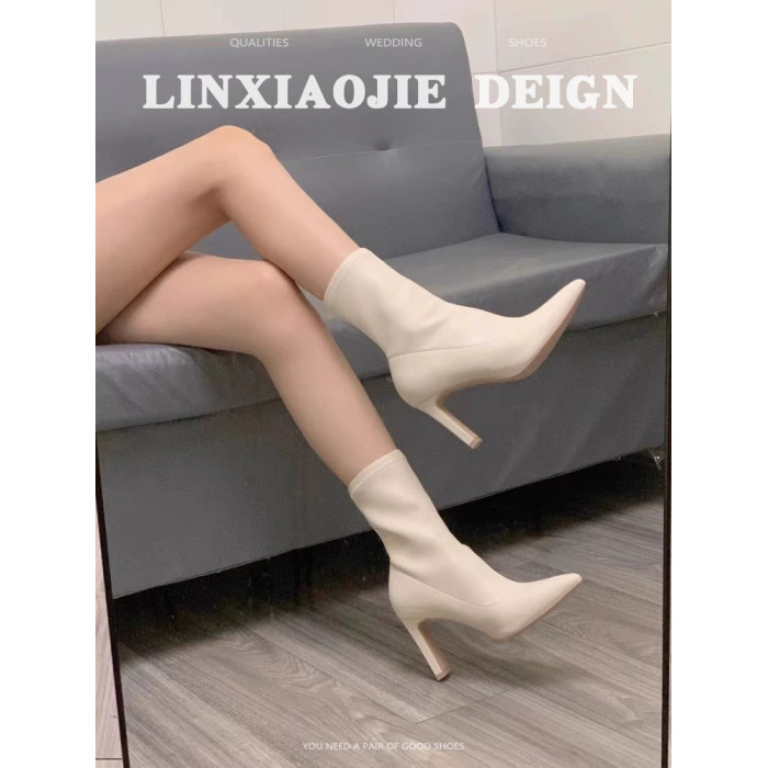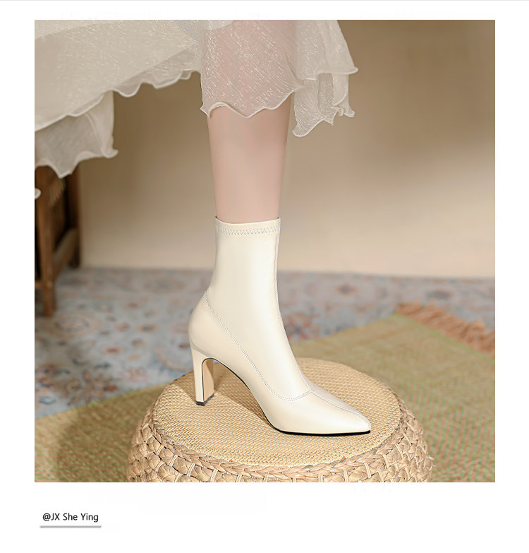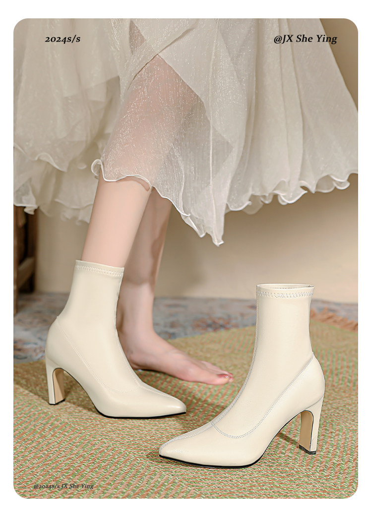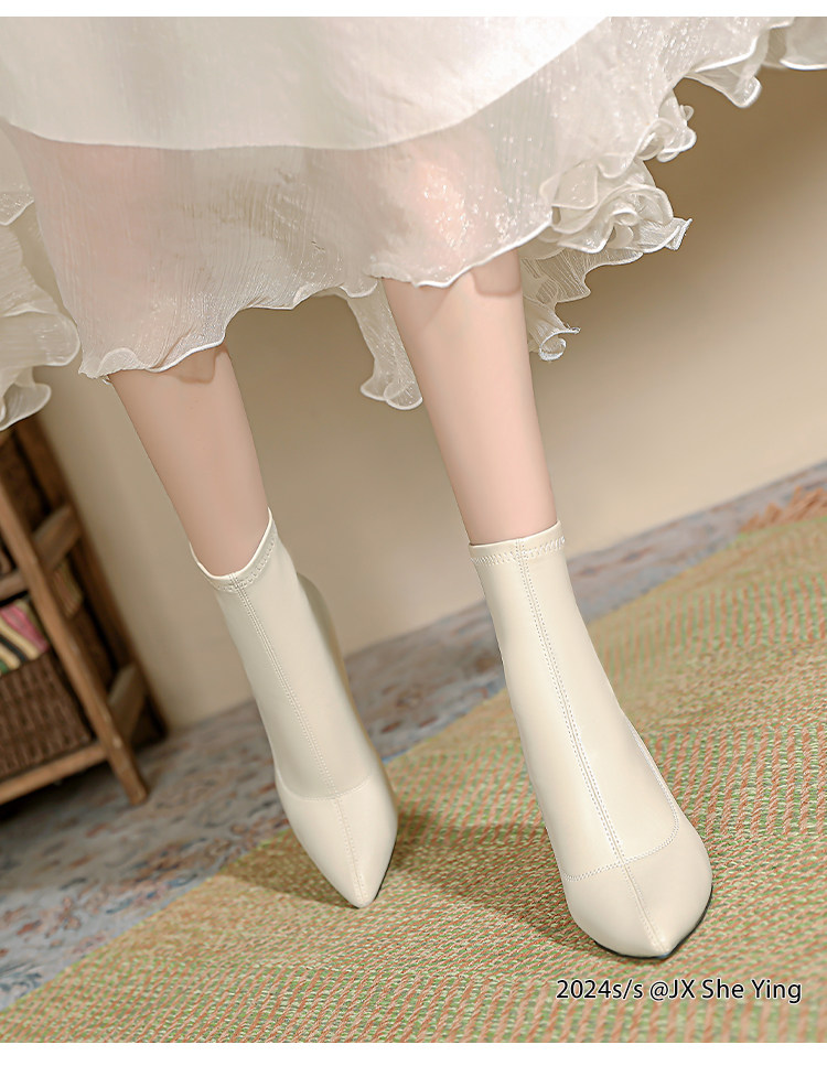 尖頭白色短靴女2026年新款網紅百搭法式瘦瘦靴彈力粗跟襪靴高跟鞋