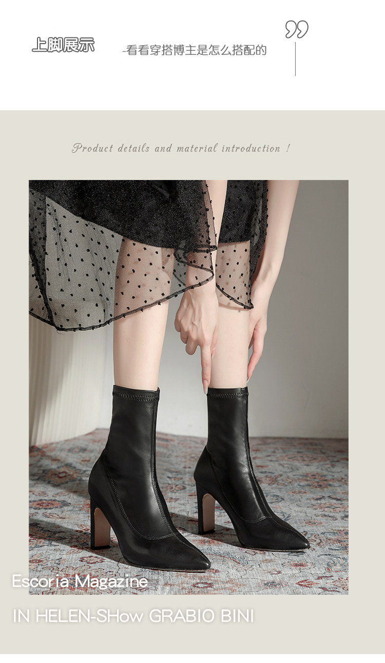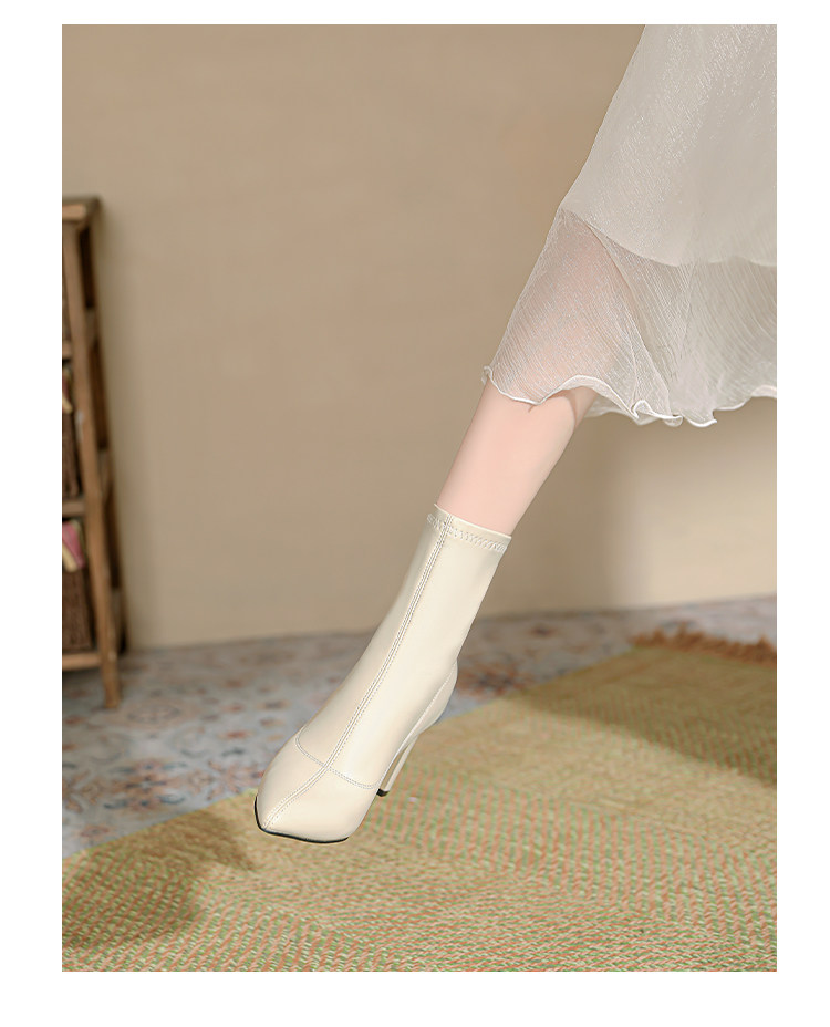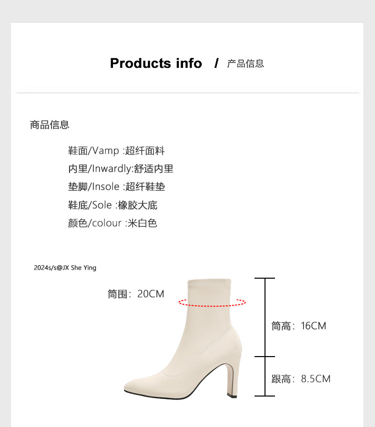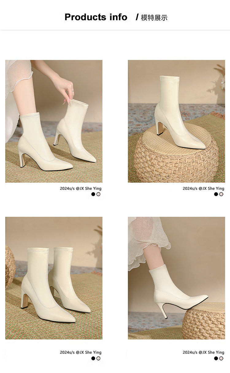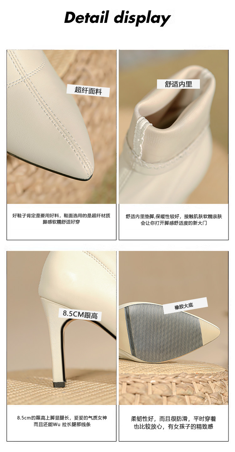 尖頭白色短靴女2026年新款網紅百搭法式瘦瘦靴彈力粗跟襪靴高跟鞋