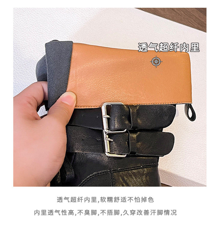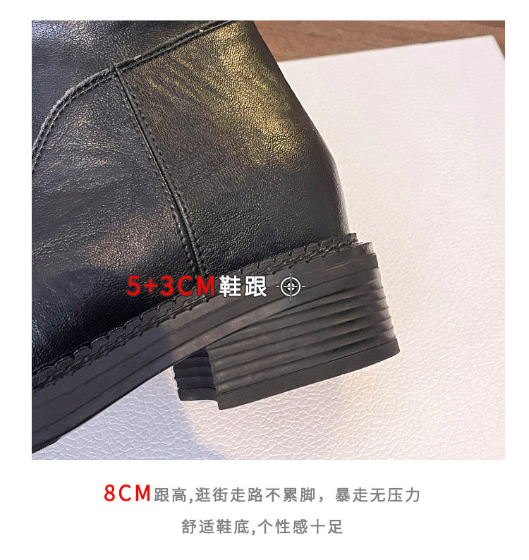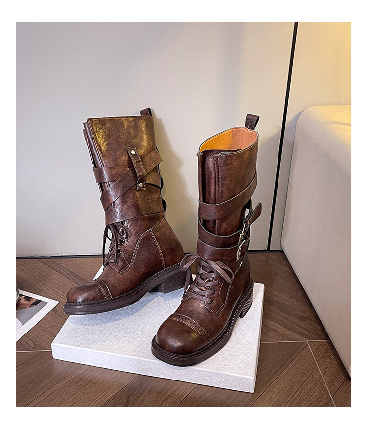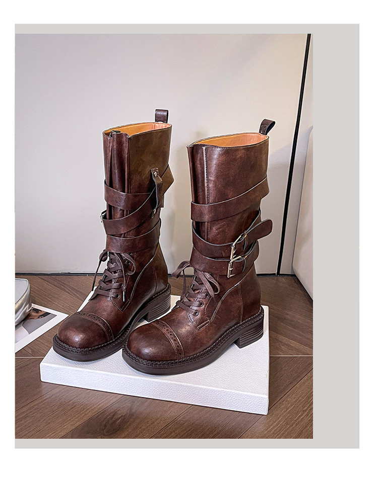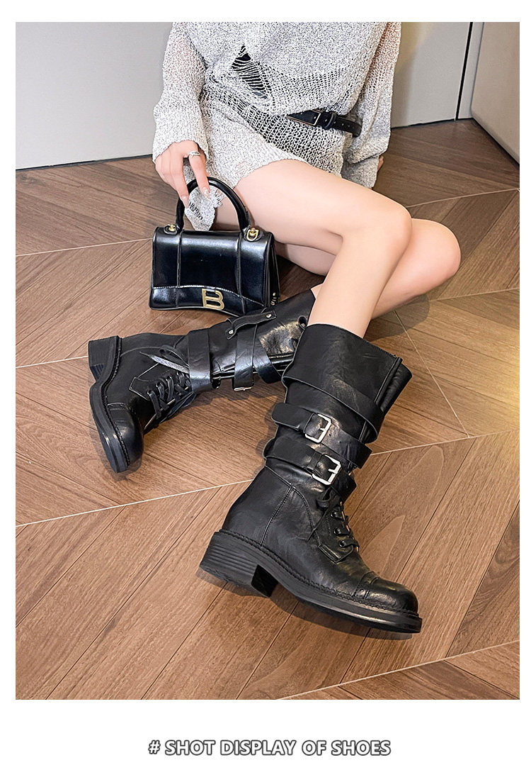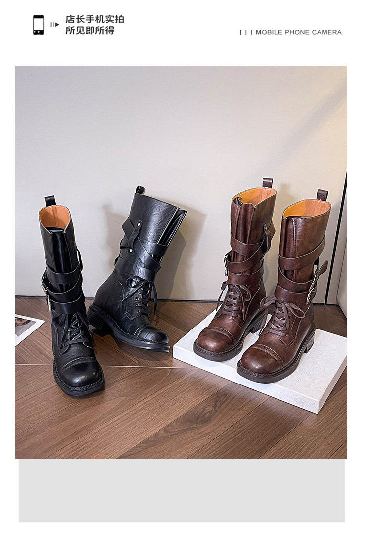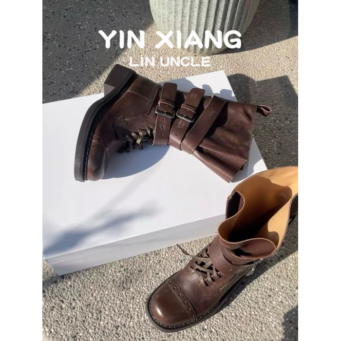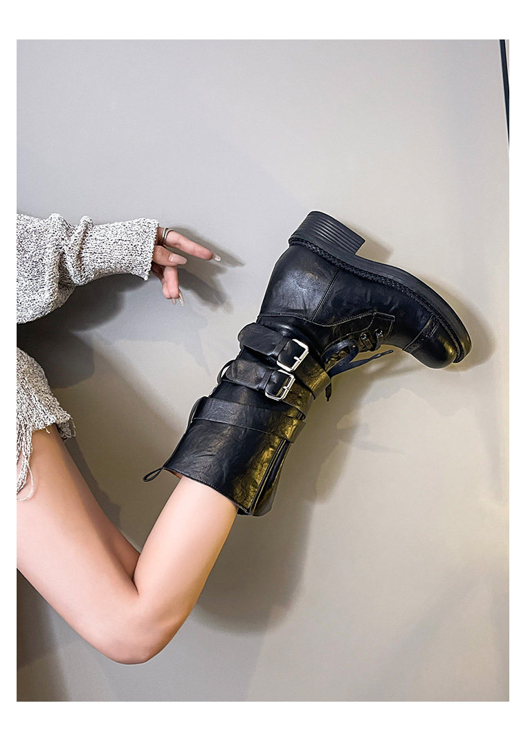 牛皮版~真皮厚底粗跟擦色馬丁靴女2025新款中筒皮帶釦機車靴單靴