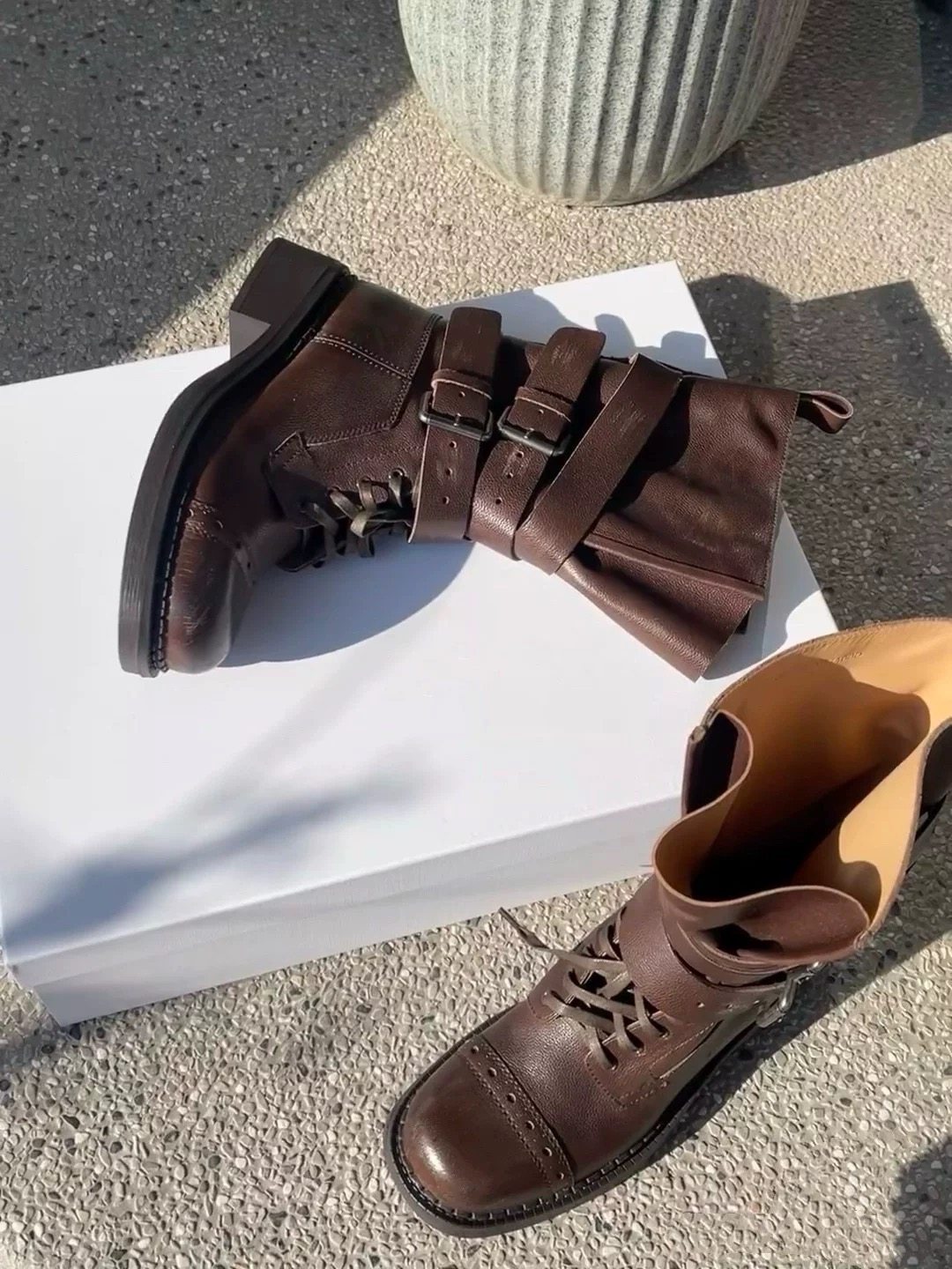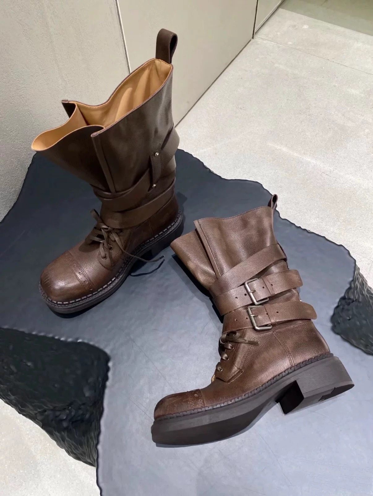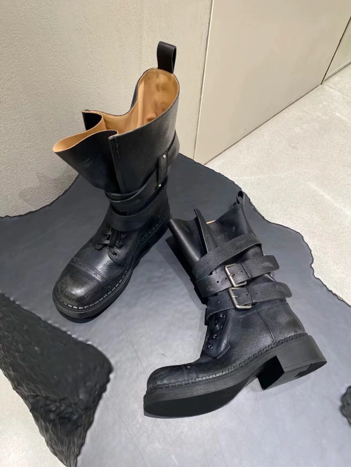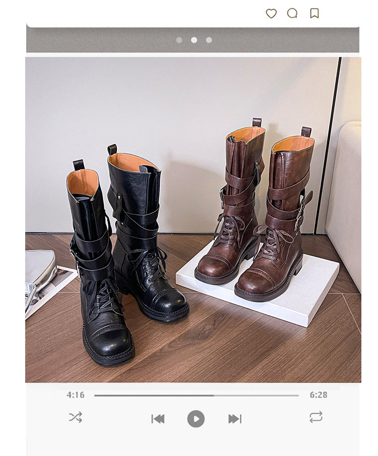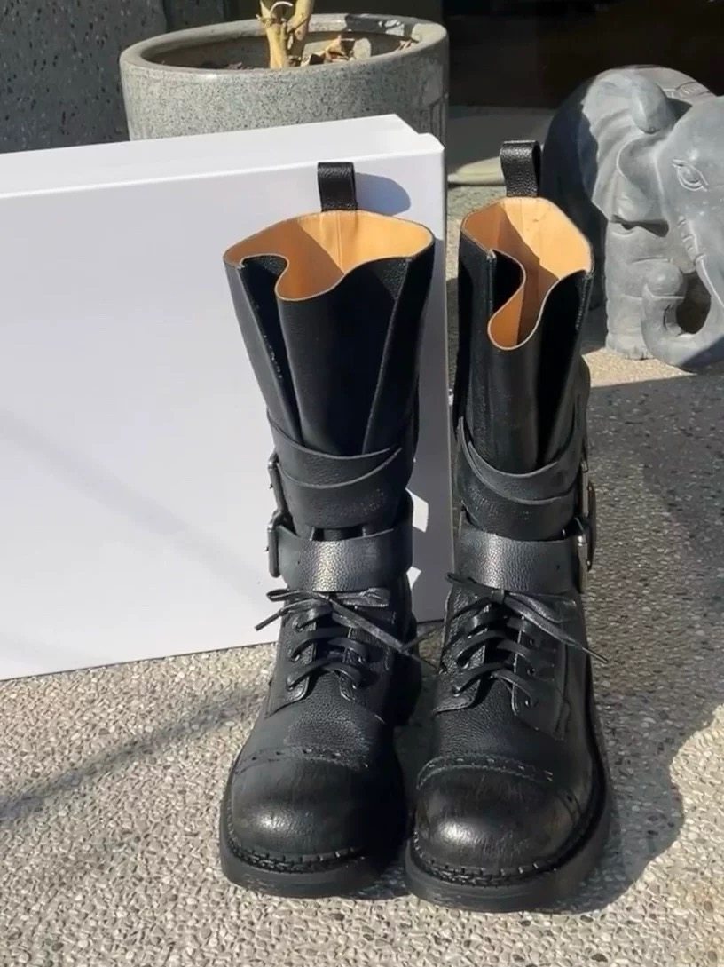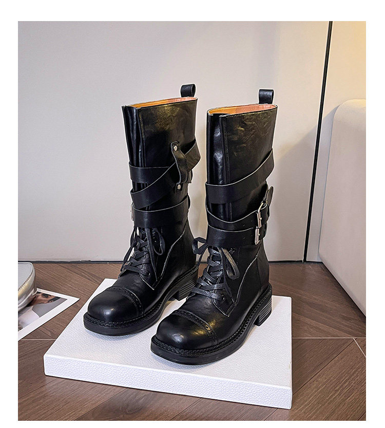 牛皮版~真皮厚底粗跟擦色馬丁靴女2025新款中筒皮帶釦機車靴單靴