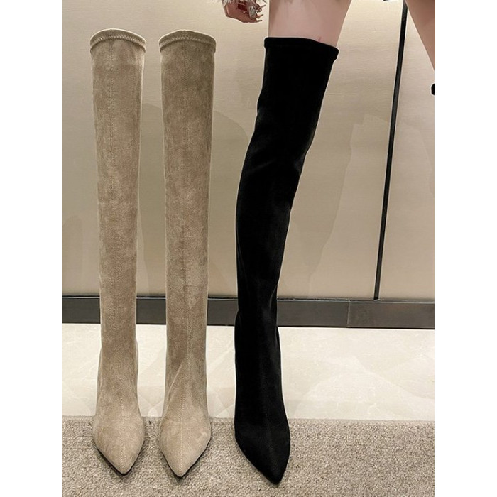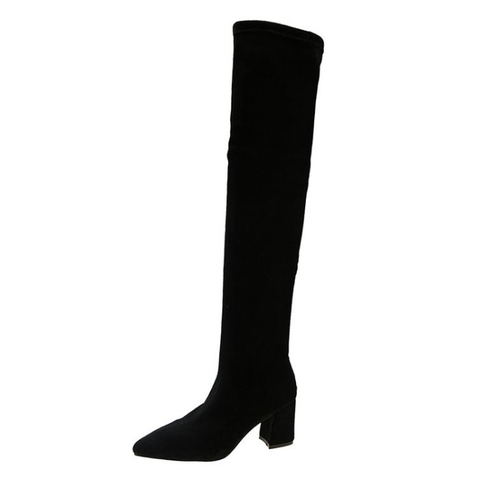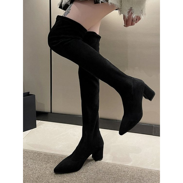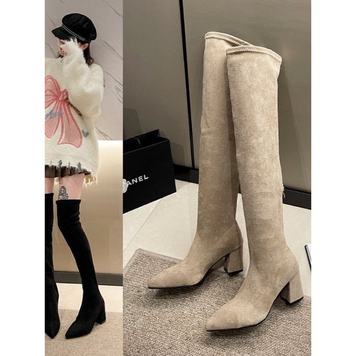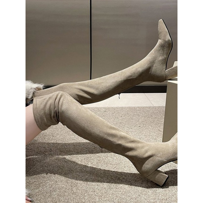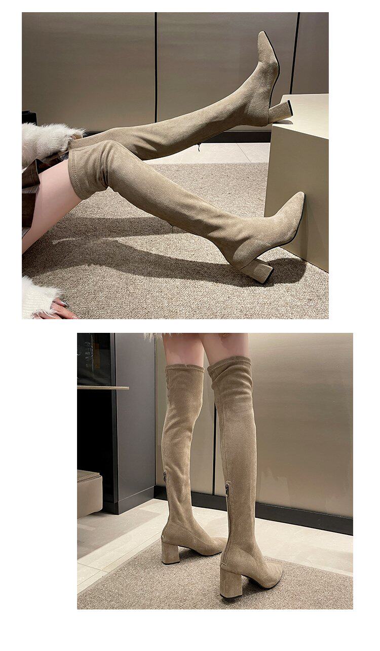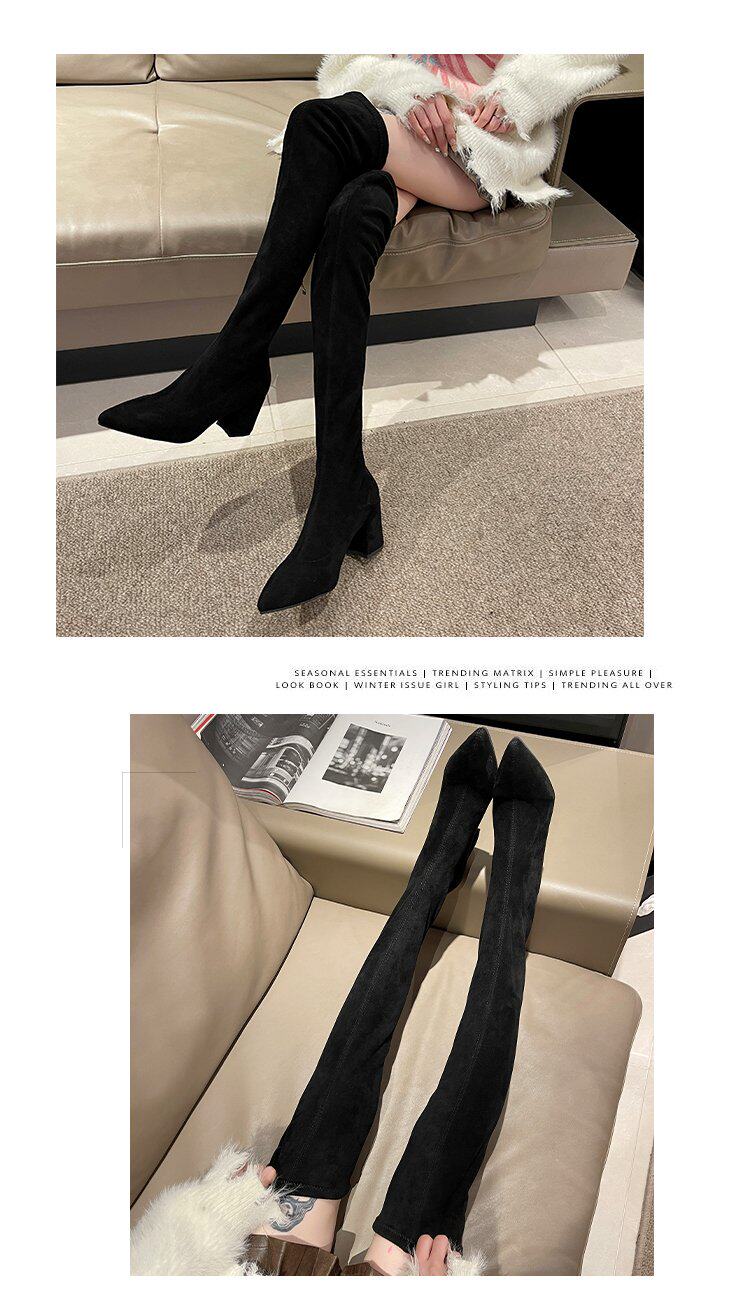 歐美風尖頭粗跟過膝長靴女2025秋冬絨面彈力瘦瘦靴辣妹性感高跟靴