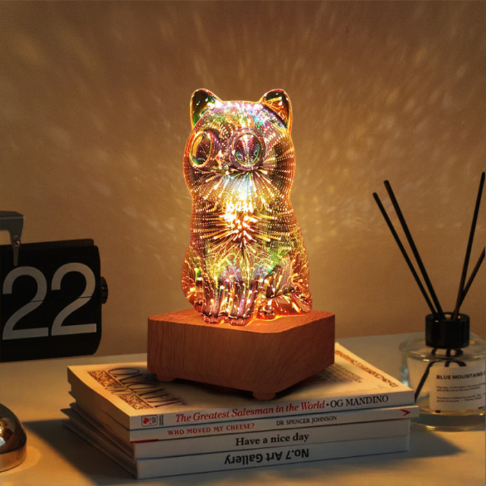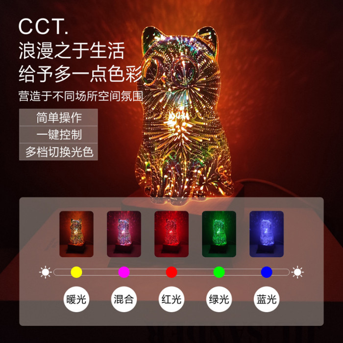 新款LED3D玻璃台燈愛心卡通發財貓浪漫溫馨夜燈USB夢幻氛圍床頭燈