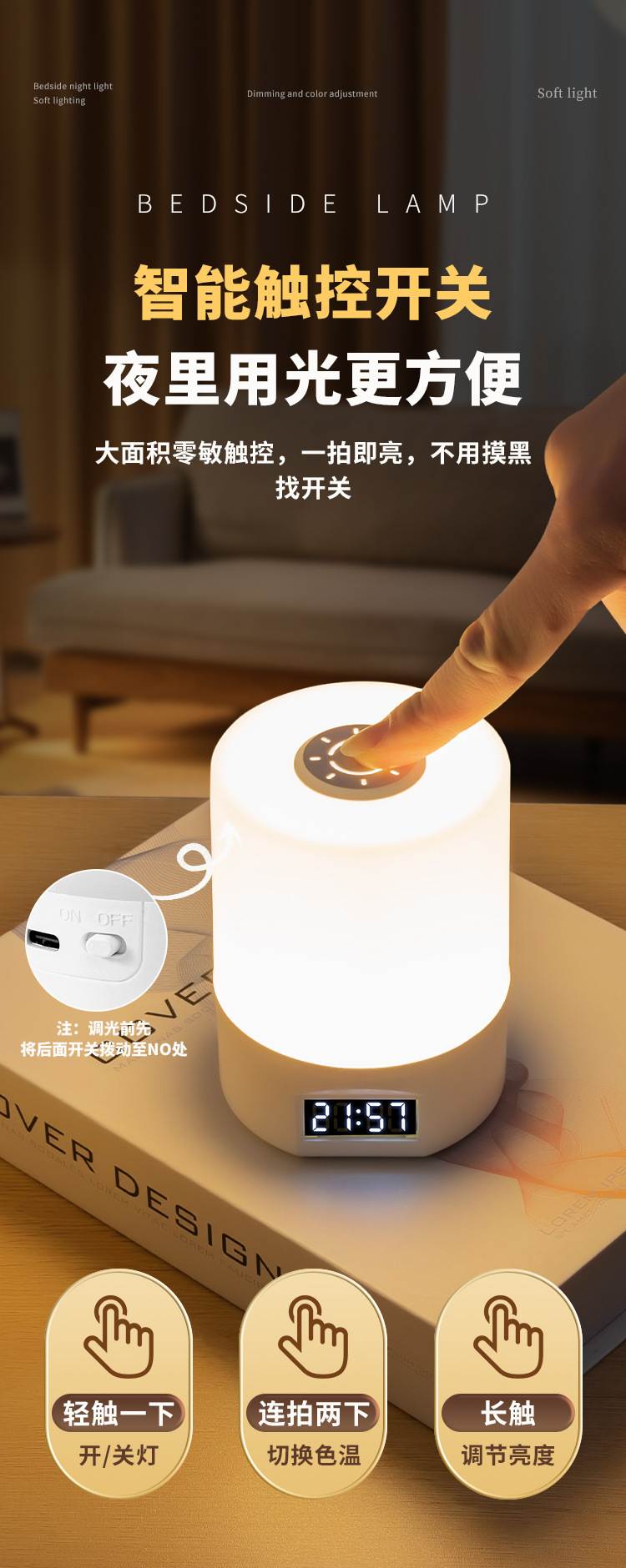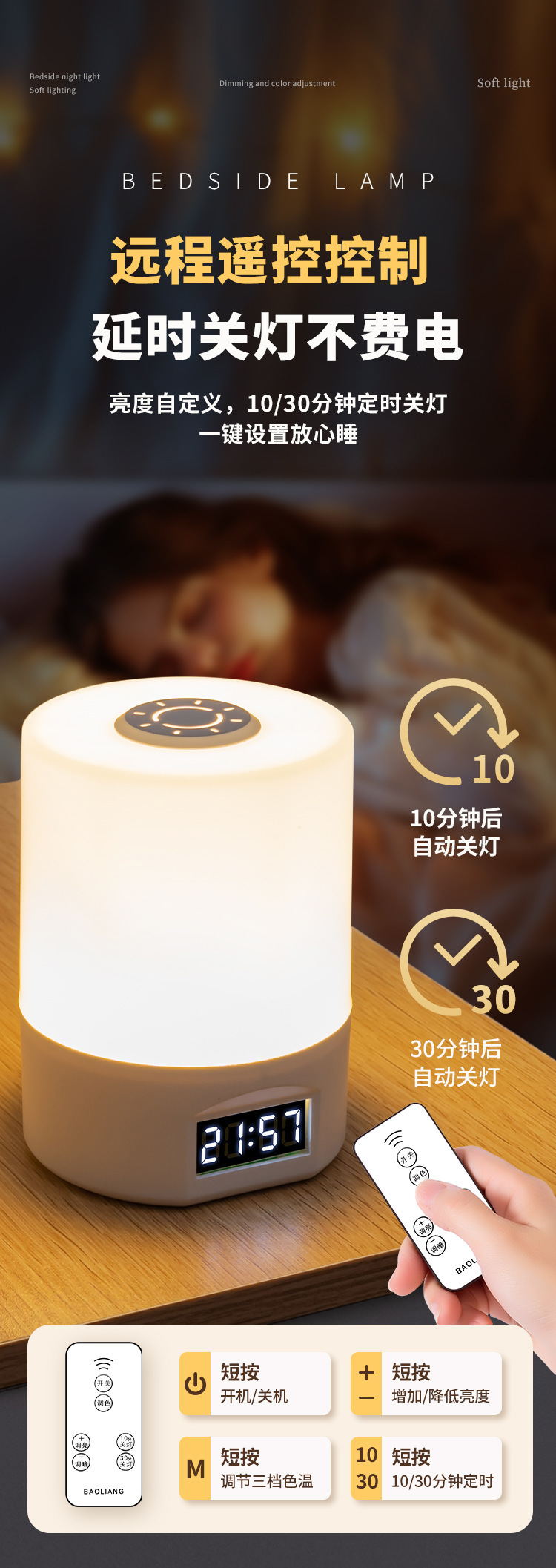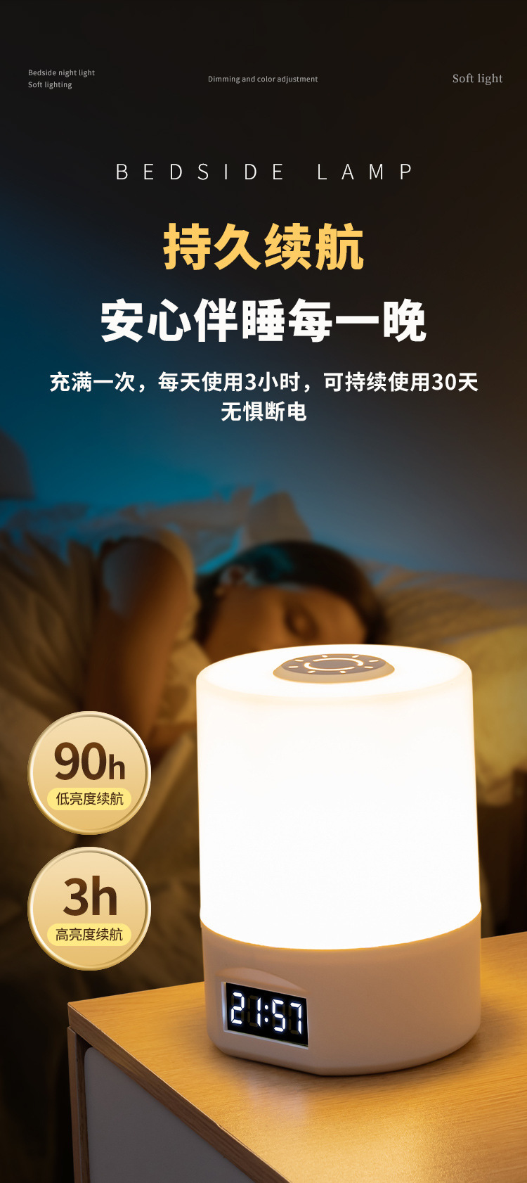 | 燈光顔色 | 充插兩用【遙控+觸摸開關+時間顯示+三色溫+無極調光】 |