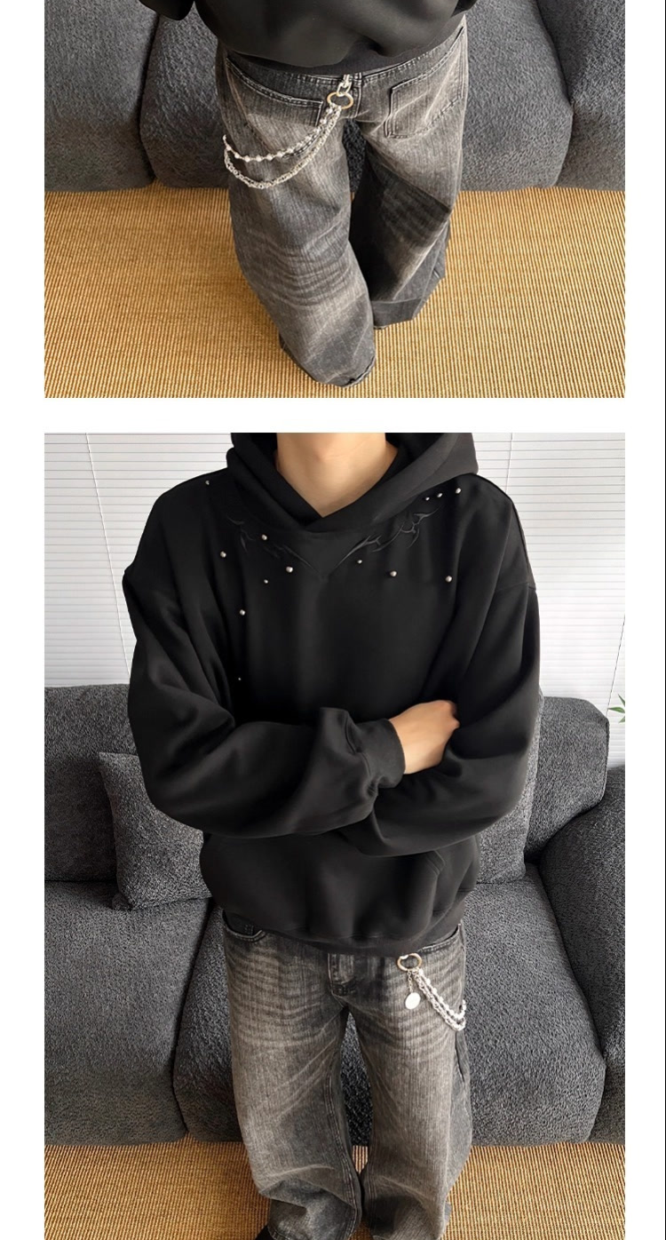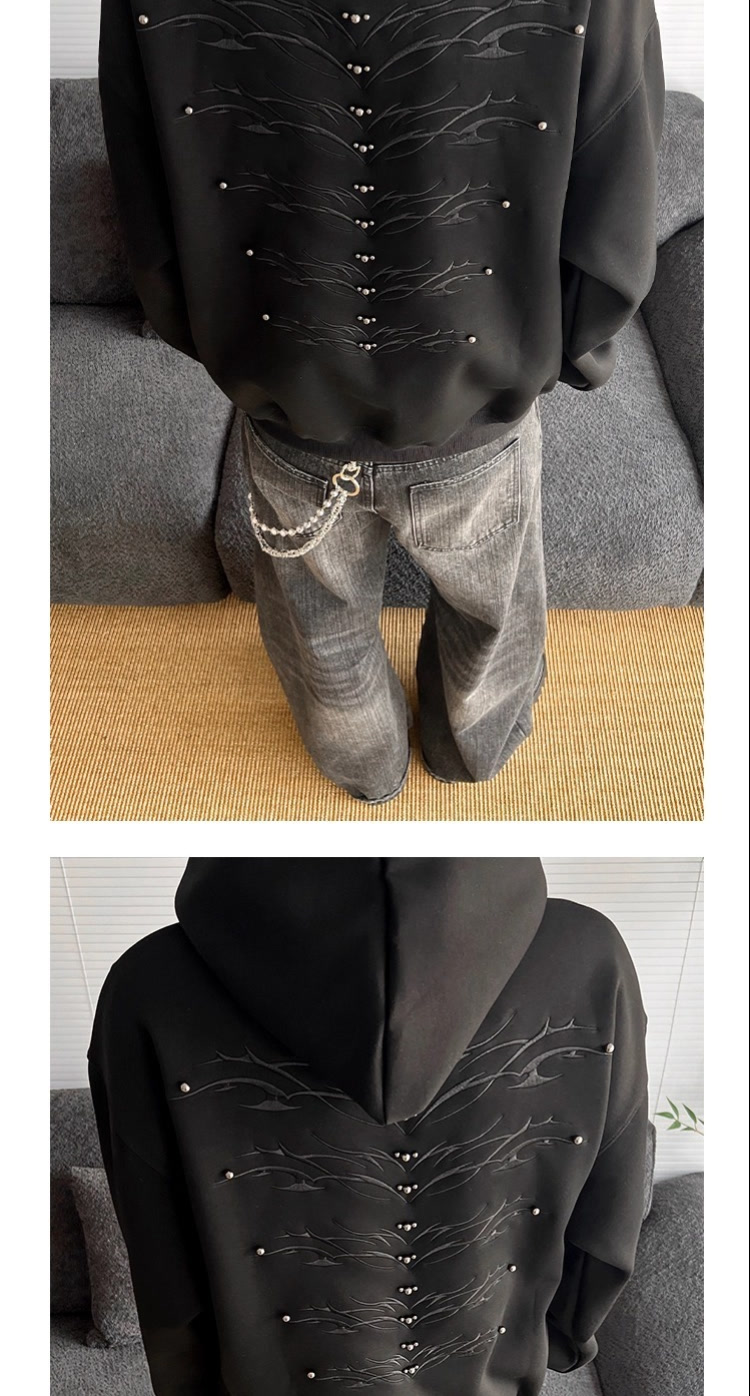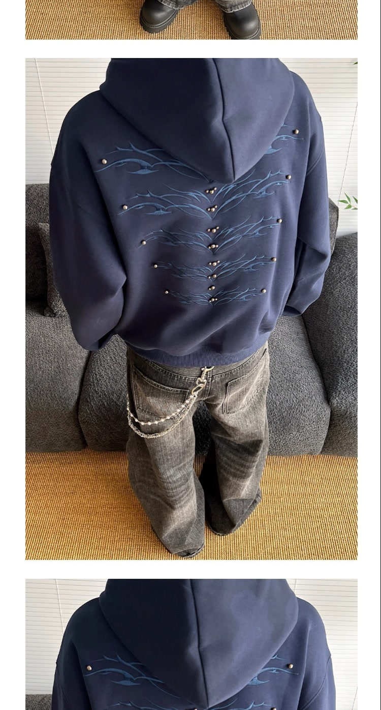 設計感痞帥鉚釘拼接連帽衛衣男女春秋季美式高街小衆情侶開衫外套