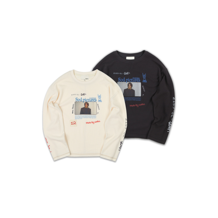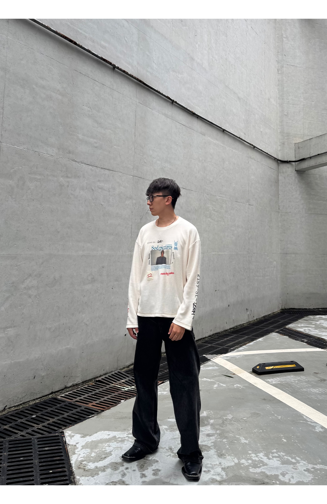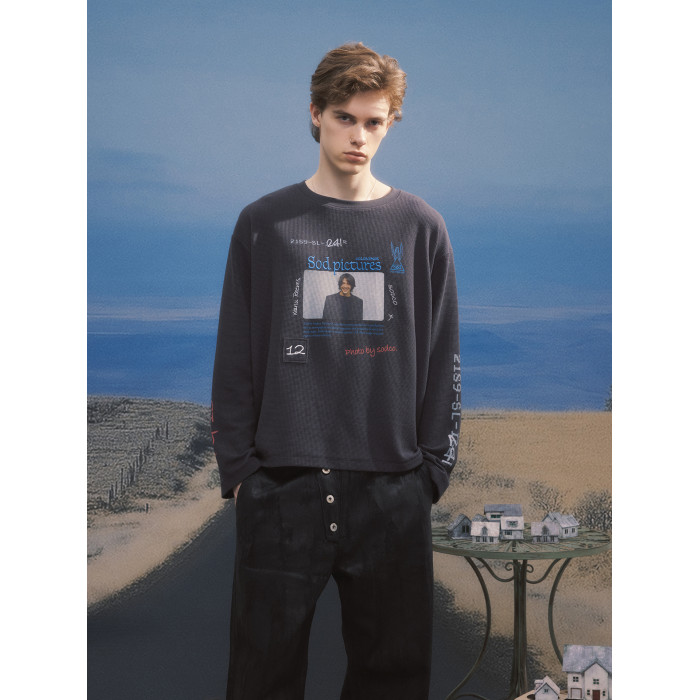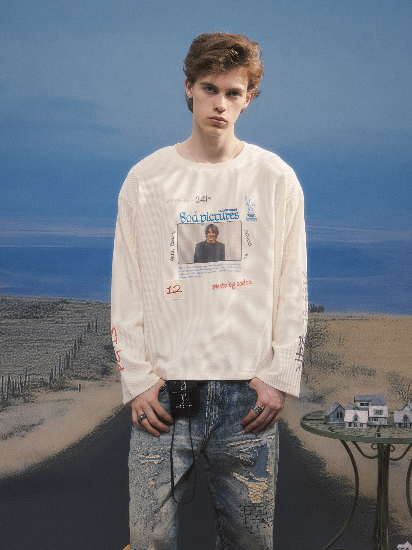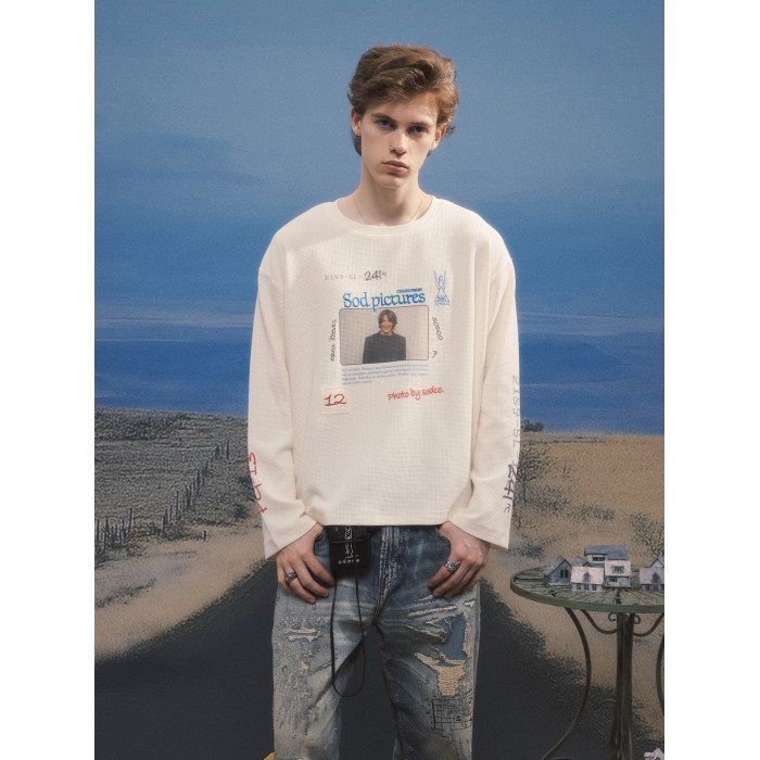 SOD Co. 華夫格長袖 “基努”米白色 廓形人物印花復古衛衣長T恤
