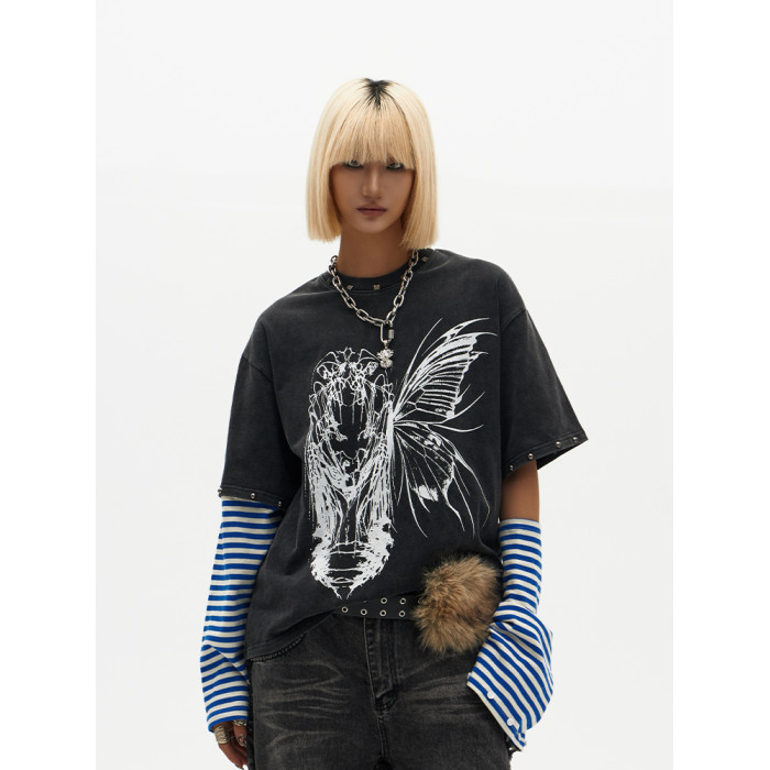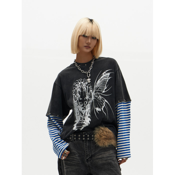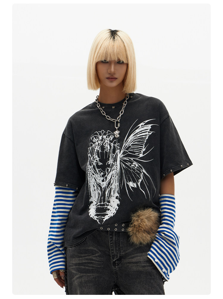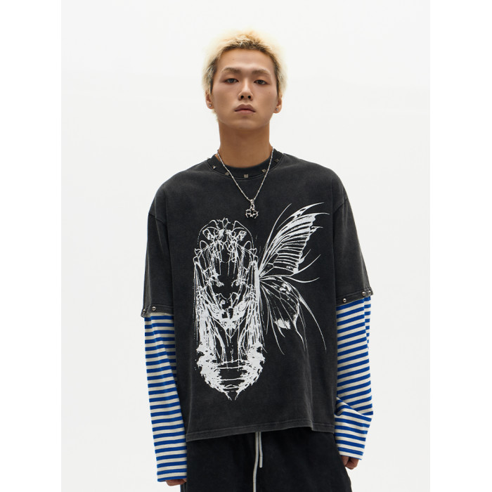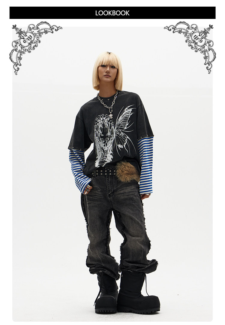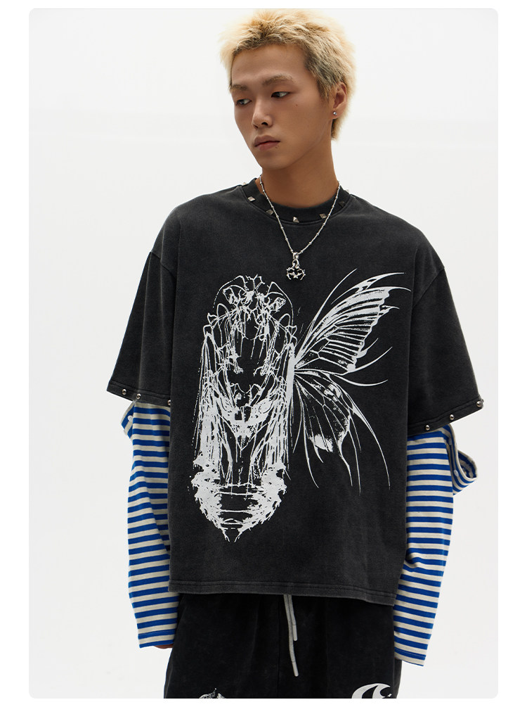 ChaneyWondo閾限之蝶-可拆卸假兩件衛衣寬松圓領潮牌高街印花上衣