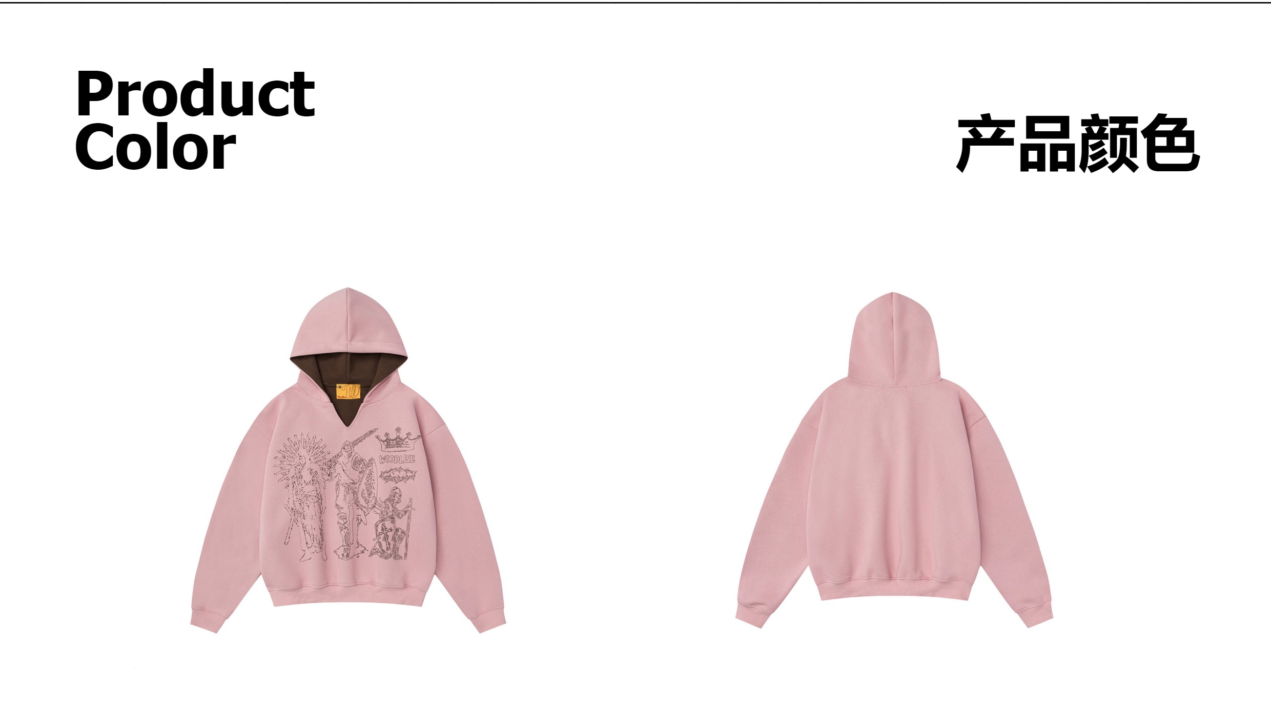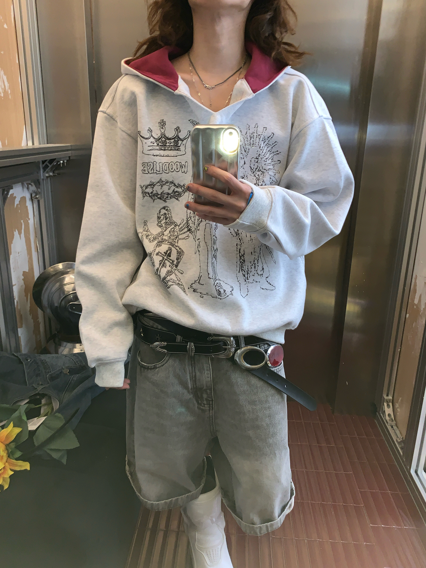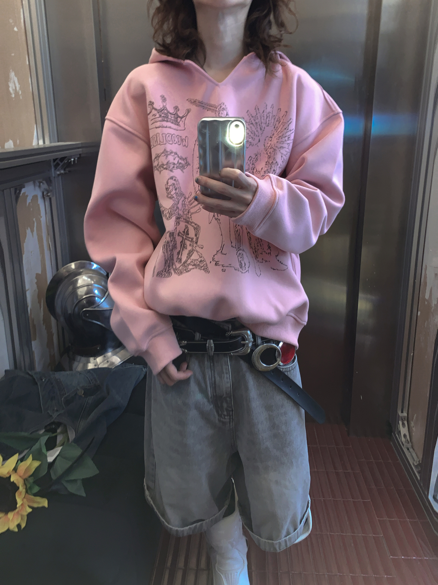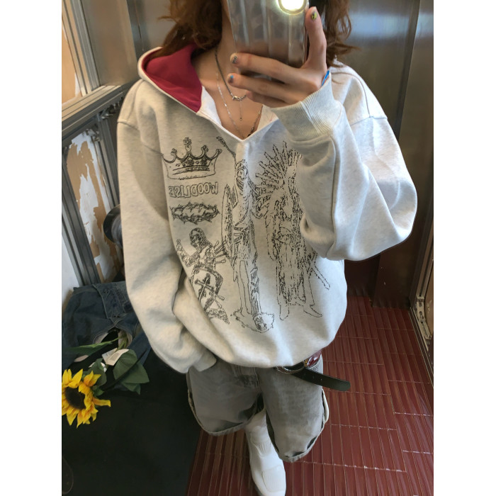 阿荒與阿鹵*美式盾牌騎士筆繪印花復古寬連帽V領設計感衛衣外套