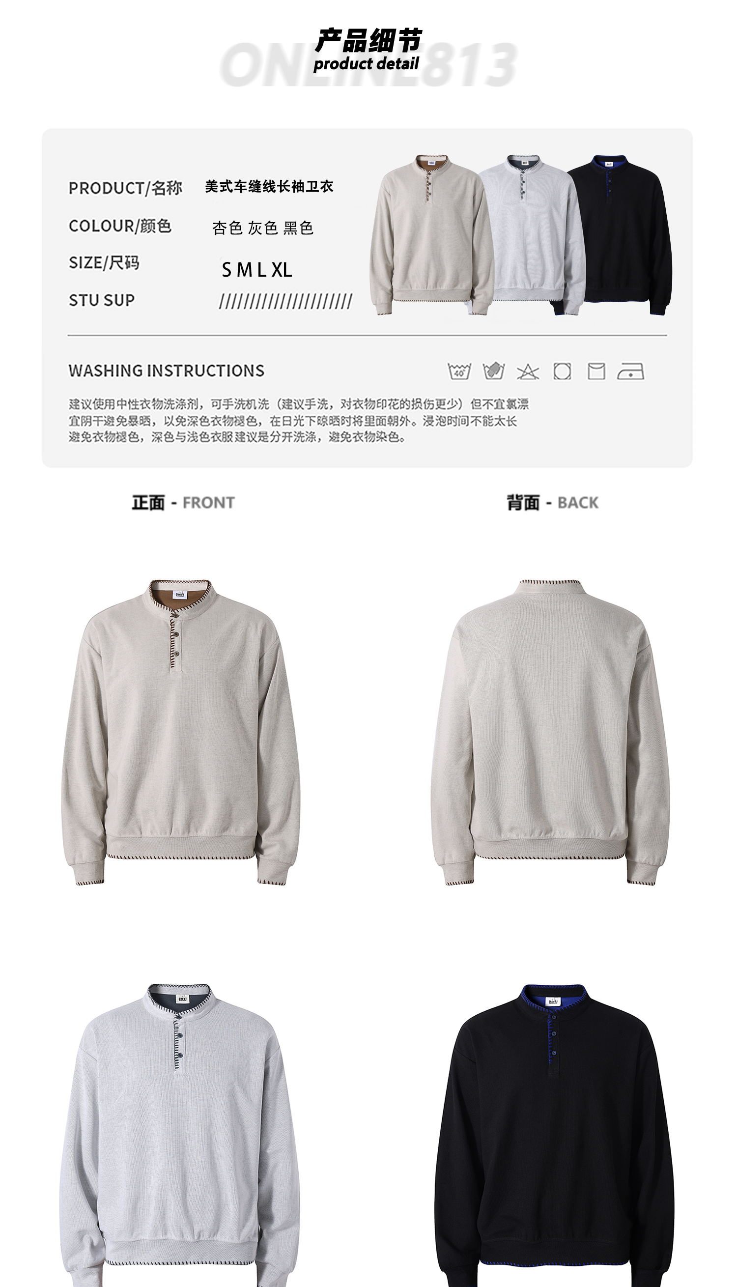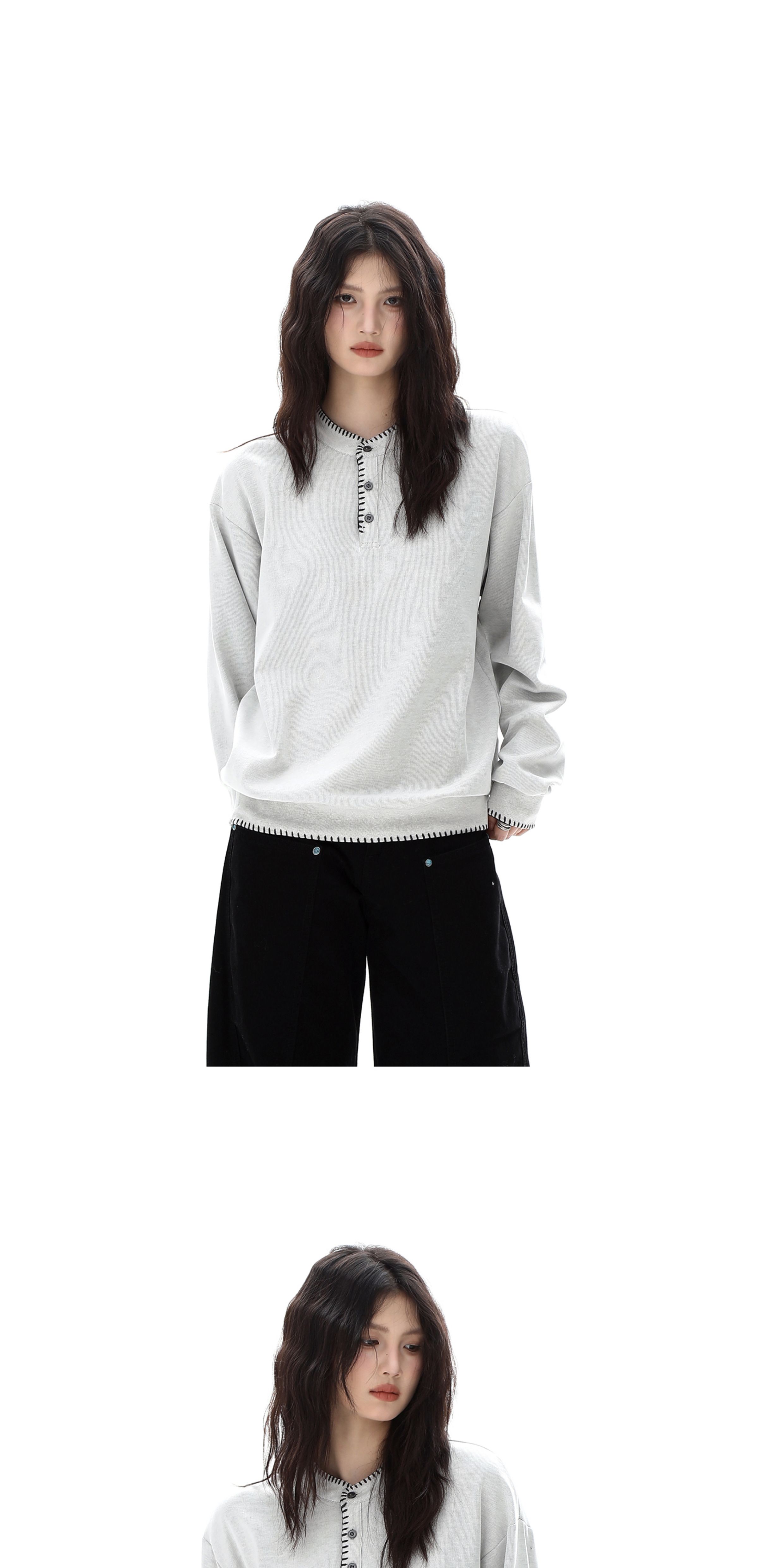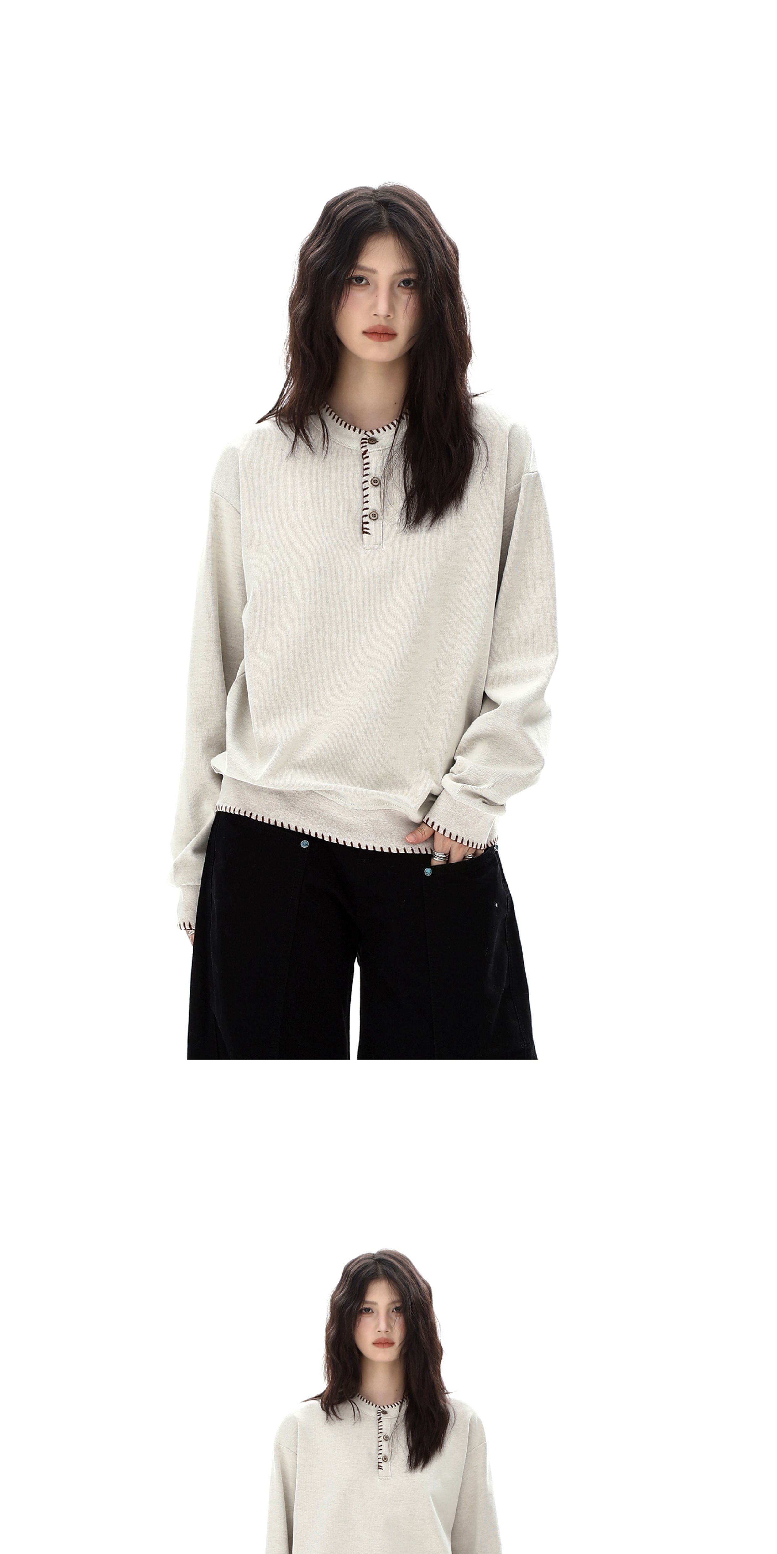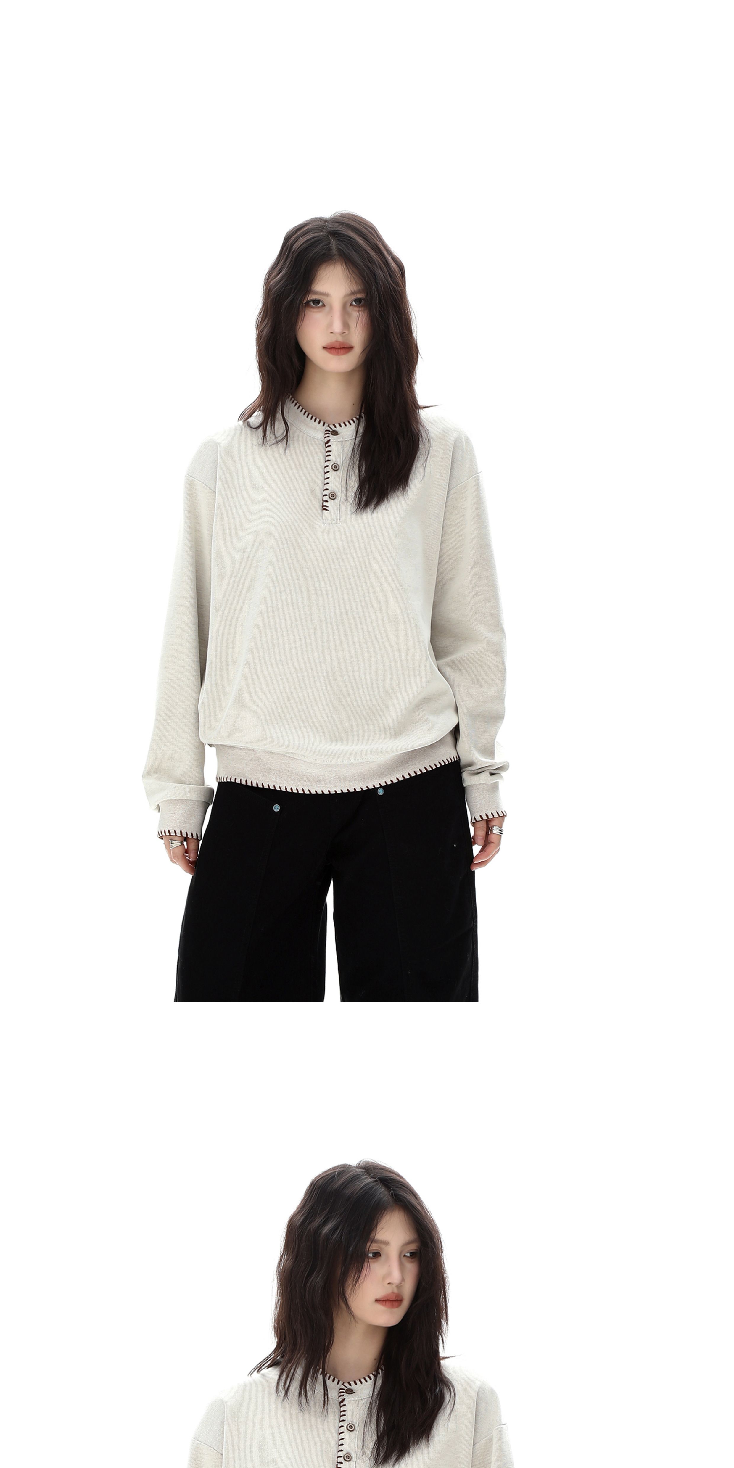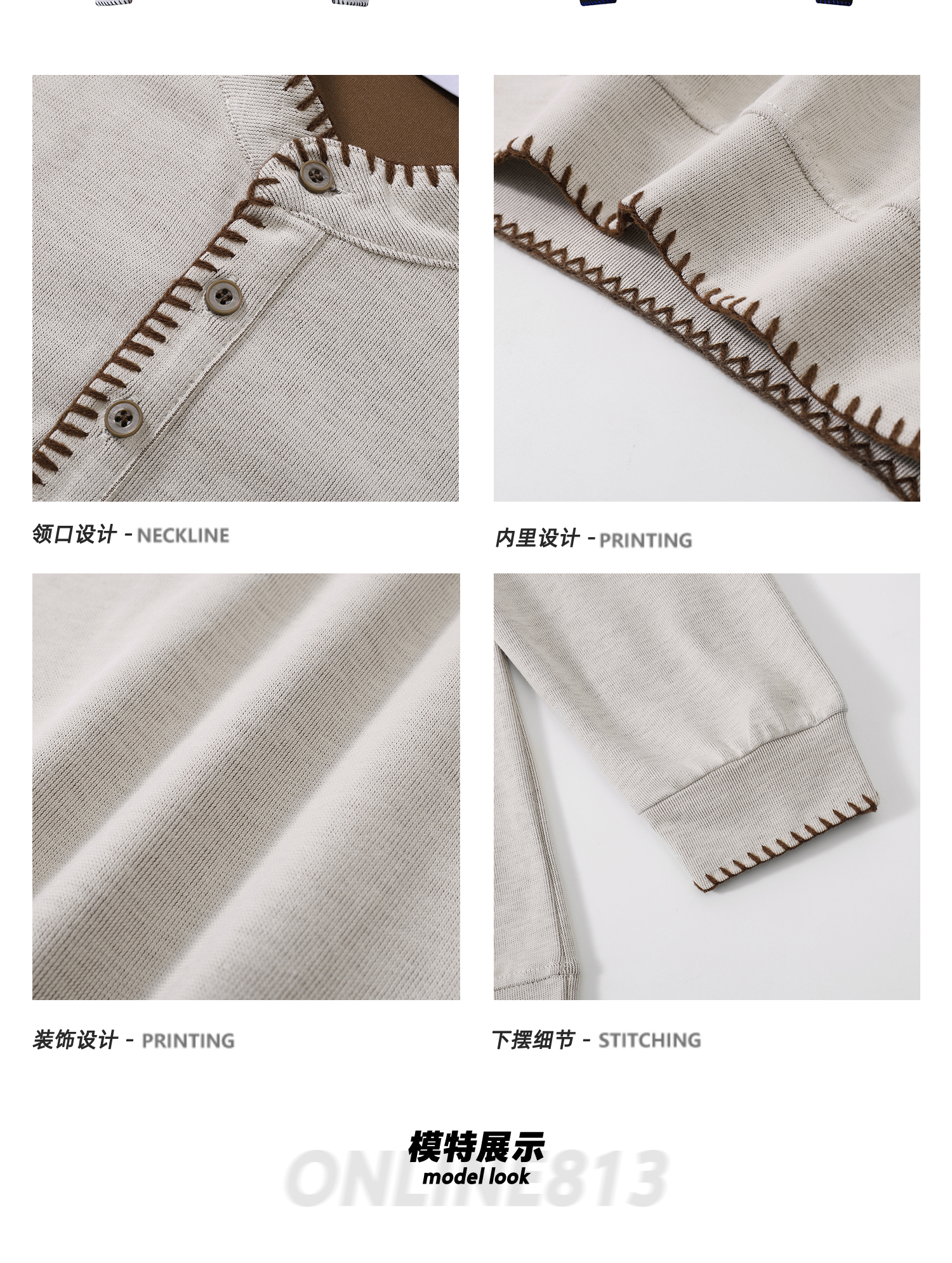AFOEOT秋季美式手縫線亨利領針織衛衣男女老錢風休閒寬松長袖上衣