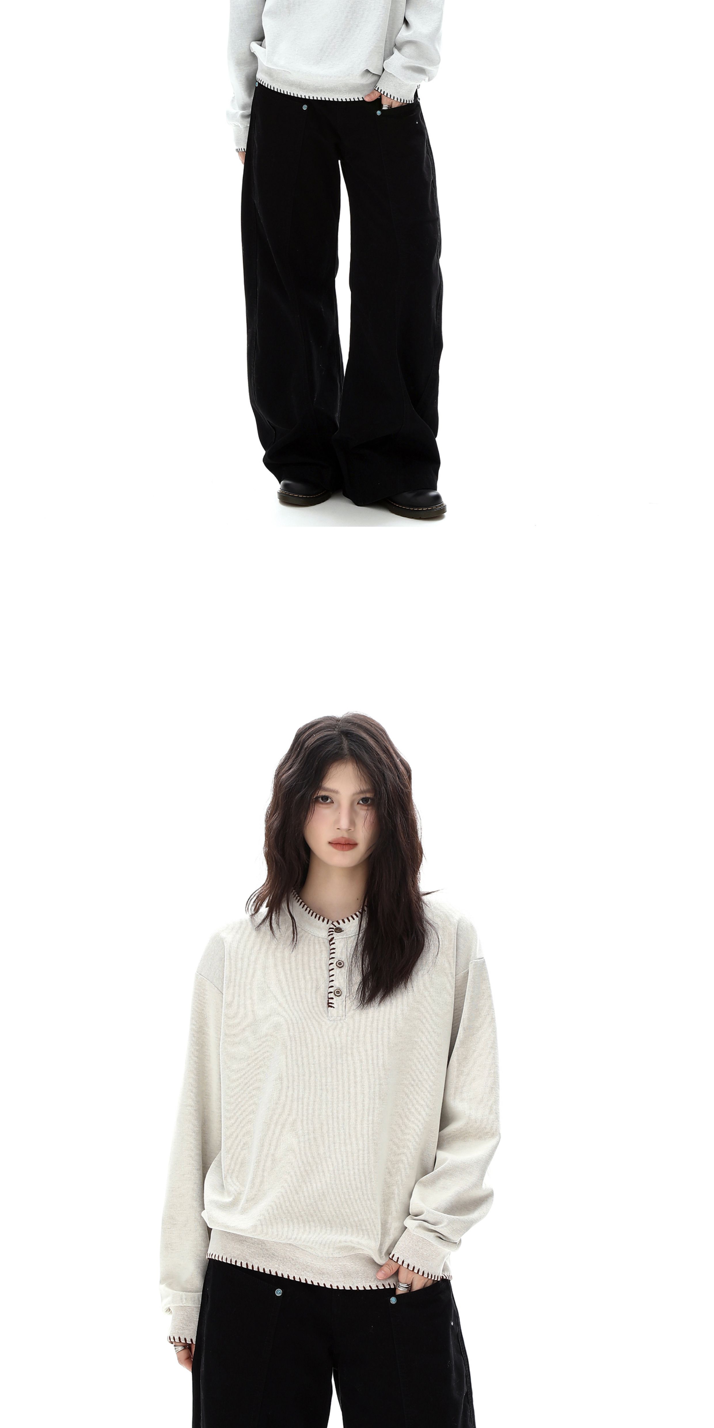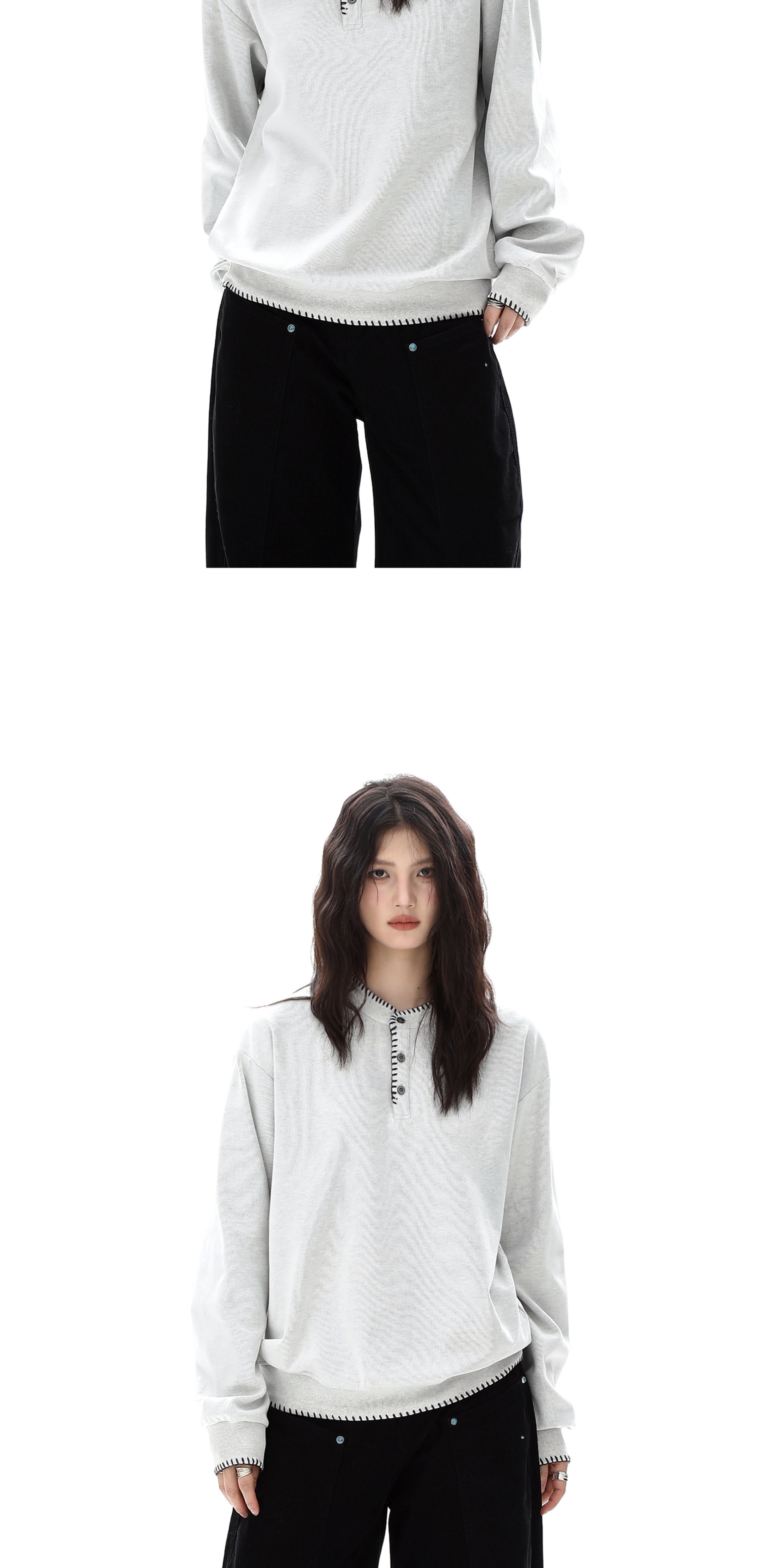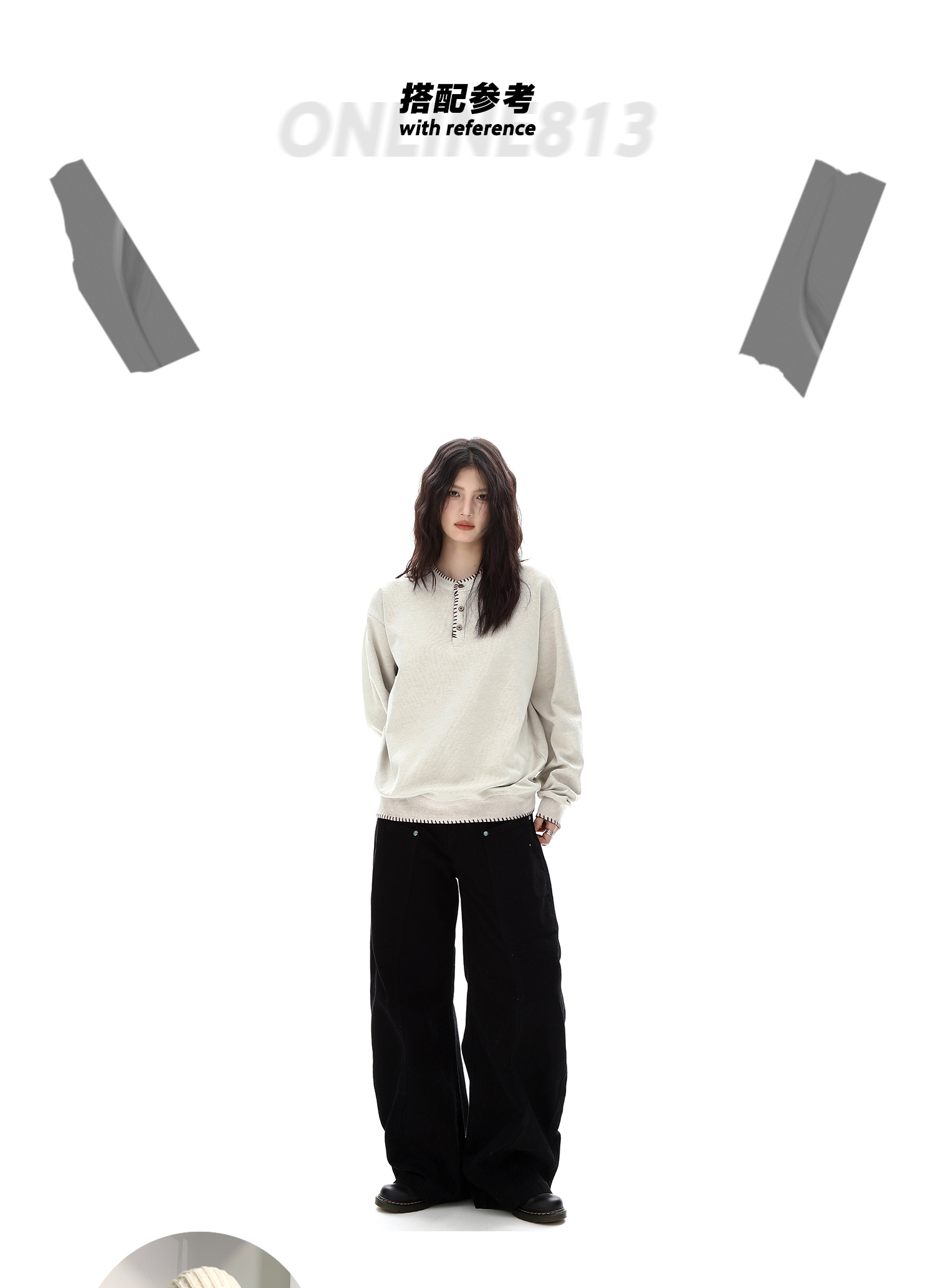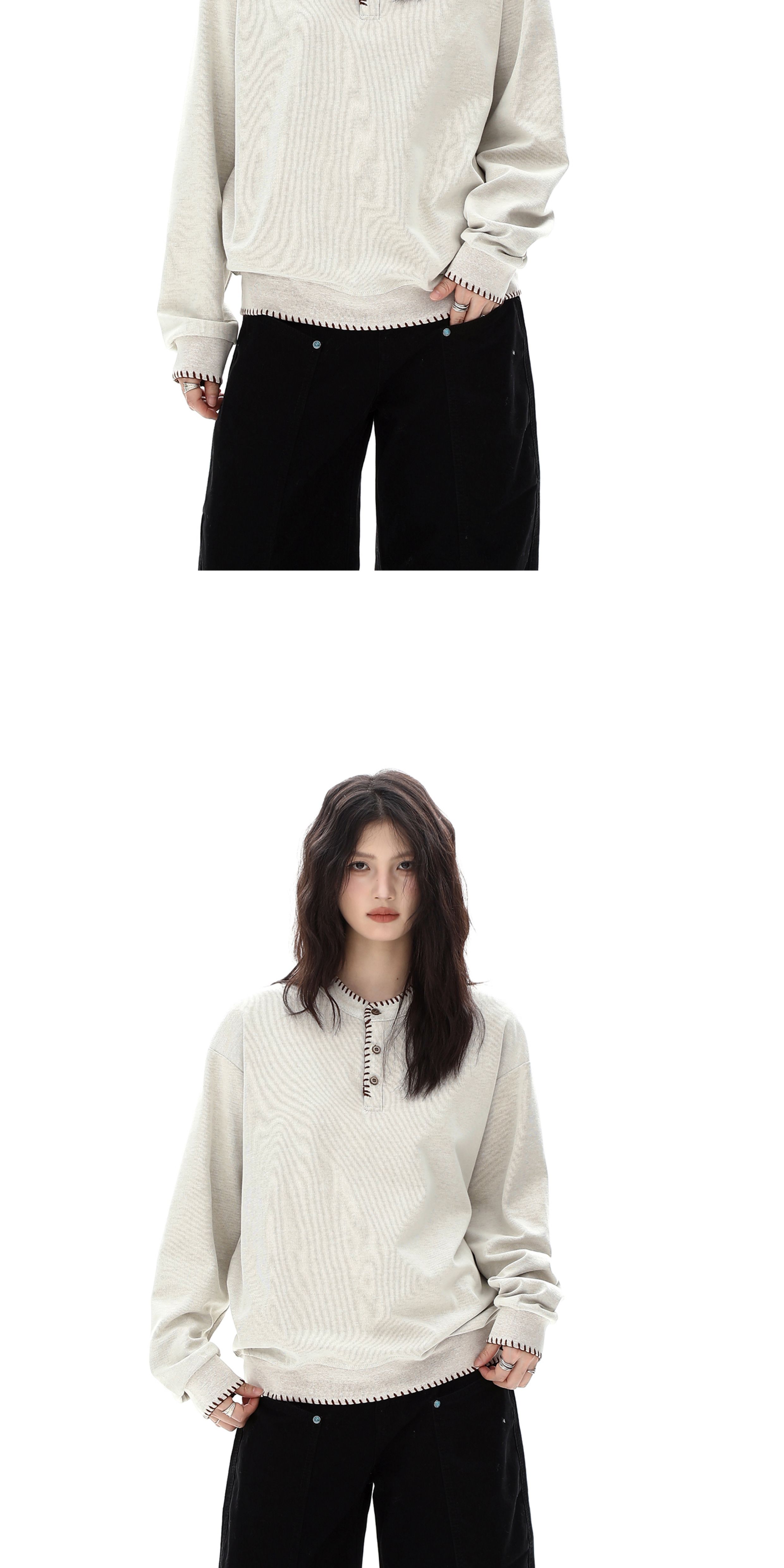 AFOEOT秋季美式手縫線亨利領針織衛衣男女老錢風休閒寬松長袖上衣