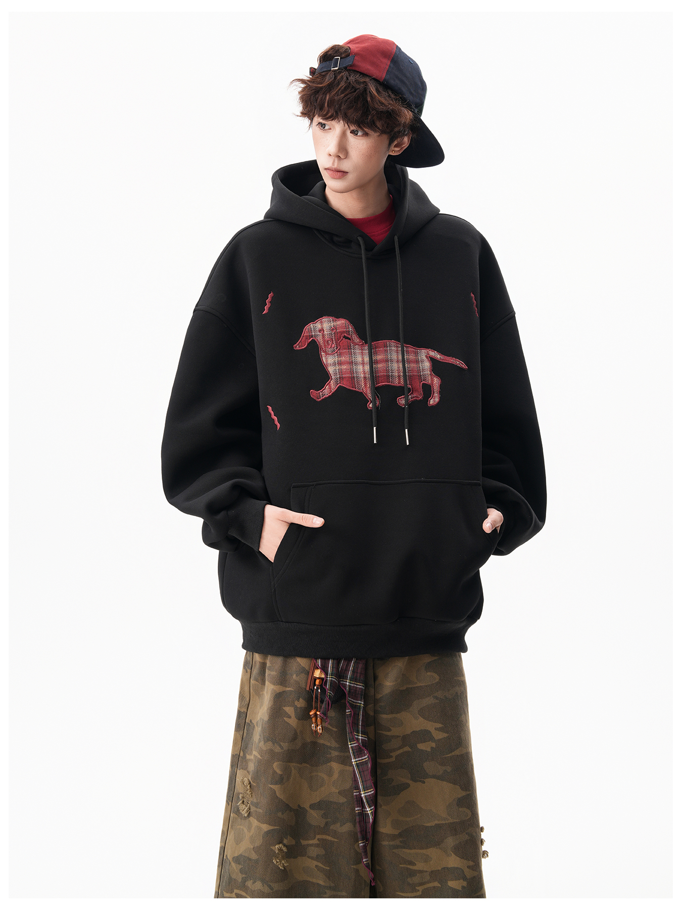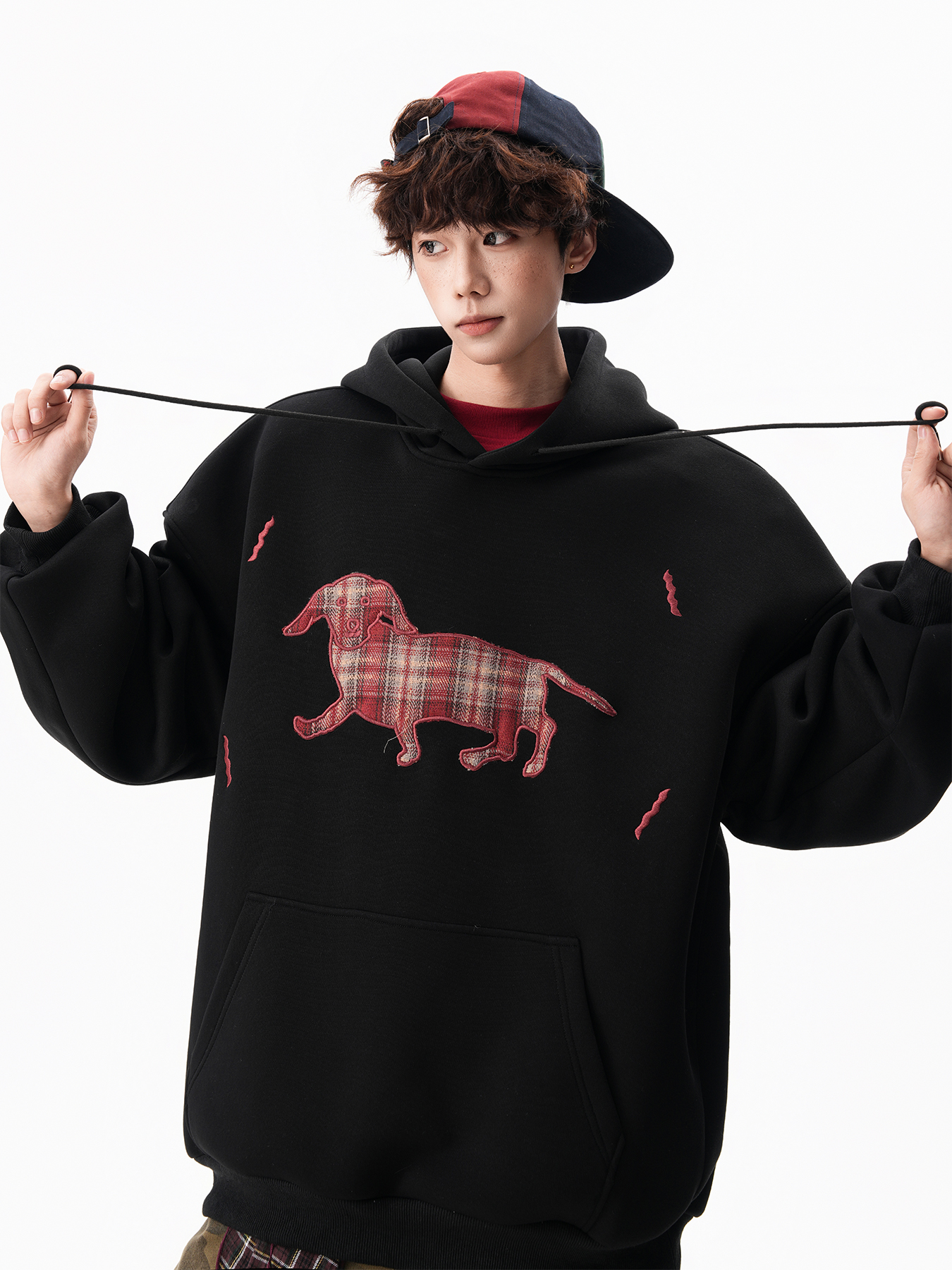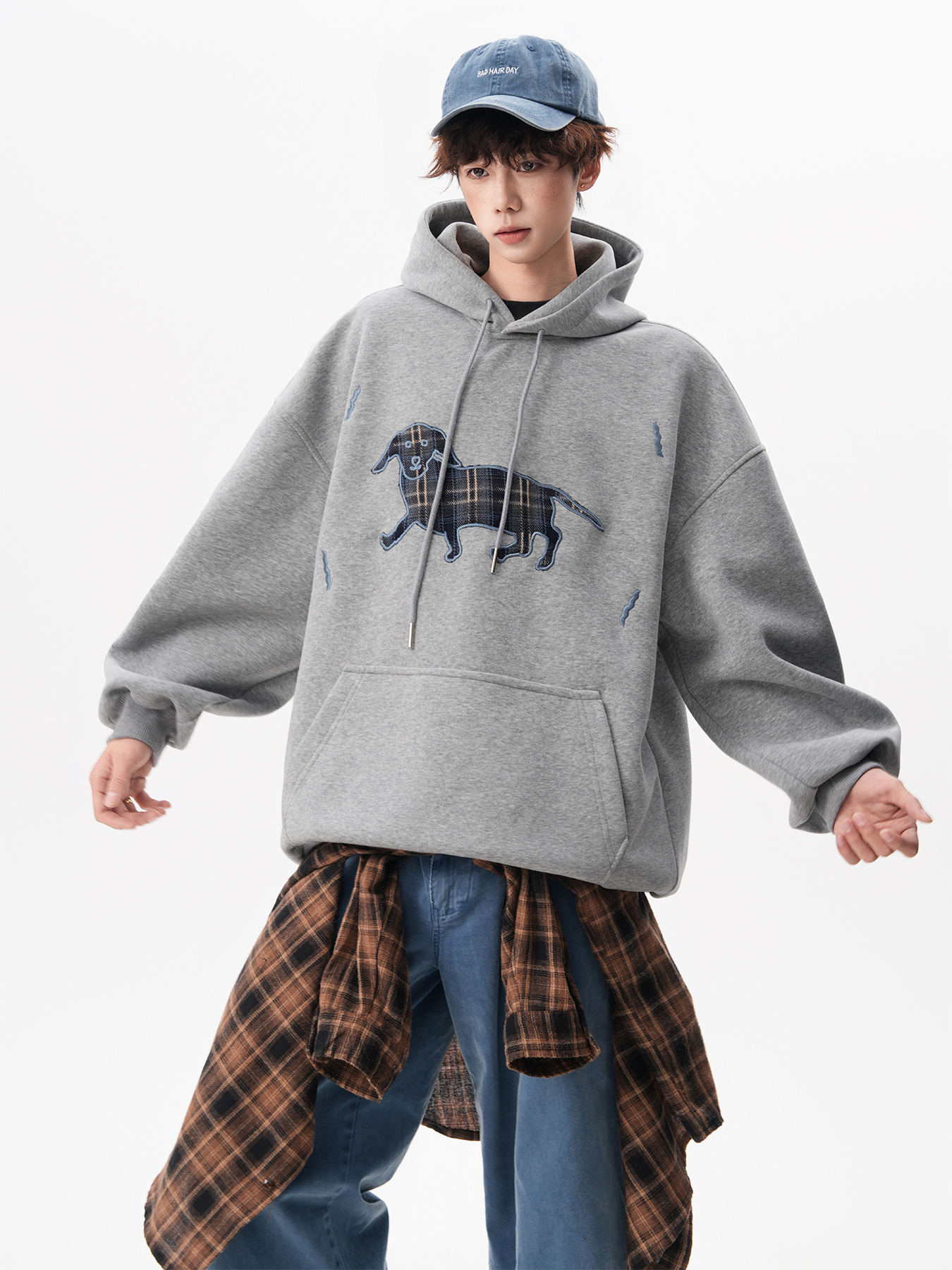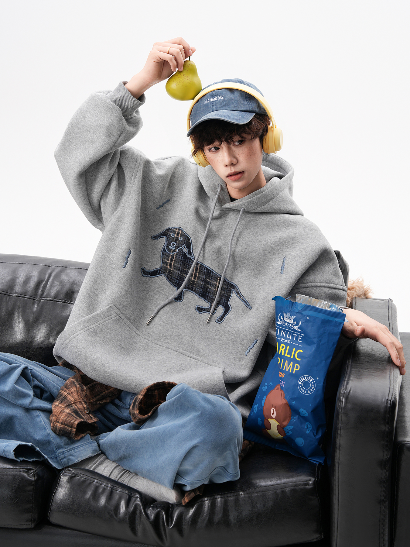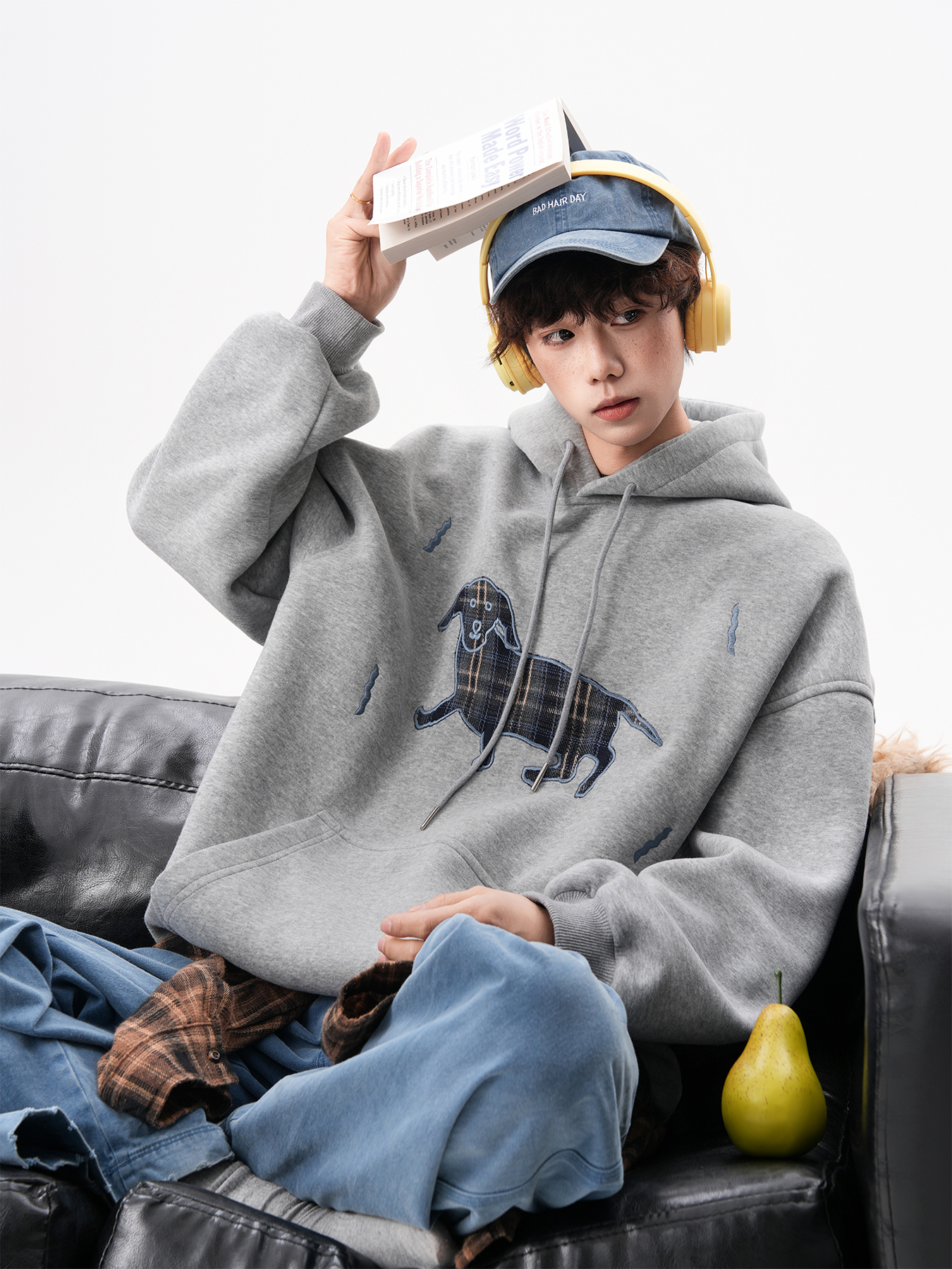 美式小狗貼布刺綉連帽衛衣男秋季新款寬松休閒上衣設計感情侶外套