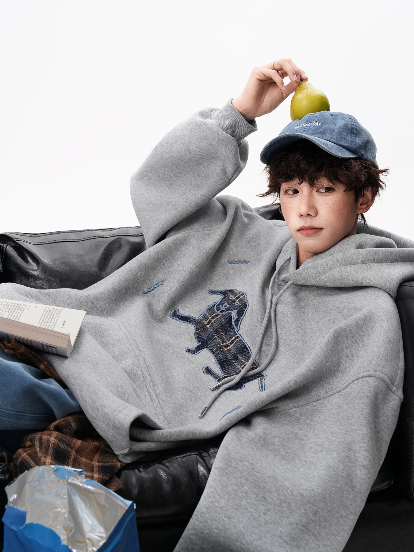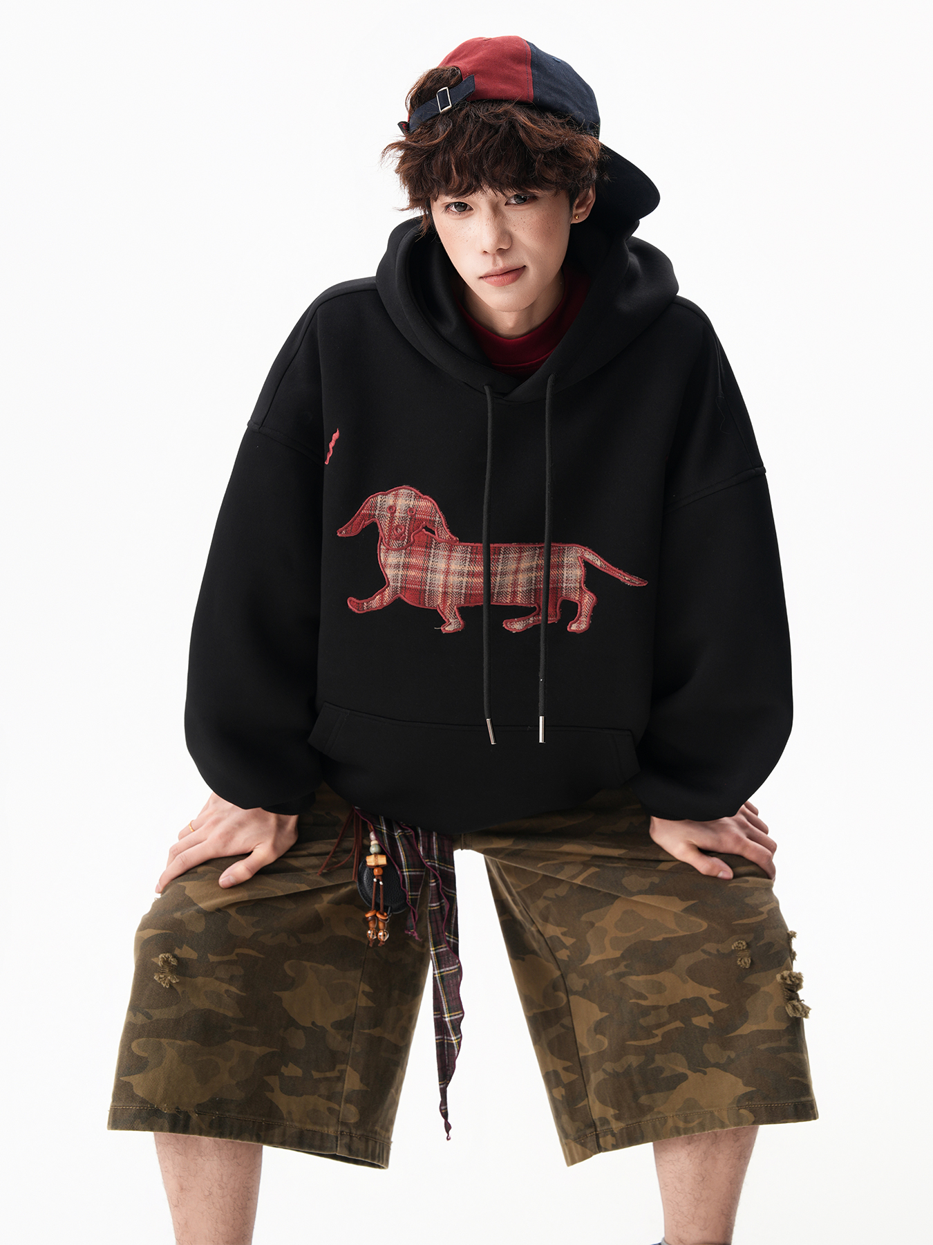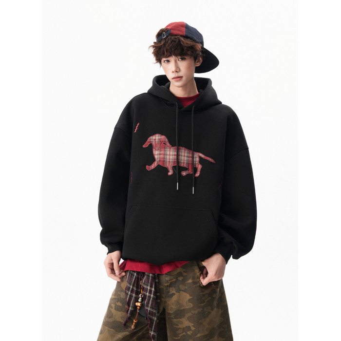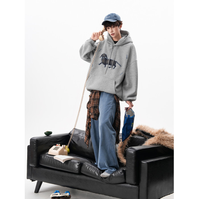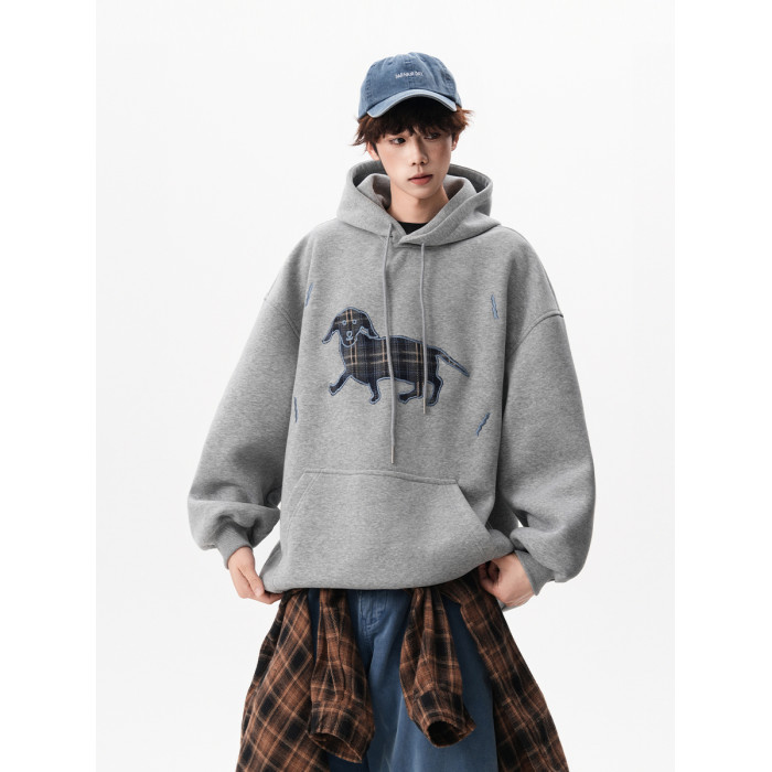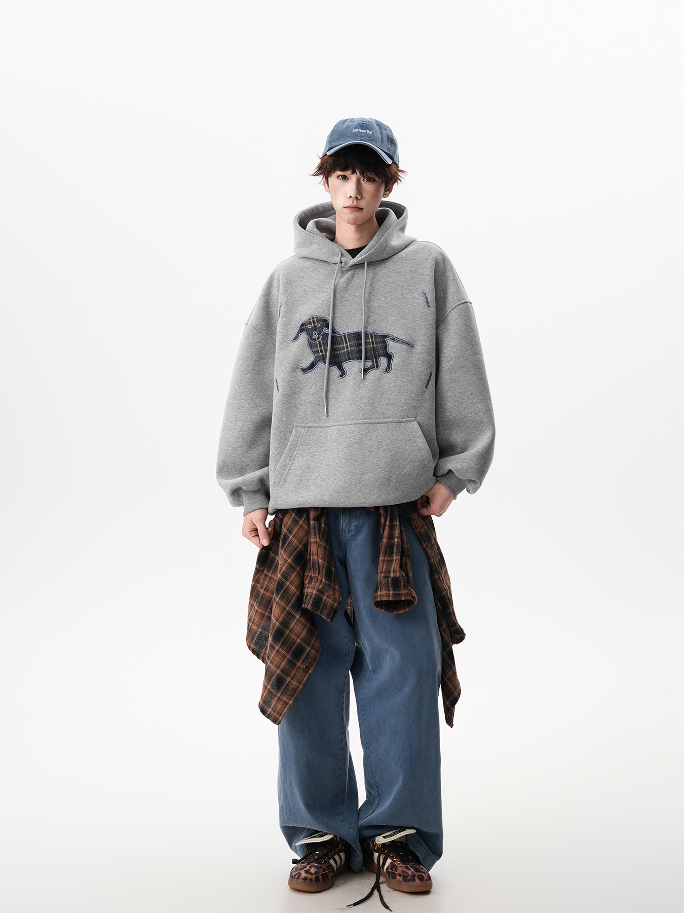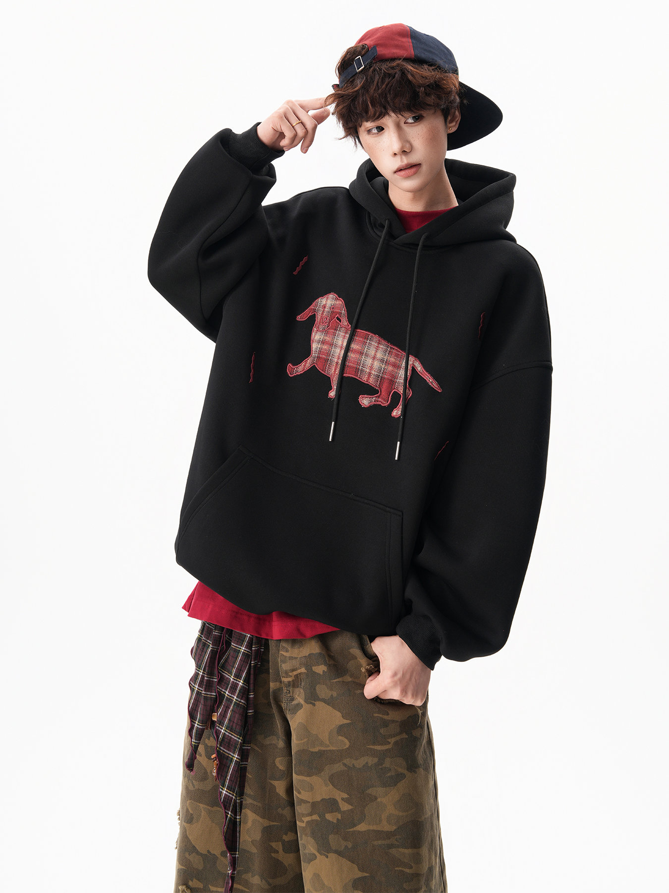 美式小狗貼布刺綉連帽衛衣男秋季新款寬松休閒上衣設計感情侶外套