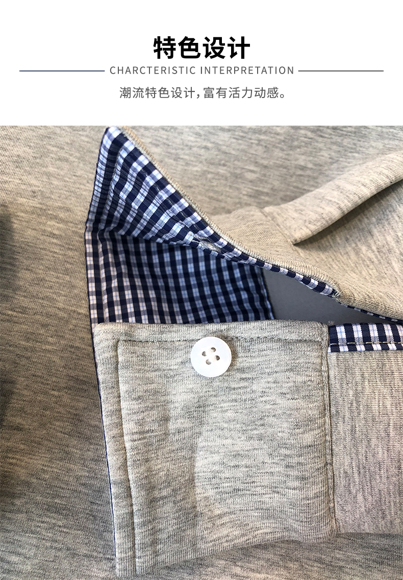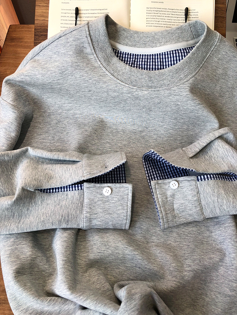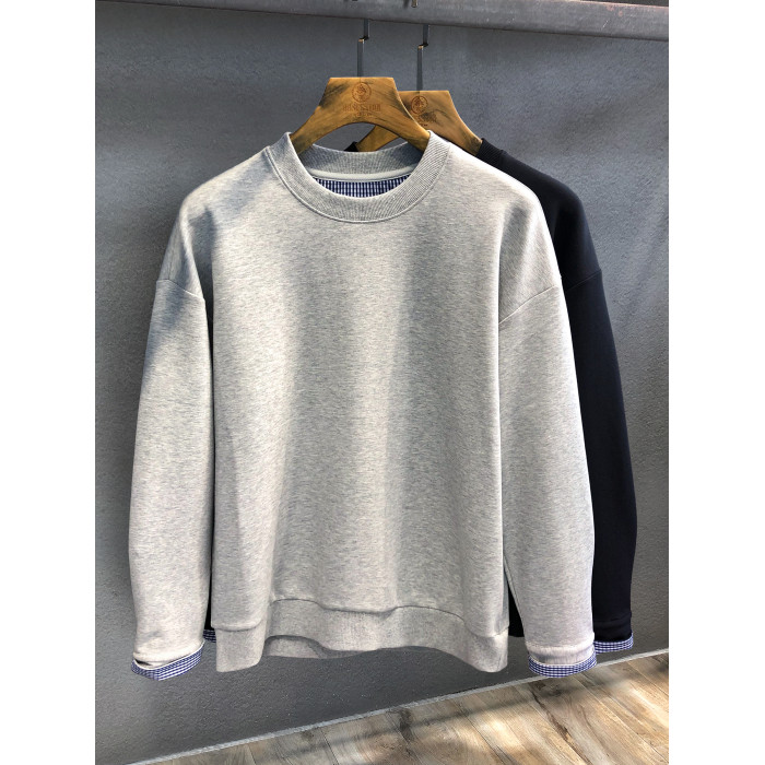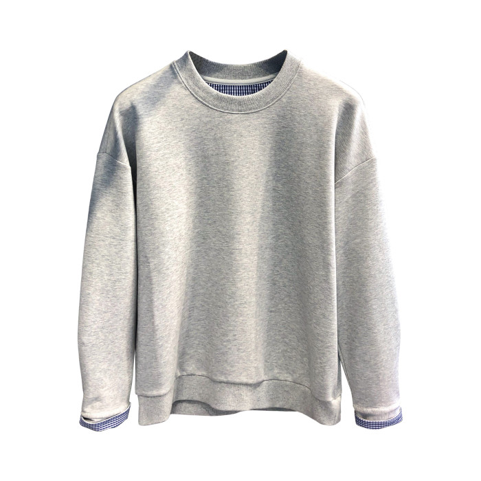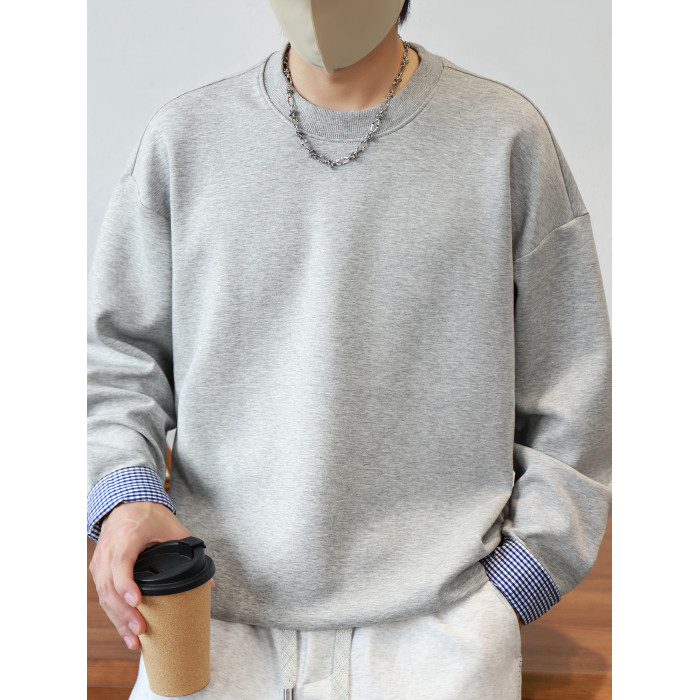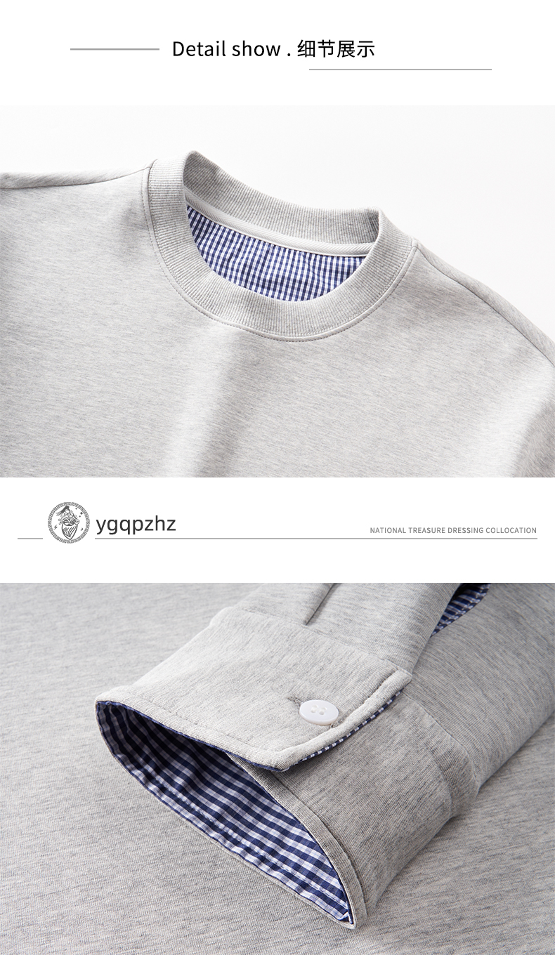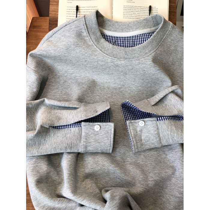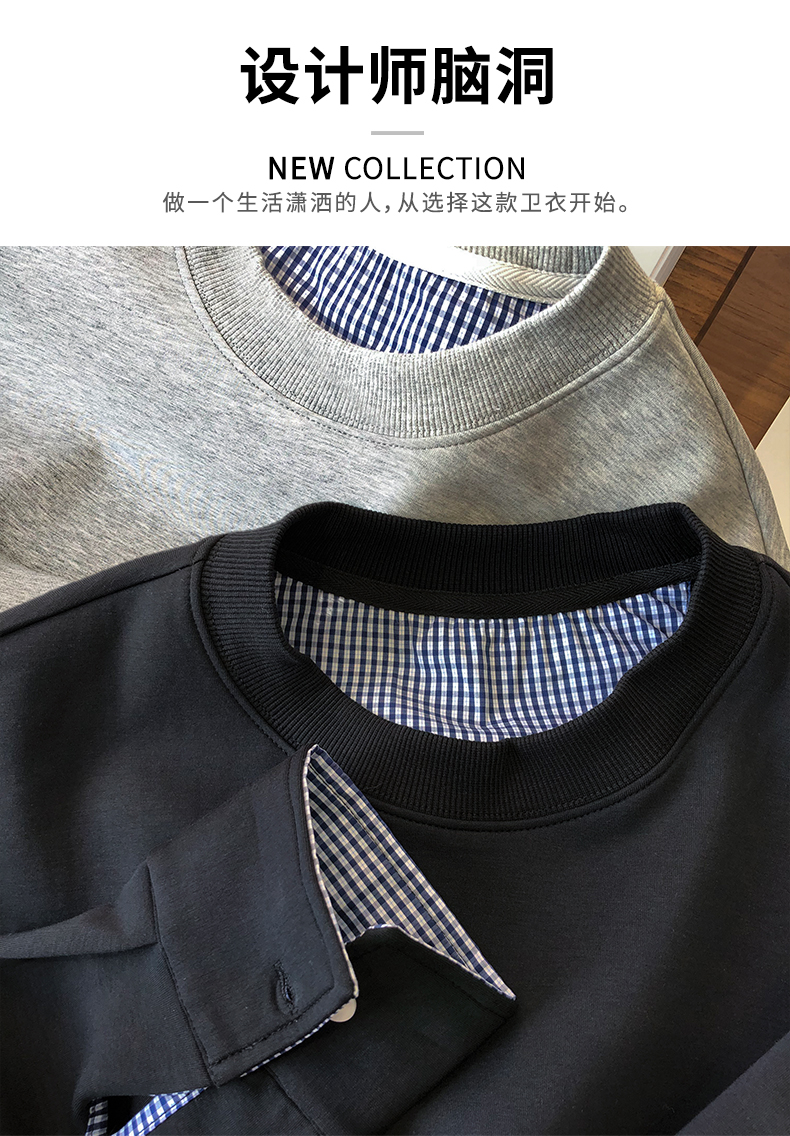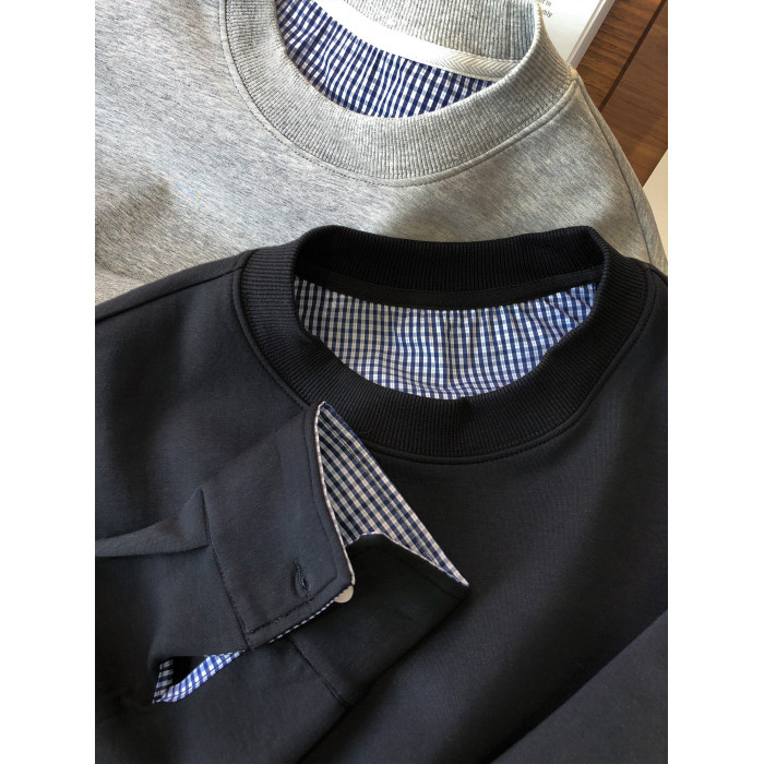 米蘭專櫃高級感襯衫式格紋拼接圓領衛衣男士秋季新款休閒長袖上衣