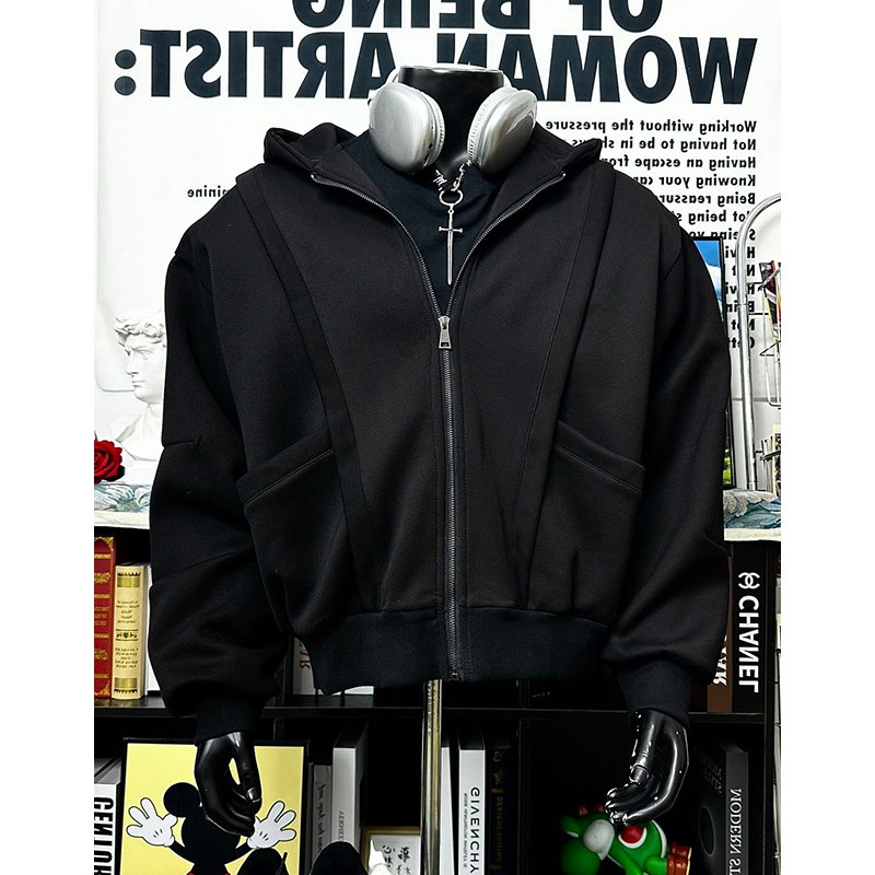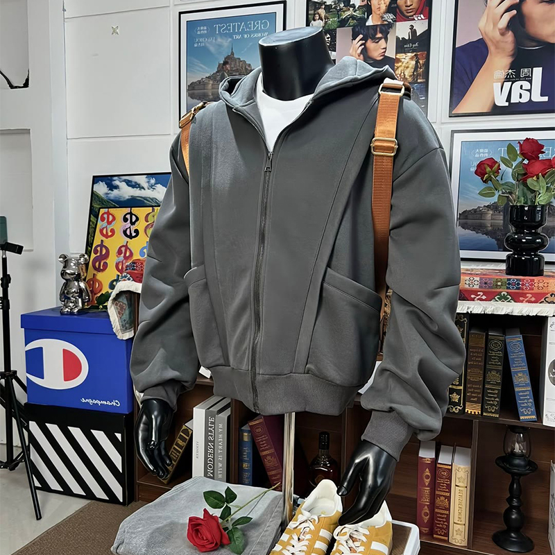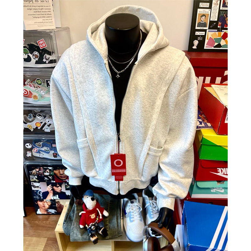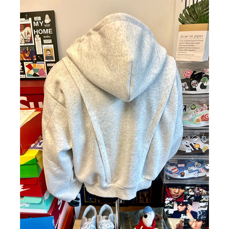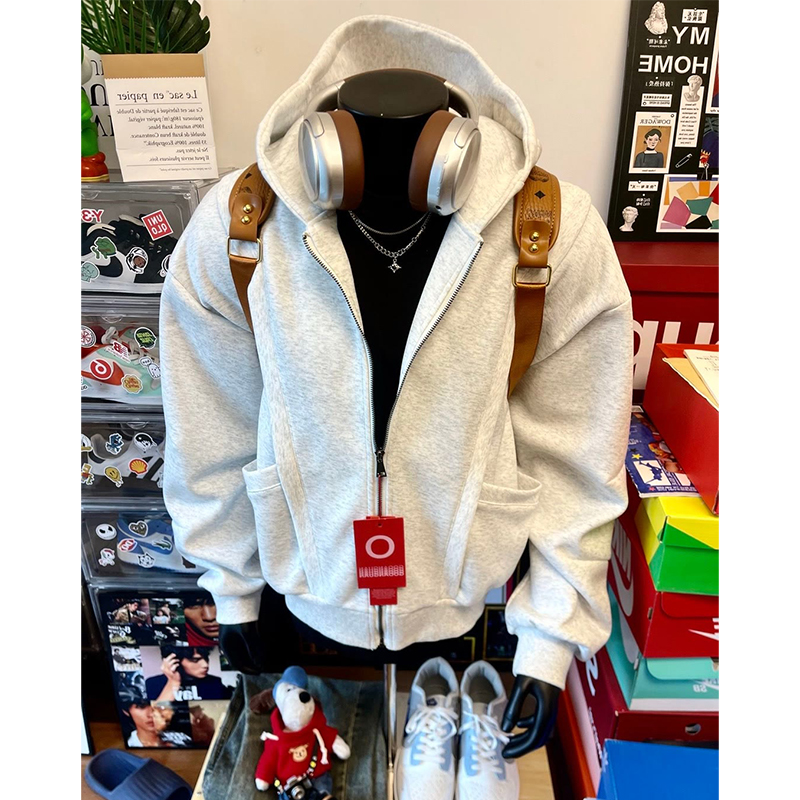 白灰色美式boxy開衫衛衣男款秋季短寬cleanfit重磅高克重連帽外套