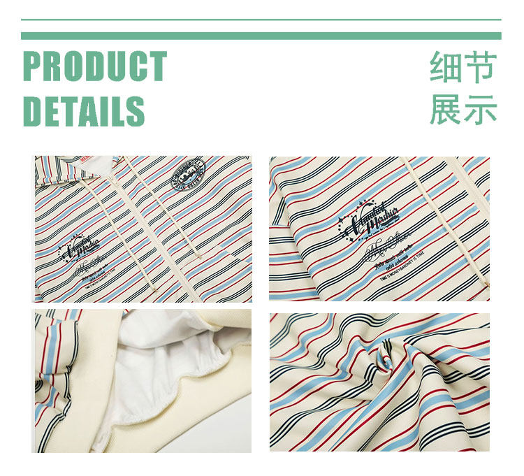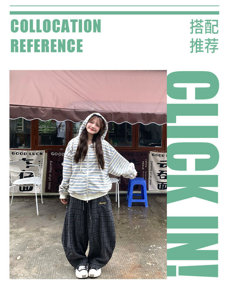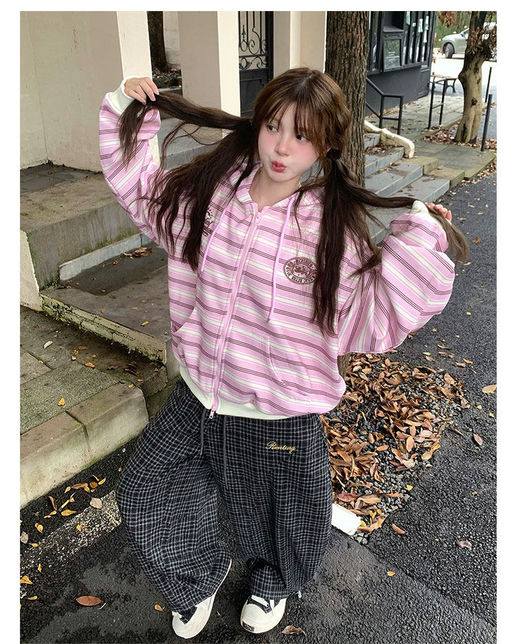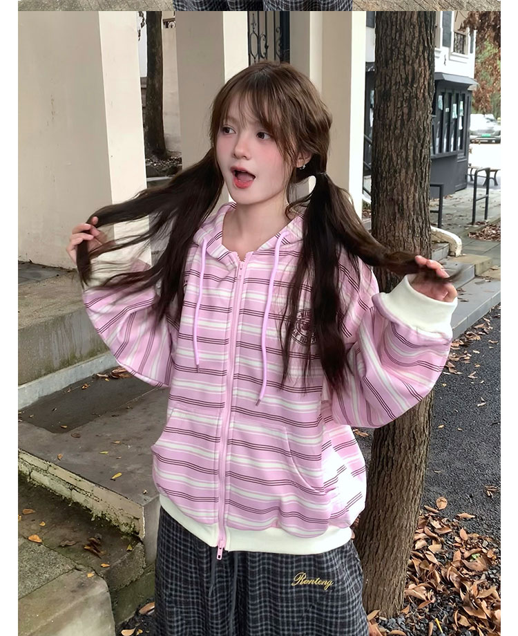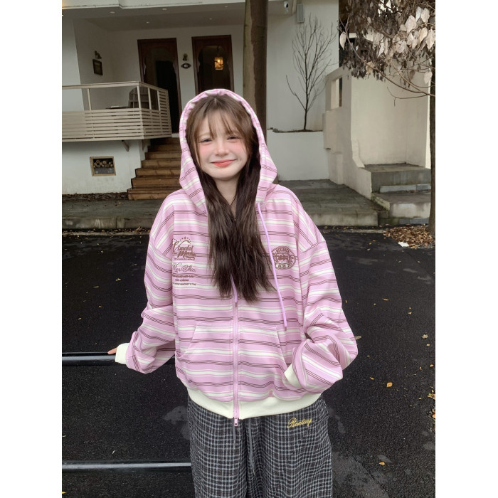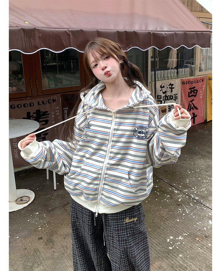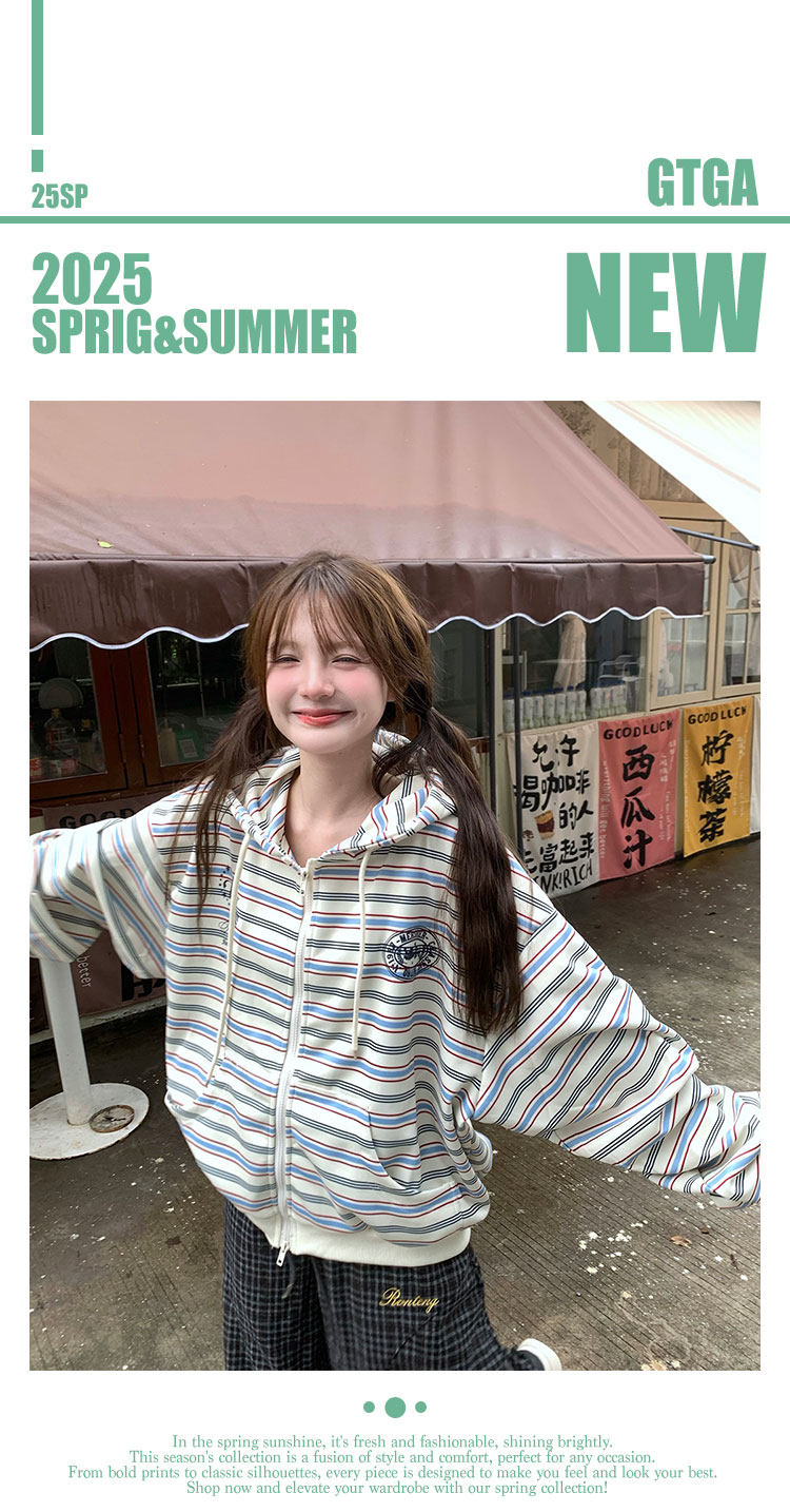 GTGA撞色條紋連帽開衫衛衣女秋冬新款拉鍊外套慵懶風寬松休閒上衣