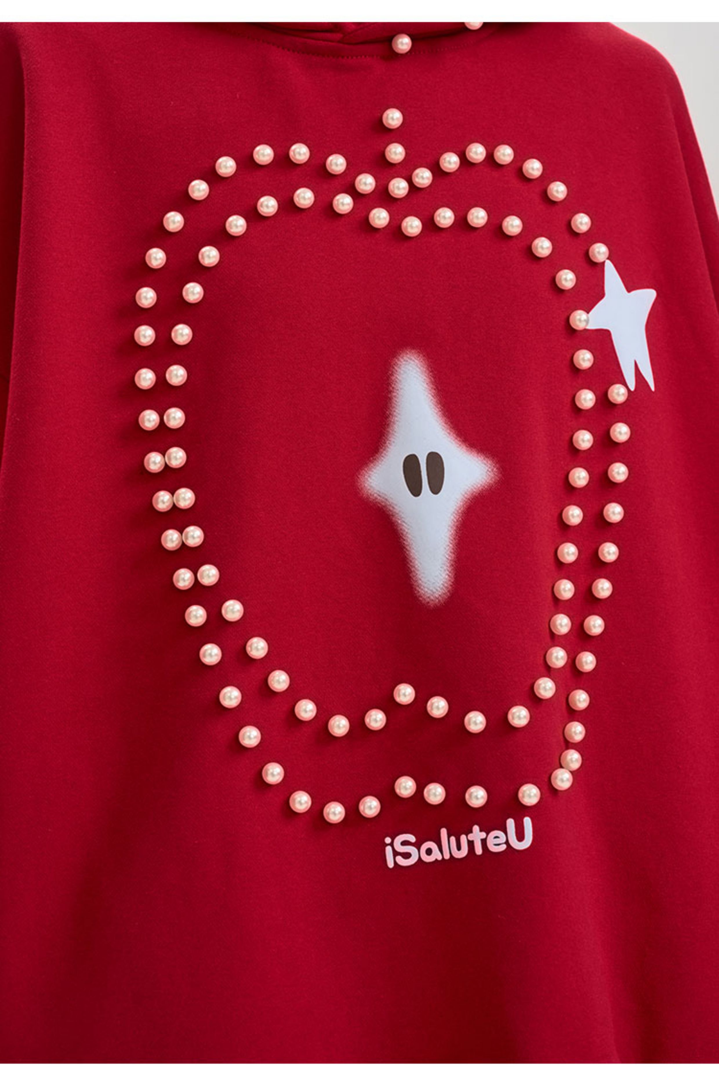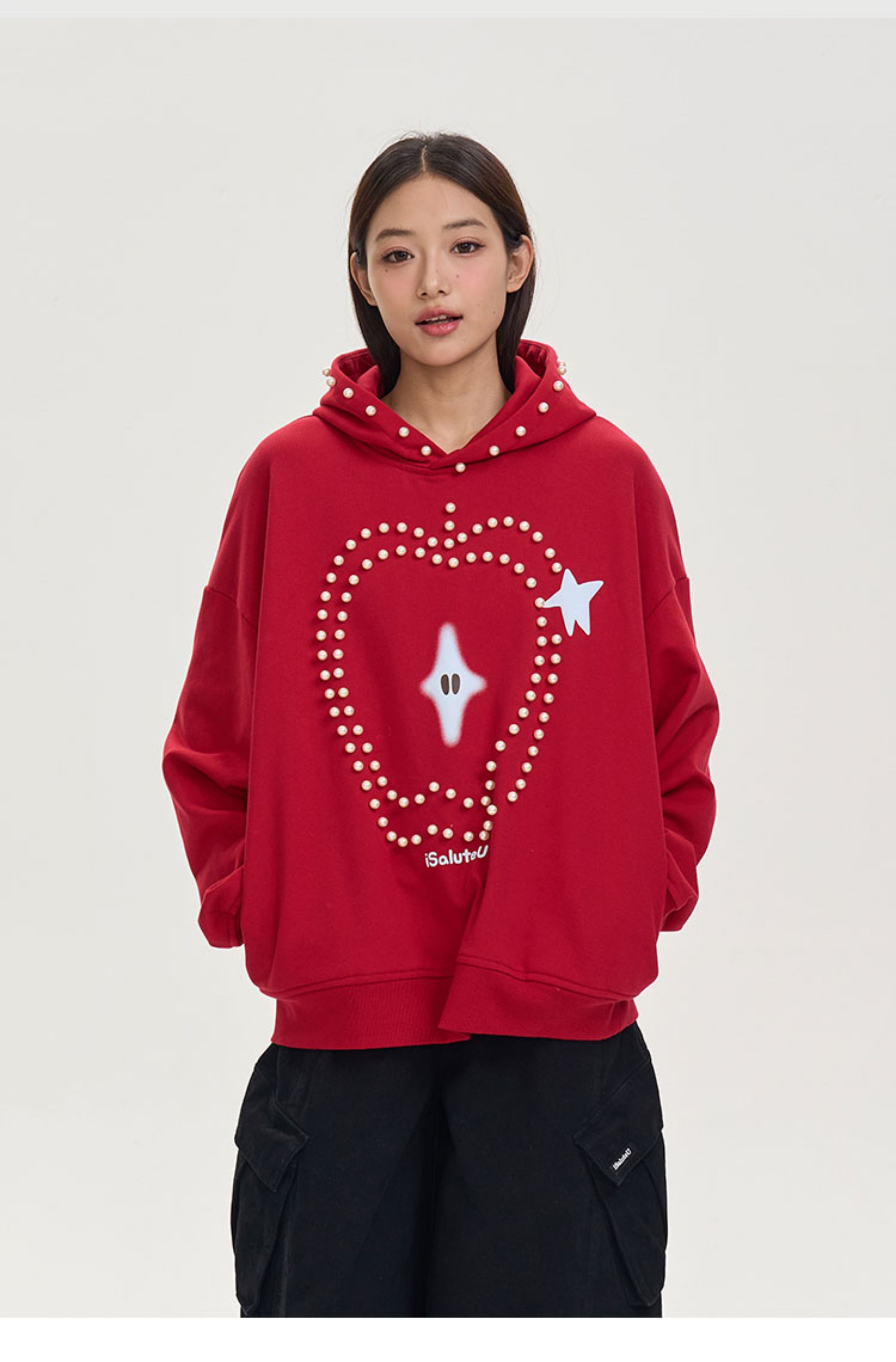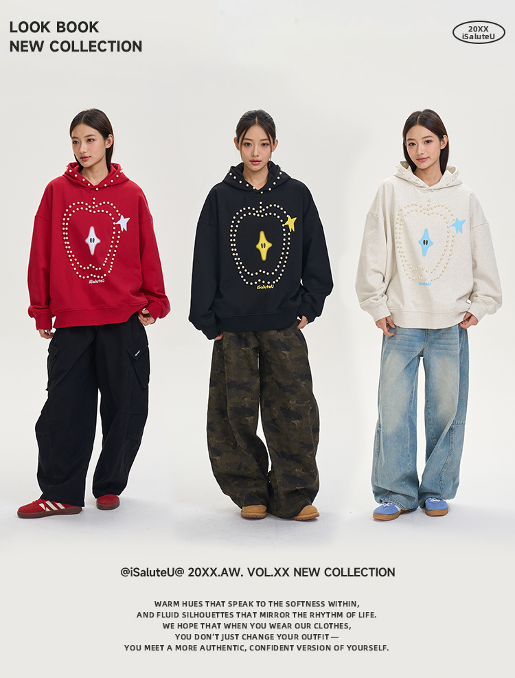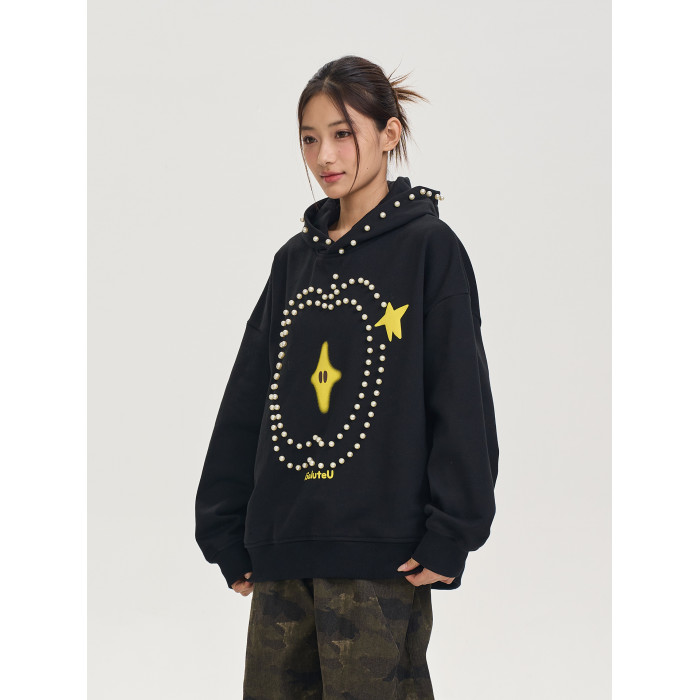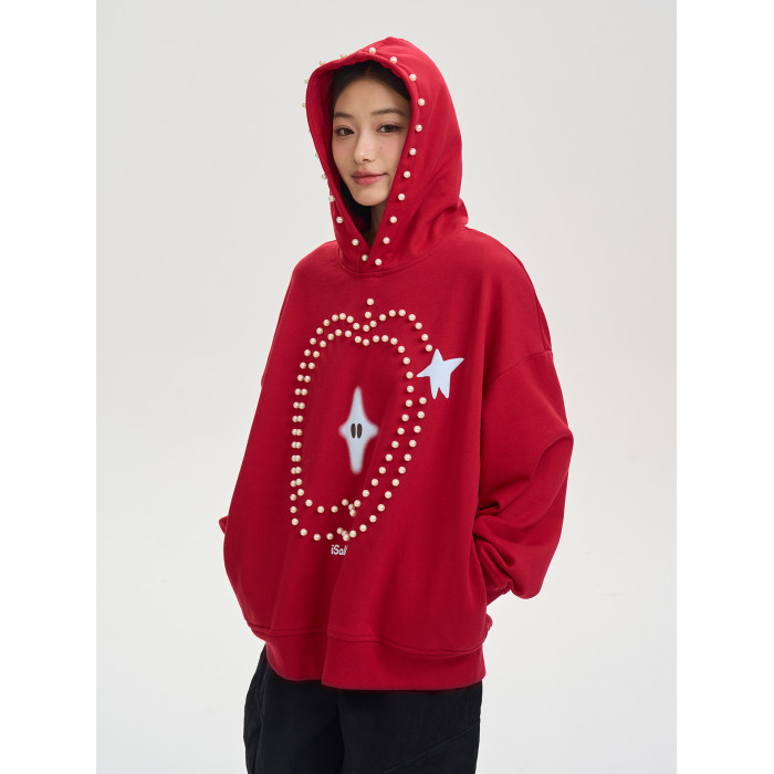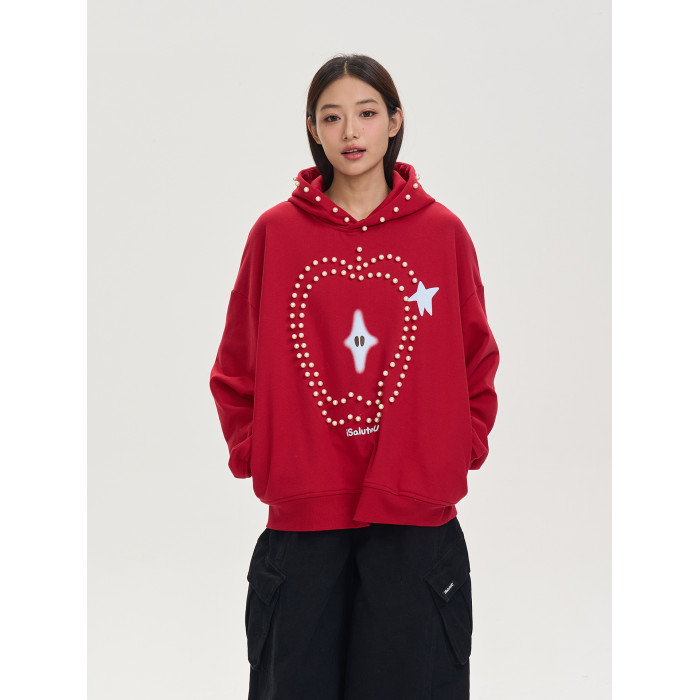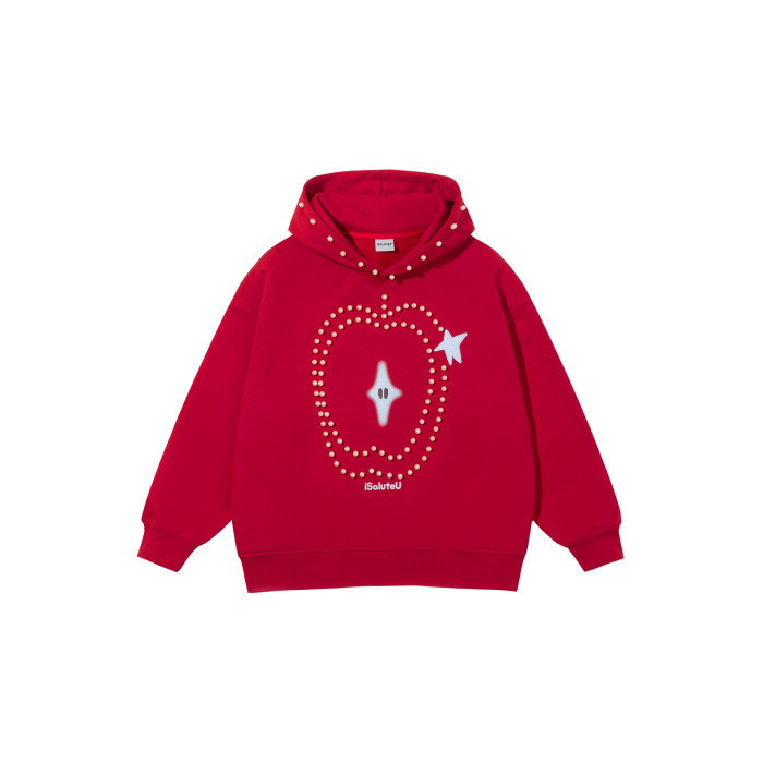 iSaluteU 趣味蘋果圖案珍珠燙釘連帽衛衣春秋季潮牌寬松帽衫情侶