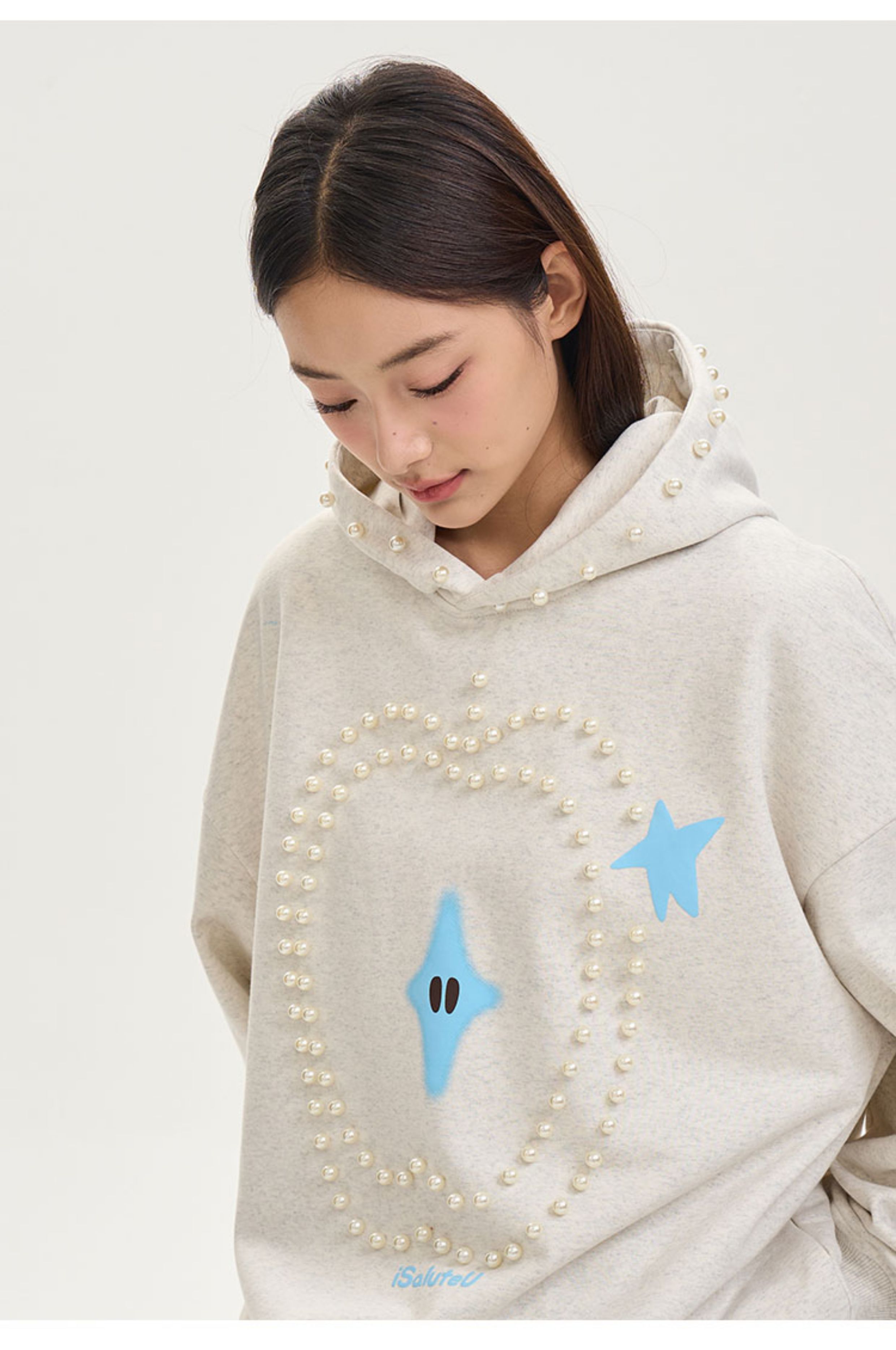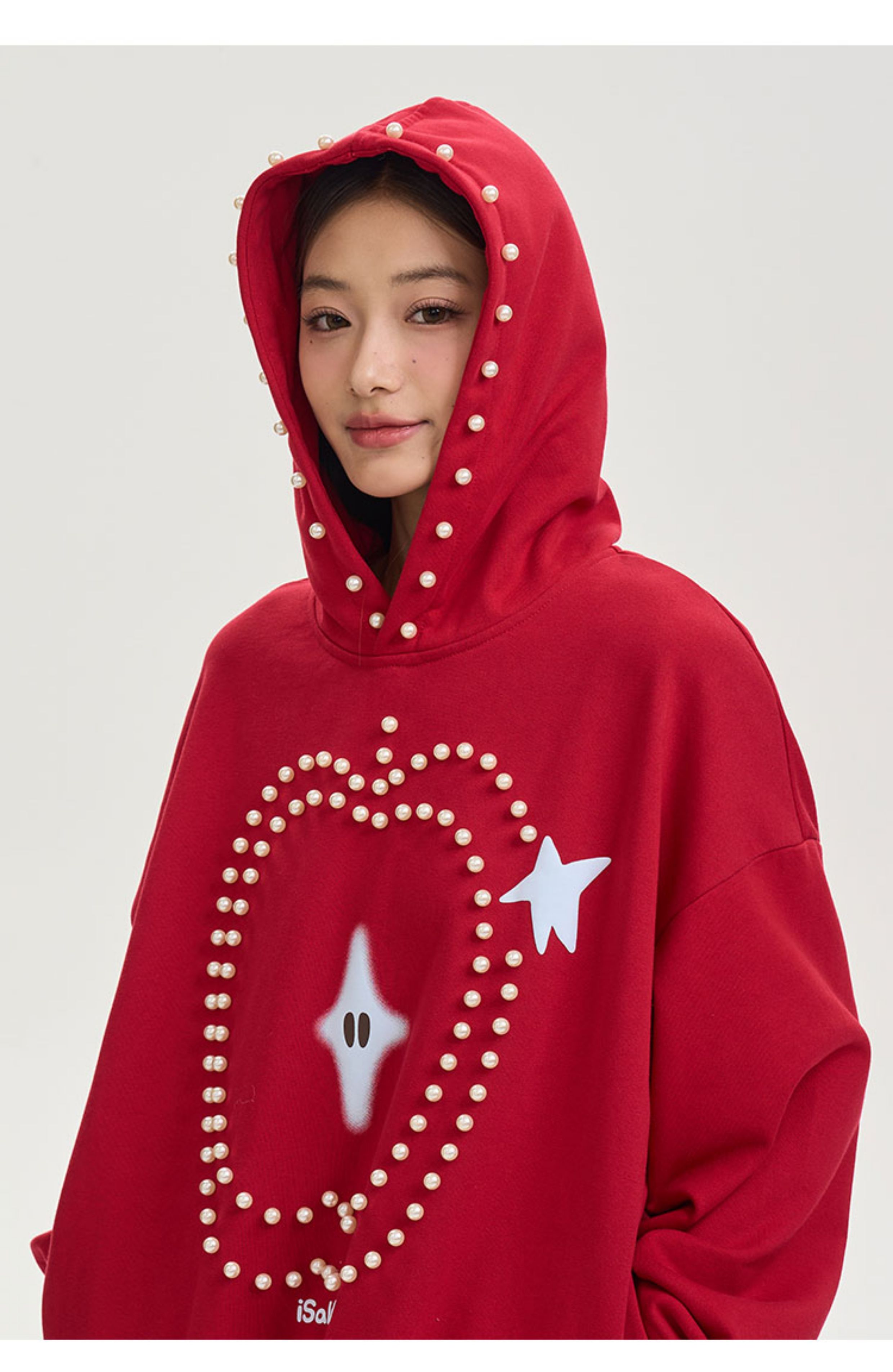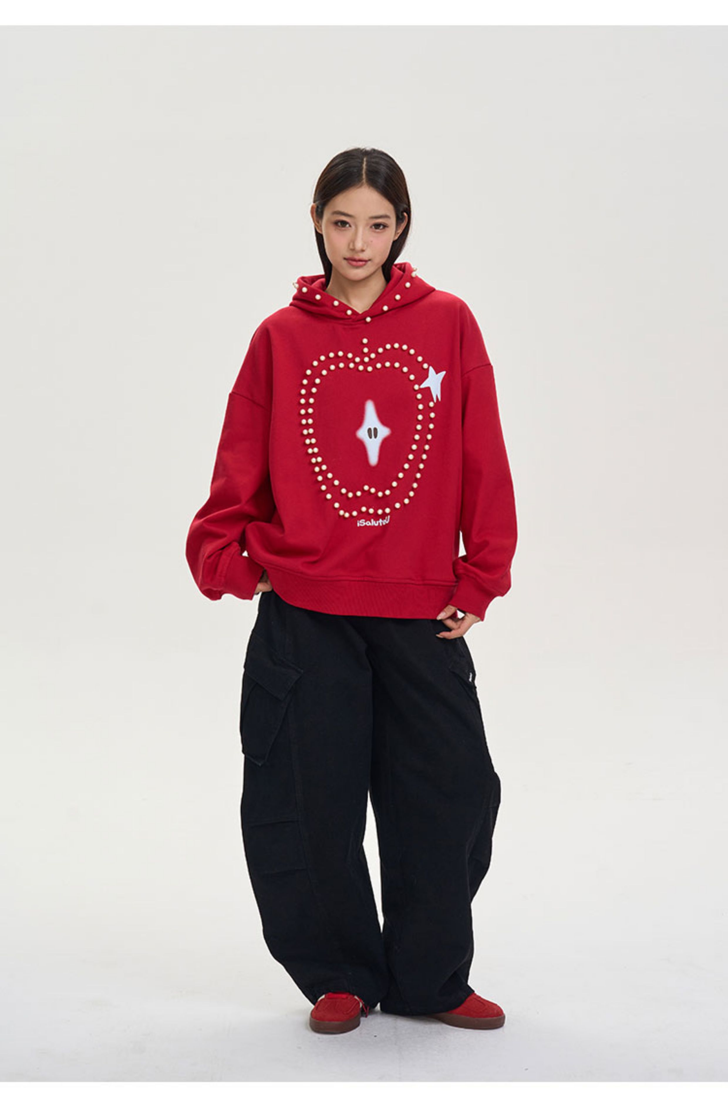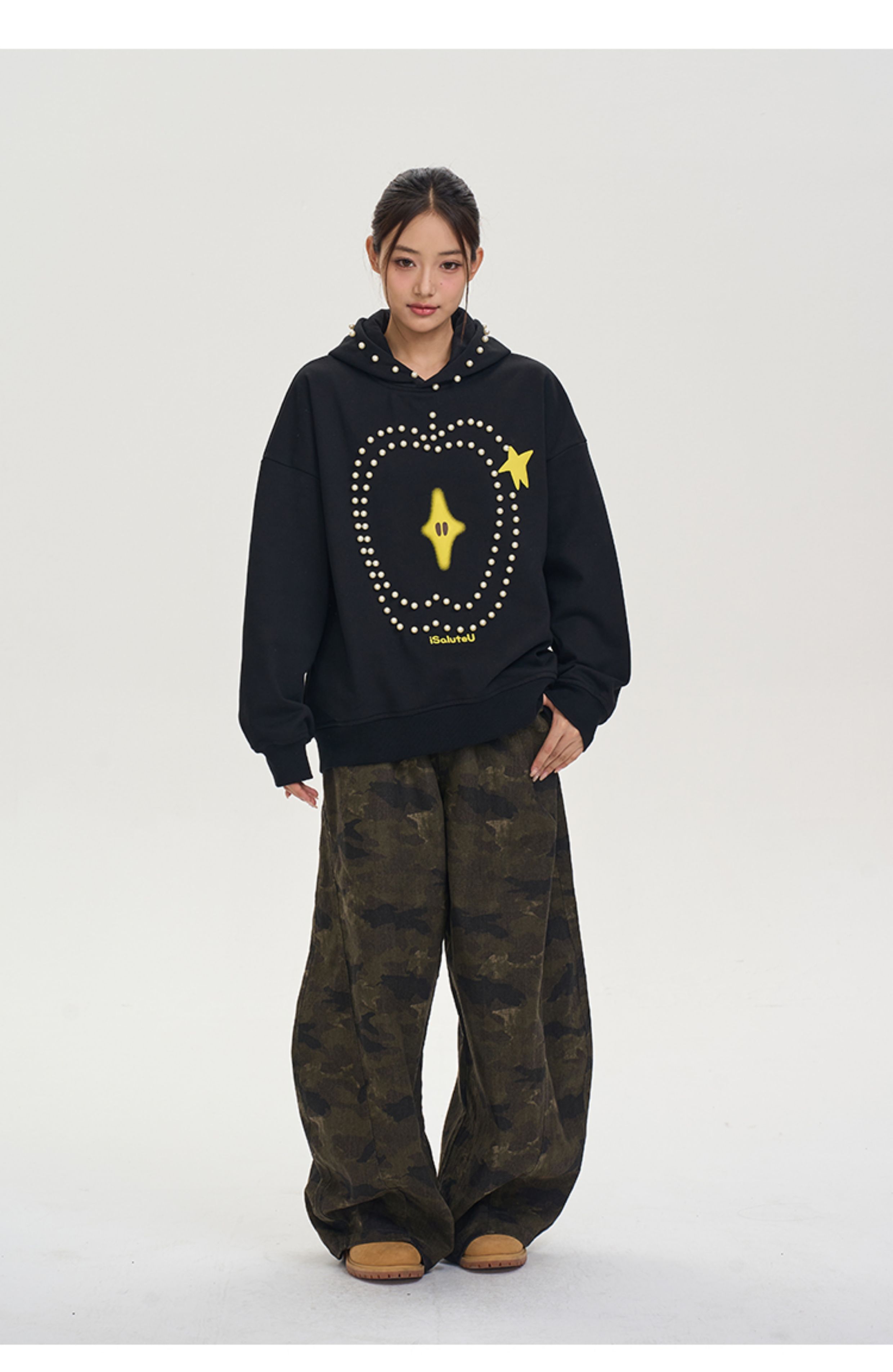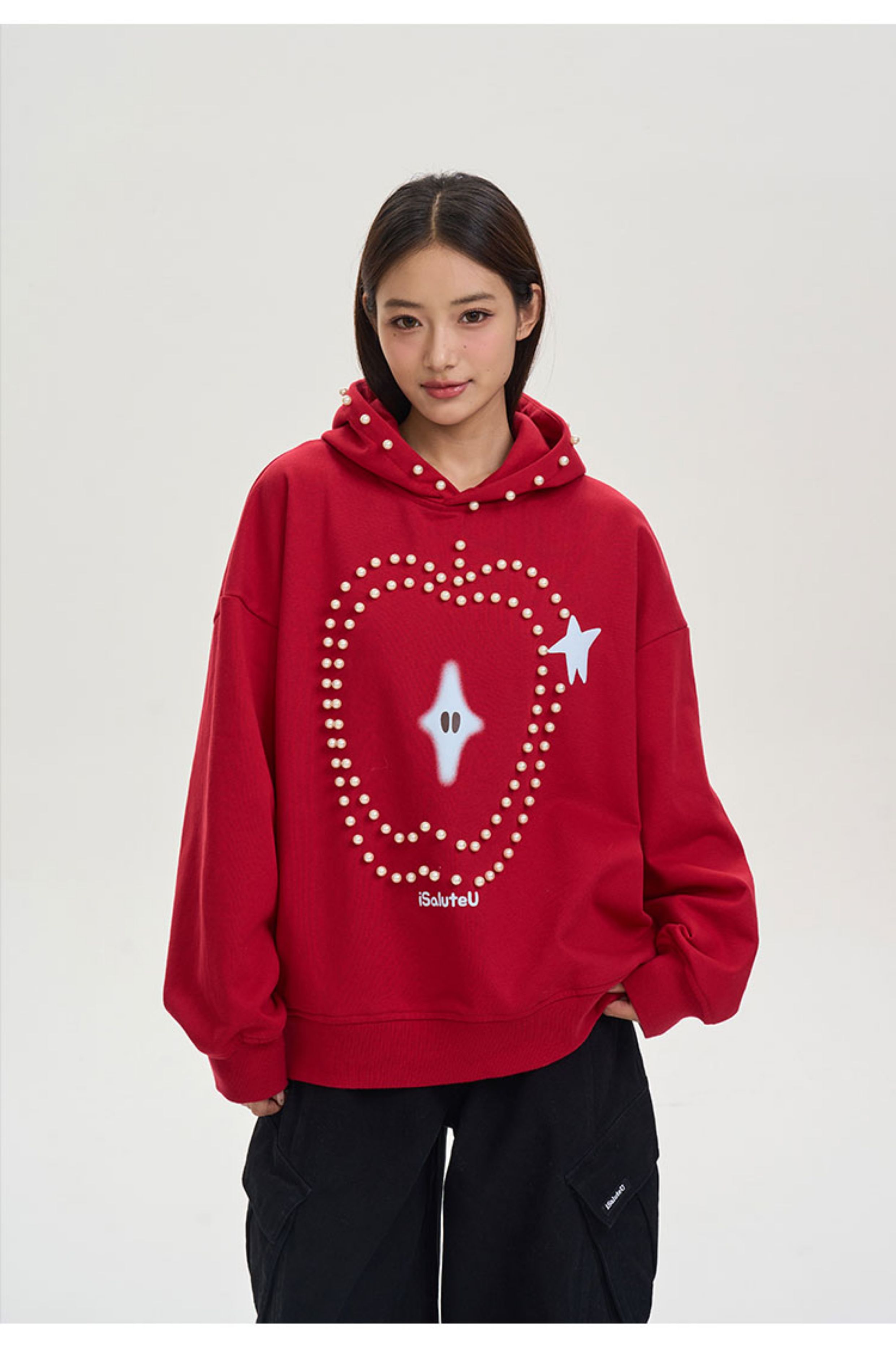 iSaluteU 趣味蘋果圖案珍珠燙釘連帽衛衣春秋季潮牌寬松帽衫情侶