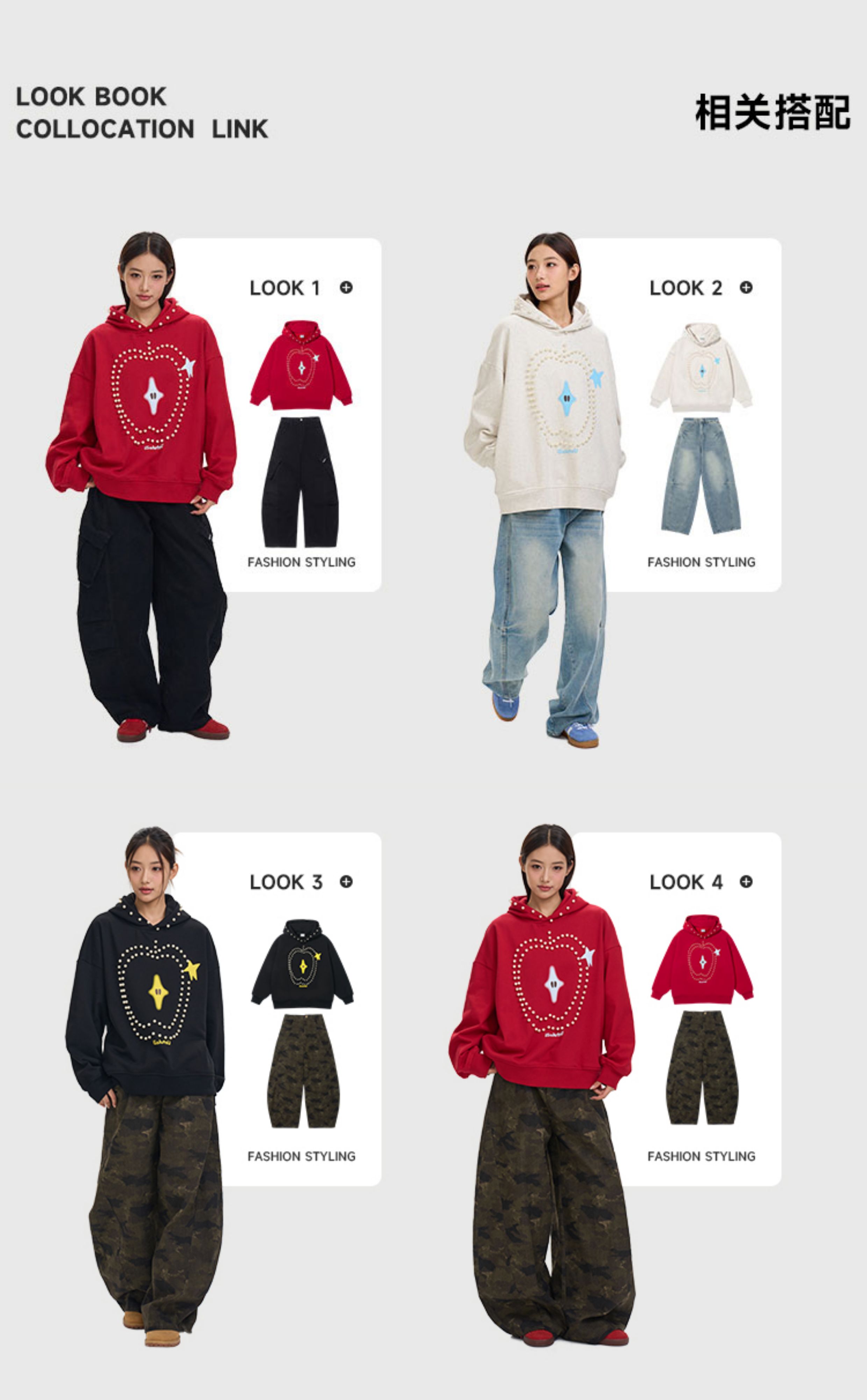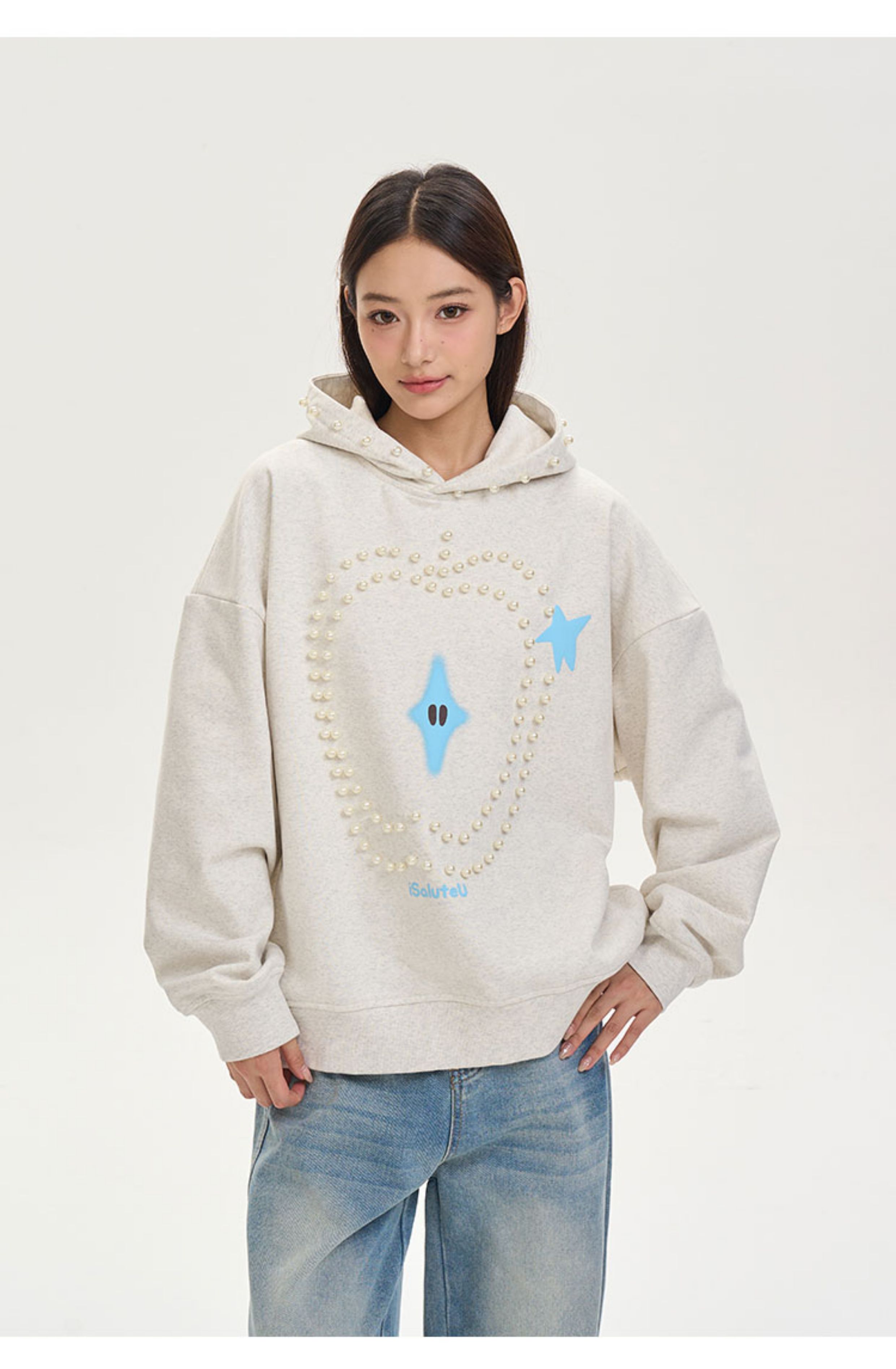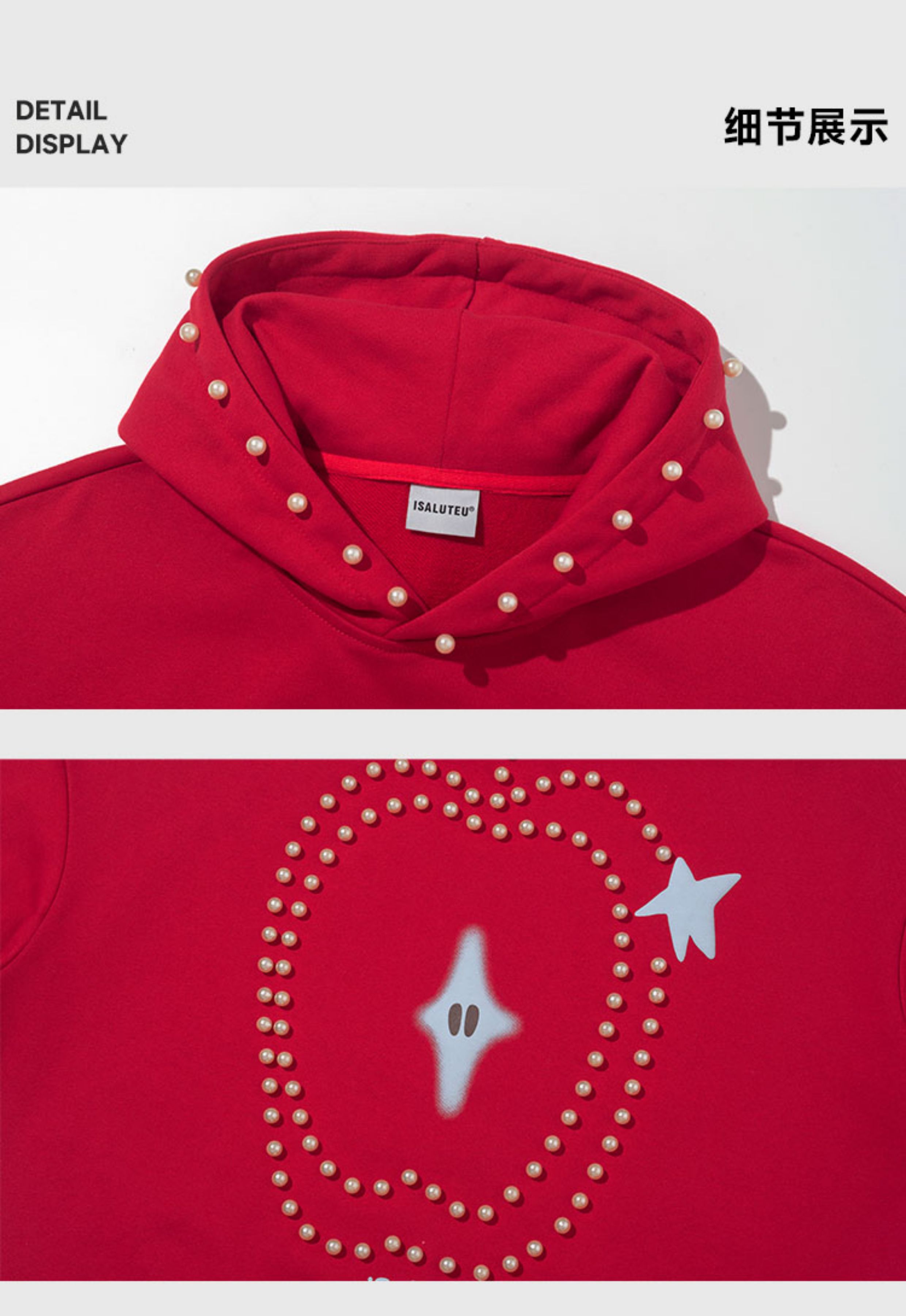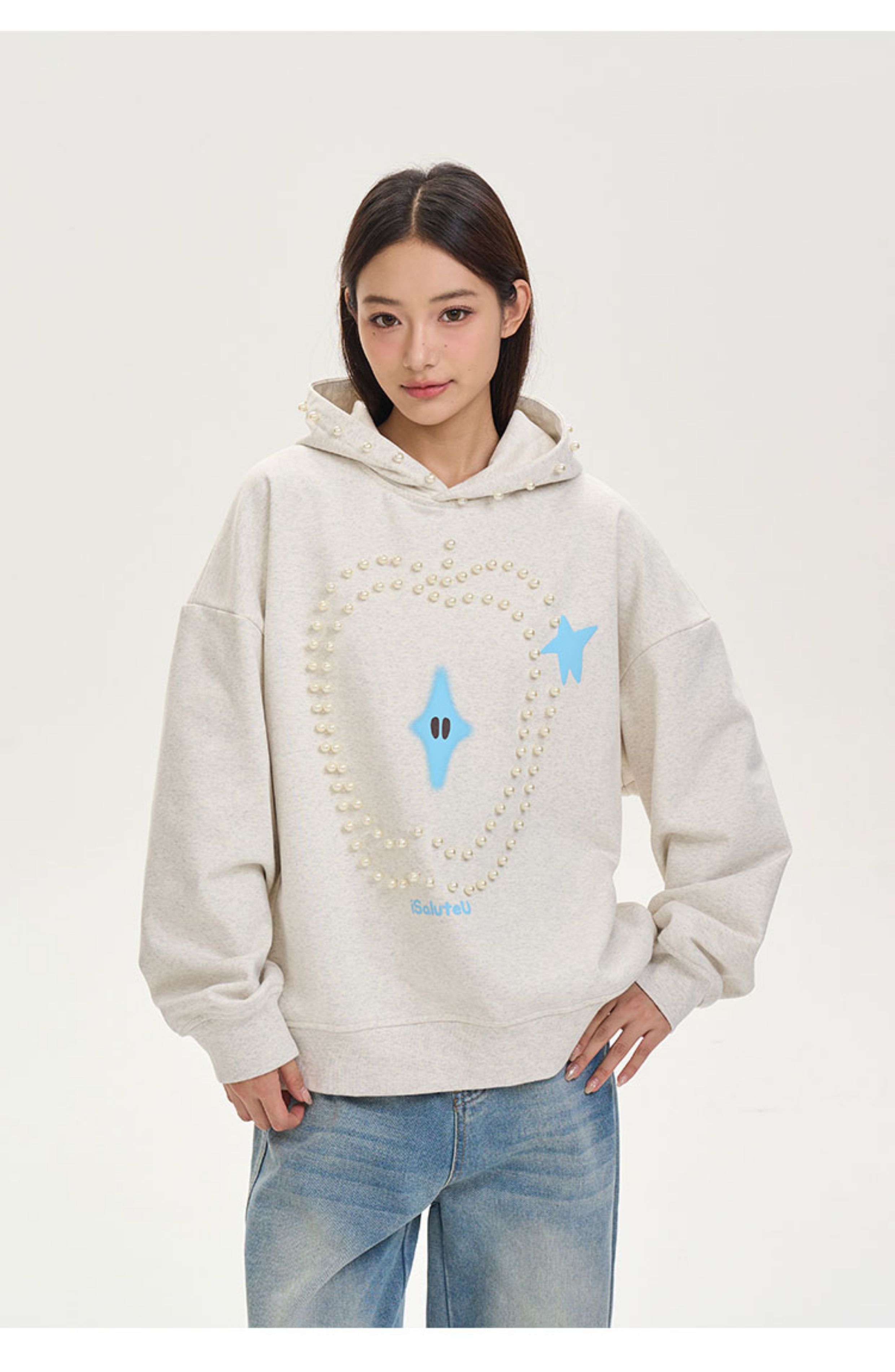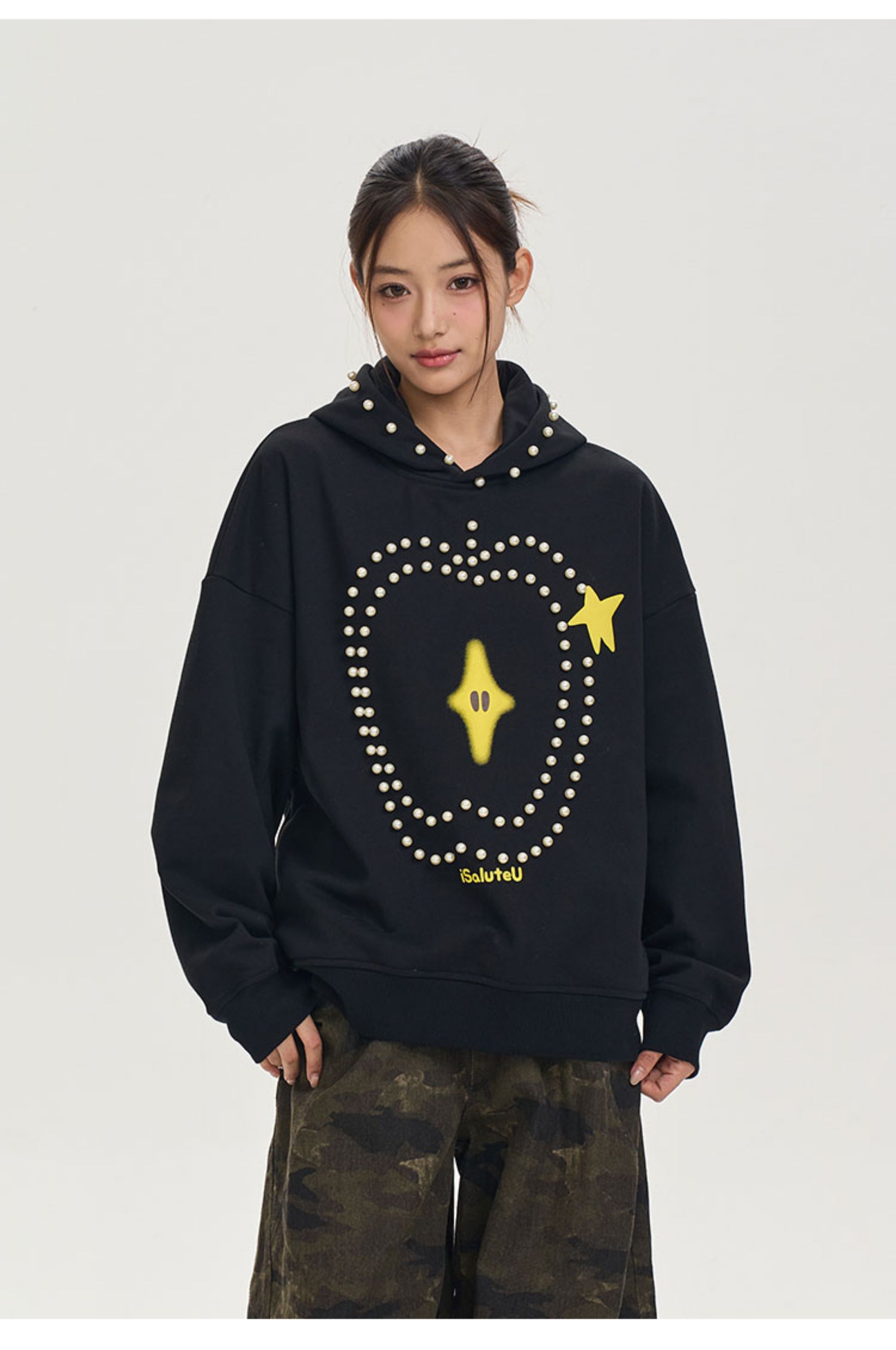 iSaluteU 趣味蘋果圖案珍珠燙釘連帽衛衣春秋季潮牌寬松帽衫情侶
