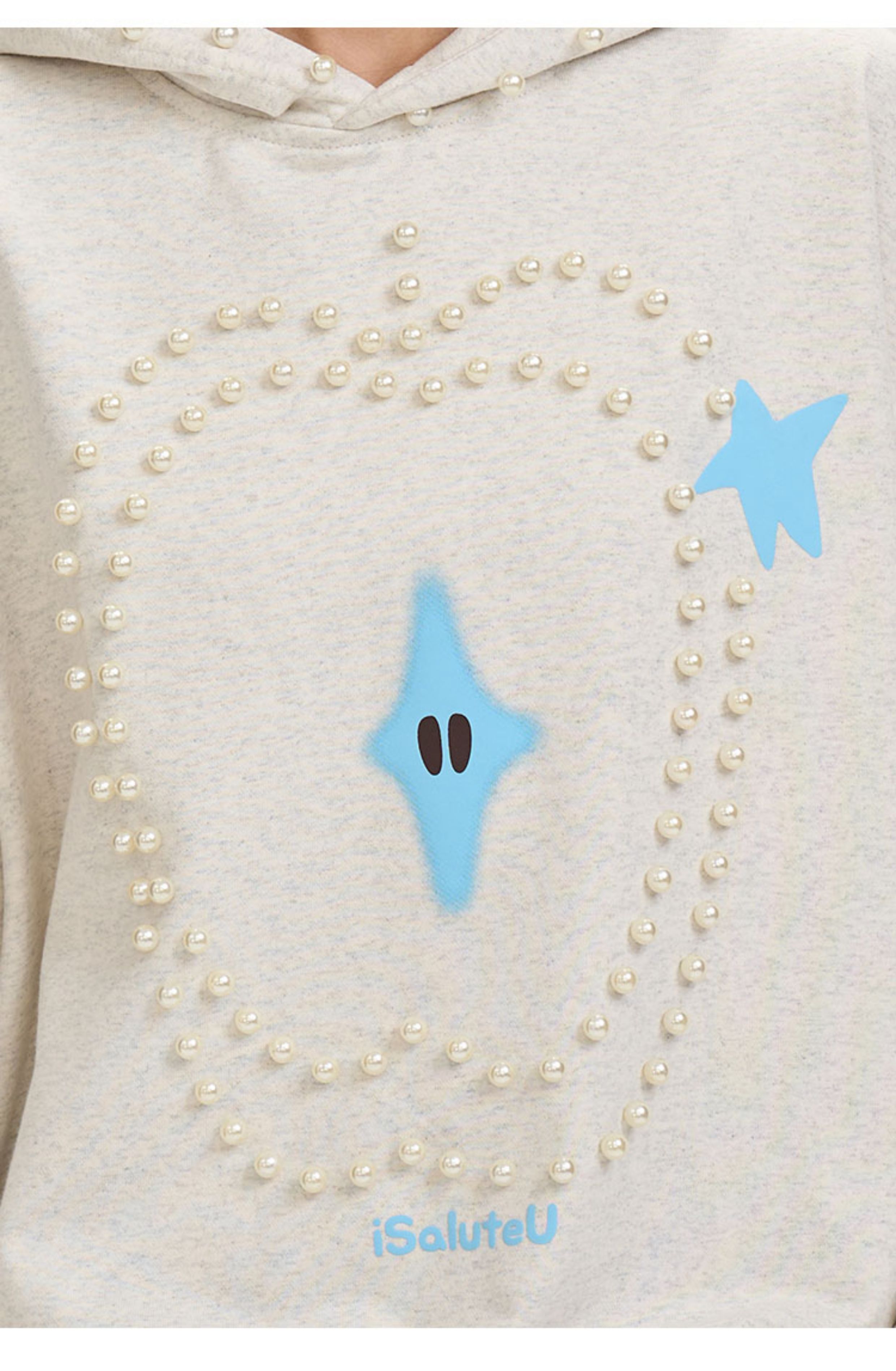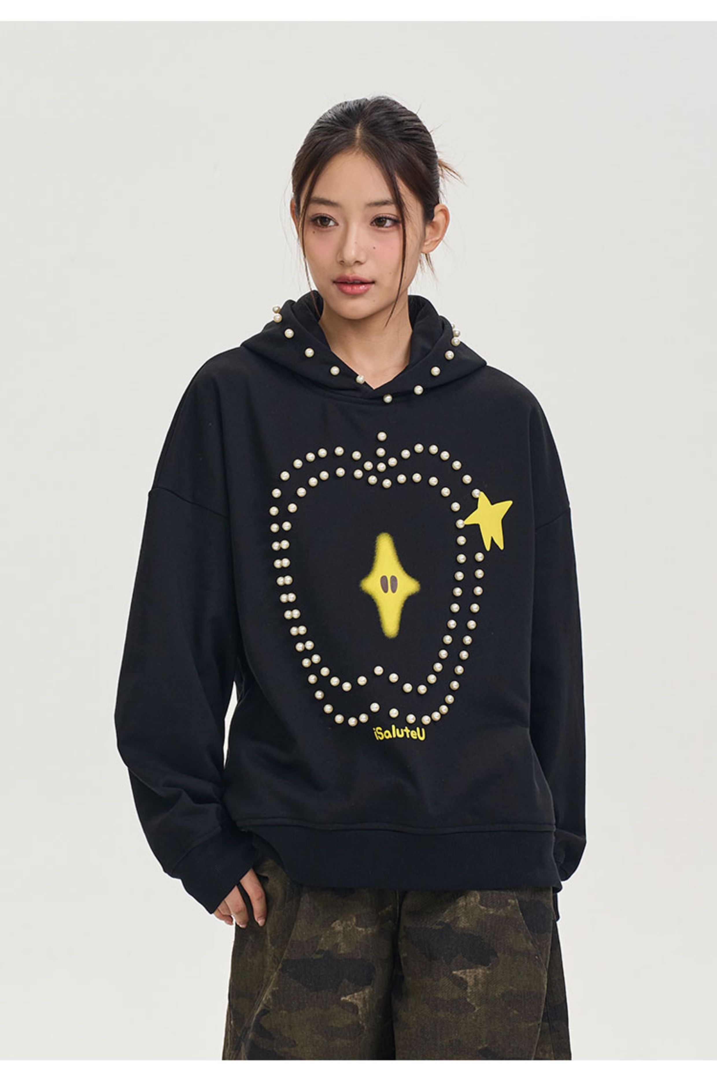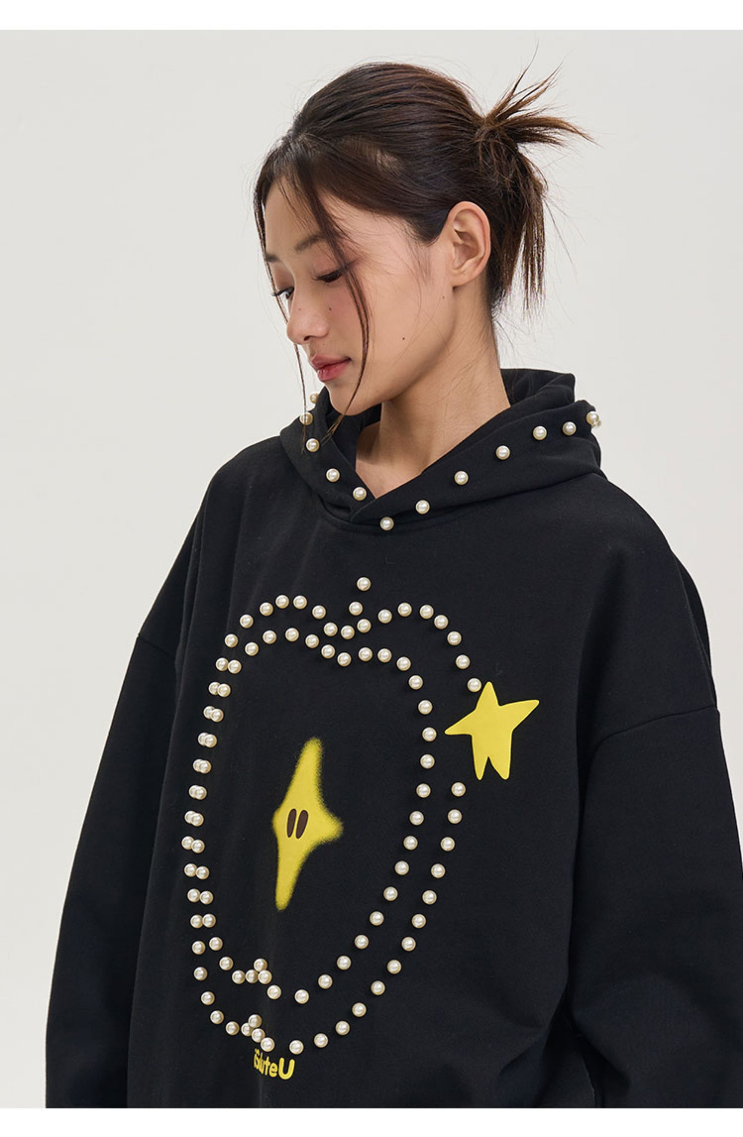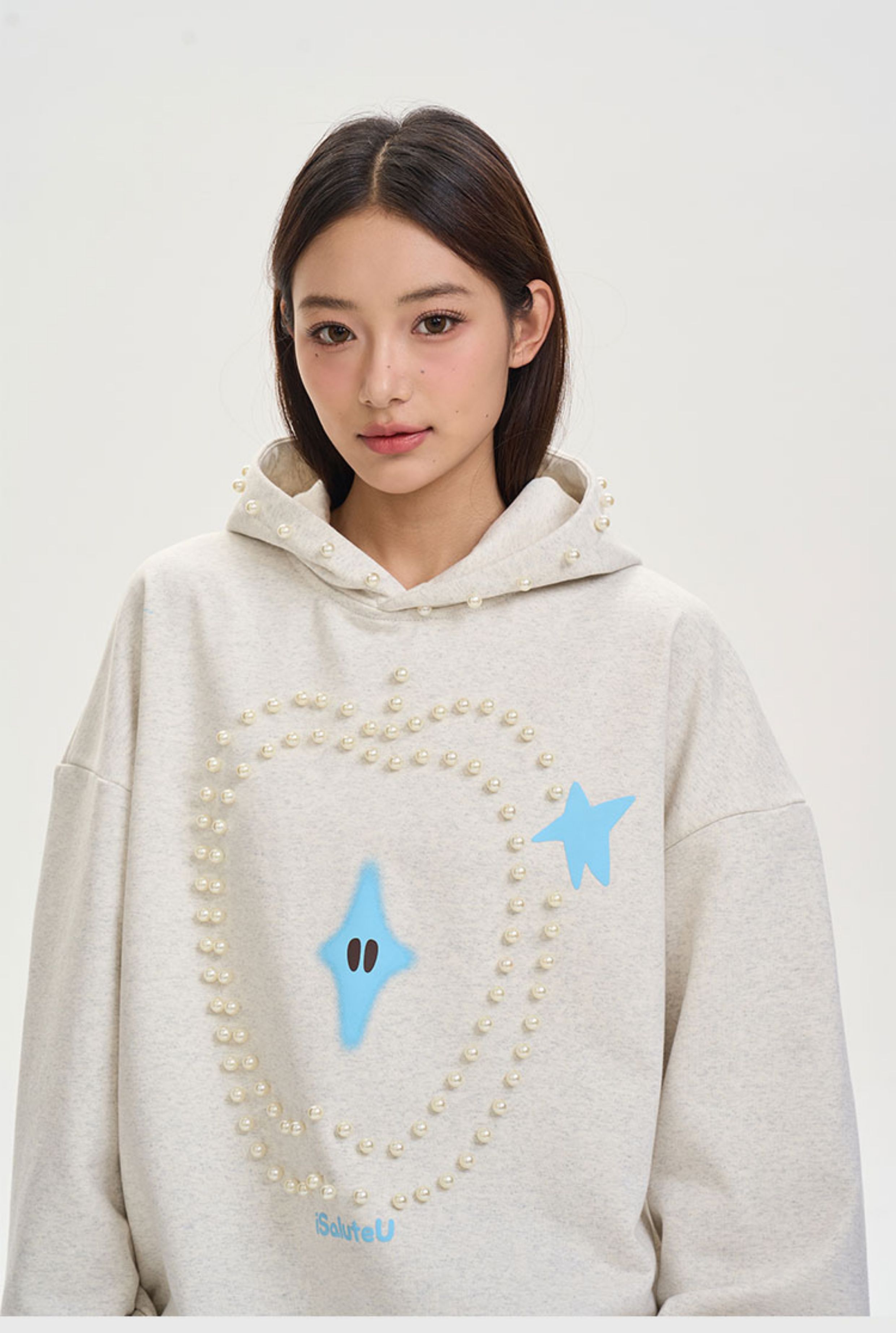iSaluteU 趣味蘋果圖案珍珠燙釘連帽衛衣春秋季潮牌寬松帽衫情侶