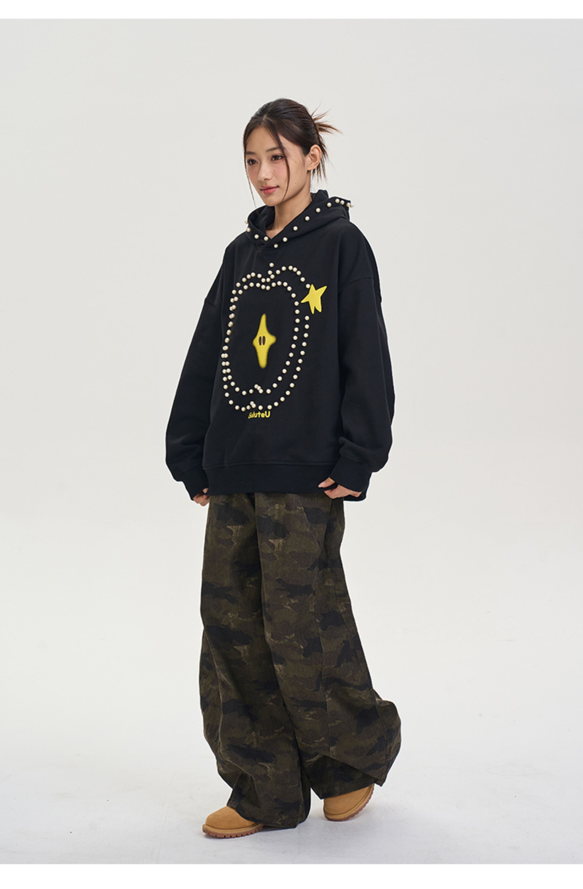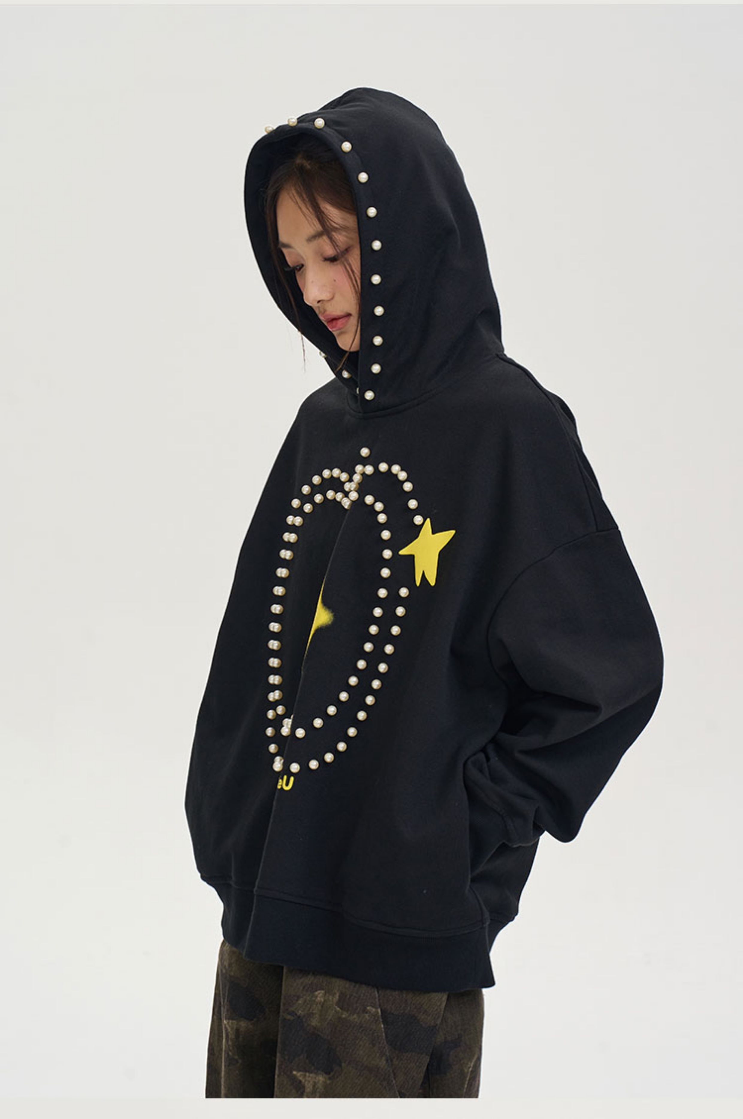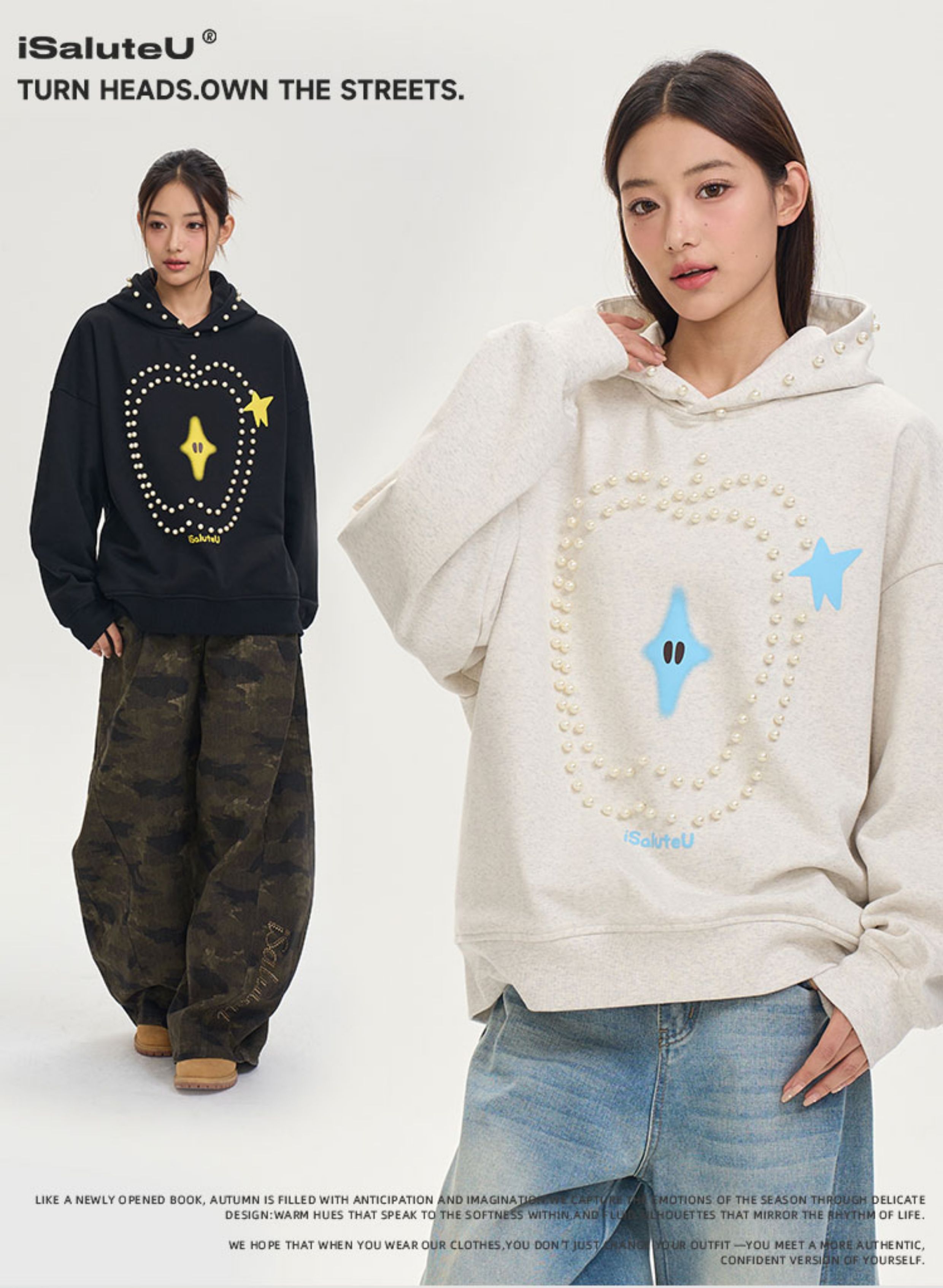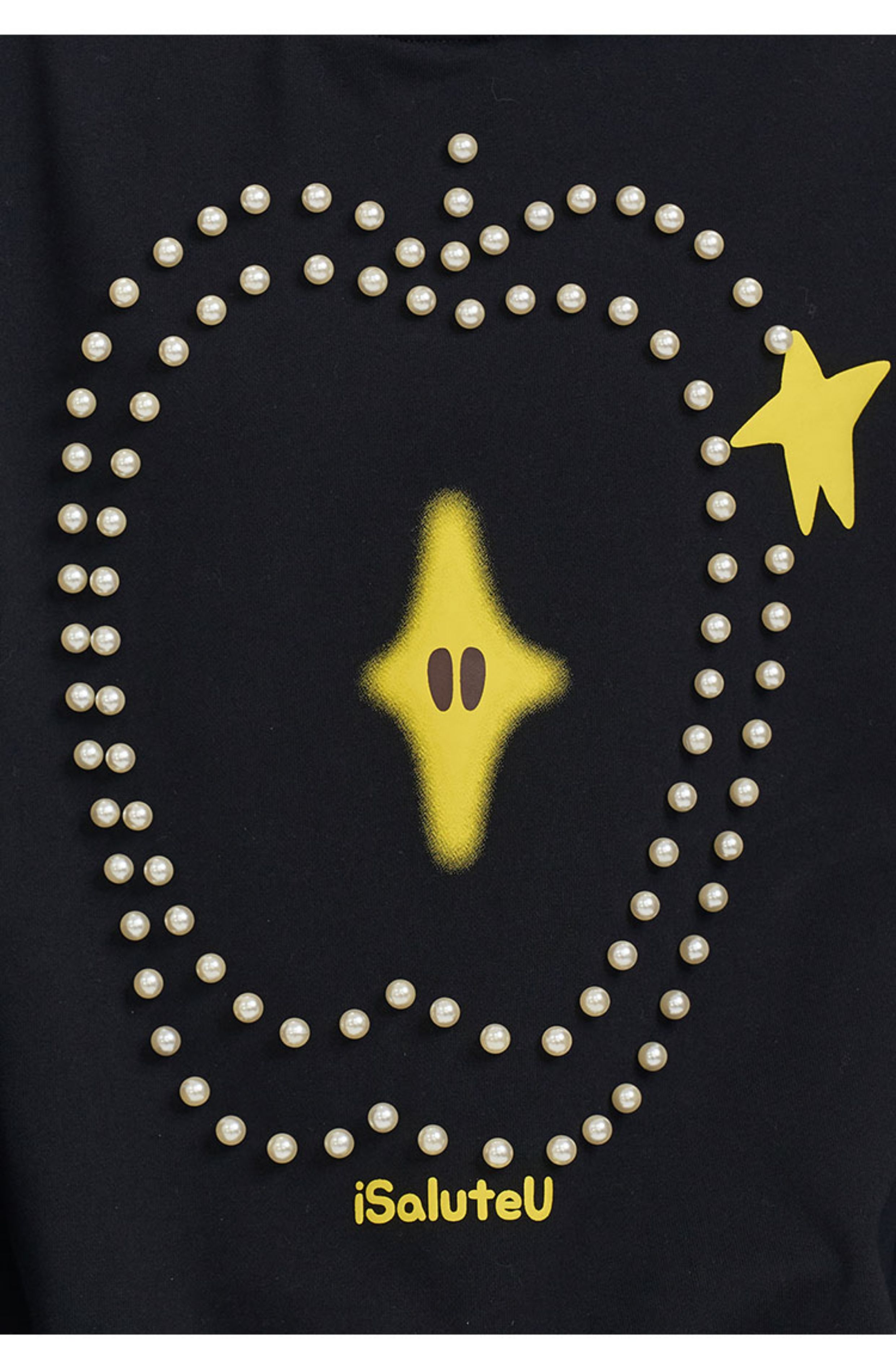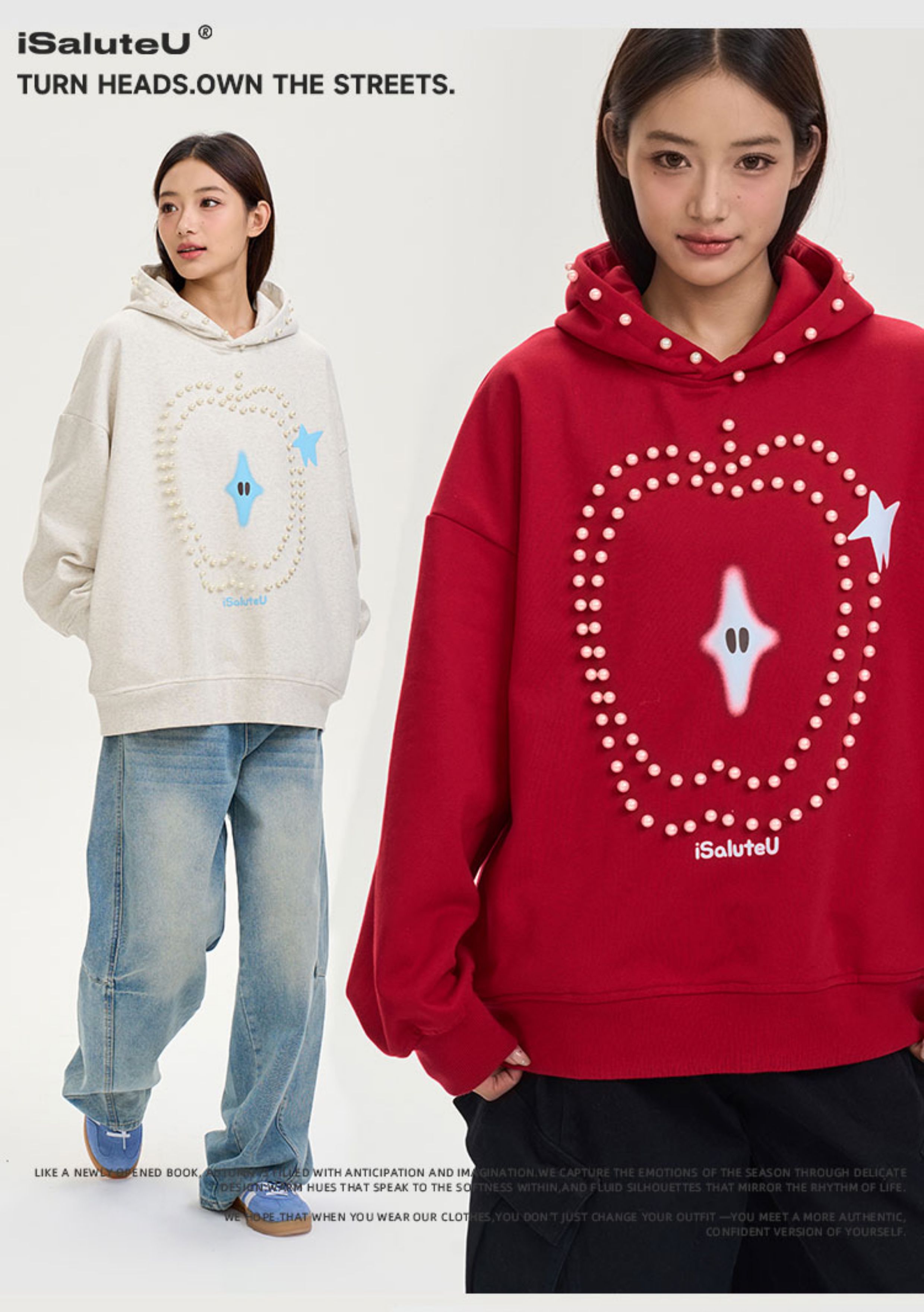 iSaluteU 趣味蘋果圖案珍珠燙釘連帽衛衣春秋季潮牌寬松帽衫情侶