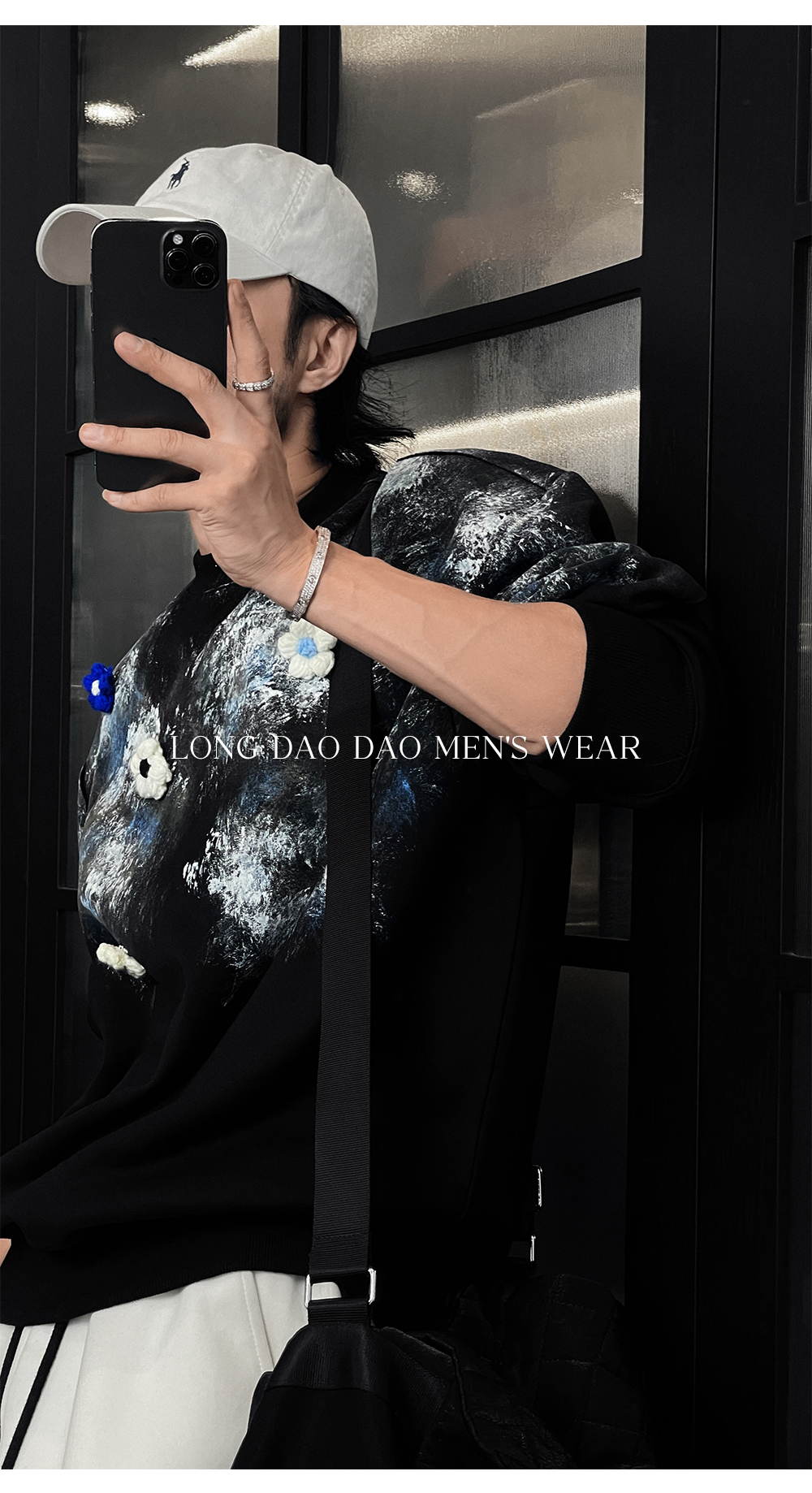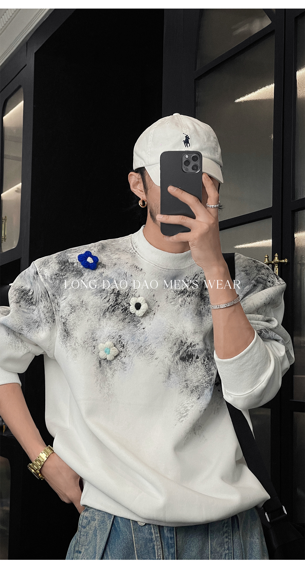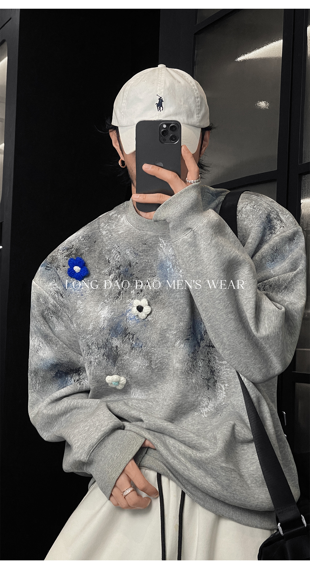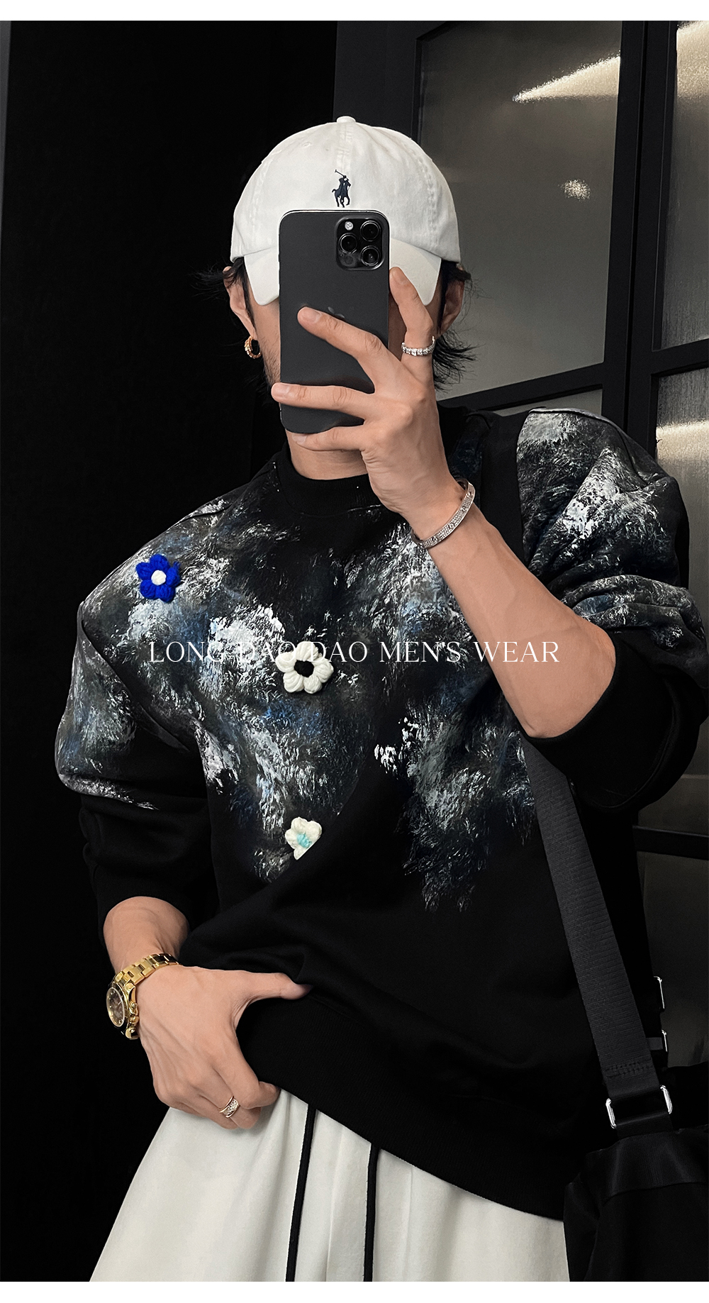 龍叨叨秋季新品美式潮牌小衆設計款衛衣男oversize寬松花朵上衣