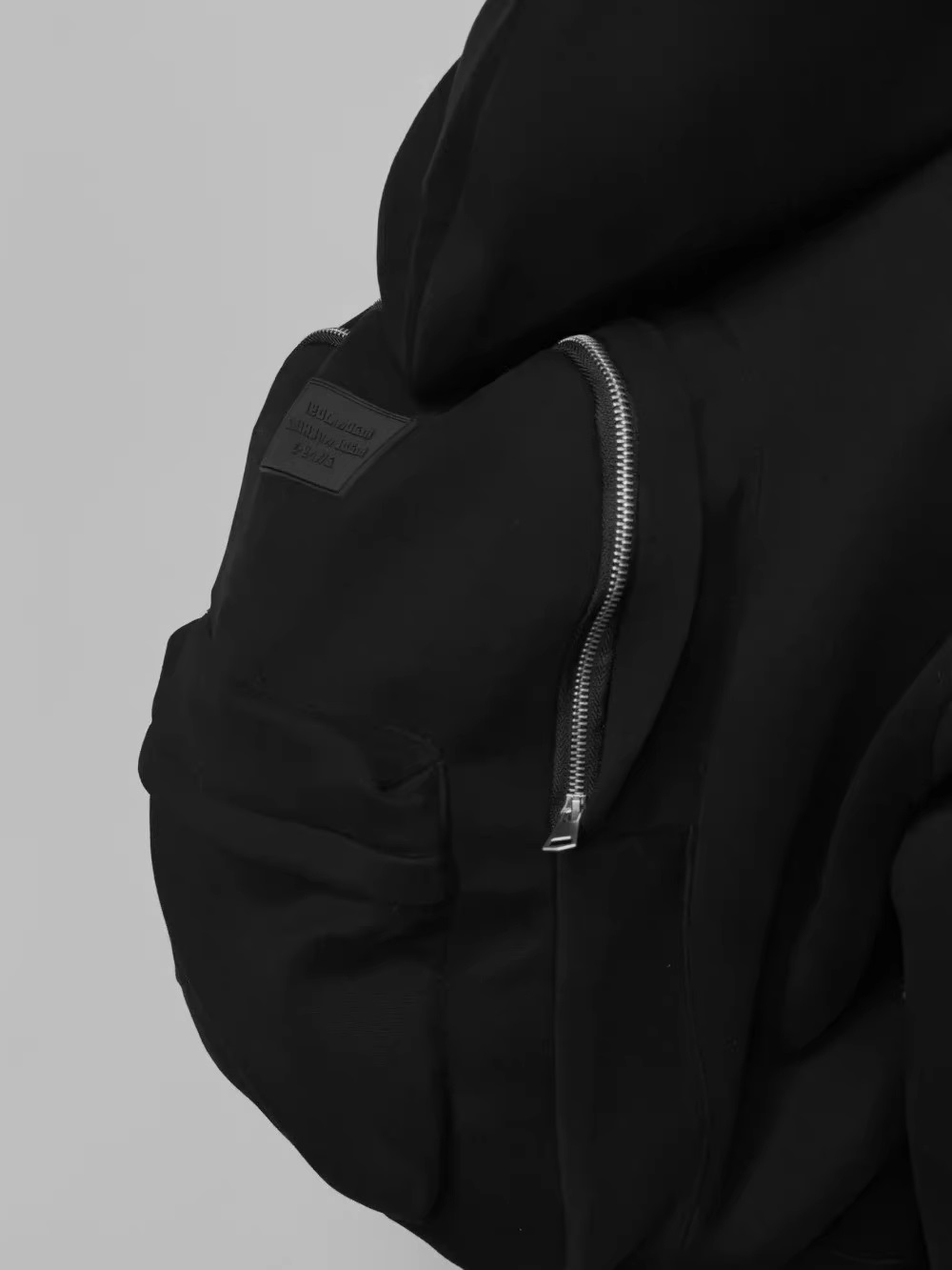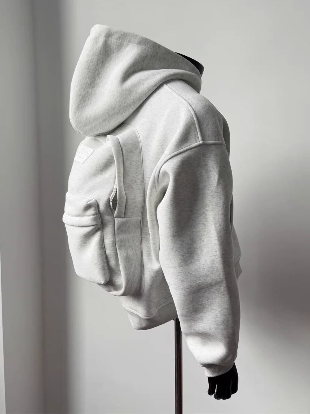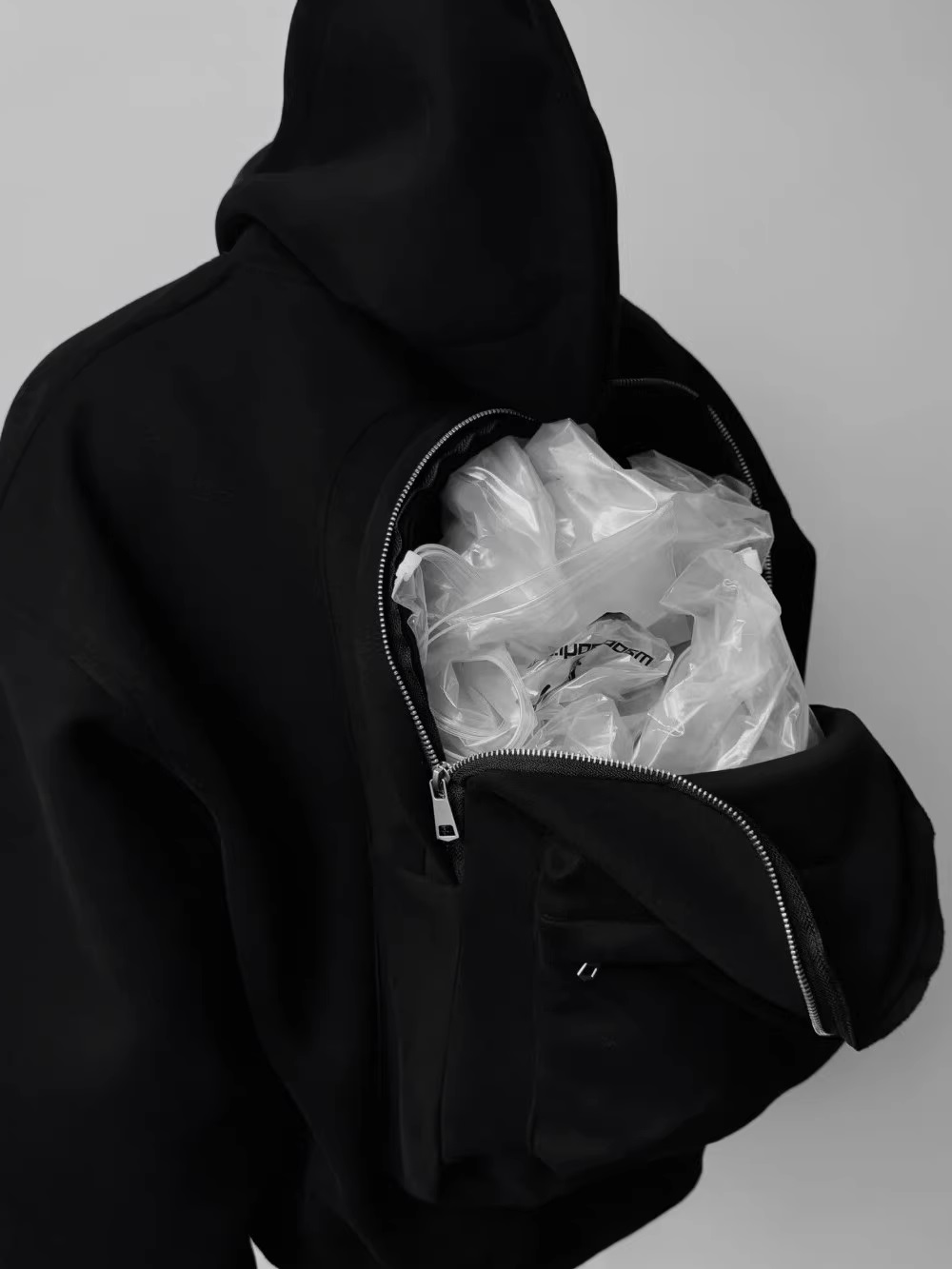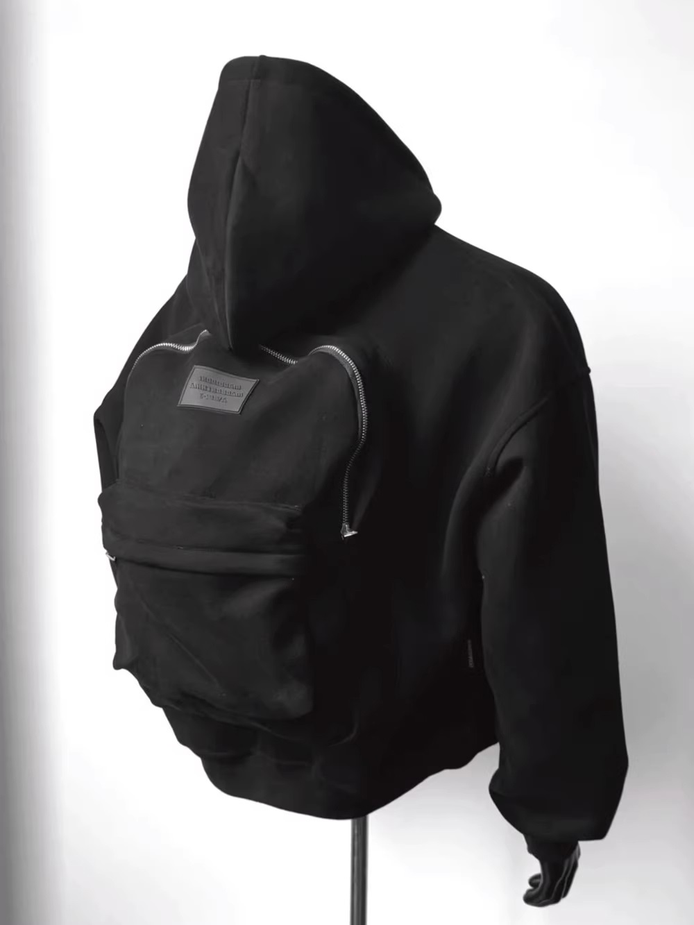 美式潮牌後背包一體開衫衛衣男春秋高級設計感寬松休閒連帽黑色外套