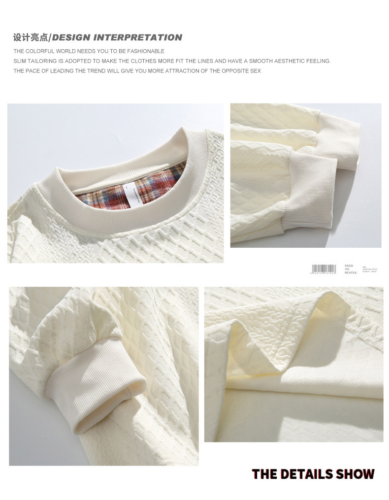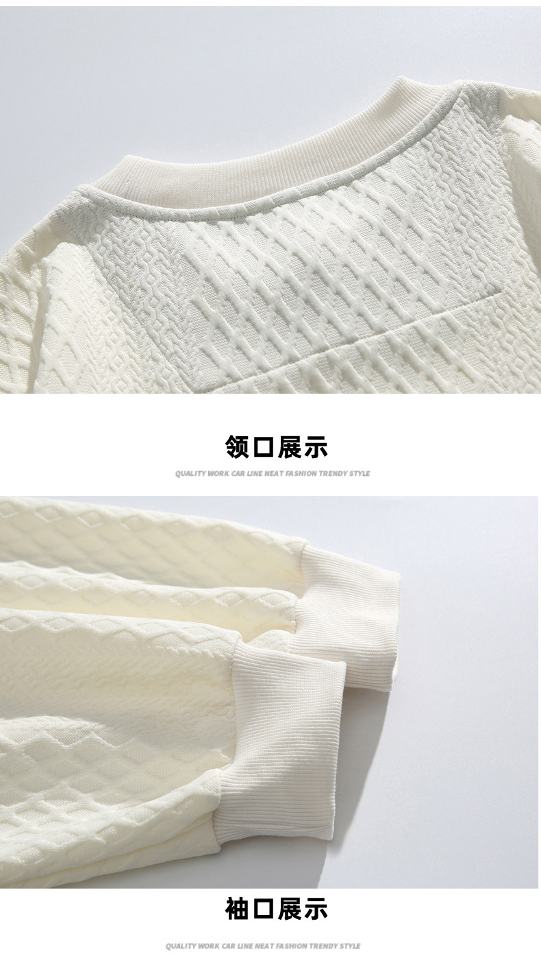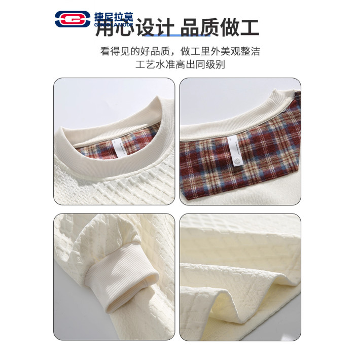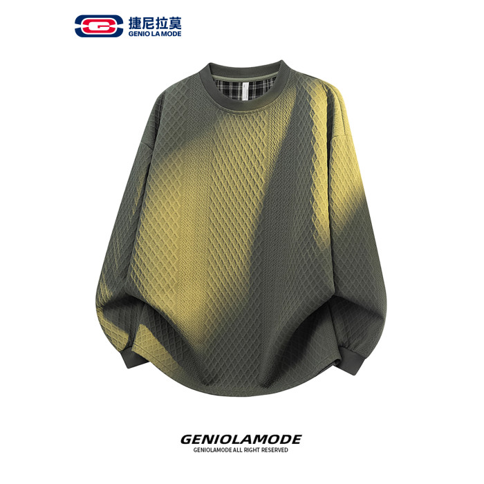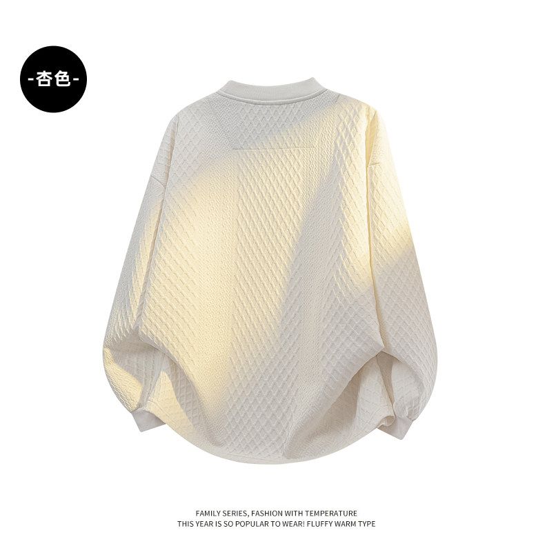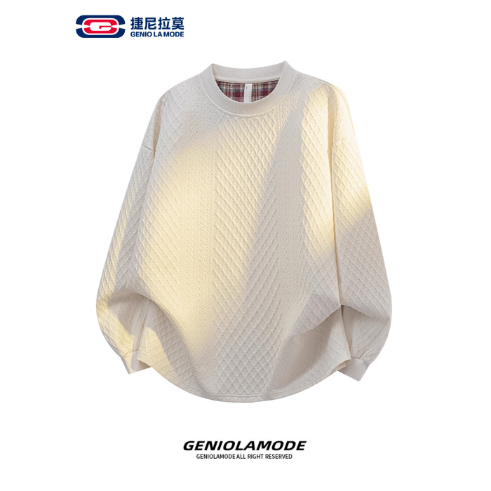 GENIOLAMODE杏色提花寬松長袖男T恤春秋新款百搭休閒圓領情侶衛衣