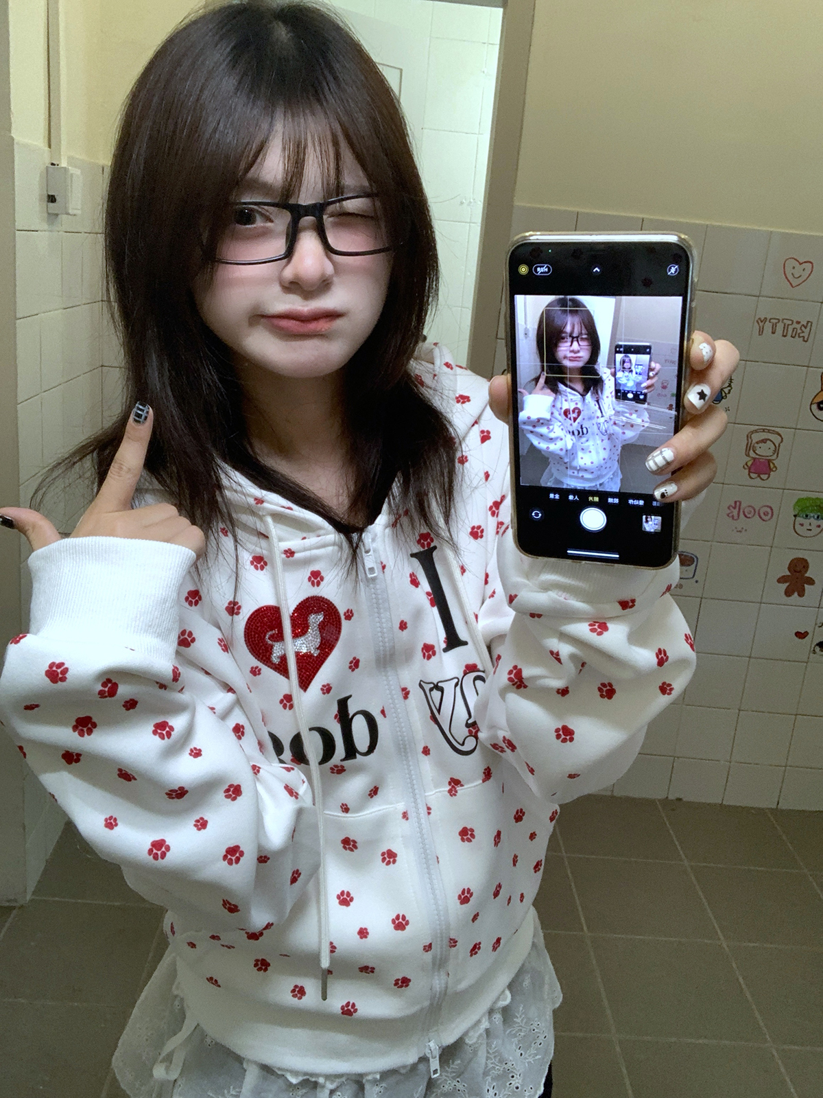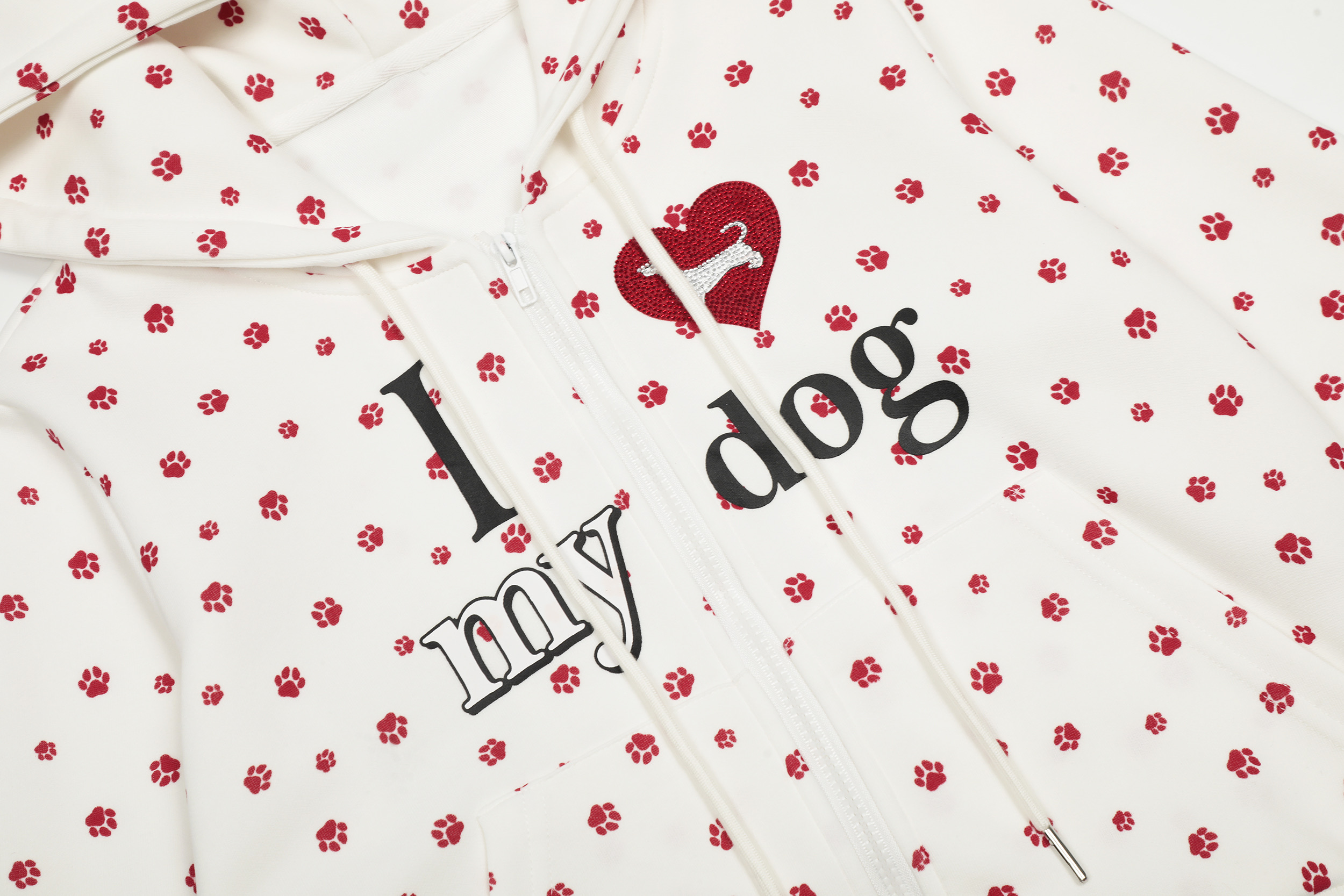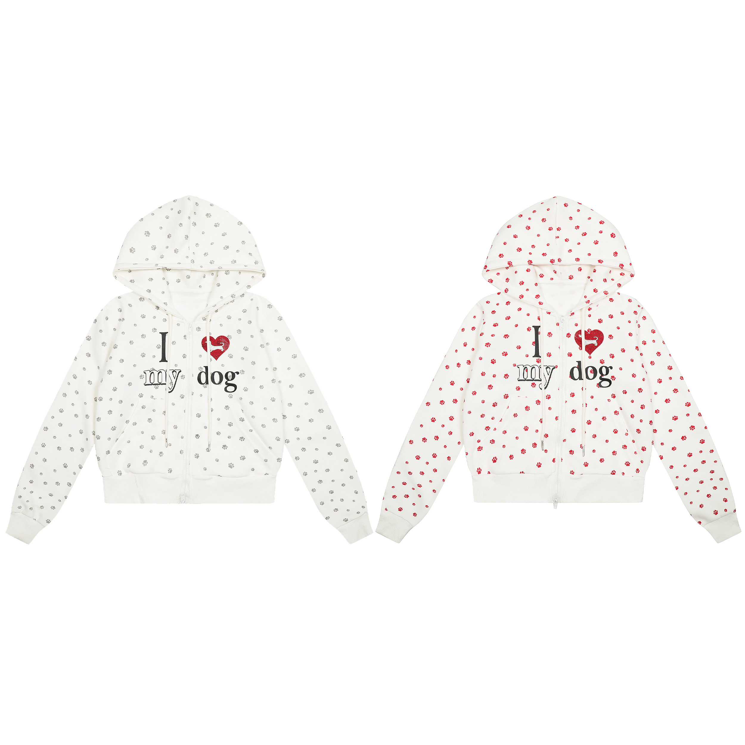 GTGA愛心燙鑽印花連帽衛衣開衫秋季新款狗爪滿印修身顯瘦短款外套