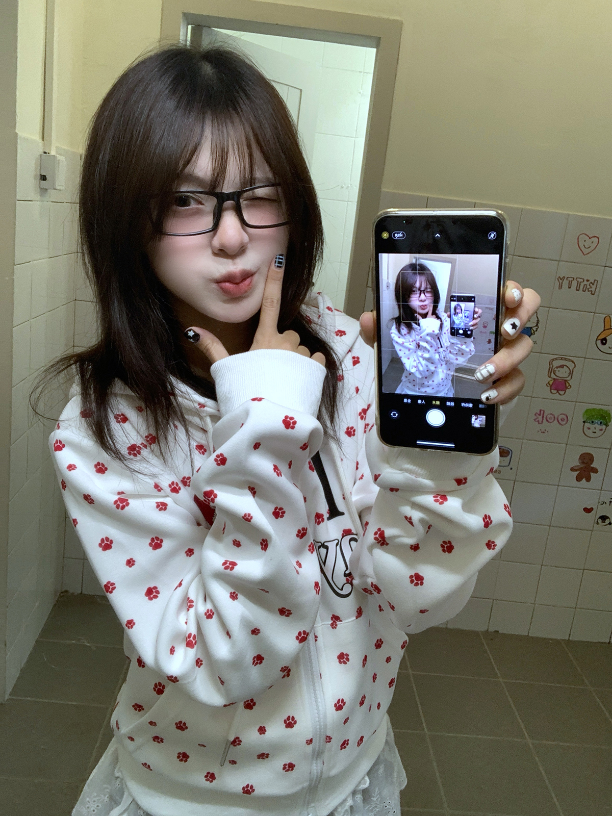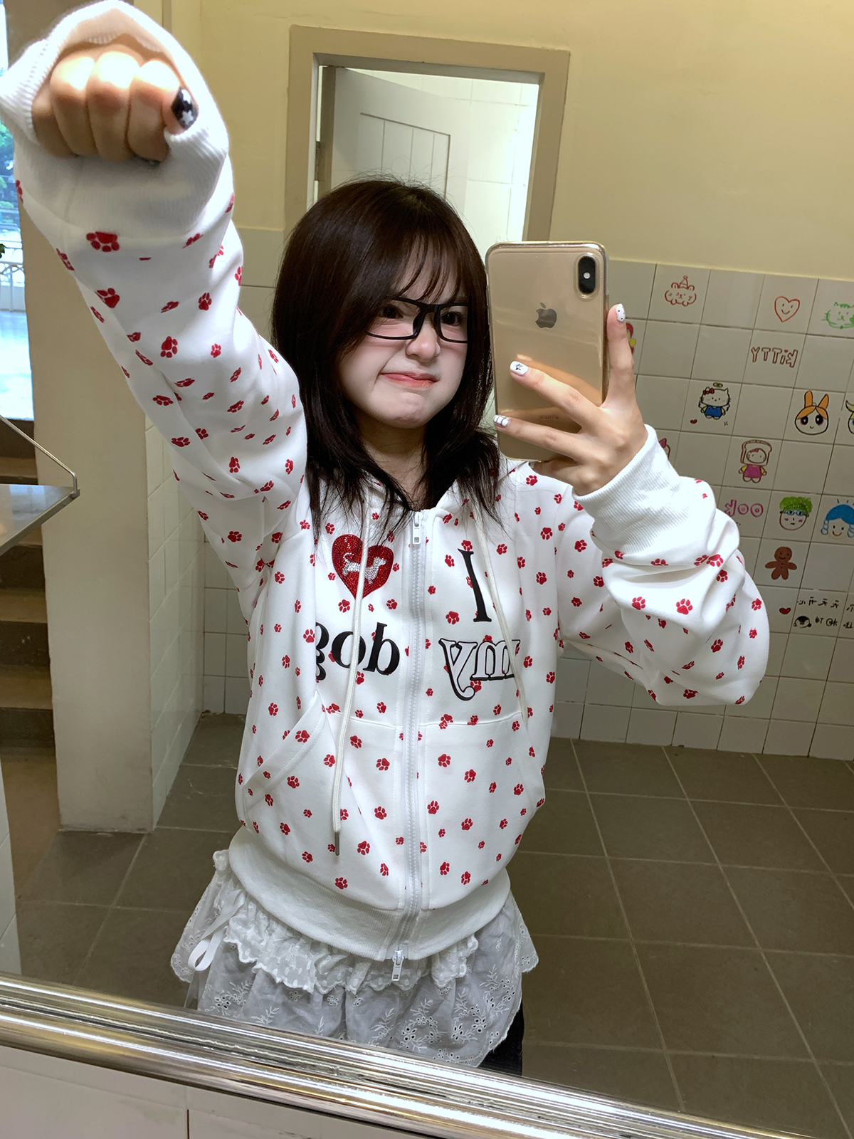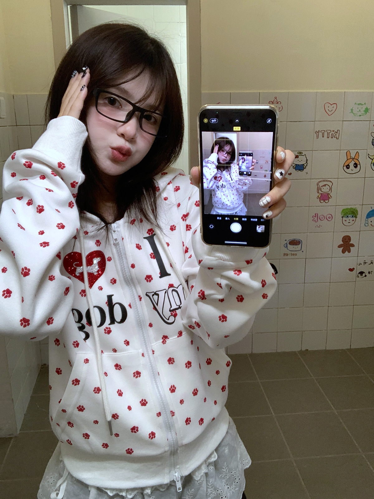 GTGA愛心燙鑽印花連帽衛衣開衫秋季新款狗爪滿印修身顯瘦短款外套