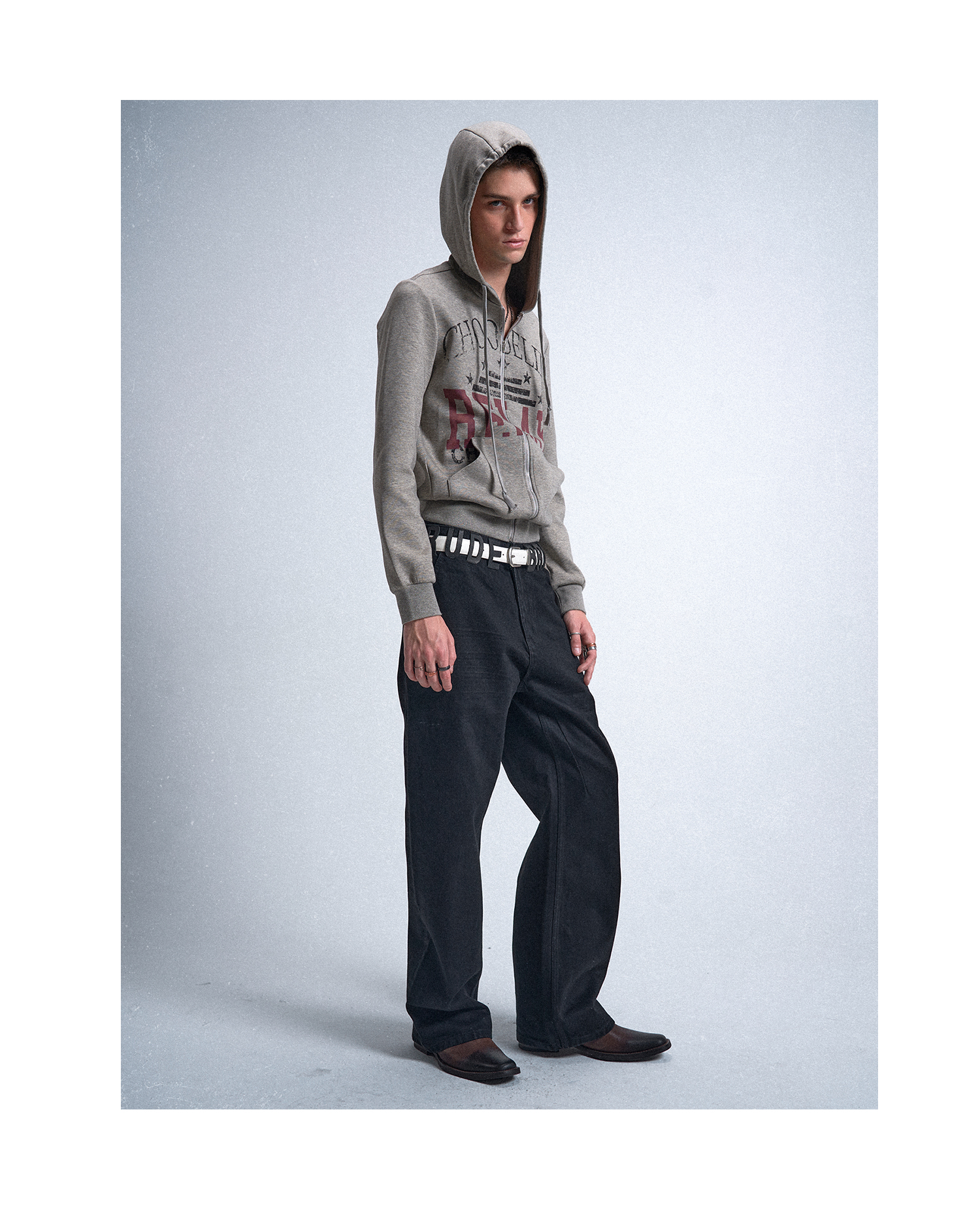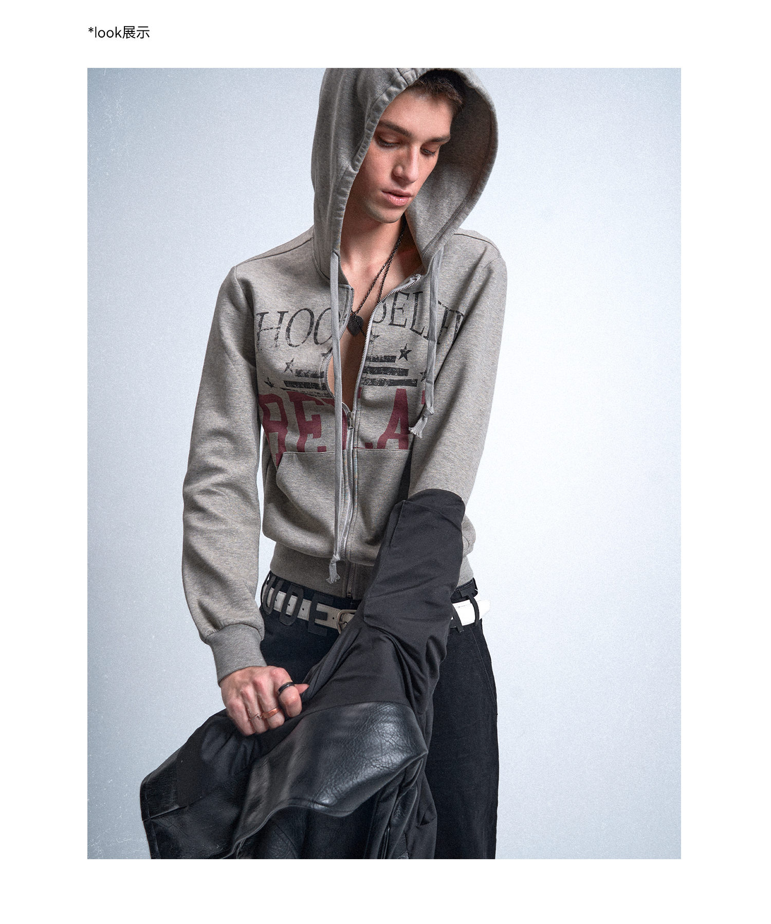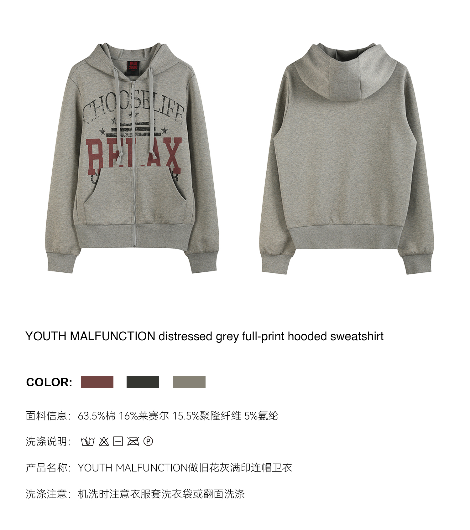 no E mosen(noE)'YOUTHMAL FUNCTION'做舊花灰滿印連帽合身衛衣