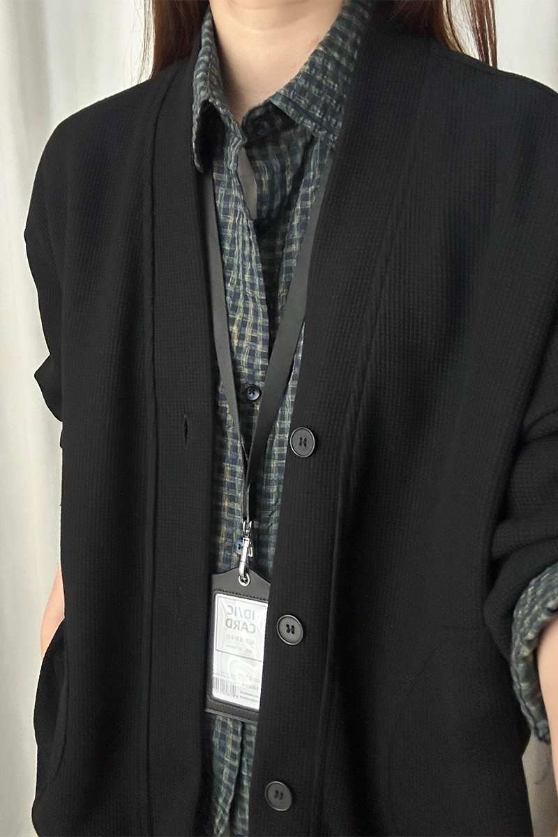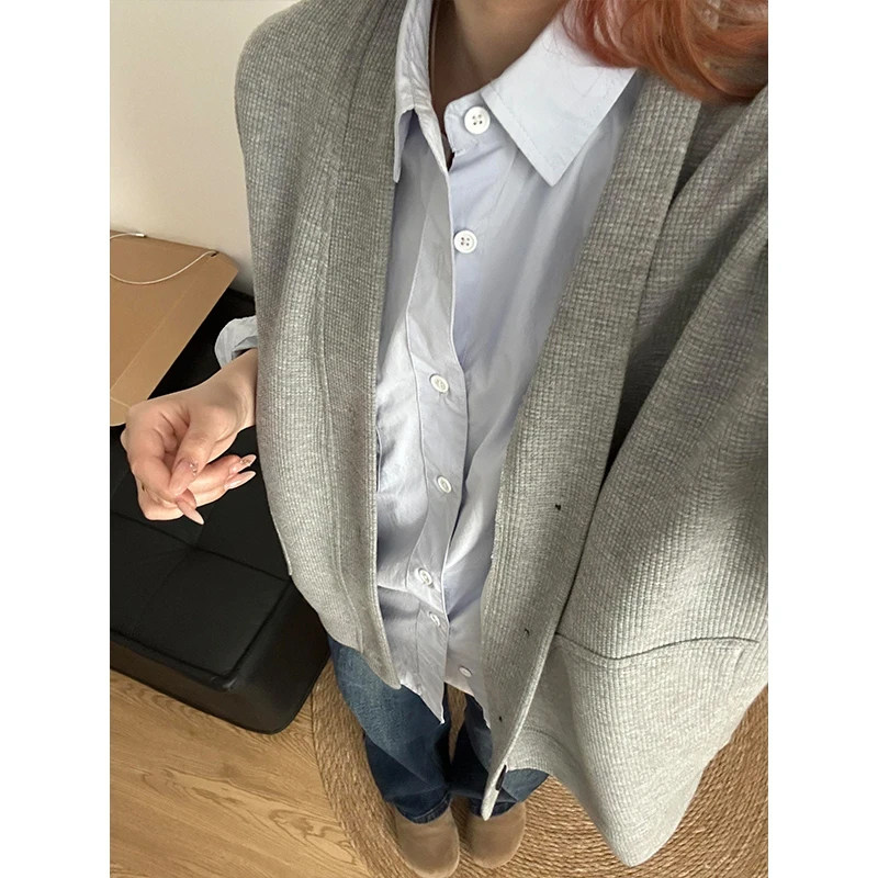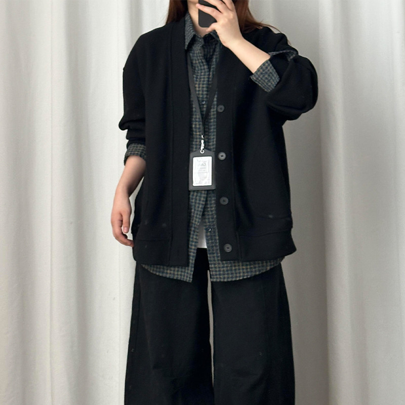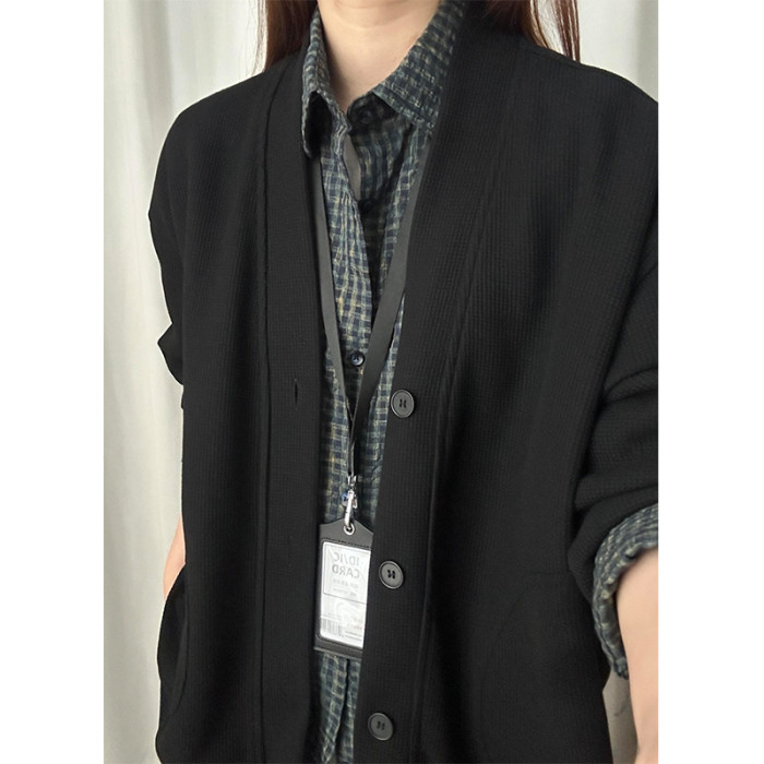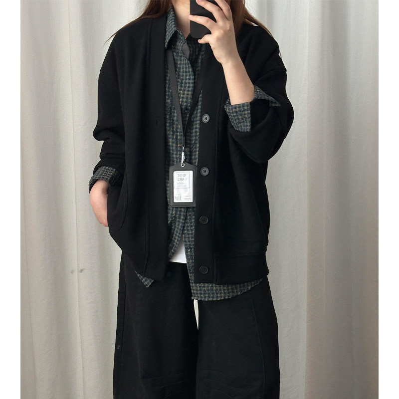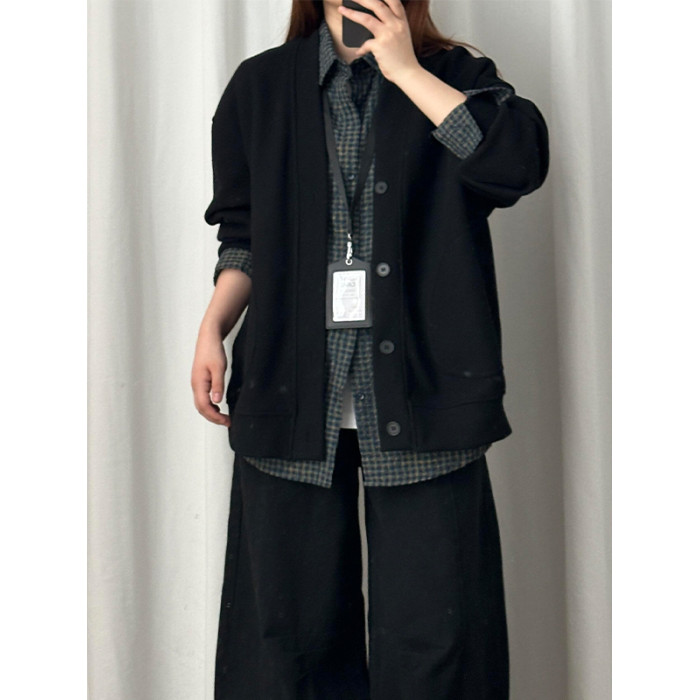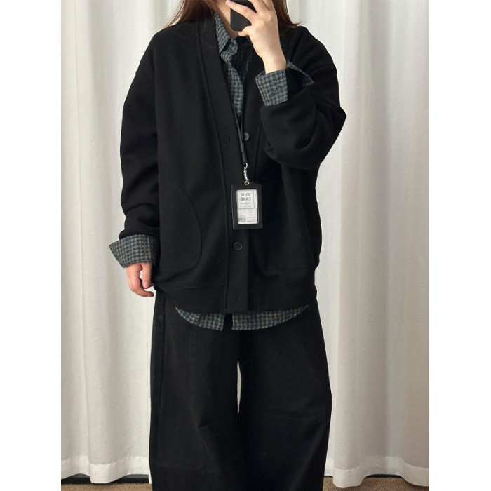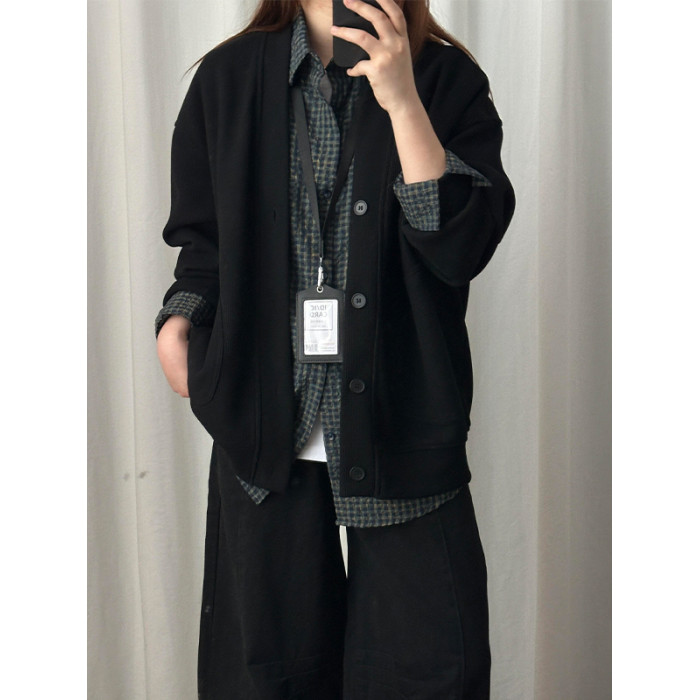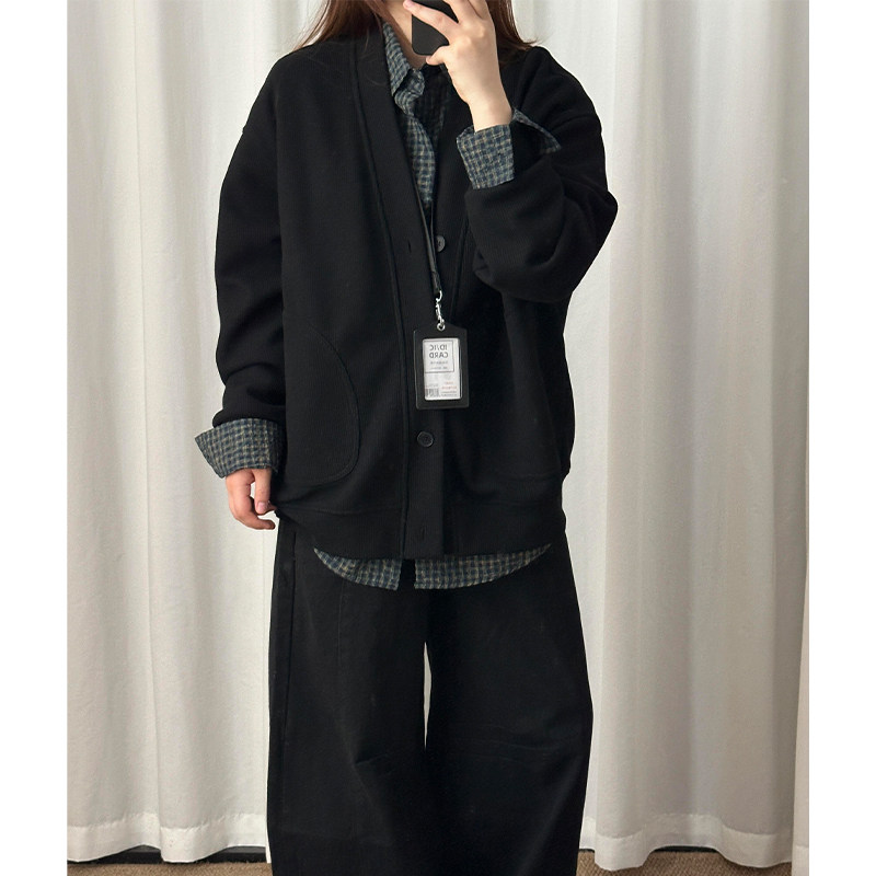 黑色日系慵懶風開衫衛衣外套男秋春穿搭cleanfit華夫格v領針織衫