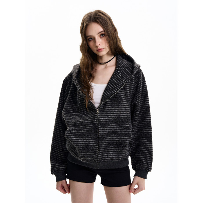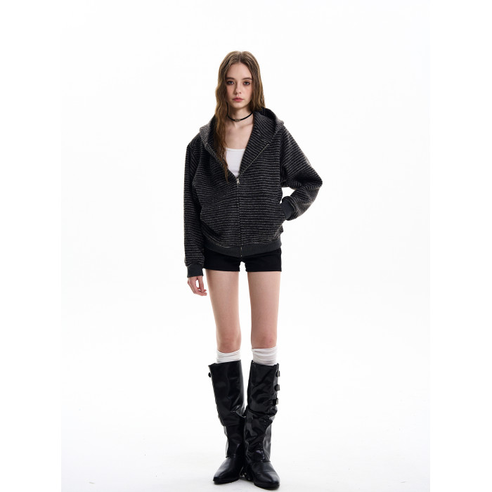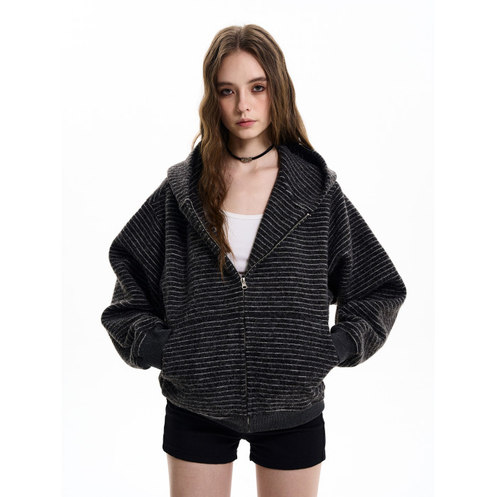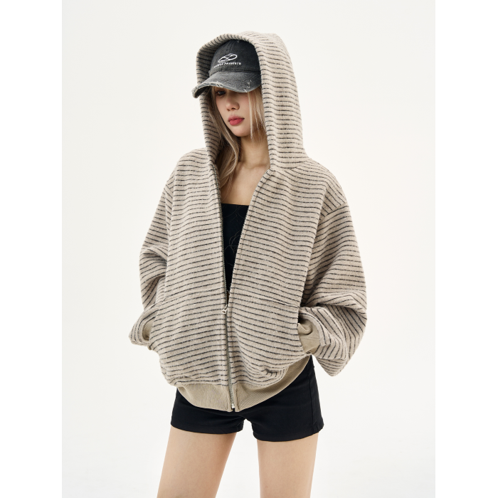 MaxDstr 2025早秋條紋拉鍊開衫連帽衛衣男女毛絨質感重磅情侶外套