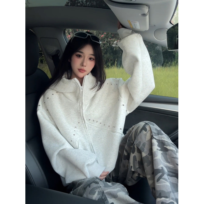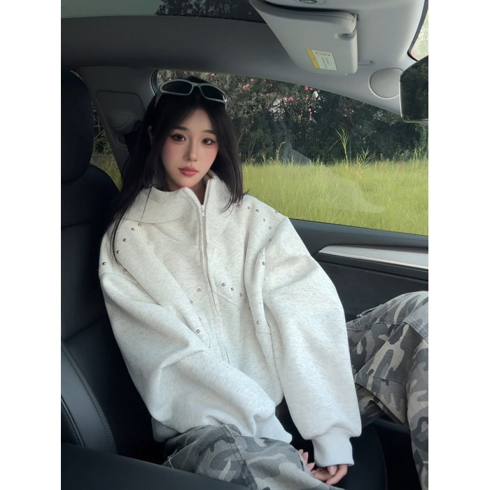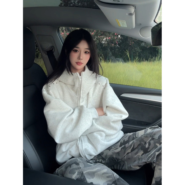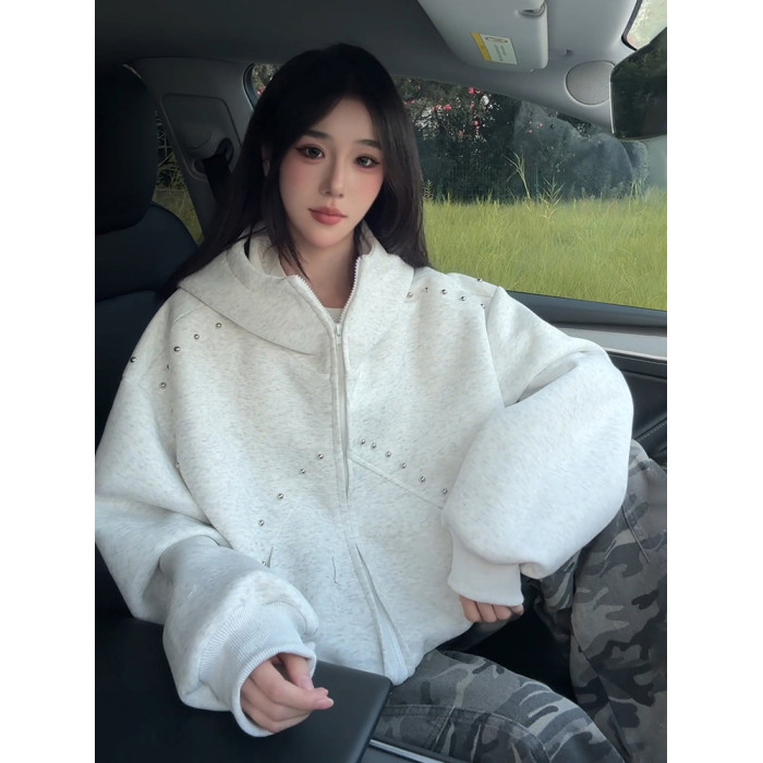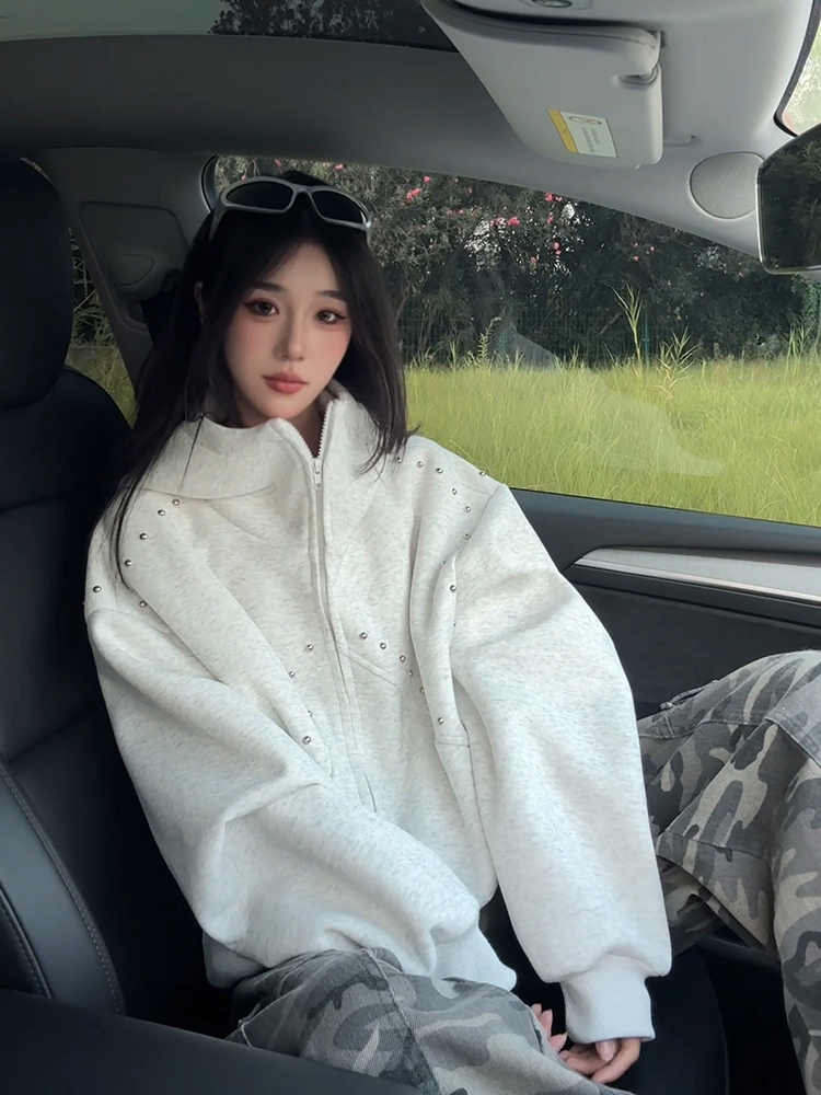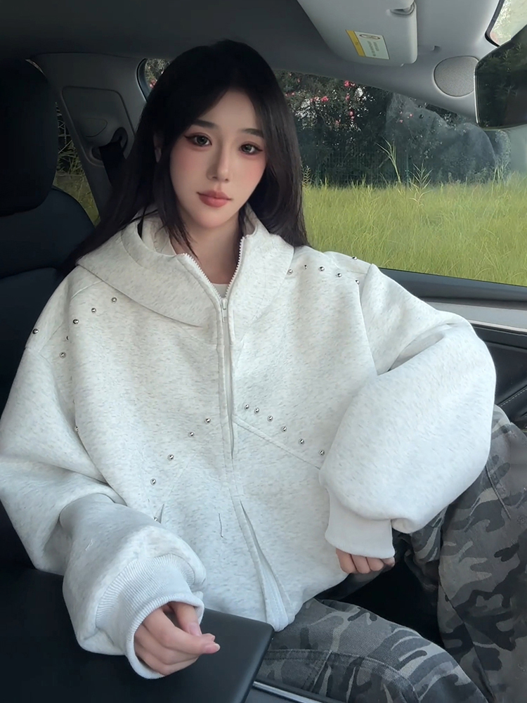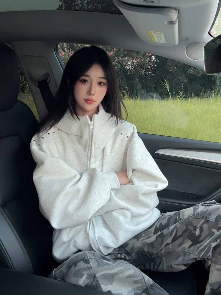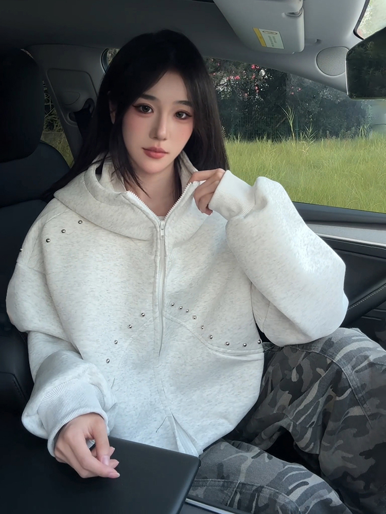460g重磅白花灰開衫衛衣男秋冬拼接柳釘拉鍊外套設計感廓形連帽衫