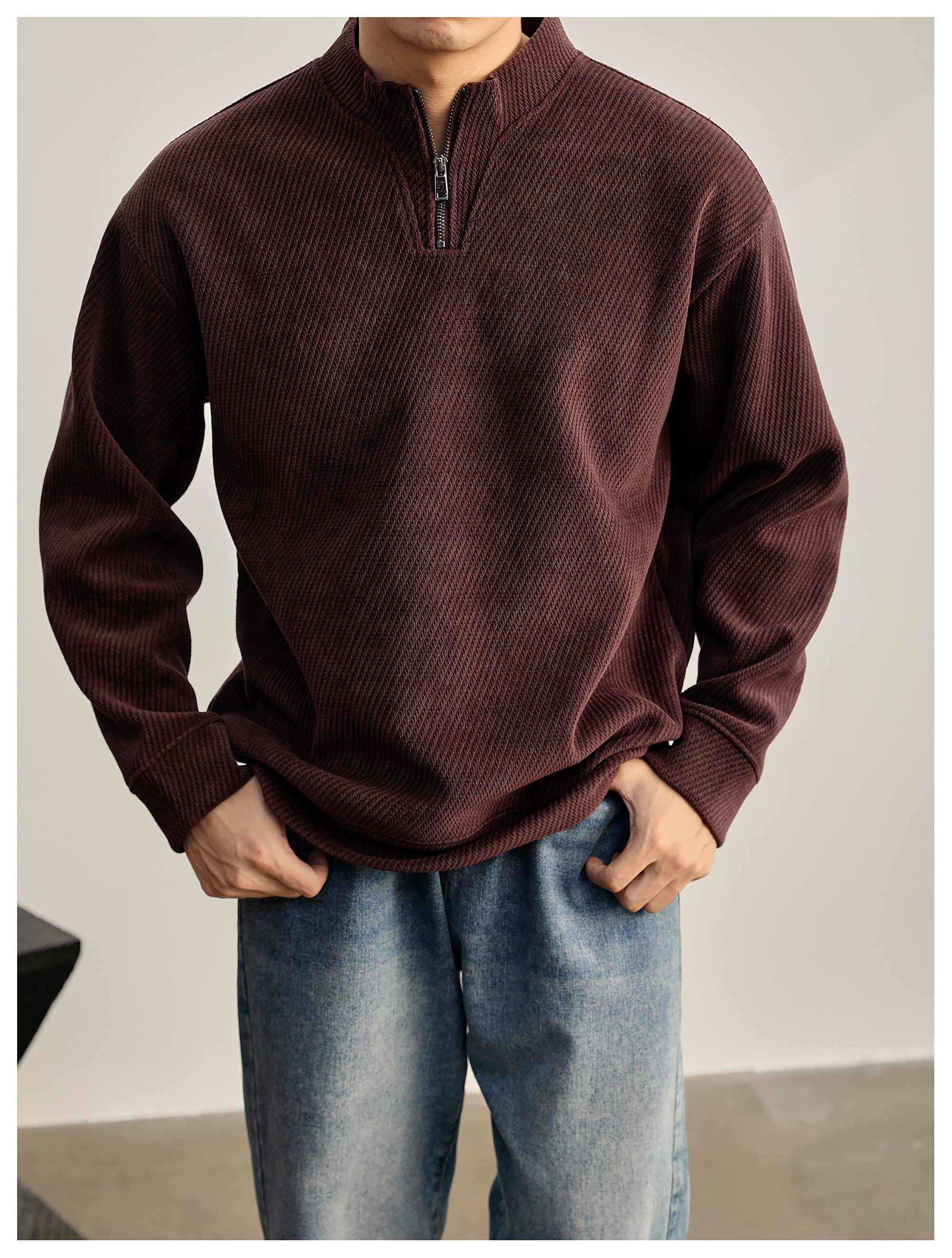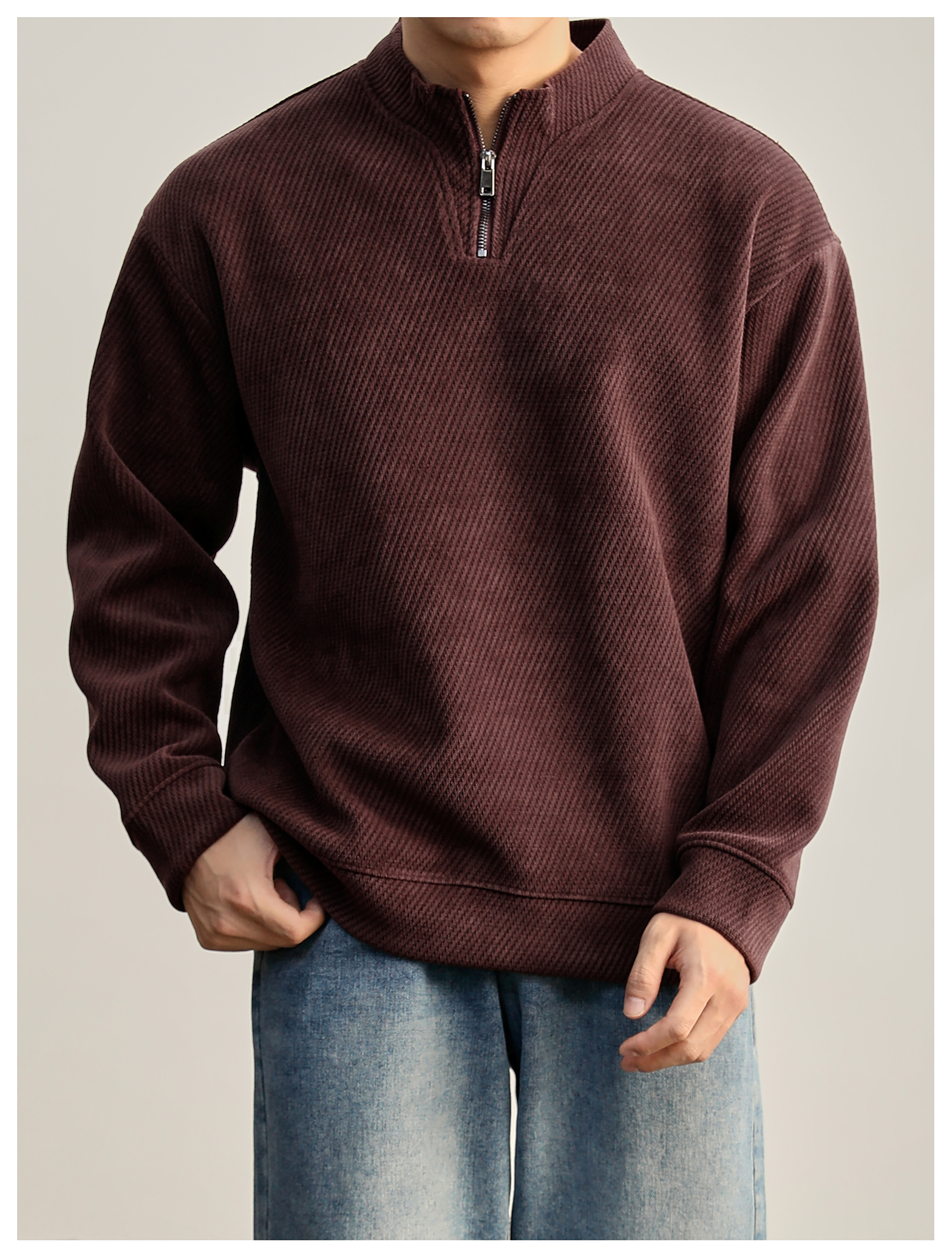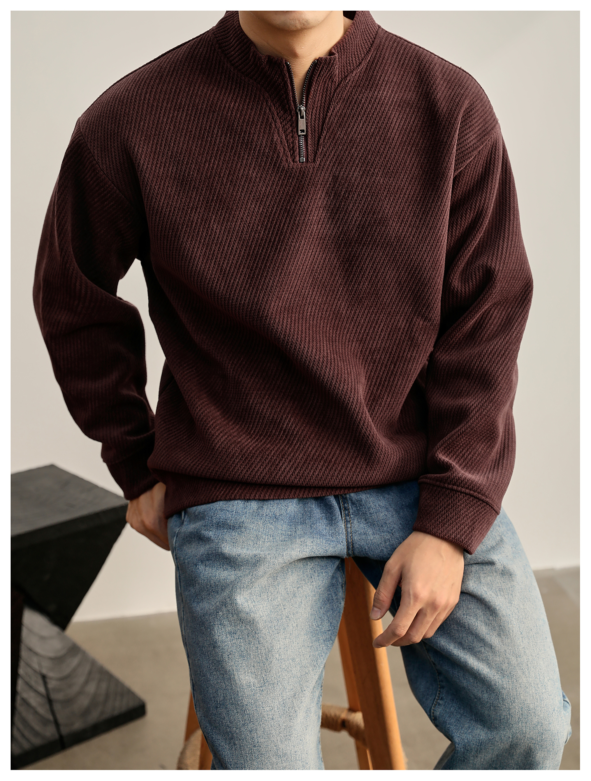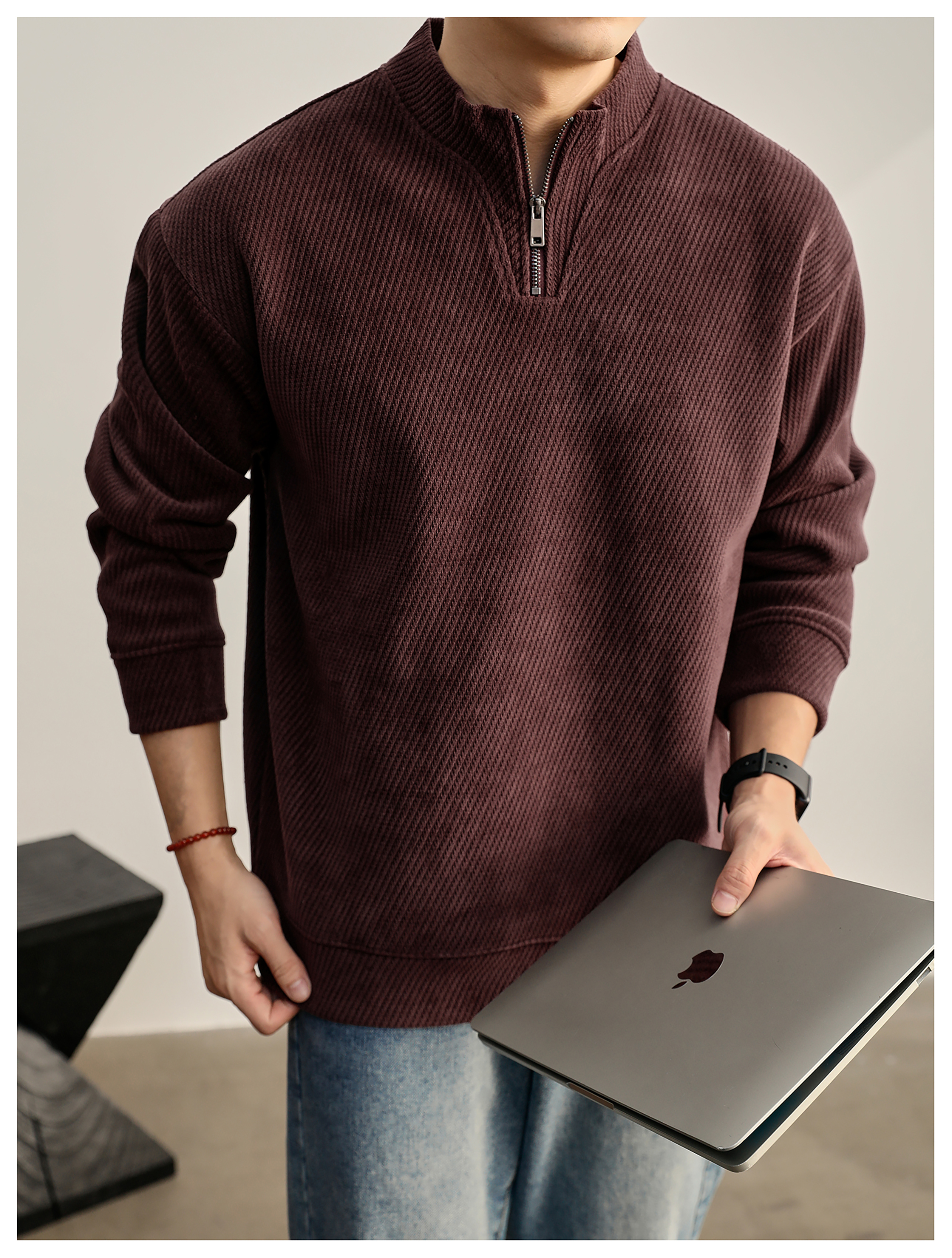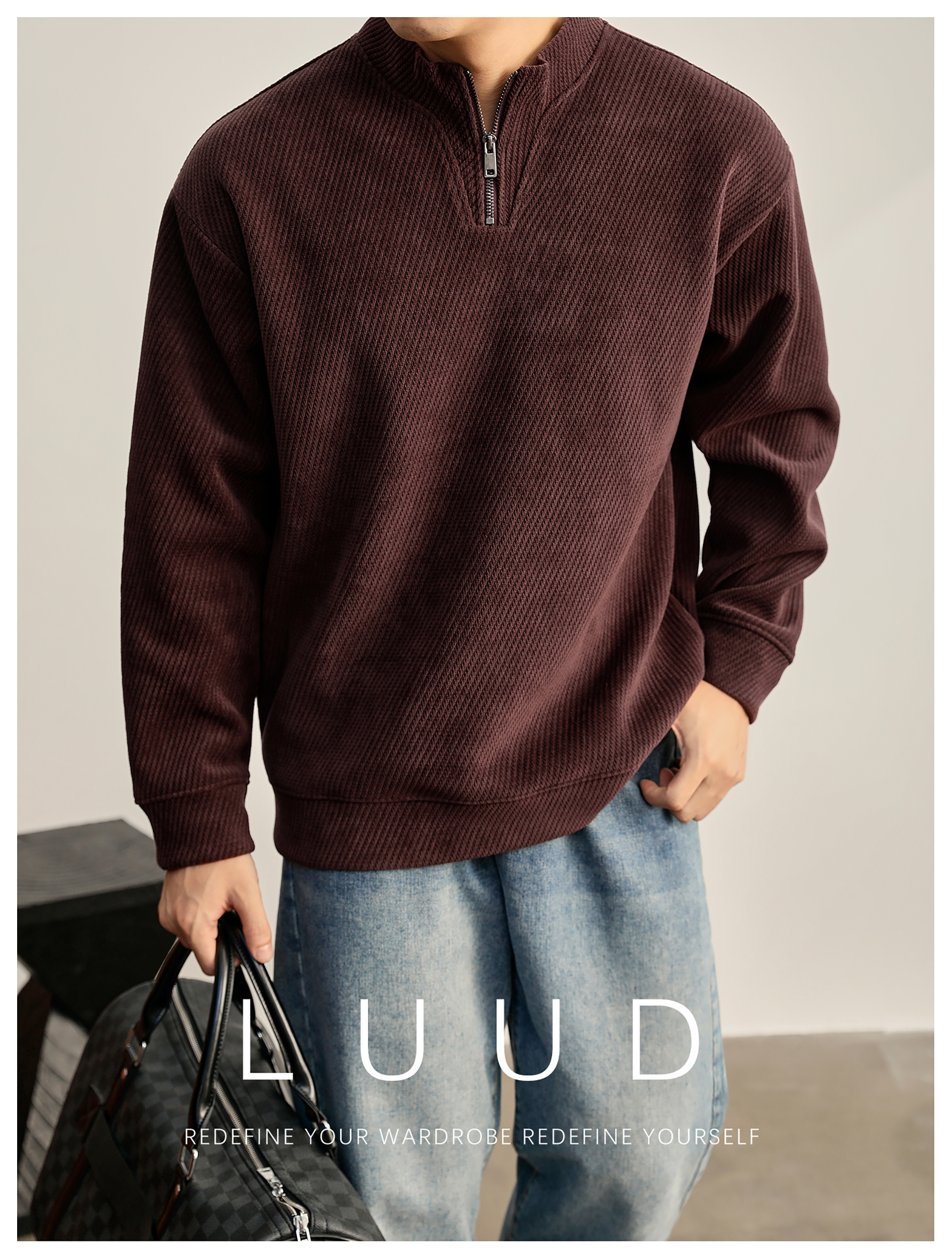 LUUD 復古老錢風男士棗紅色斜紋立領衛衣重磅550g半拉鍊長袖上衣