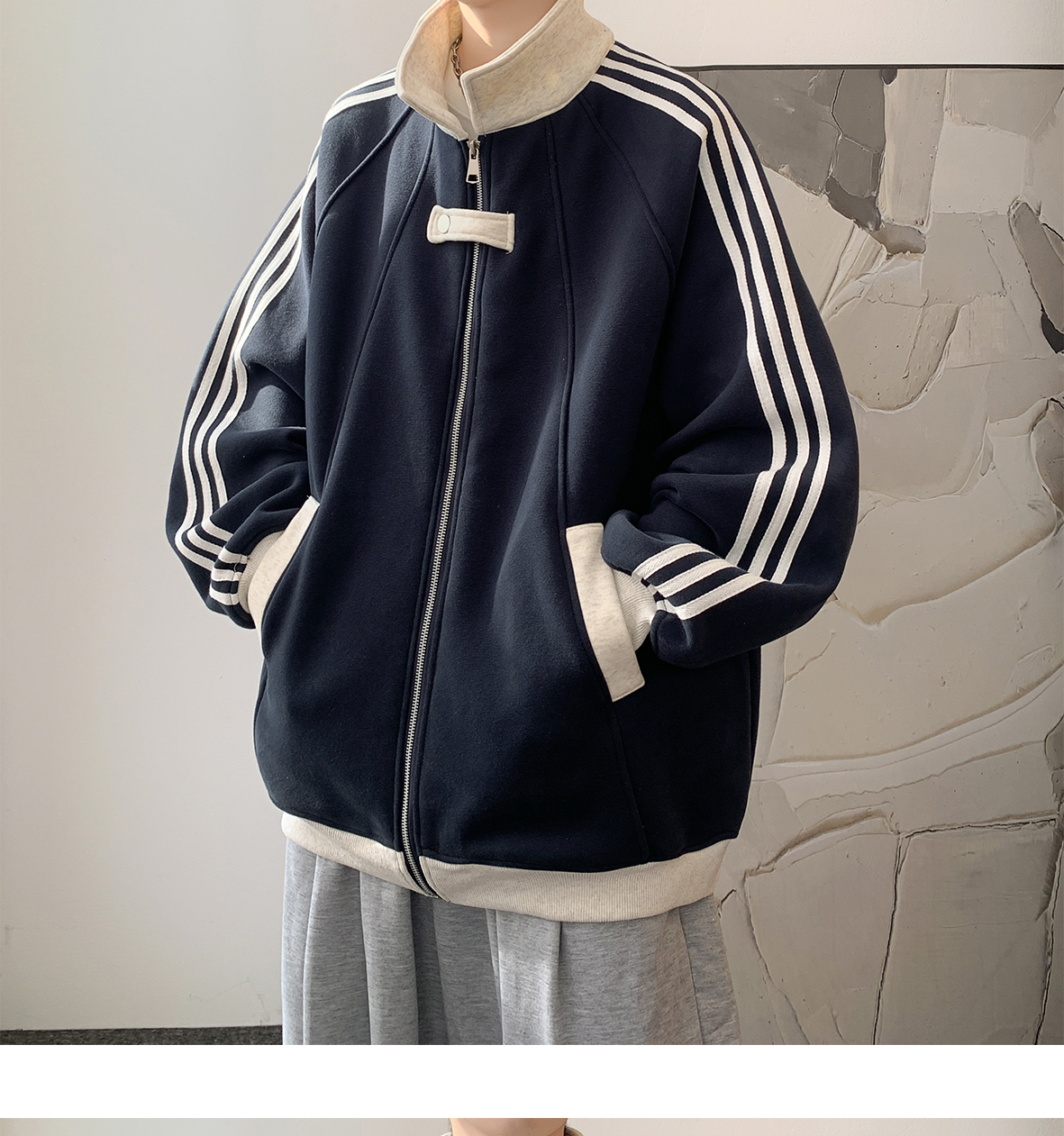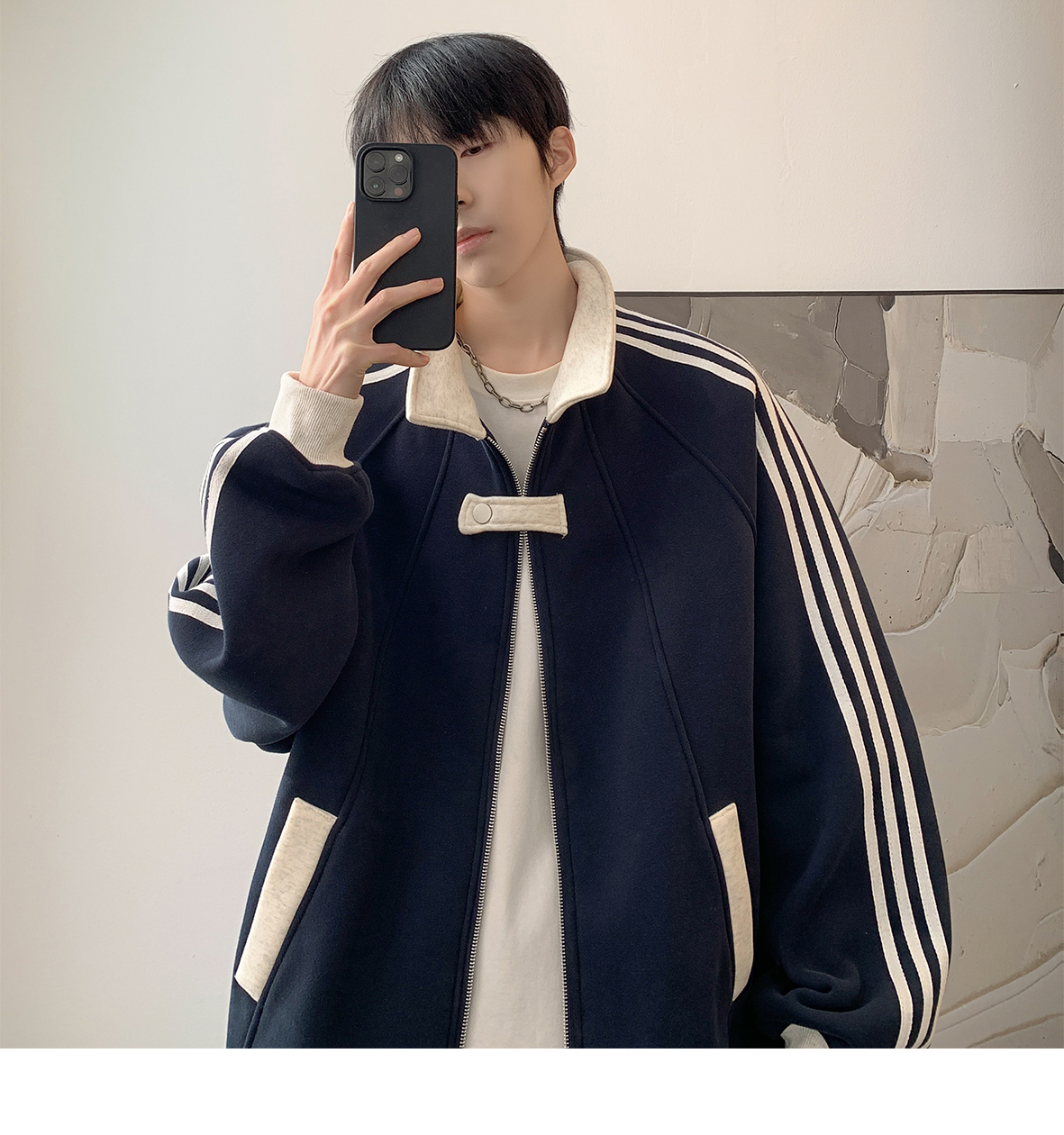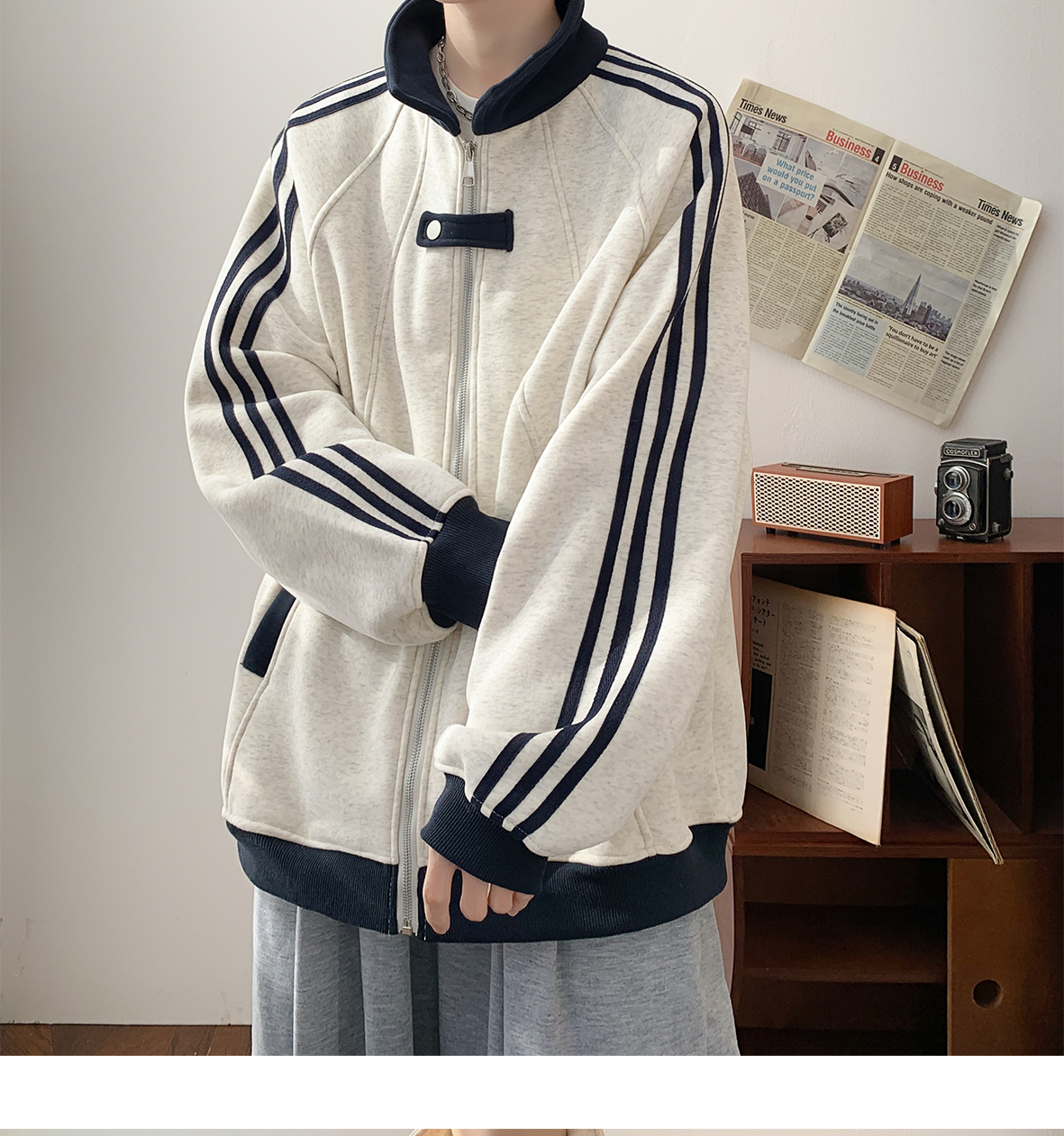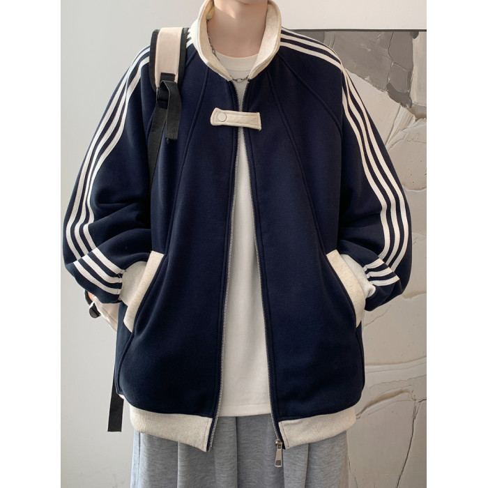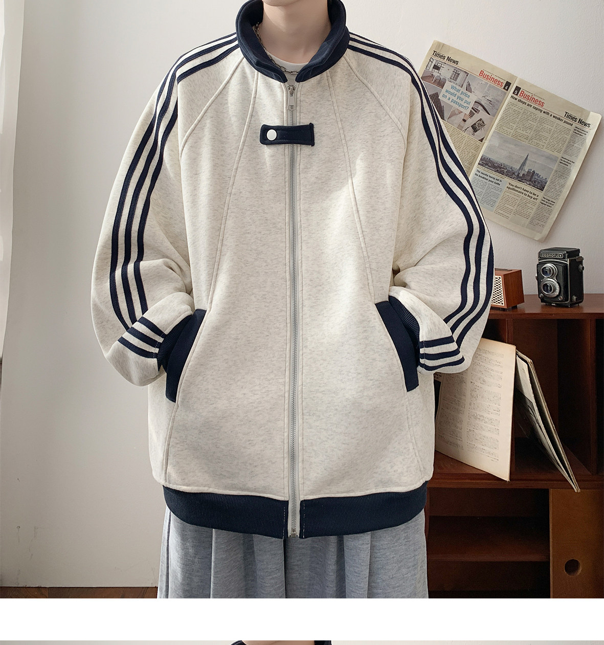 真維斯美式拼接立領開衫衛衣男秋季青少年寬松痞帥條紋棒球服外套