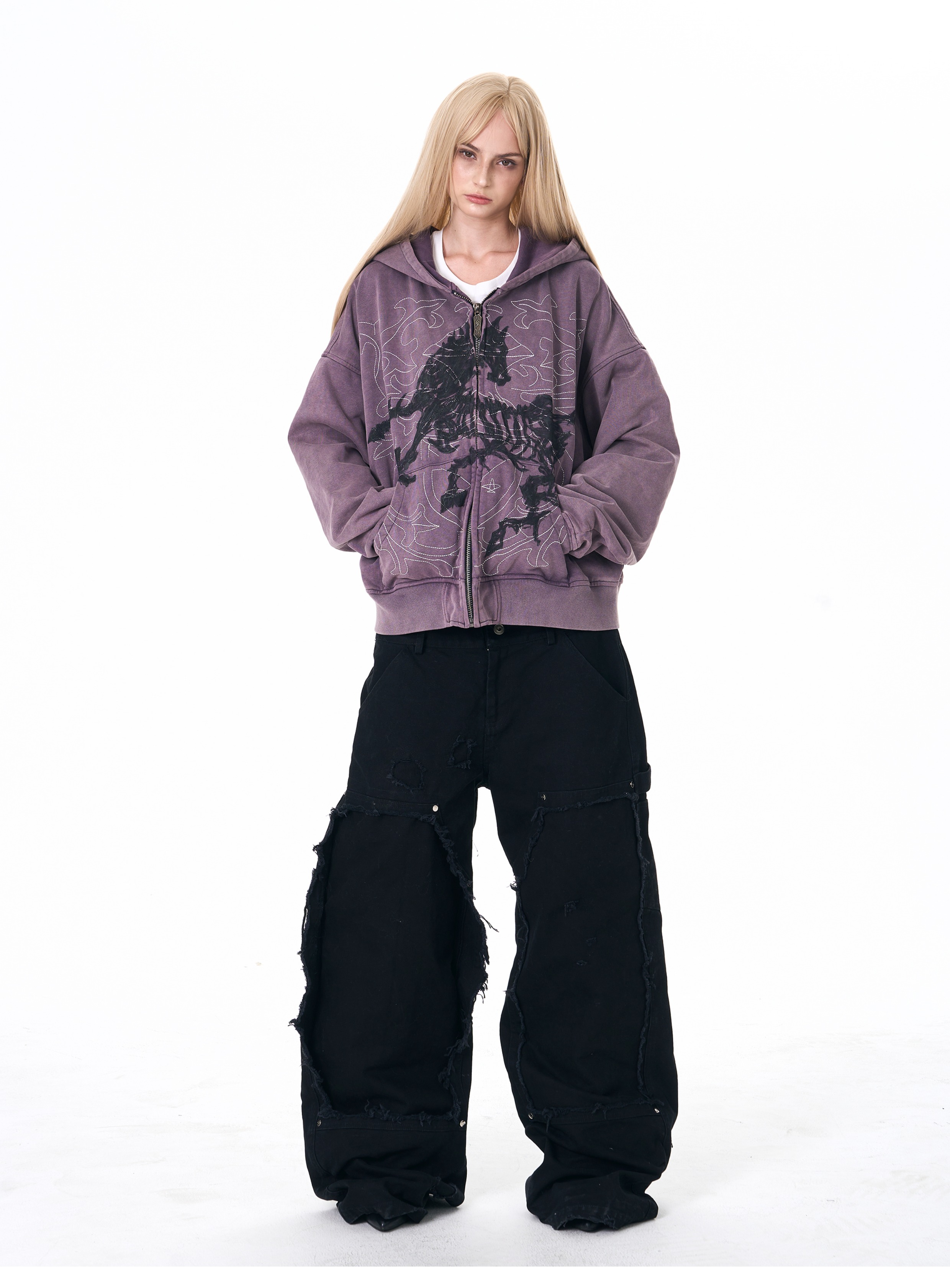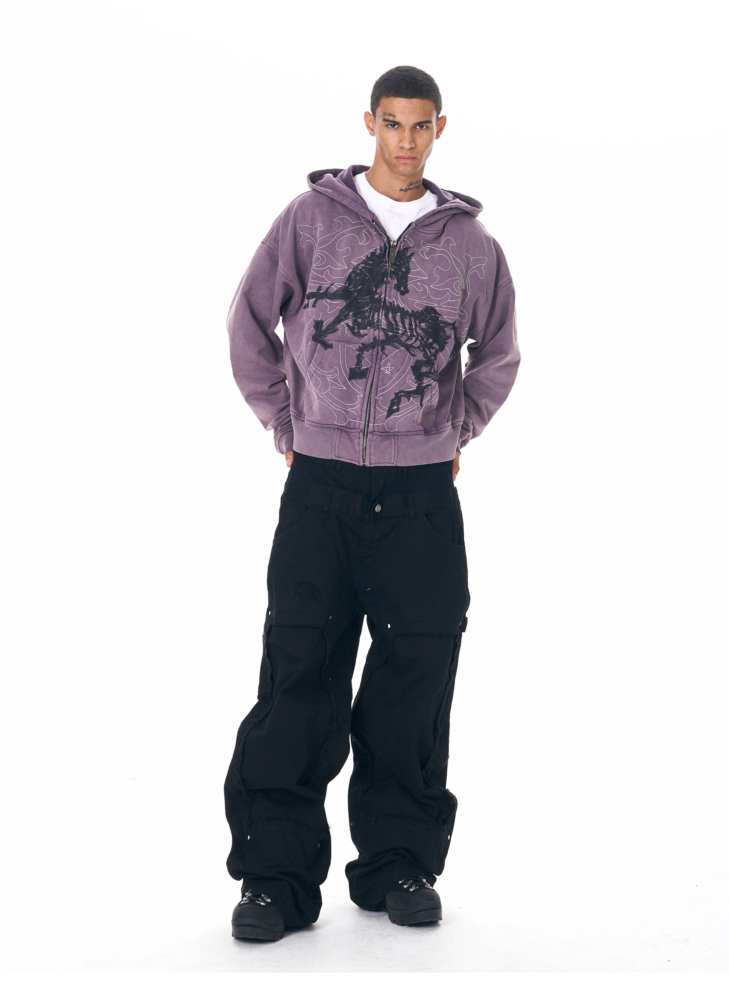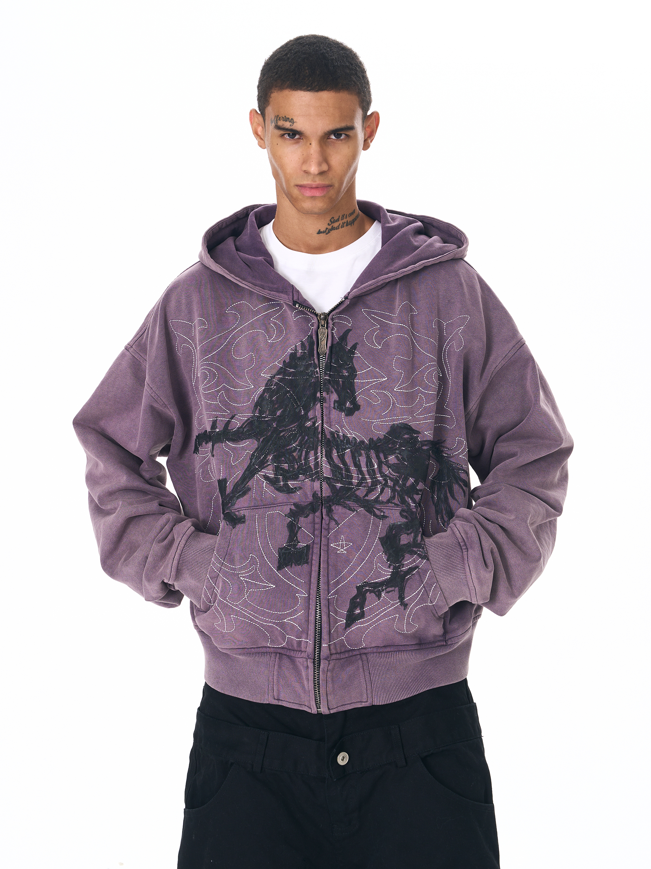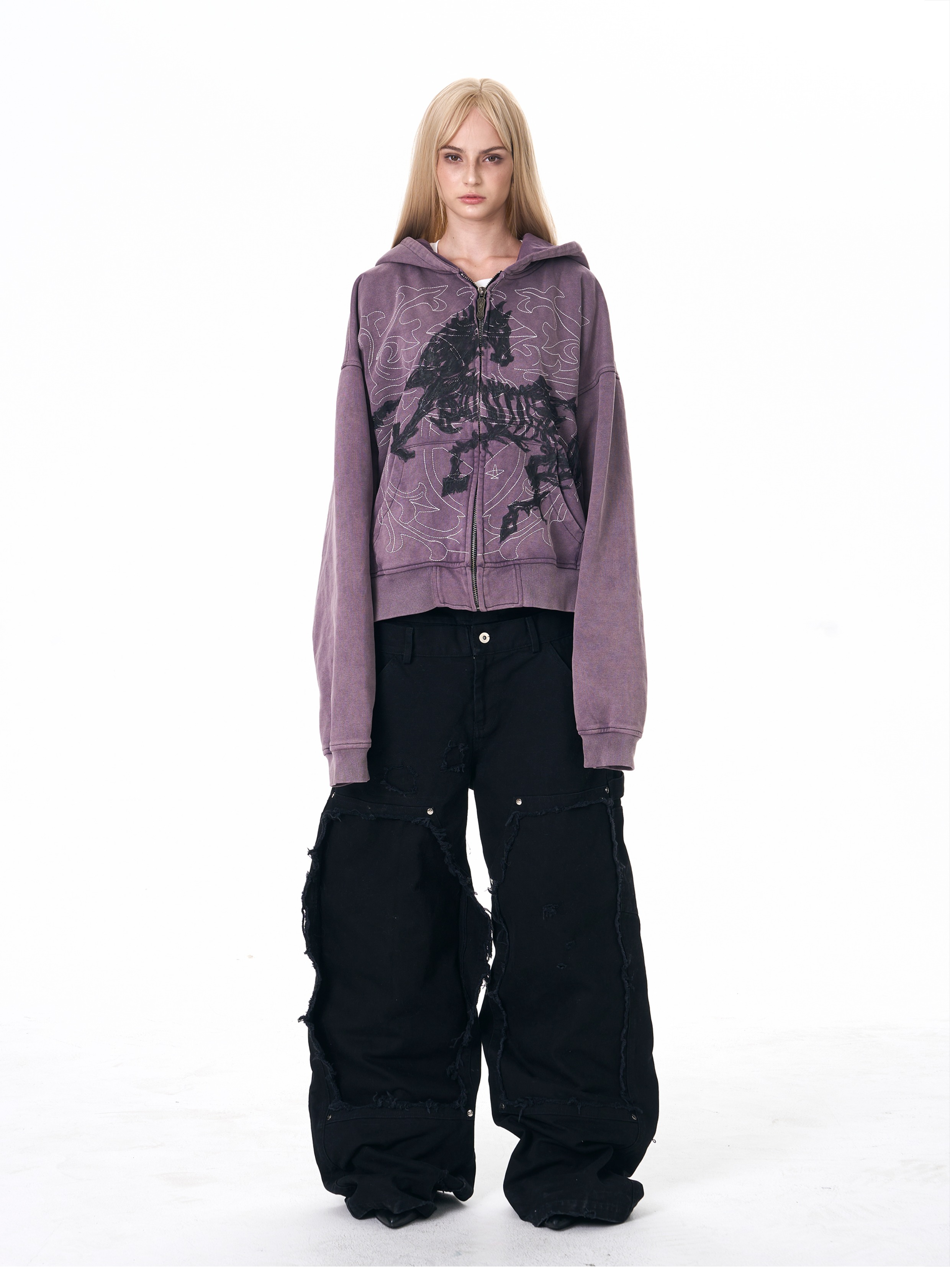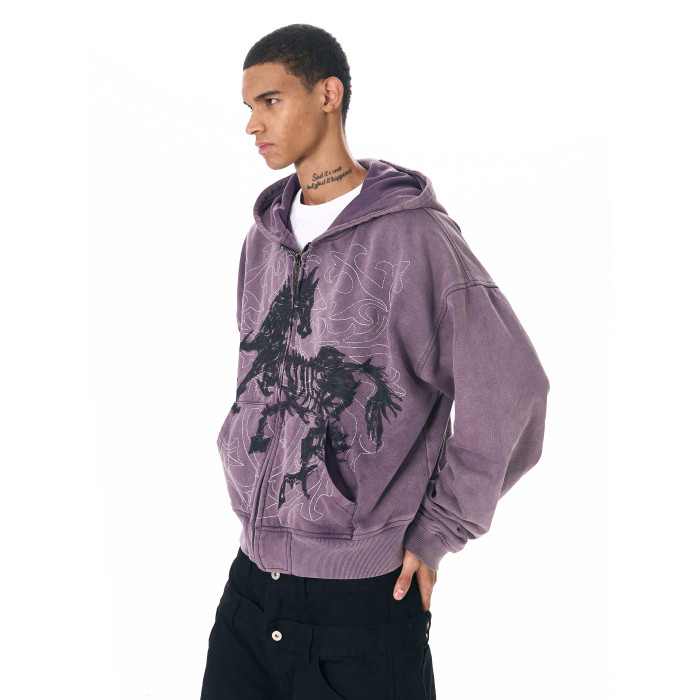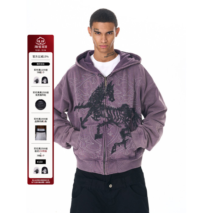 Fourth3ex 25FW 手繪刺綉戰馬連帽衛衣外套男秋季水洗做舊帽衫